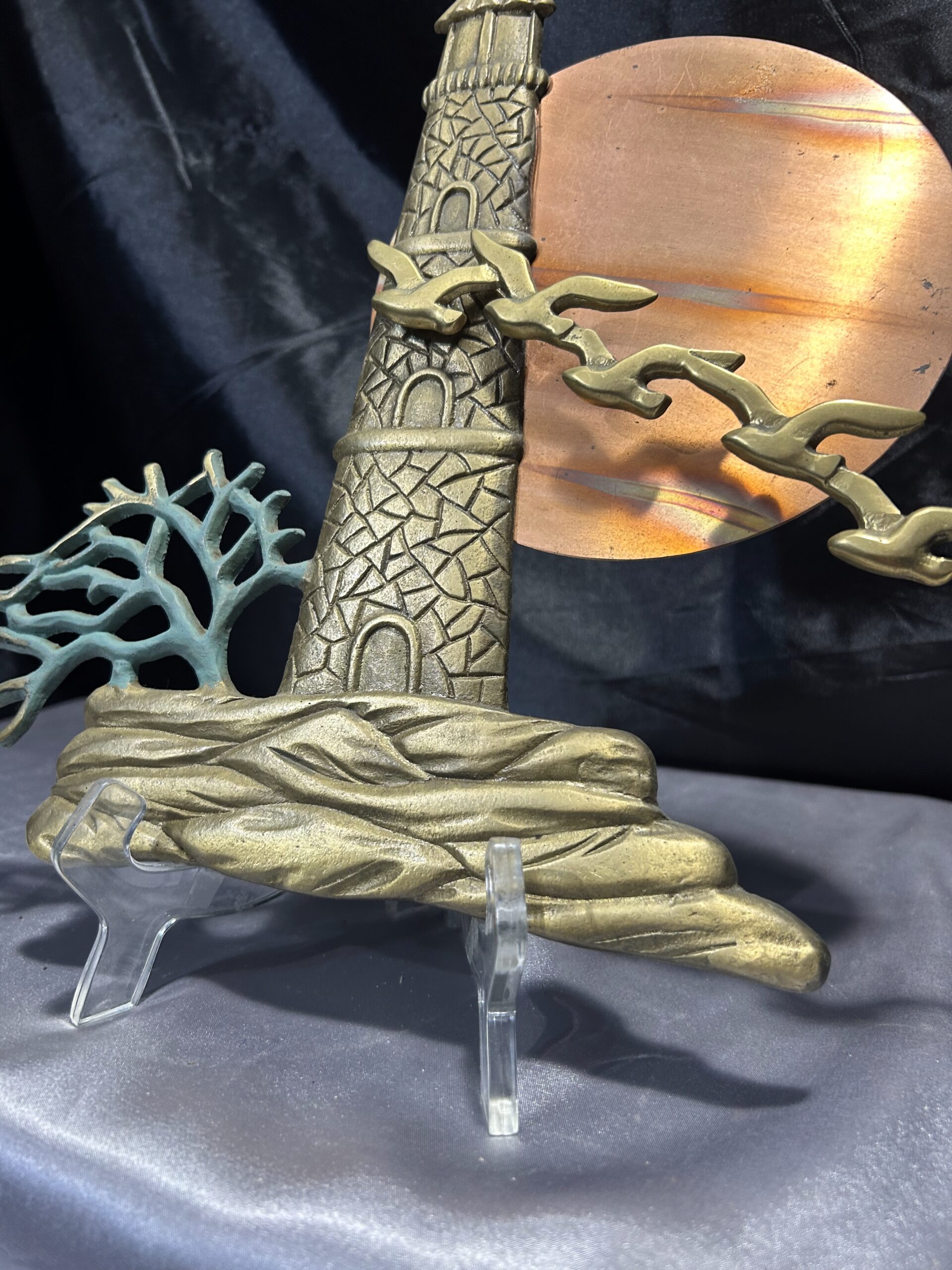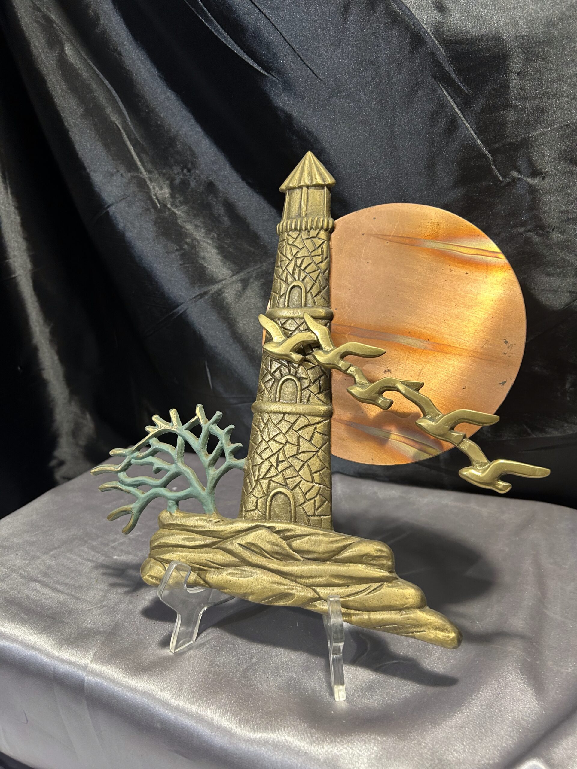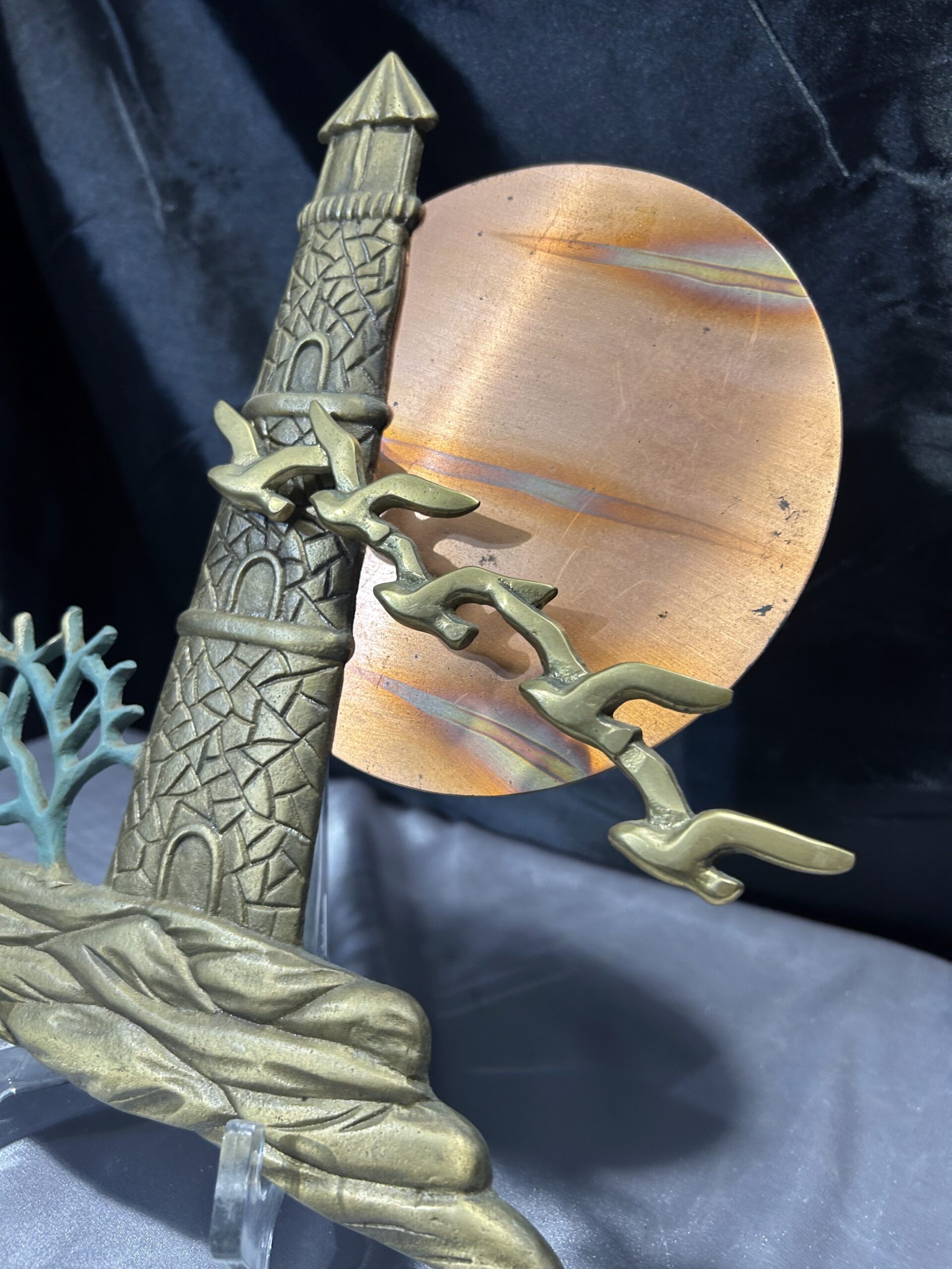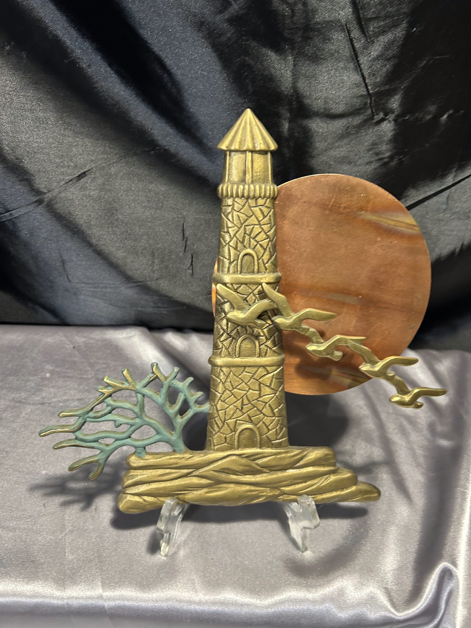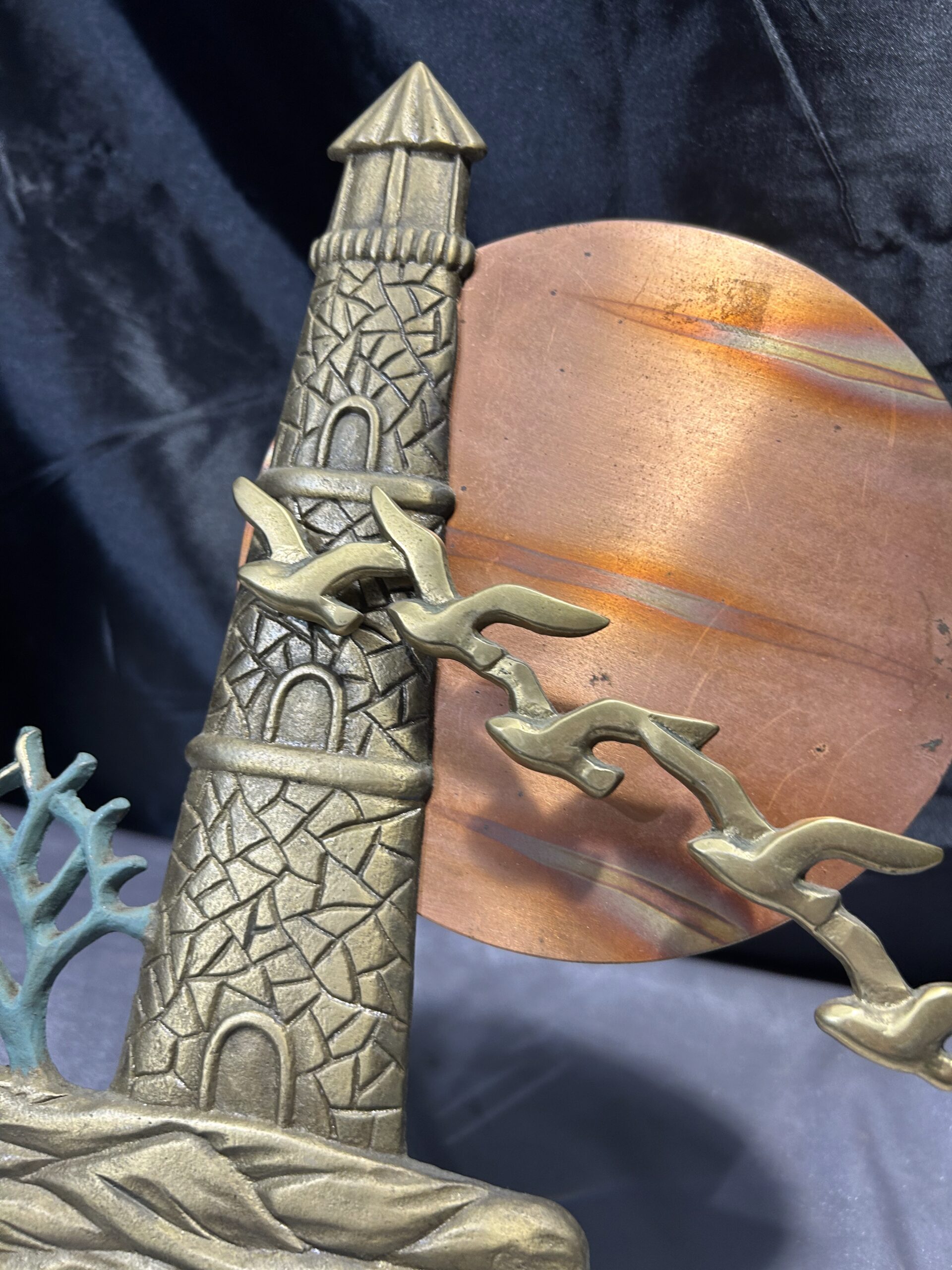 Unikatowa zawieszka ścienna wykonana z mosiądzu, przedstawiająca malowniczą scenę latarni morskiej o zachodzie słońca. Kompozycję dopełnia przelatujący klucz ptaków oraz krzak rosnący przy latarni. Owalne słońce, prawdopodobnie wykonane z miedzi, subtelnie kontrastuje z resztą motywu, dodając głębi i wyrazistości. Elementy zawieszki noszą ślady naturalnej patyny, co podkreśla jej autentyczność i vintage’owy charakter.