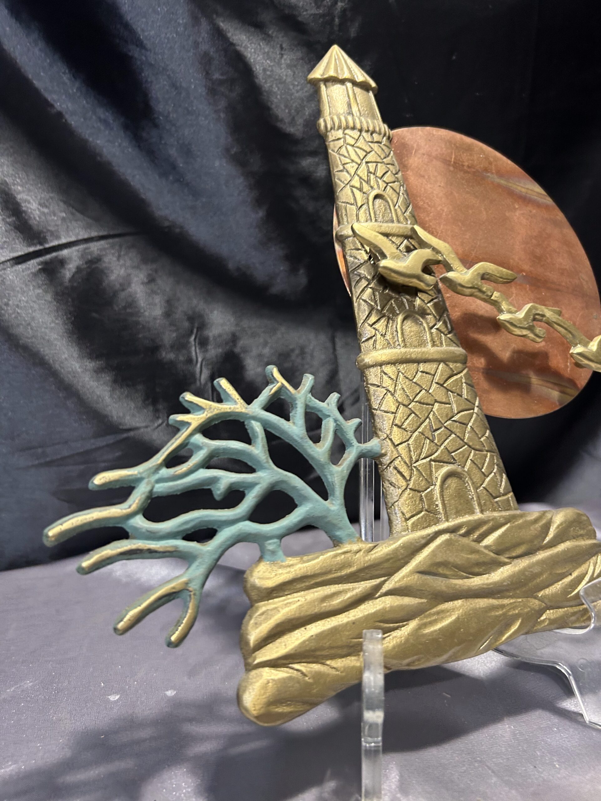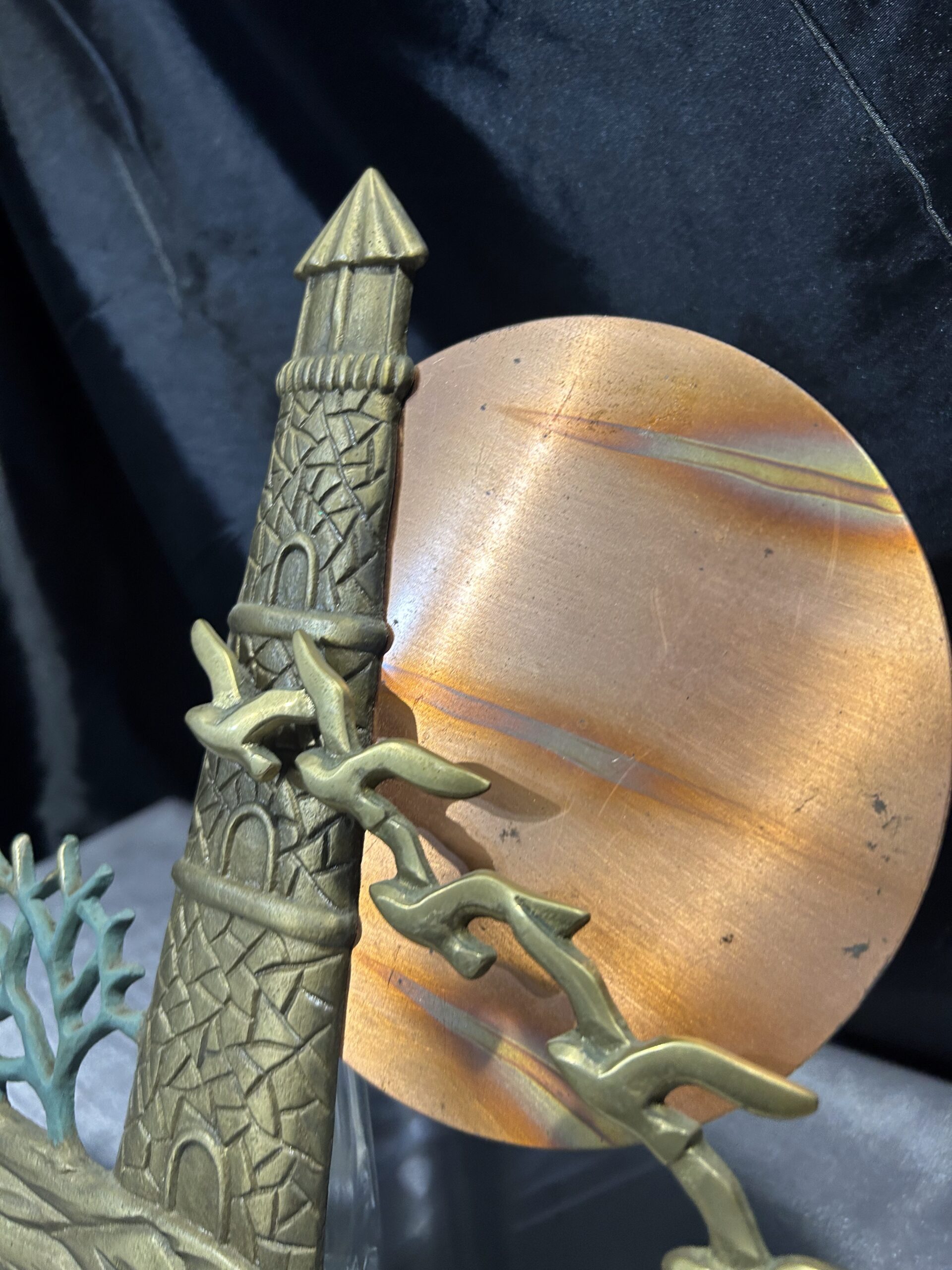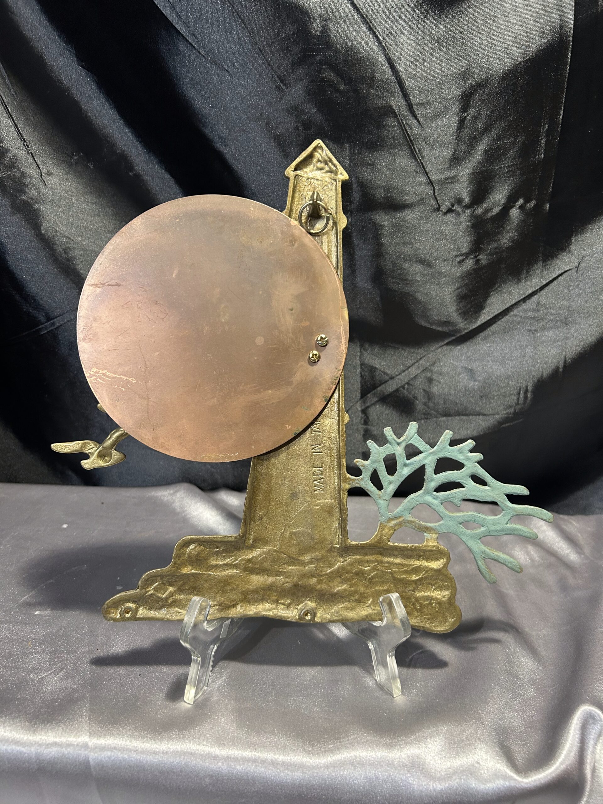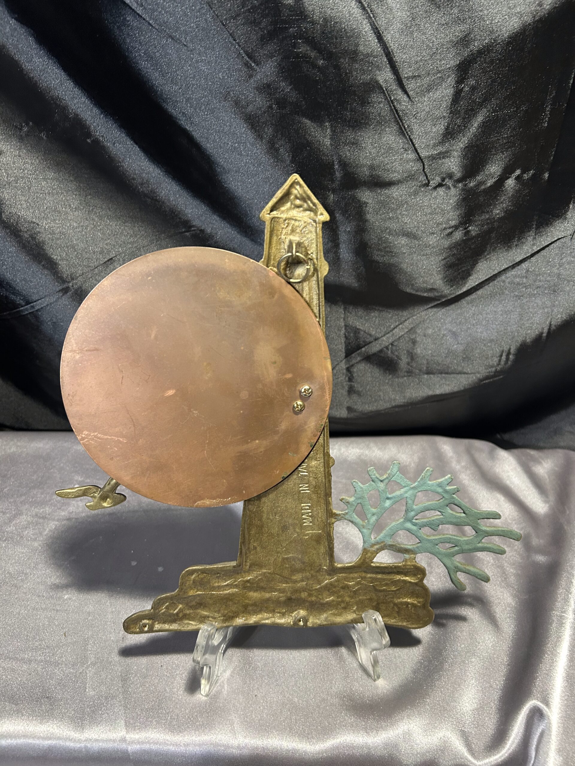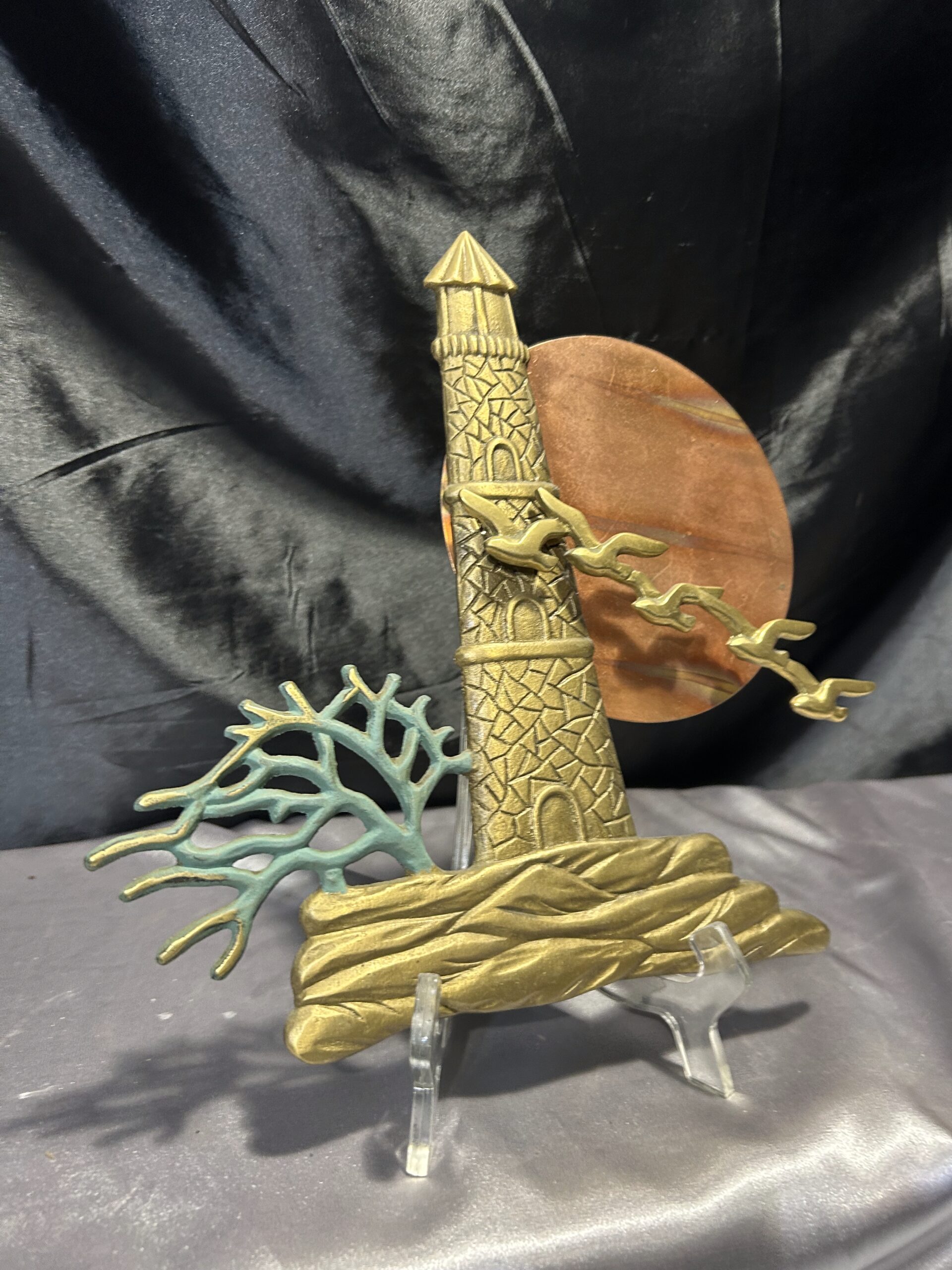 Unikatowa zawieszka ścienna wykonana z mosiądzu, przedstawiająca malowniczą scenę latarni morskiej o zachodzie słońca. Kompozycję dopełnia przelatujący klucz ptaków oraz krzak rosnący przy latarni. Owalne słońce, prawdopodobnie wykonane z miedzi, subtelnie kontrastuje z resztą motywu, dodając głębi i wyrazistości. Elementy zawieszki noszą ślady naturalnej patyny, co podkreśla jej autentyczność i vintage’owy charakter.