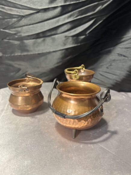 Zestaw trzech miedzianych kociołków – styl vintage