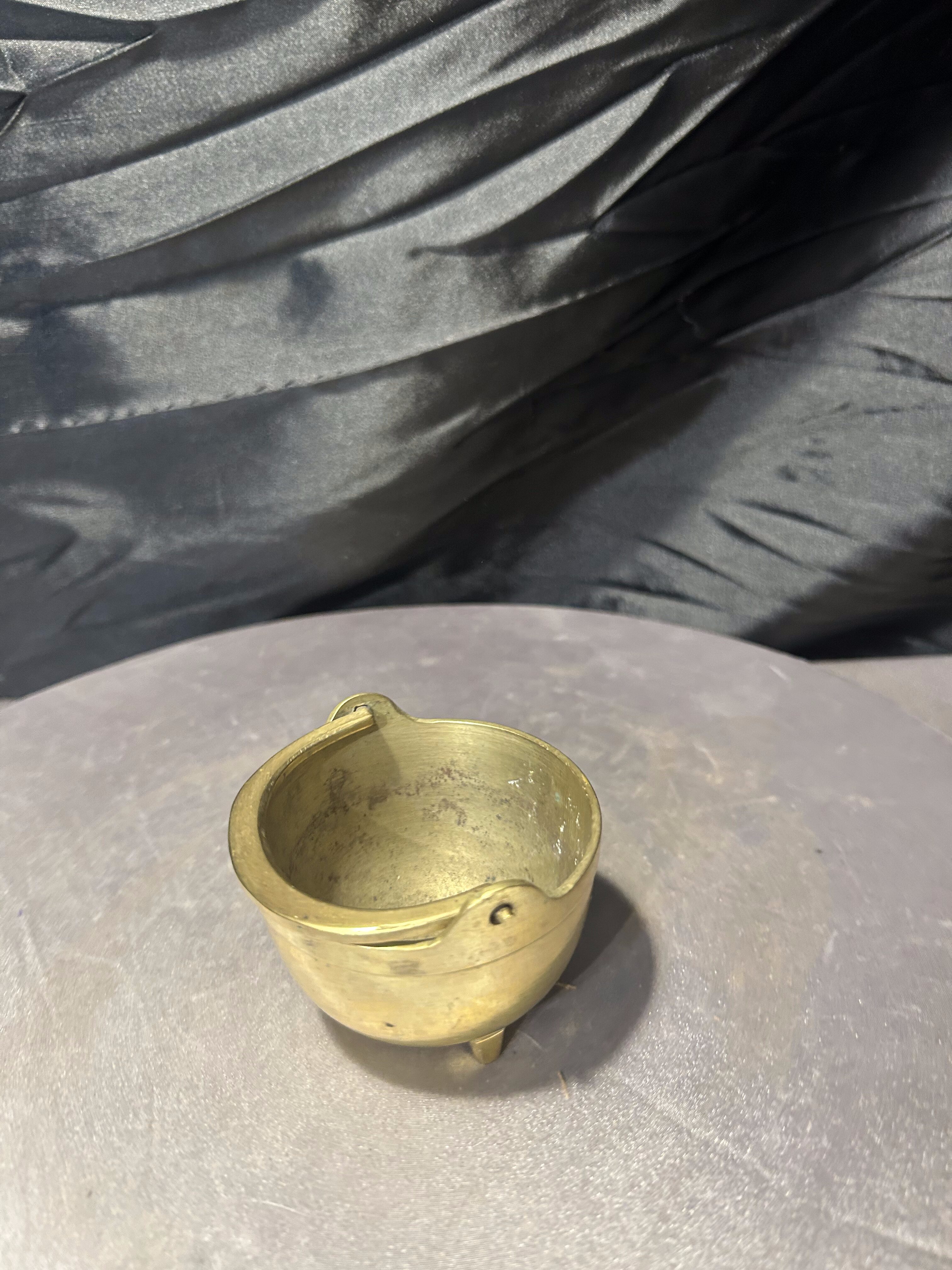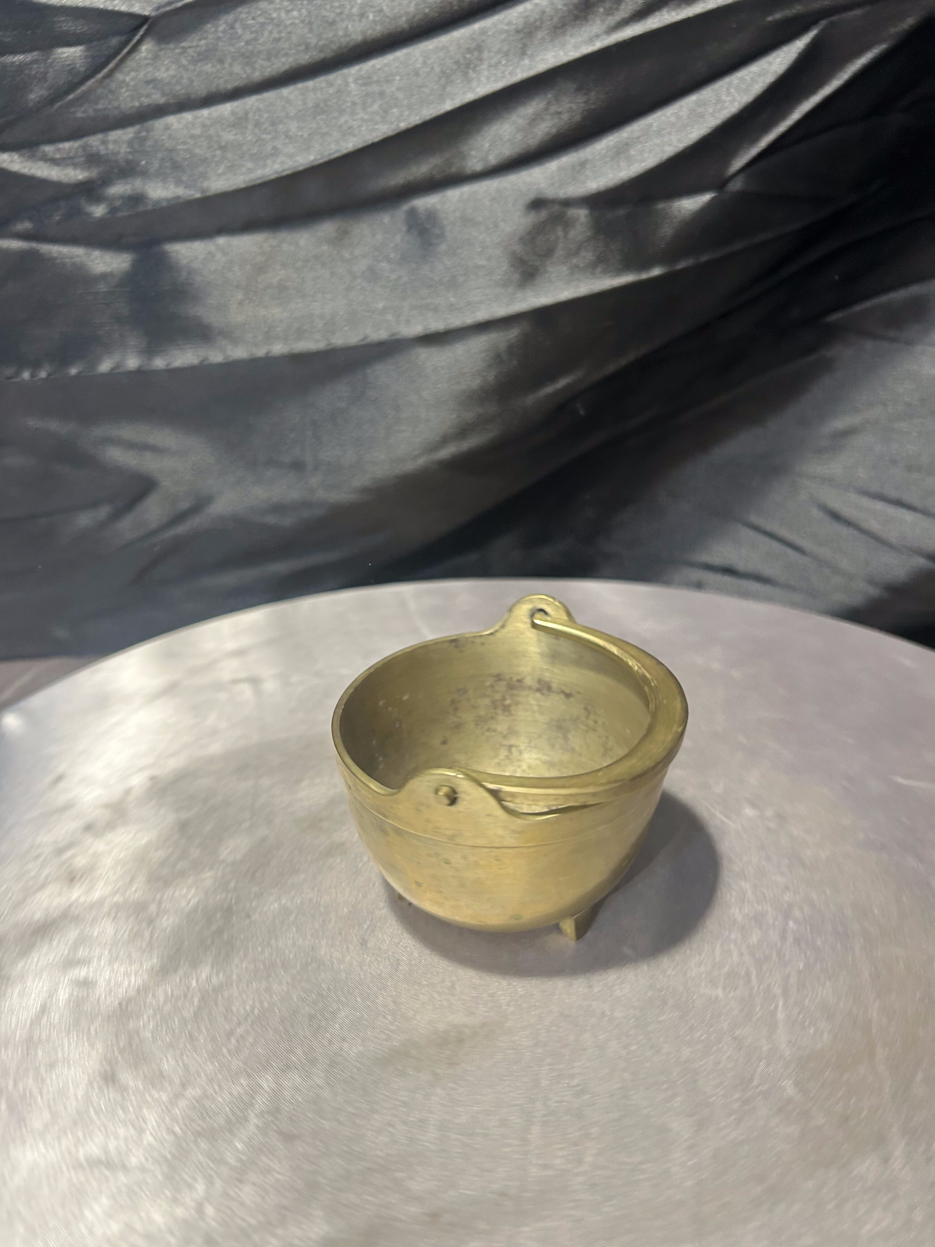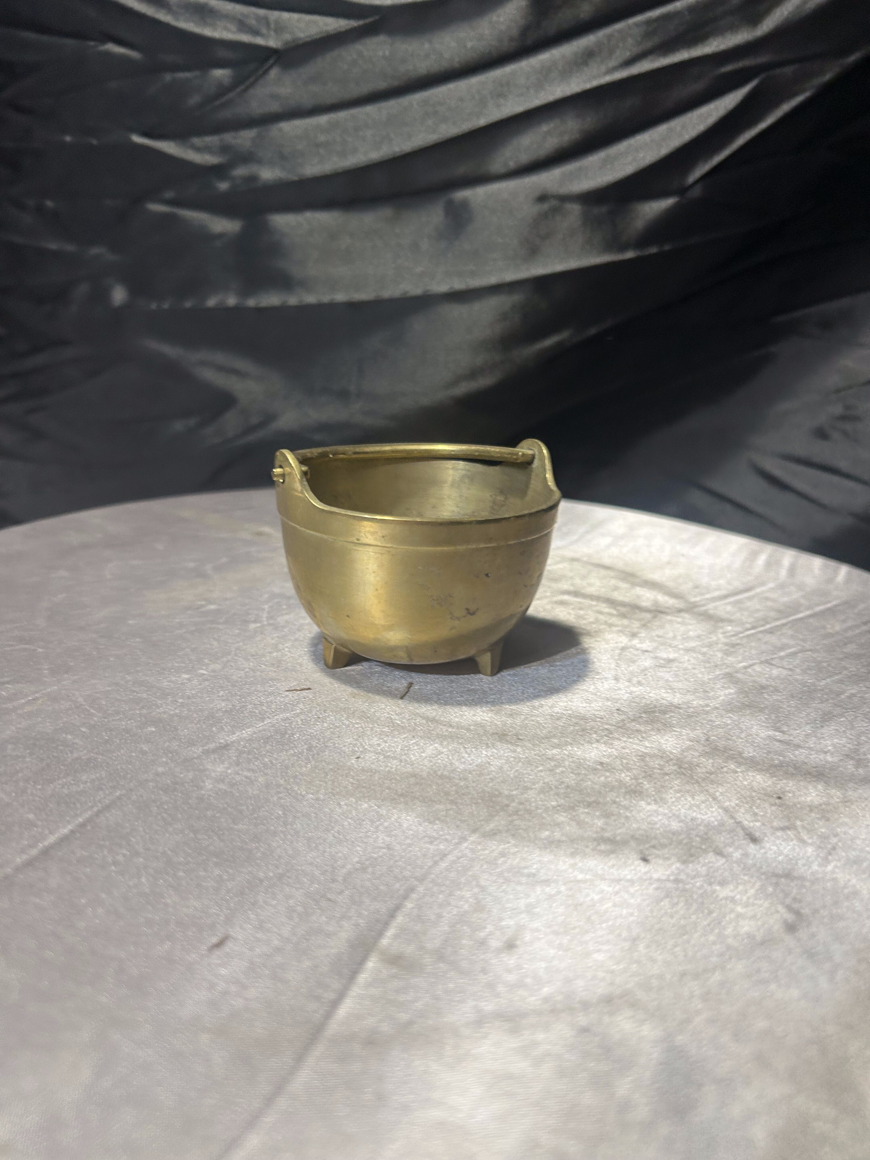 Urokliwe, miniaturowe wiaderko wykonane z mosiądzu, utrzymane w klasycznej formie małego kociołka. Naczynie posiada charakterystyczny pałąkowy uchwyt oraz trzy niewielkie nóżki, dzięki którym stabilnie stoi na powierzchni. Ciepła barwa mosiądzu oraz naturalna patyna nadają przedmiotowi autentyczny, vintage’owy charakter.