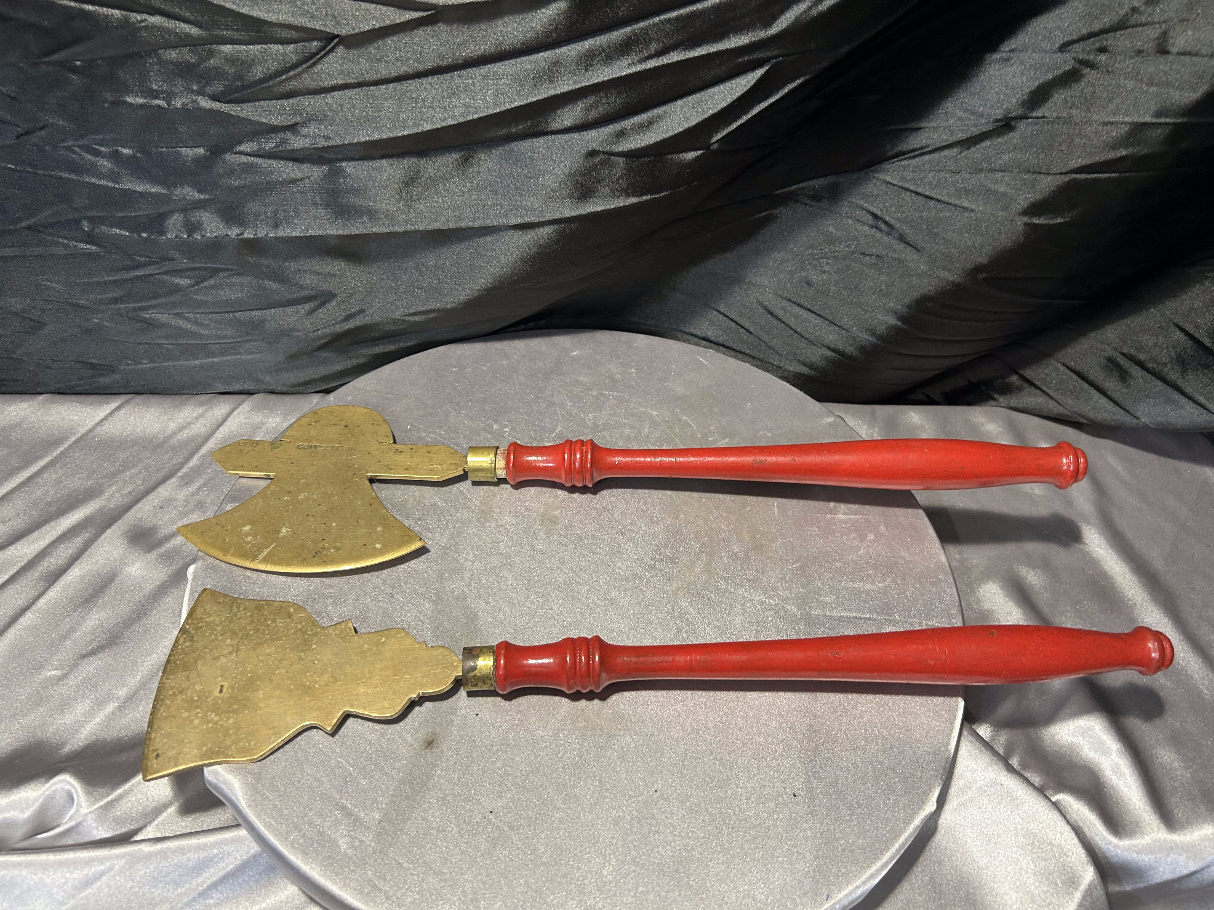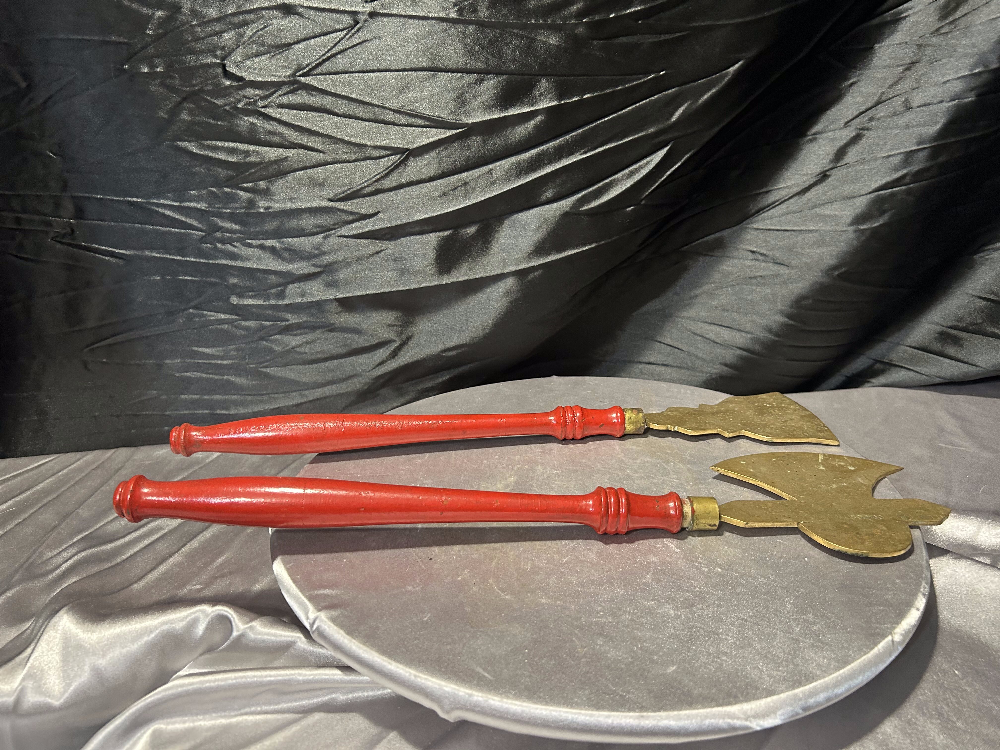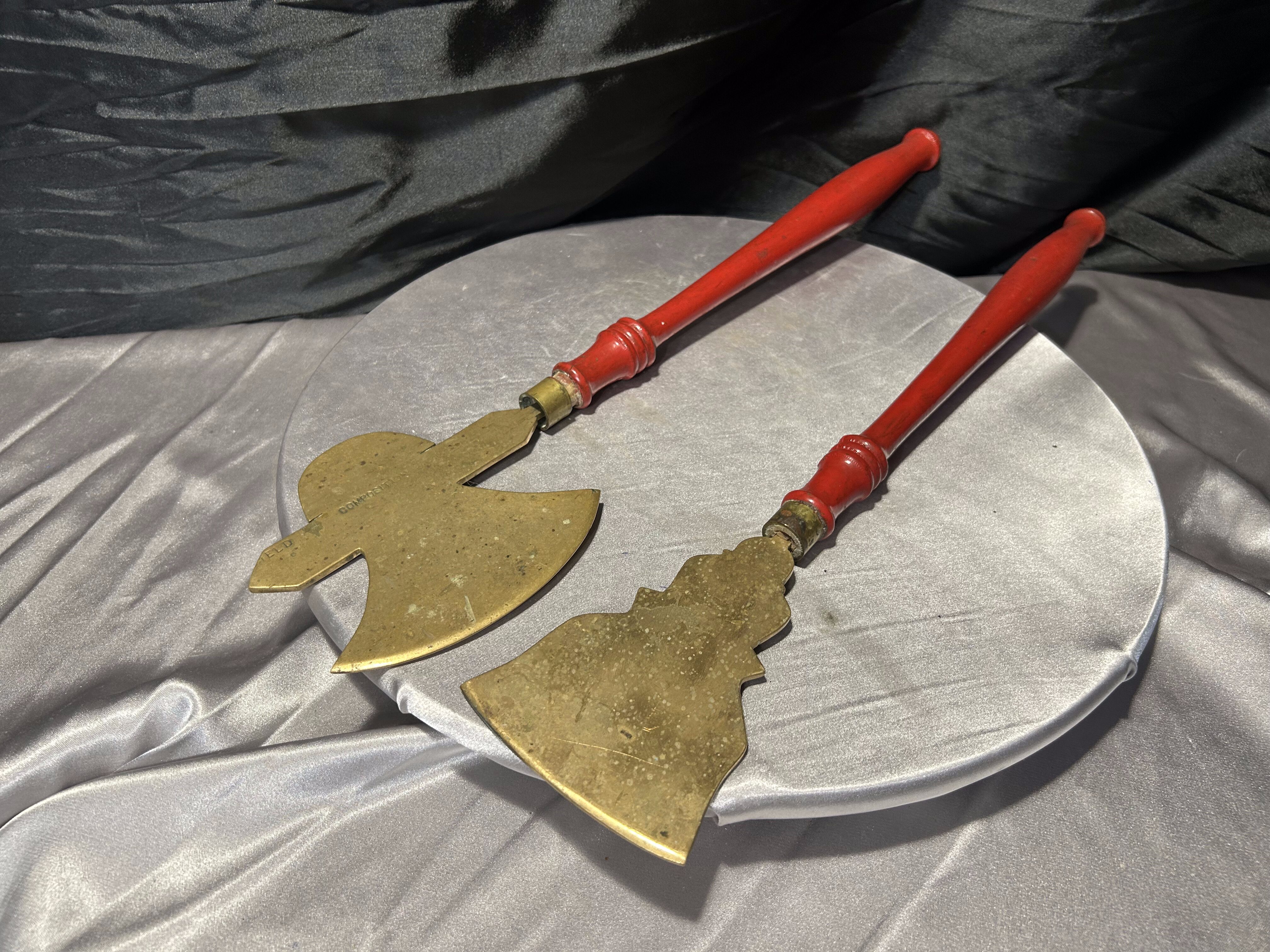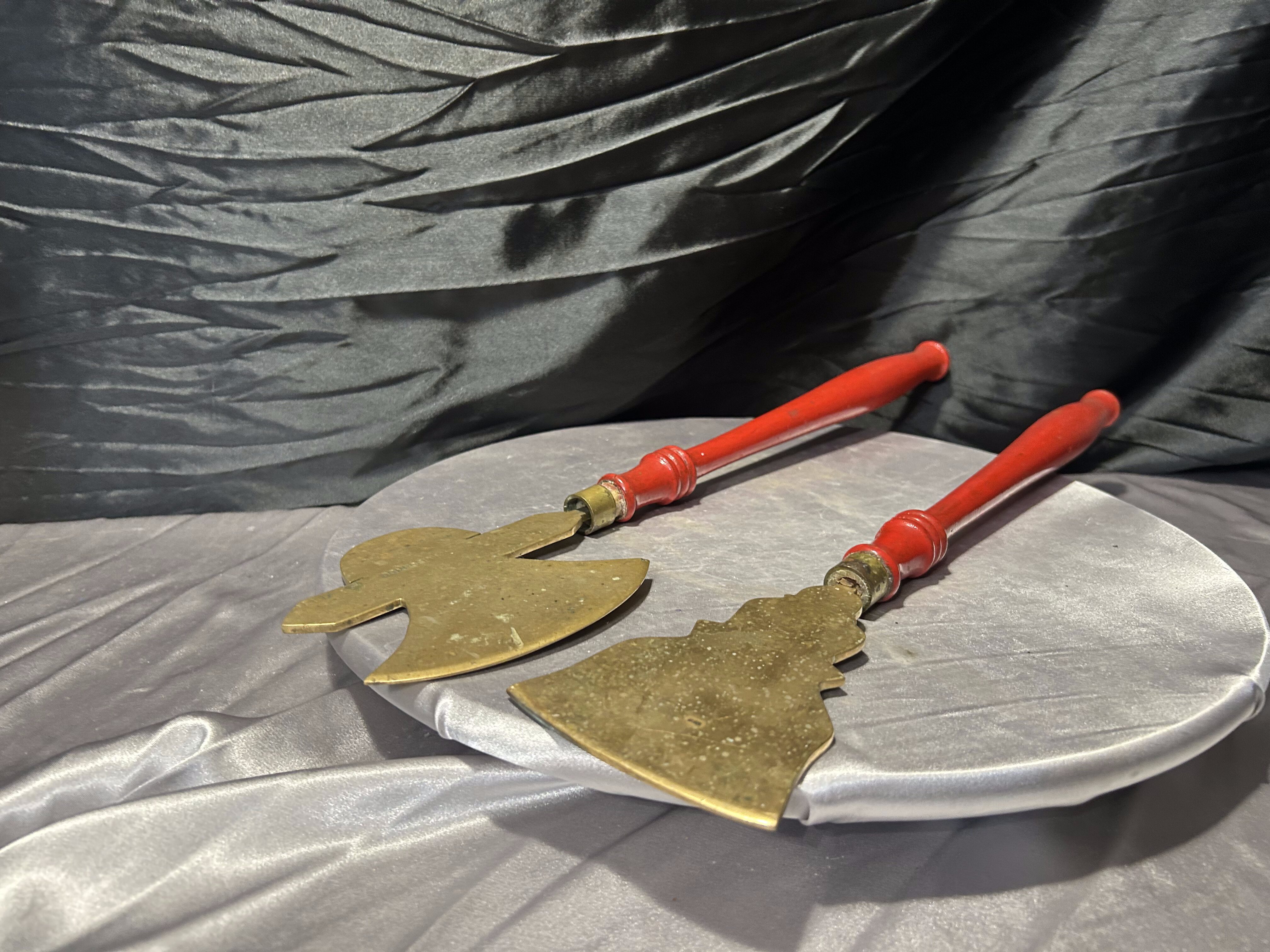 Mosiężne przybory kominkowe – toporek i motyka do paleniska – czerwone rączki