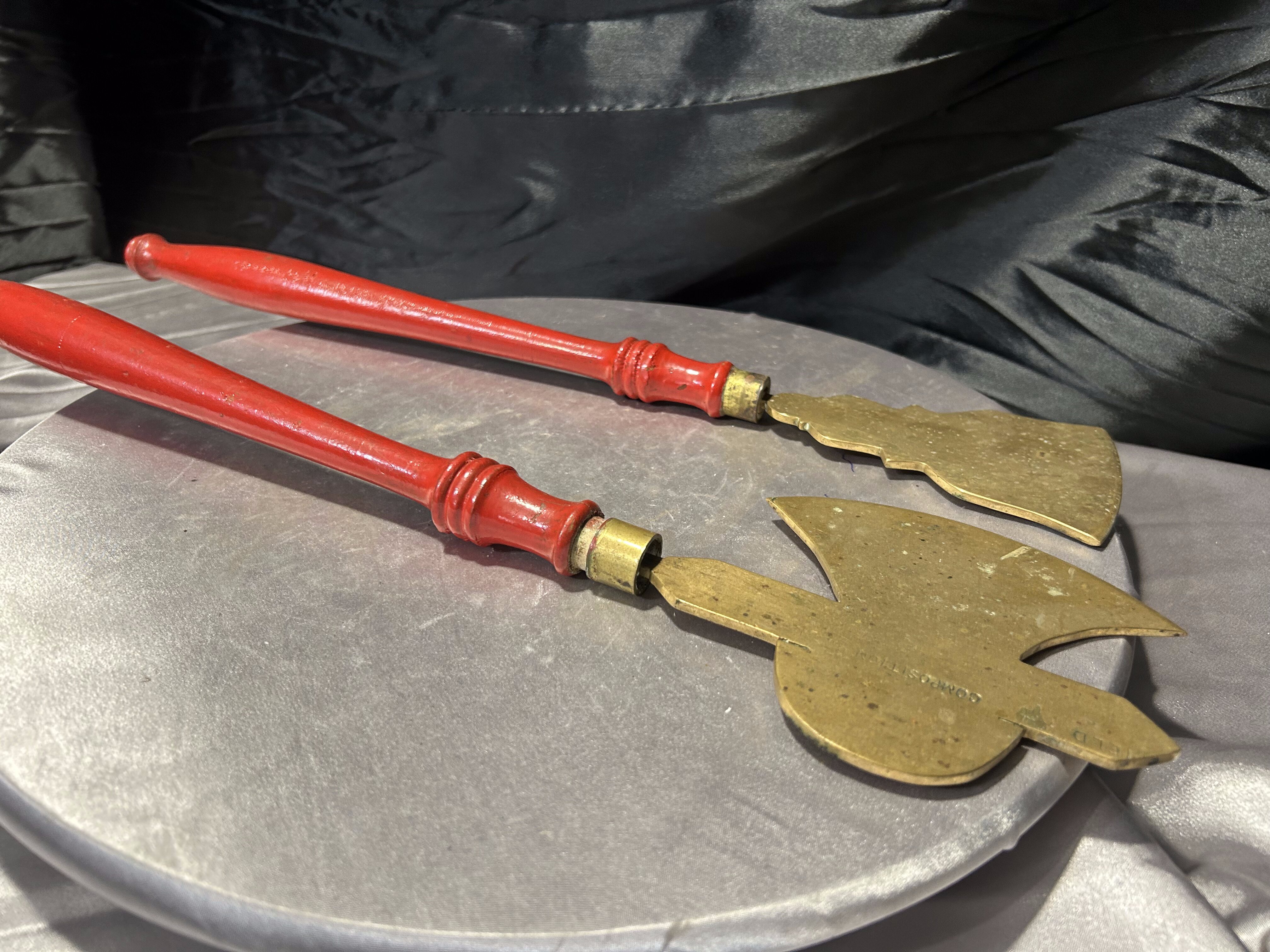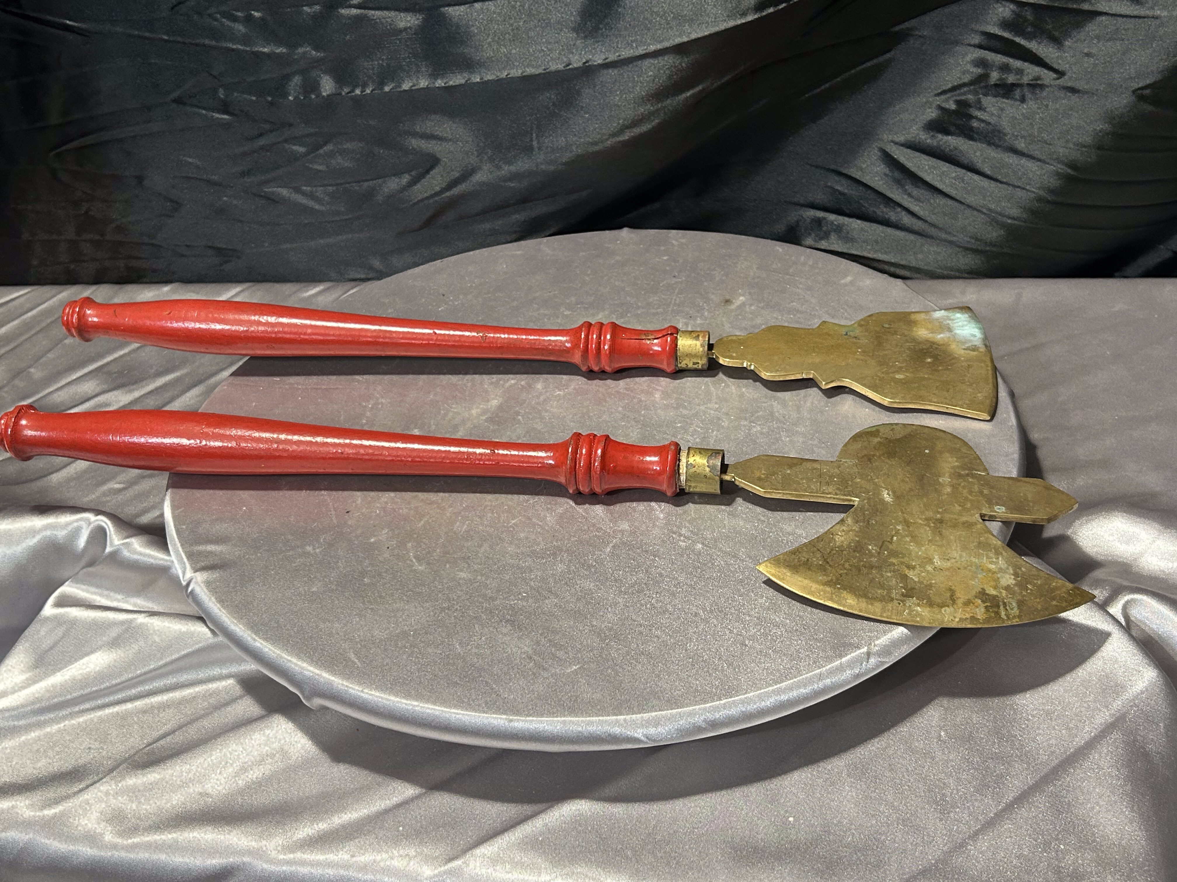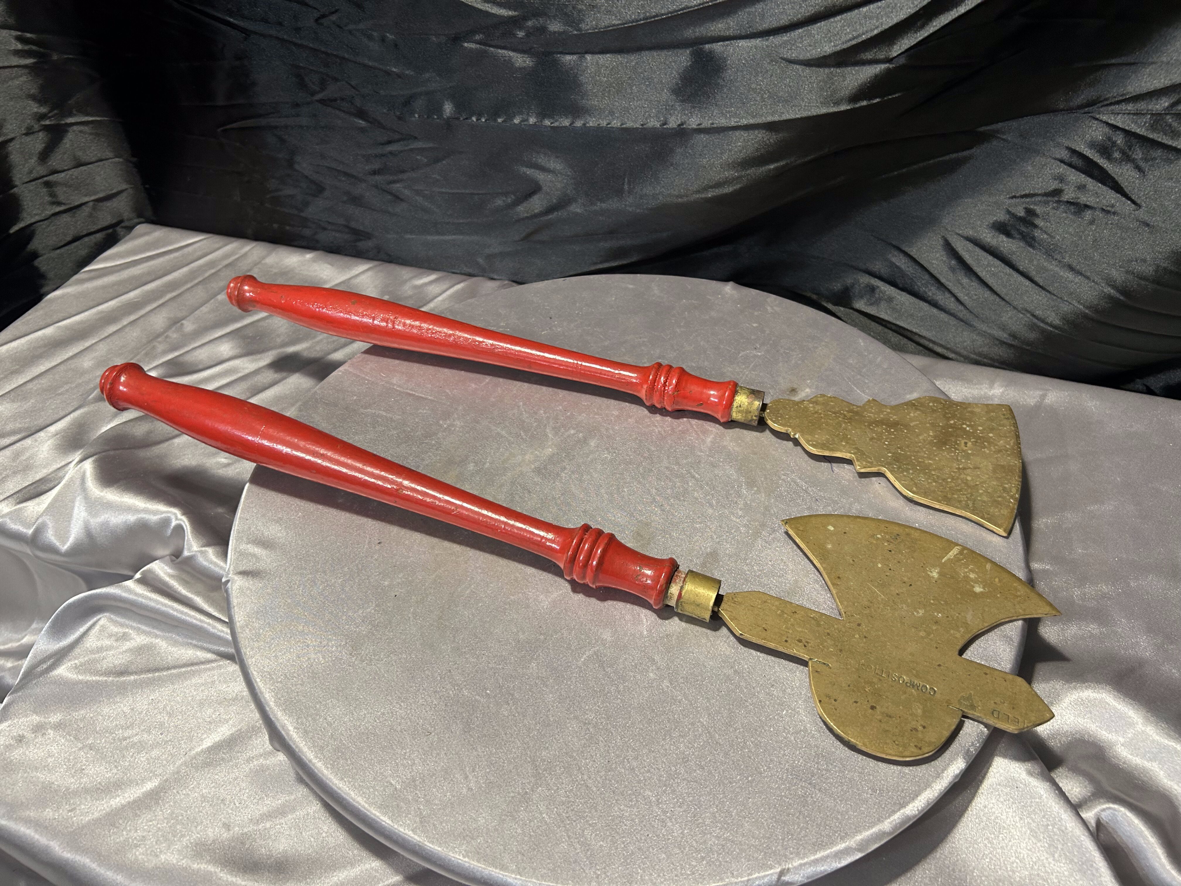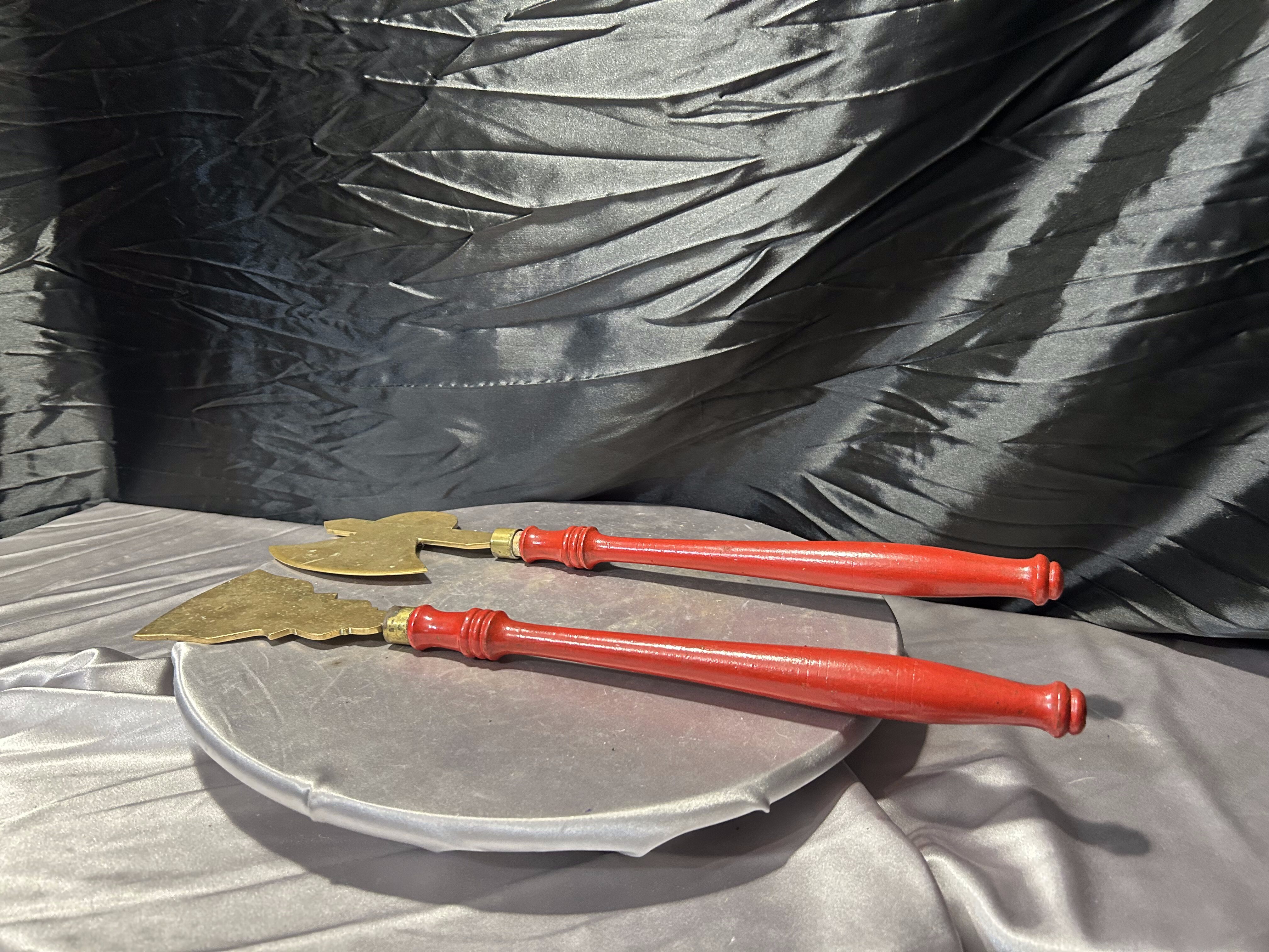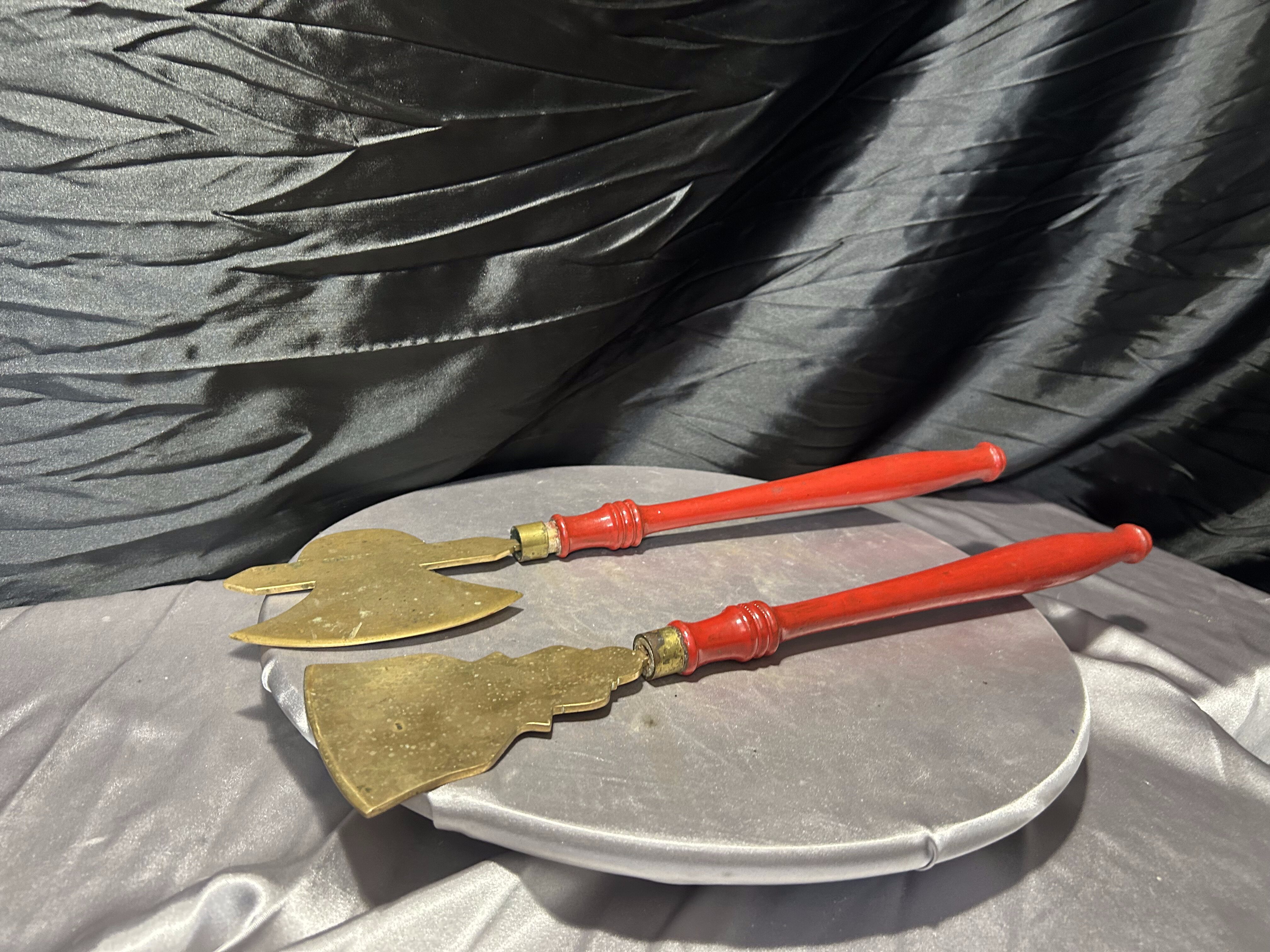 - Mosiężne przybory kominkowe – toporek i motyka do paleniska – czerwone rączki