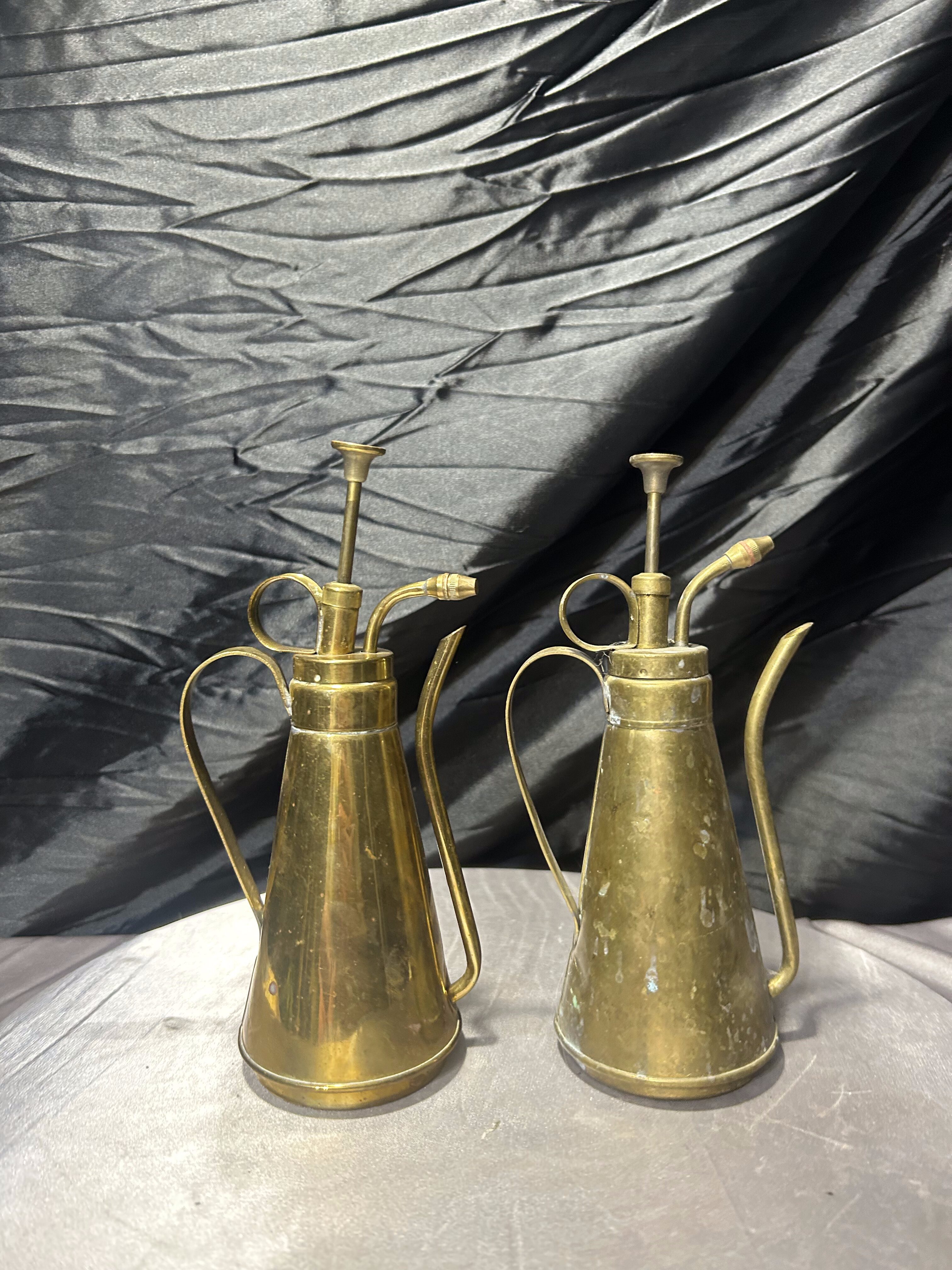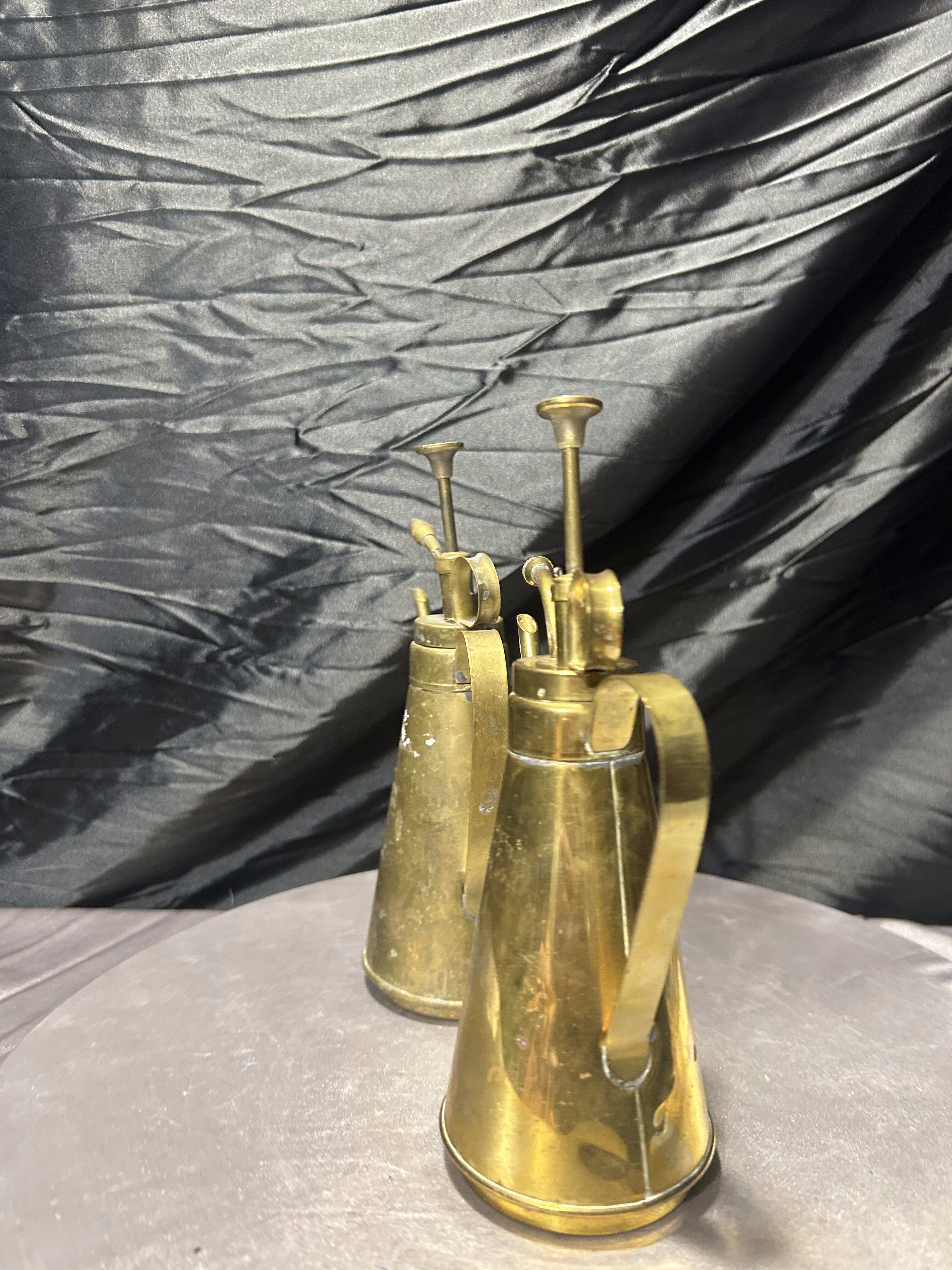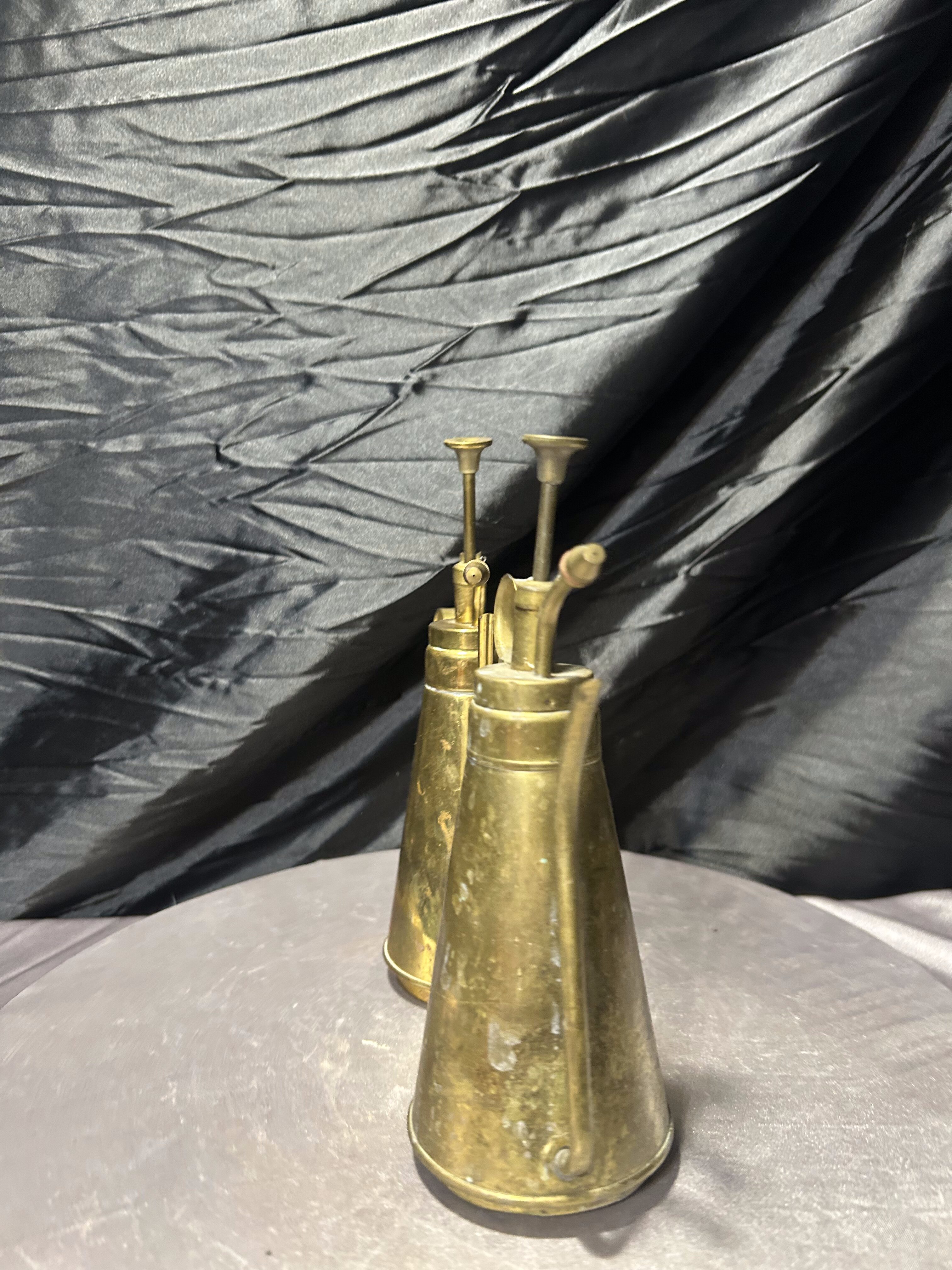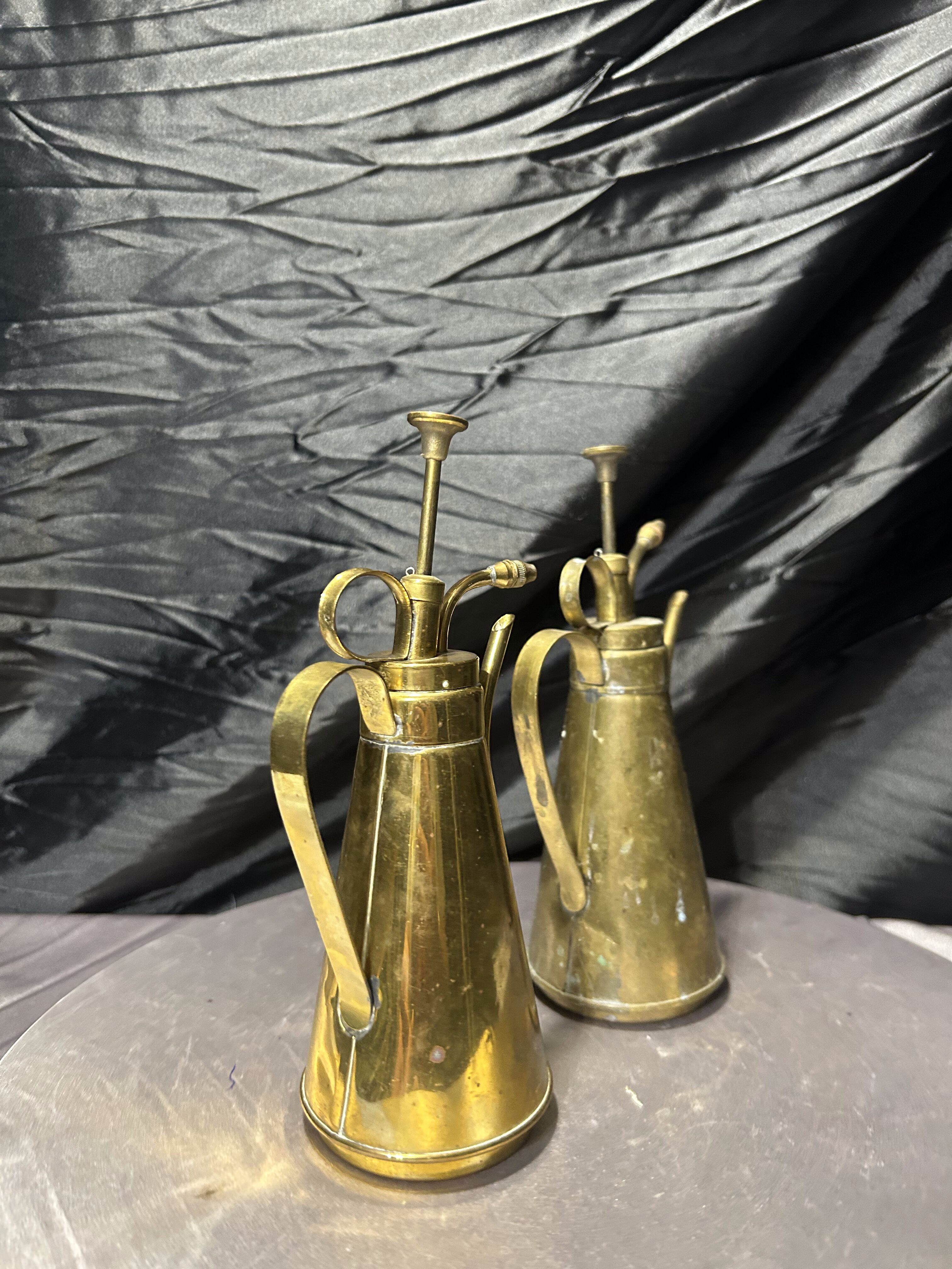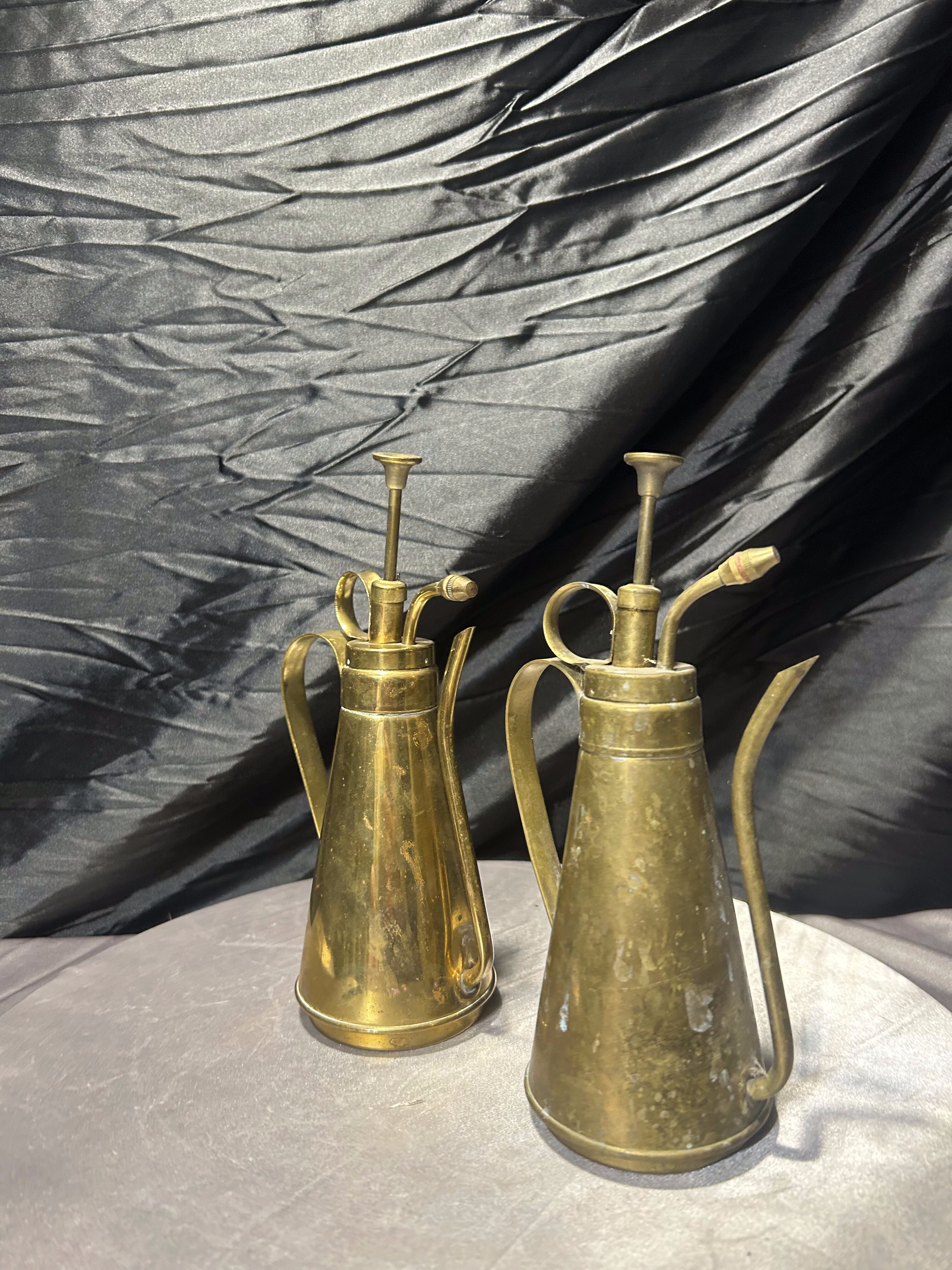 Piękny komplet dwóch mosiężnych spryskiwaczy do roślin utrzymanych w stylu vintage. Wykonane z pełnego mosiądzu, z charakterystyczną, smukłą konstrukcją oraz klasycznym mechanizmem pompowym, który nadaje im wyjątkowego uroku dawnych akcesoriów ogrodniczych.