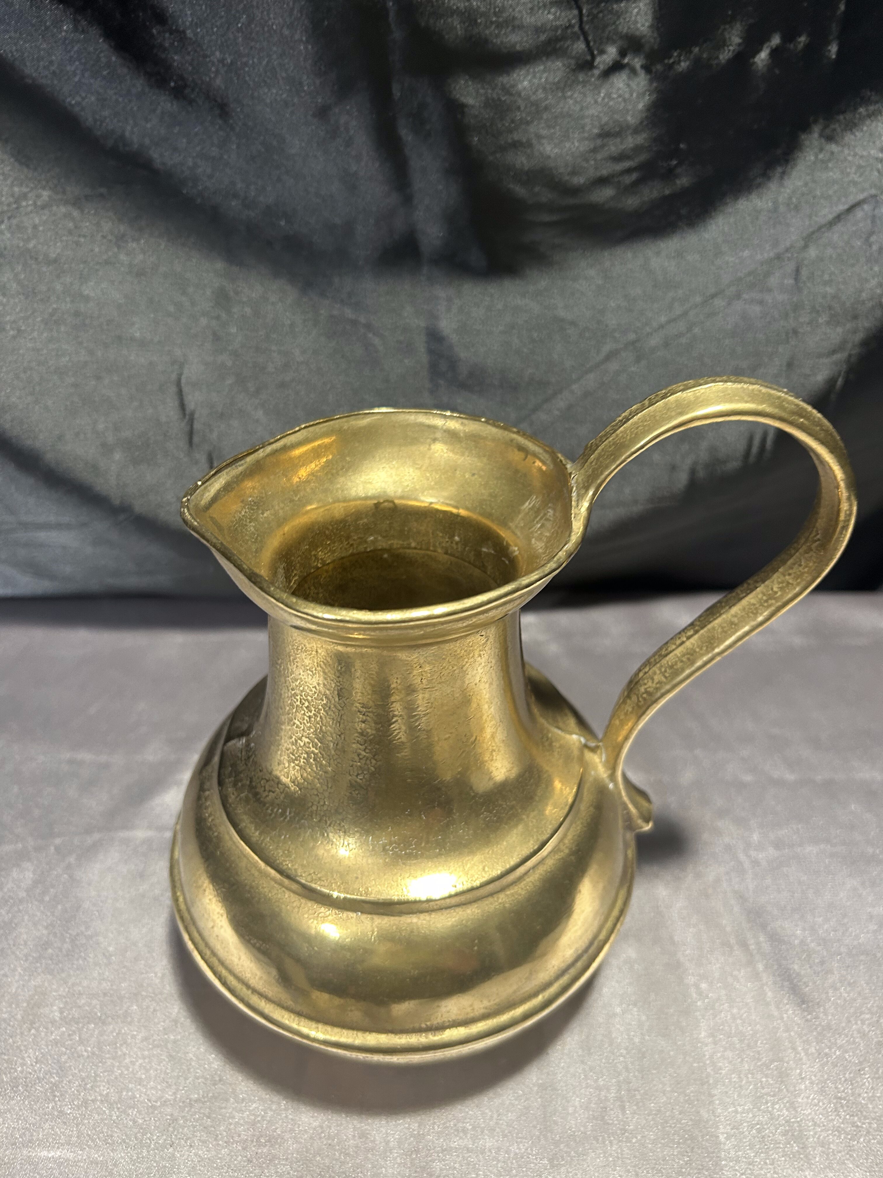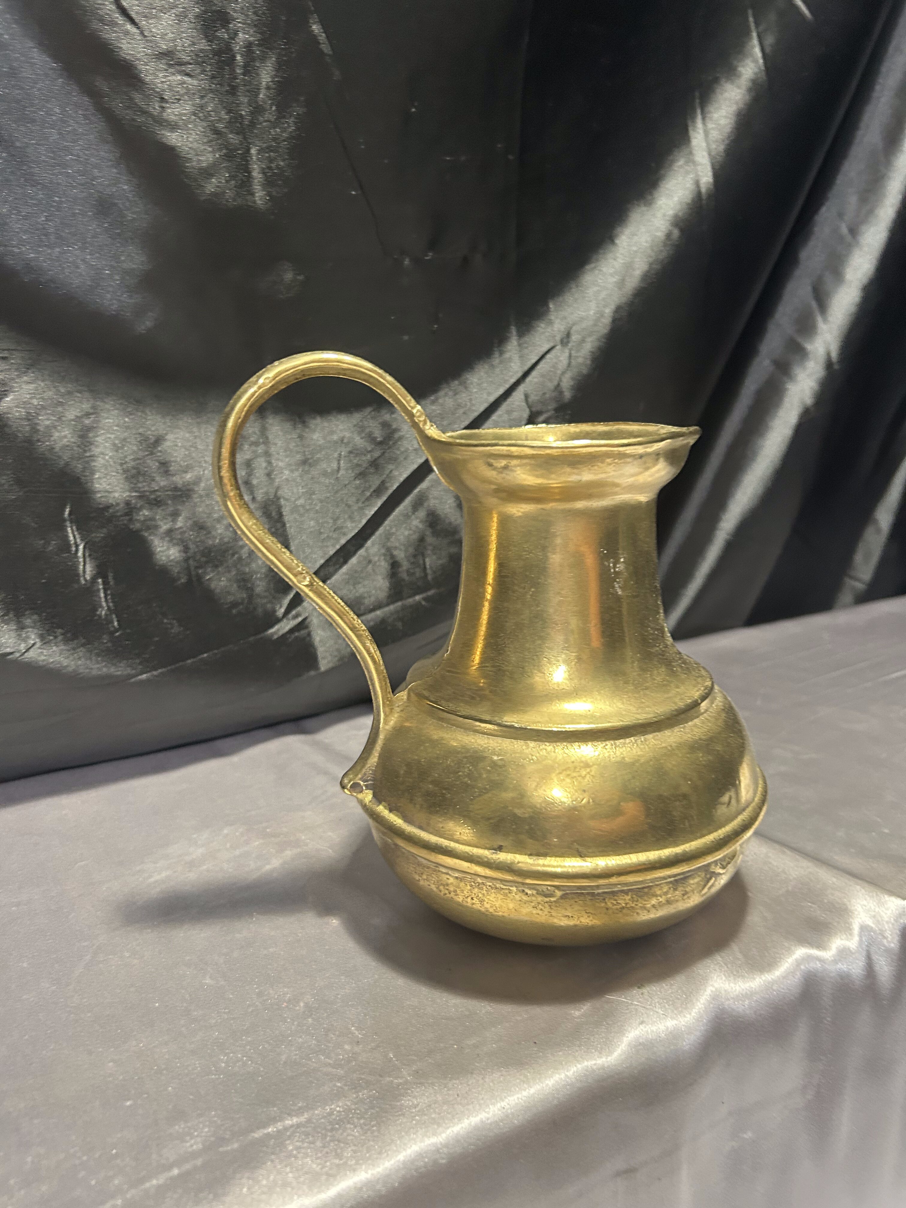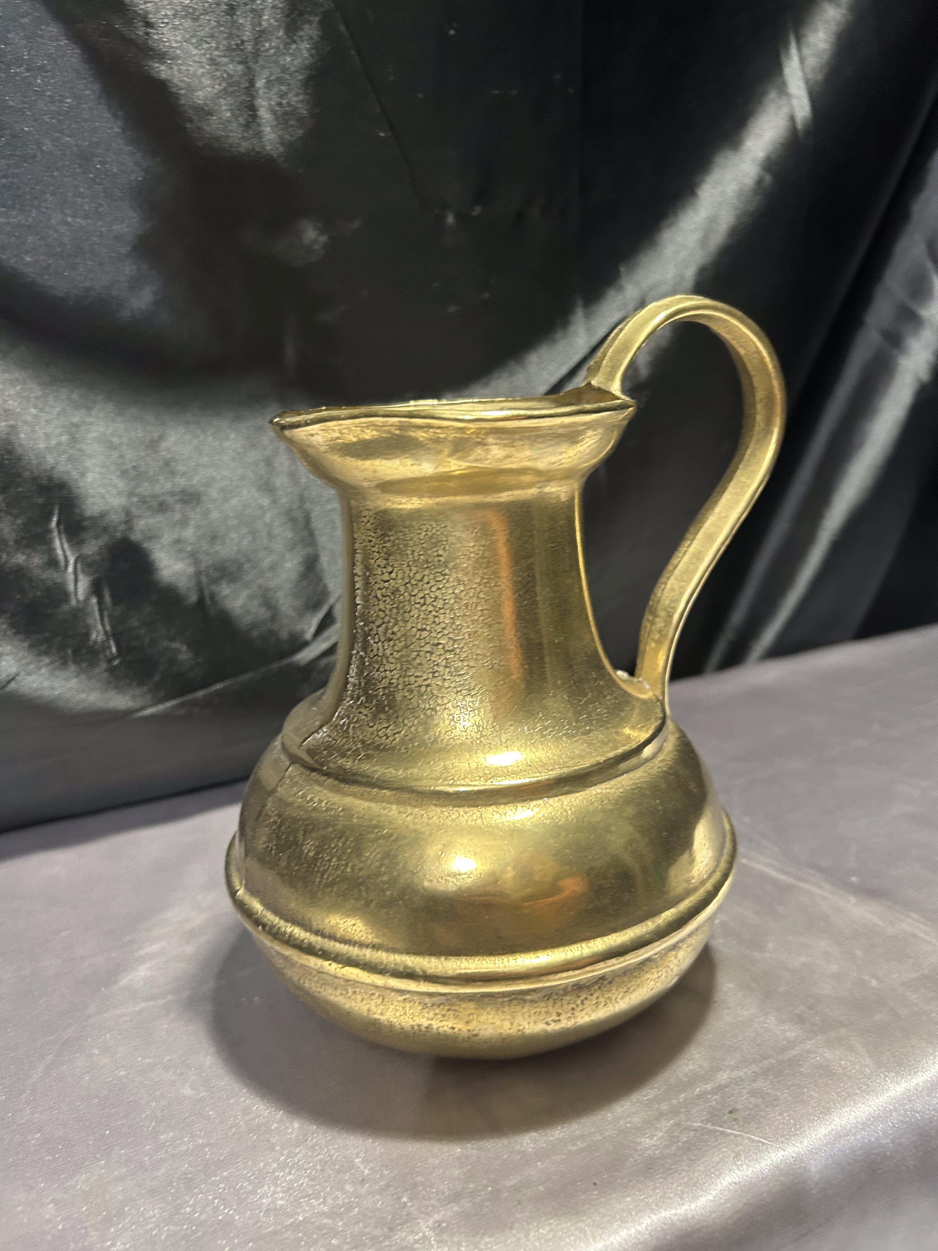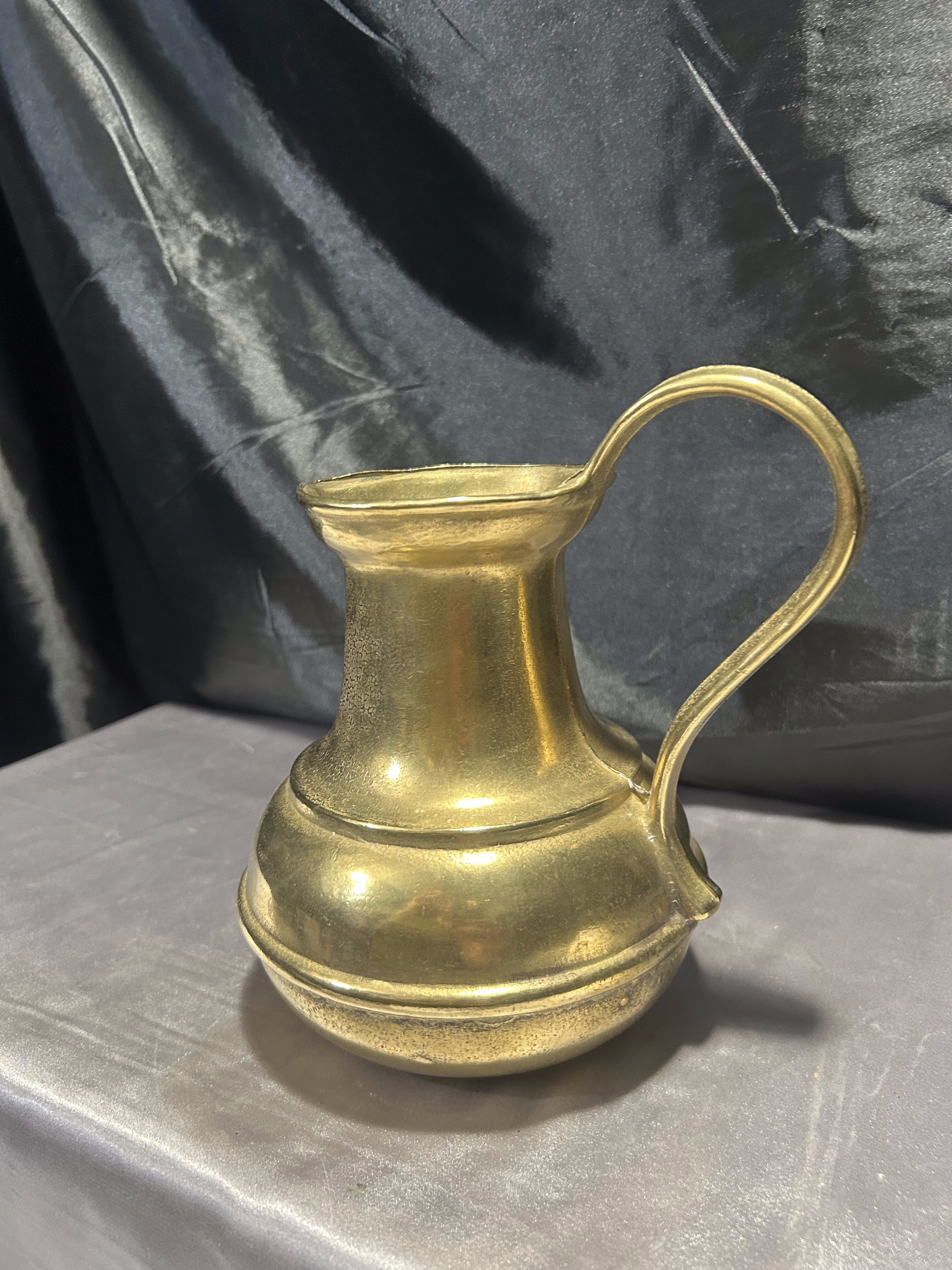 Ten mosiężny dzban to więcej niż naczynie – to świadectwo kunsztu dawnych rzemieślników. Z pewnością odnajdzie się w klasycznych wnętrzach, domach z duszą lub kolekcjach miłośników antycznych metali.