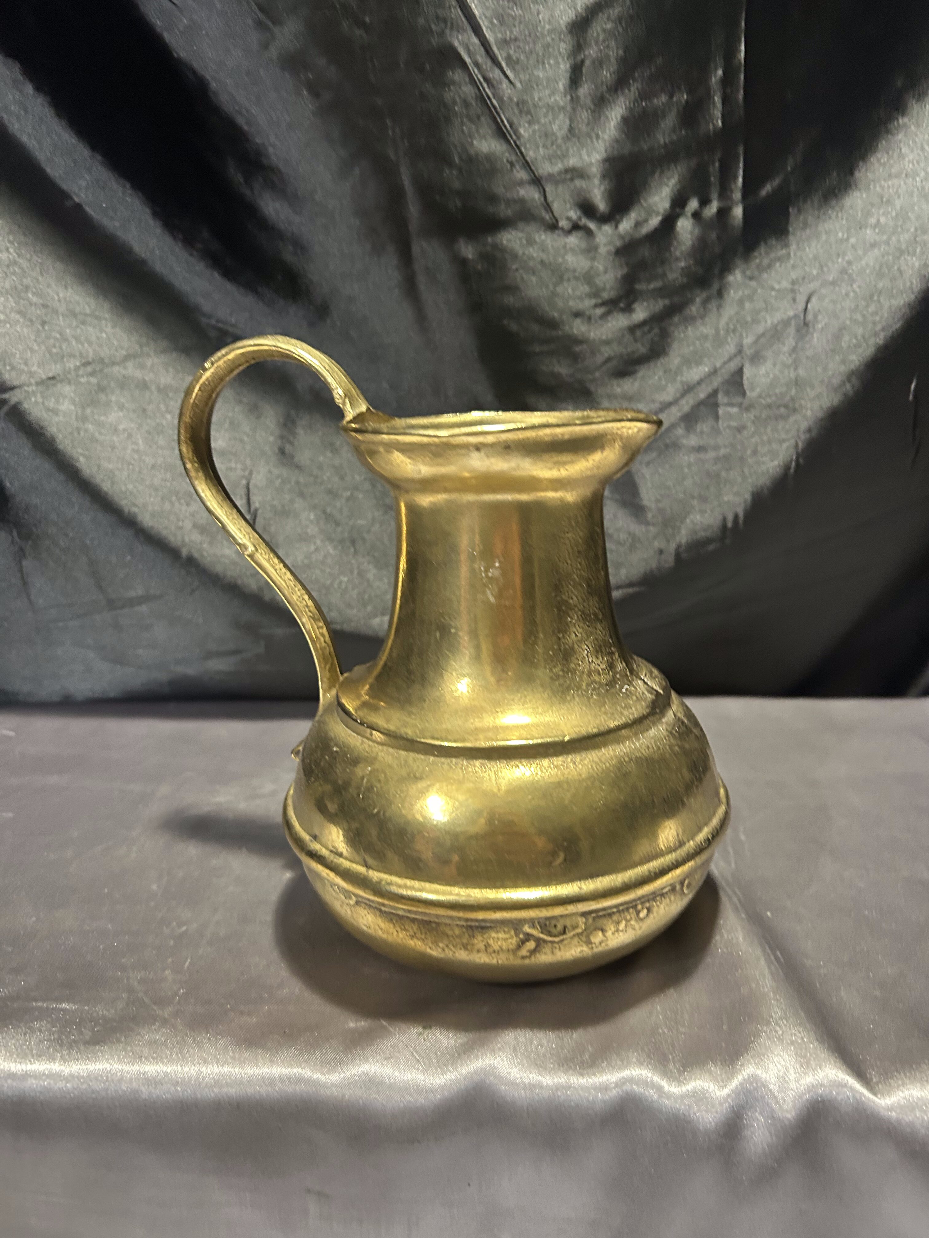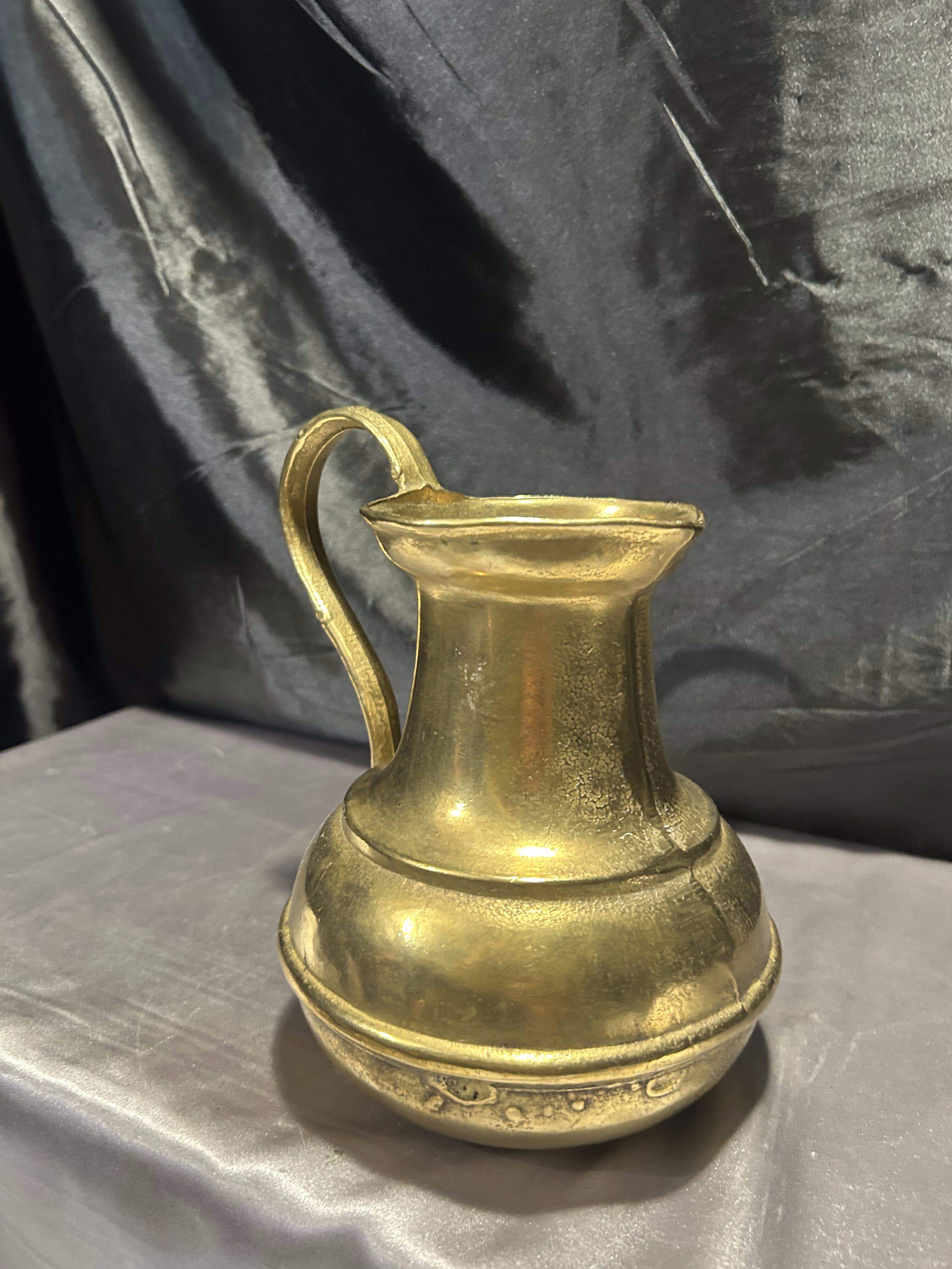 Imponujący dzban wykonany z litego mosiądzu, o klasycznym kształcie i subtelnych liniach, które podkreślają jego elegancki charakter. Sygnatura na spodzie świadczy o rzemieślniczym wykonaniu oraz autentyczności pochodzenia.