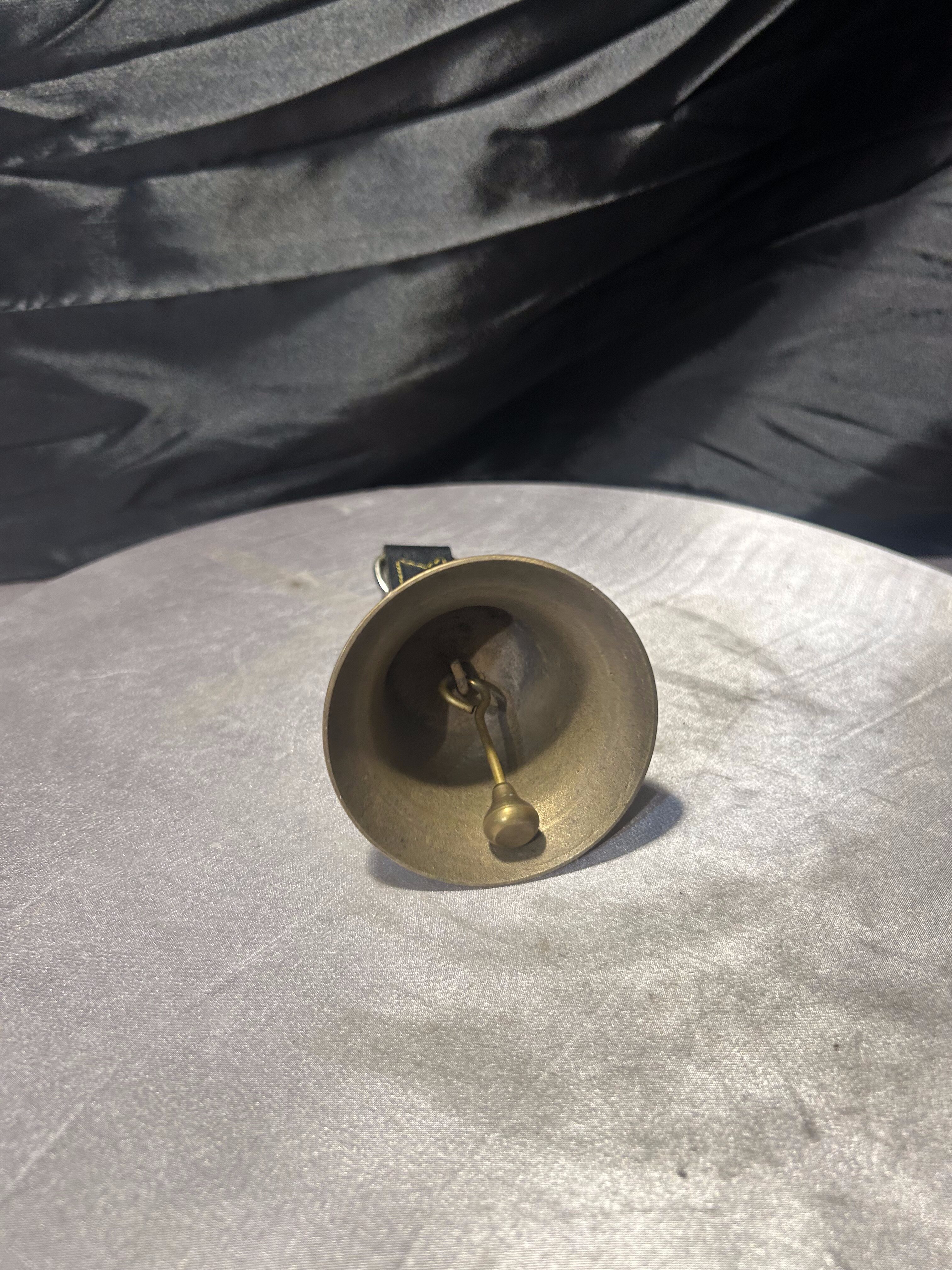 Stylowy dzwonek wykonany z mosiądzu, ozdobiony dekoracyjnym ornamentem przy dolnej krawędzi. Egzemplarz posiada wyraźny napis GJUTEN I MORA, który wskazuje na skandynawskie pochodzenie przedmiotu. Mora to miejscowość w Szwecji znana z tradycji rzemieślniczych oraz produkcji wyrobów metalowych.
