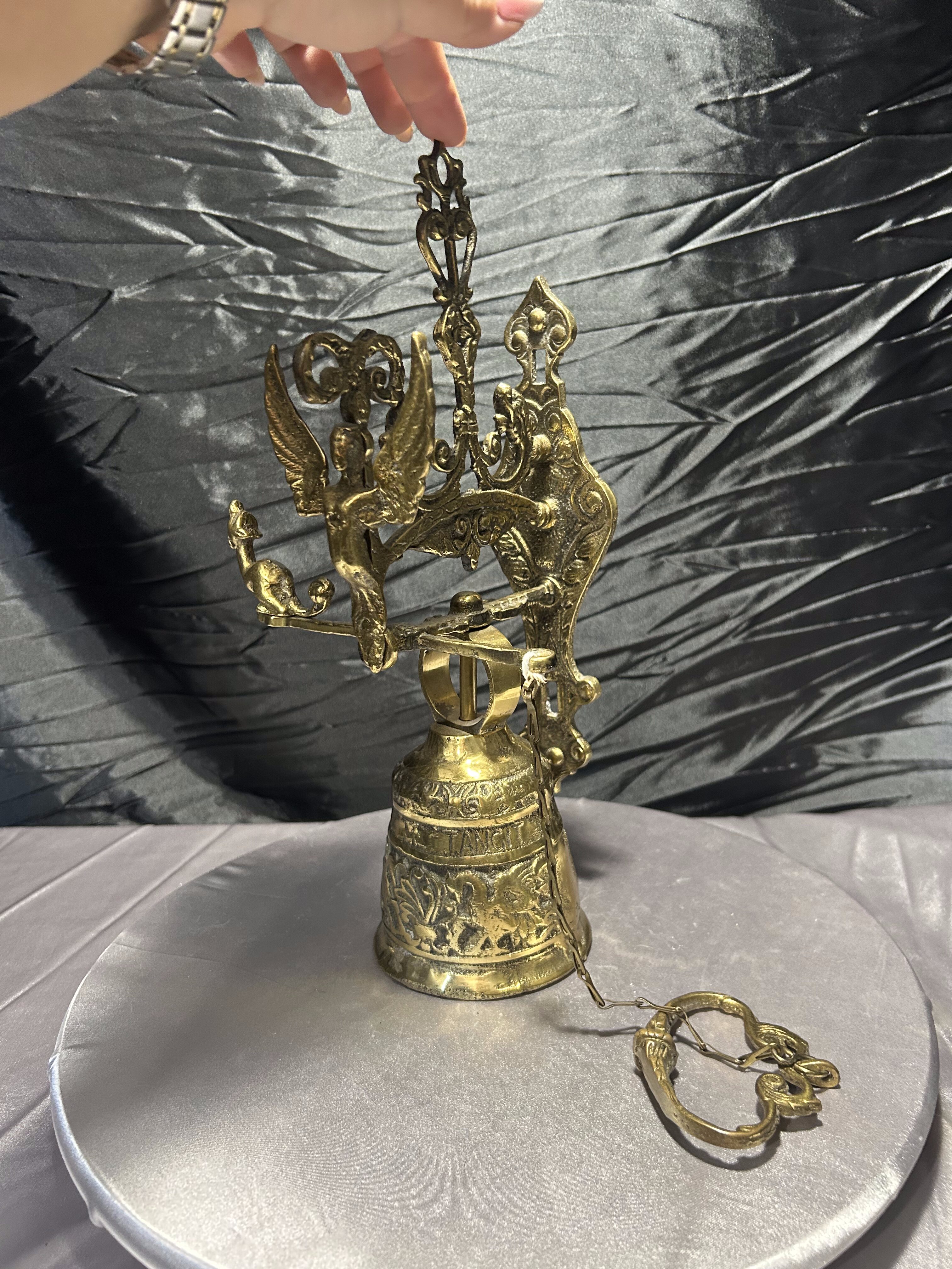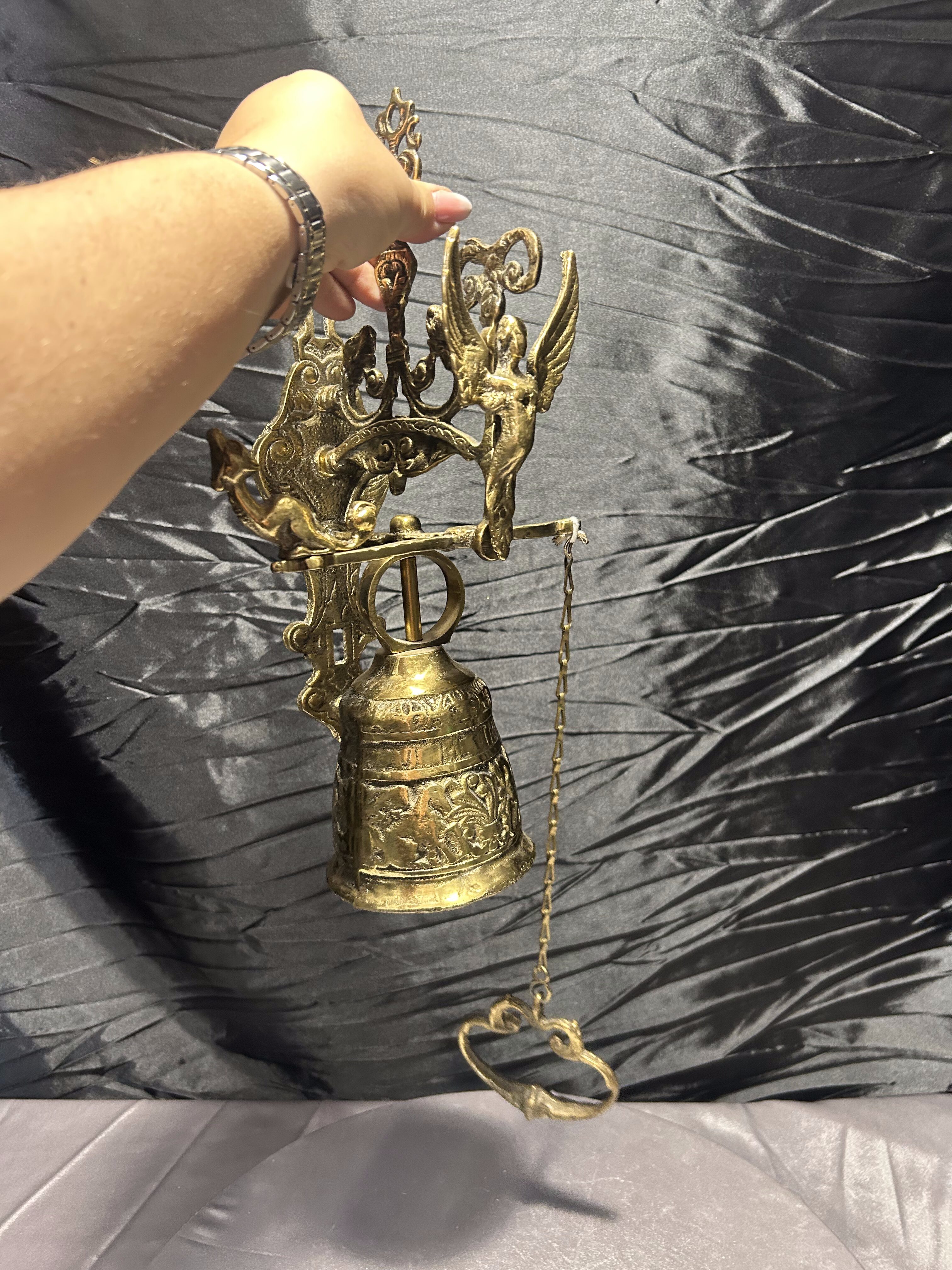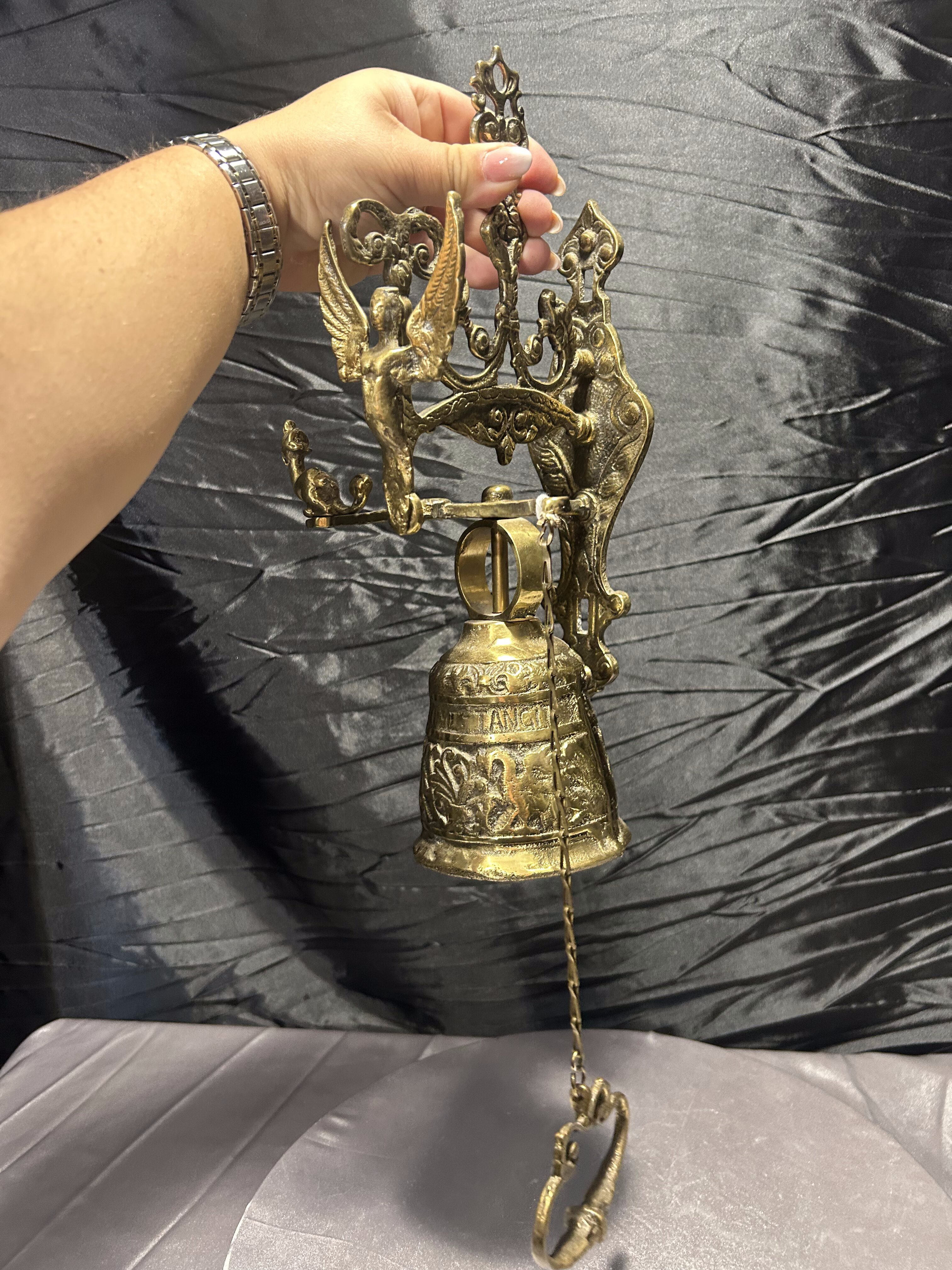Mosiężny dzwonek ścienny z aniołem – dekoracyjny – ciężki, bogato zdobiony