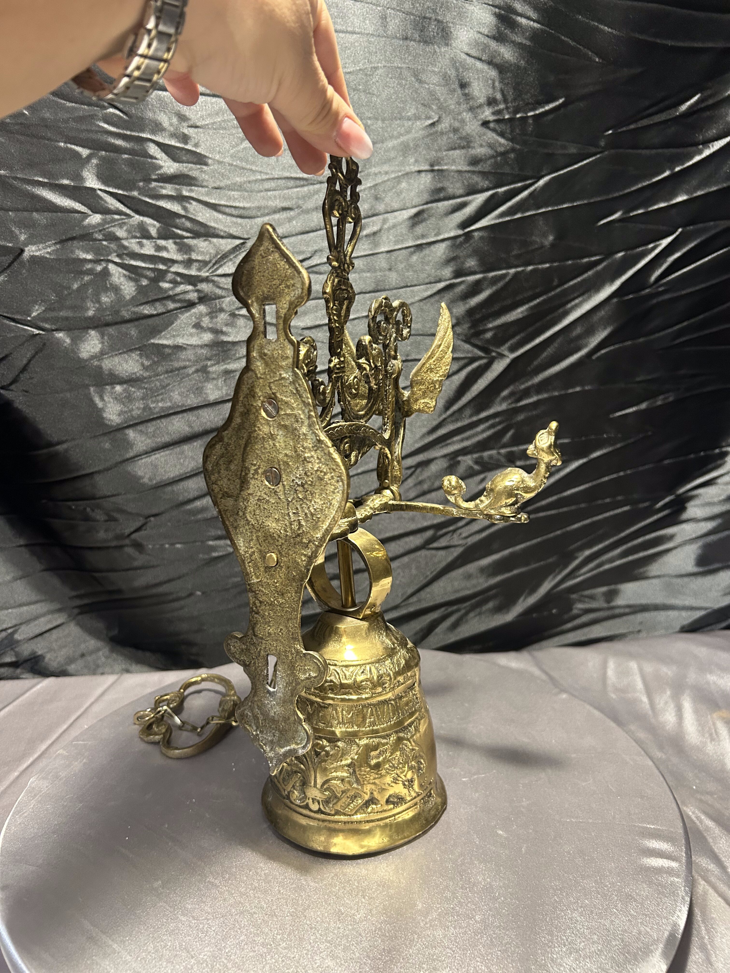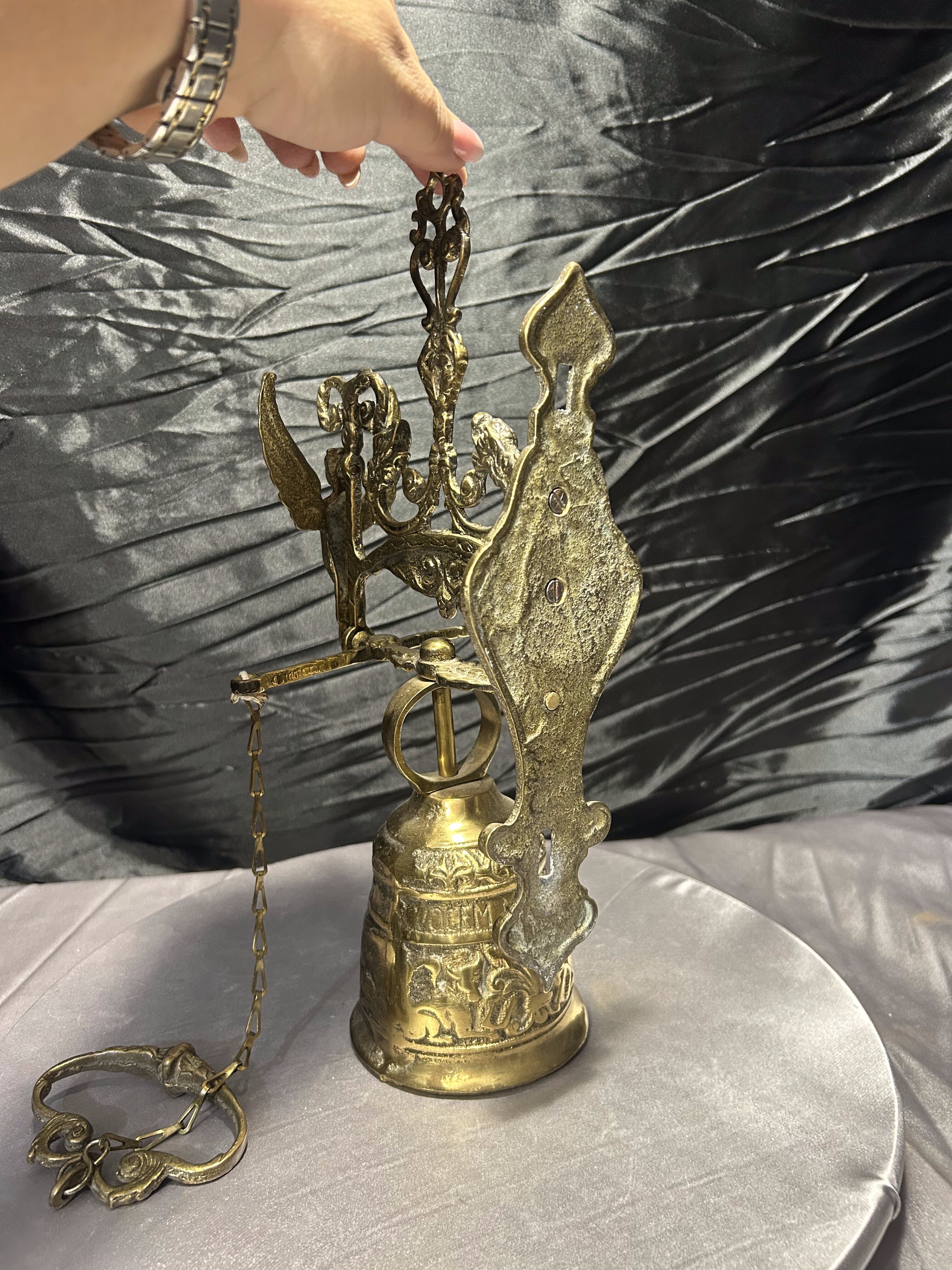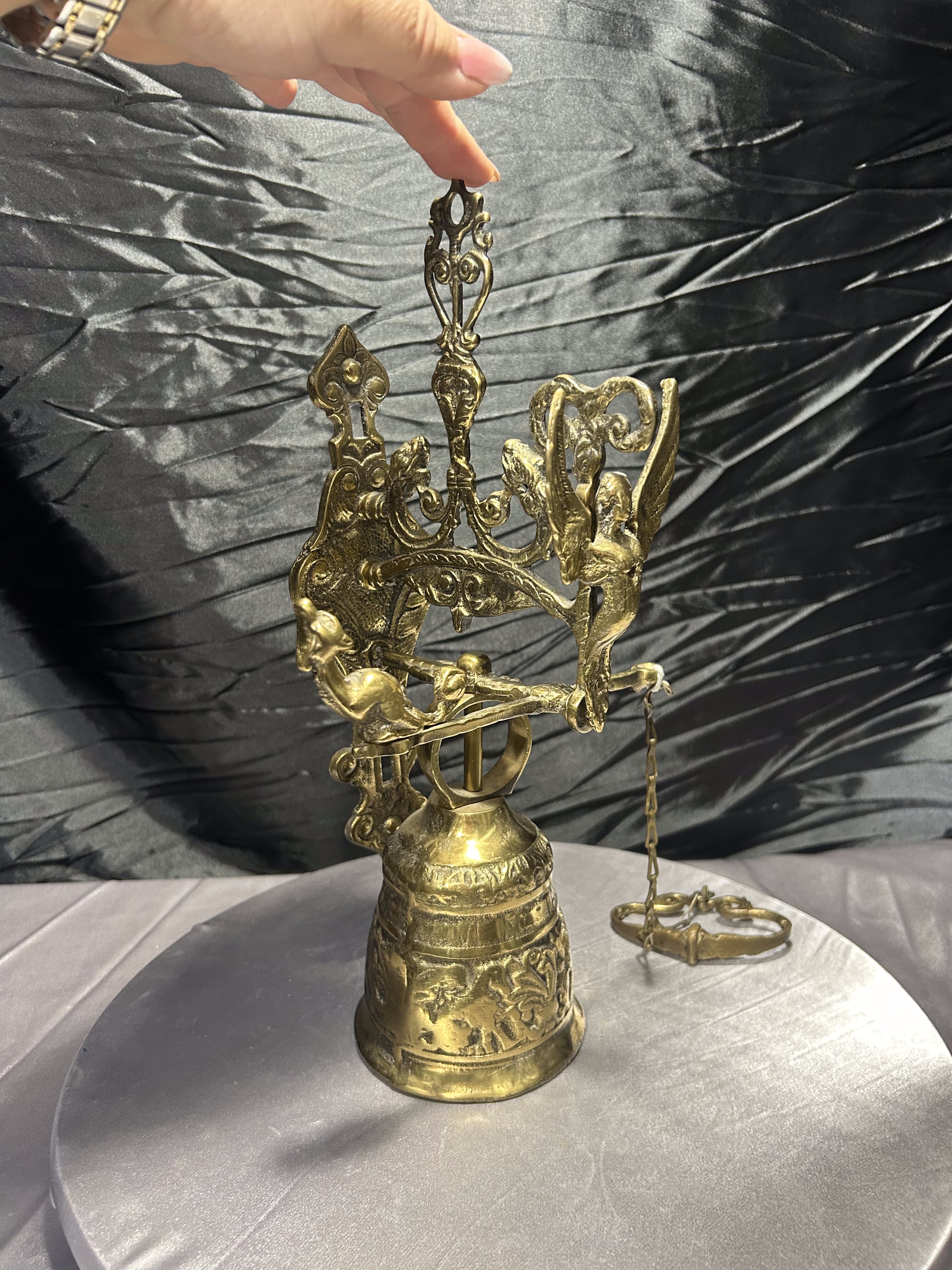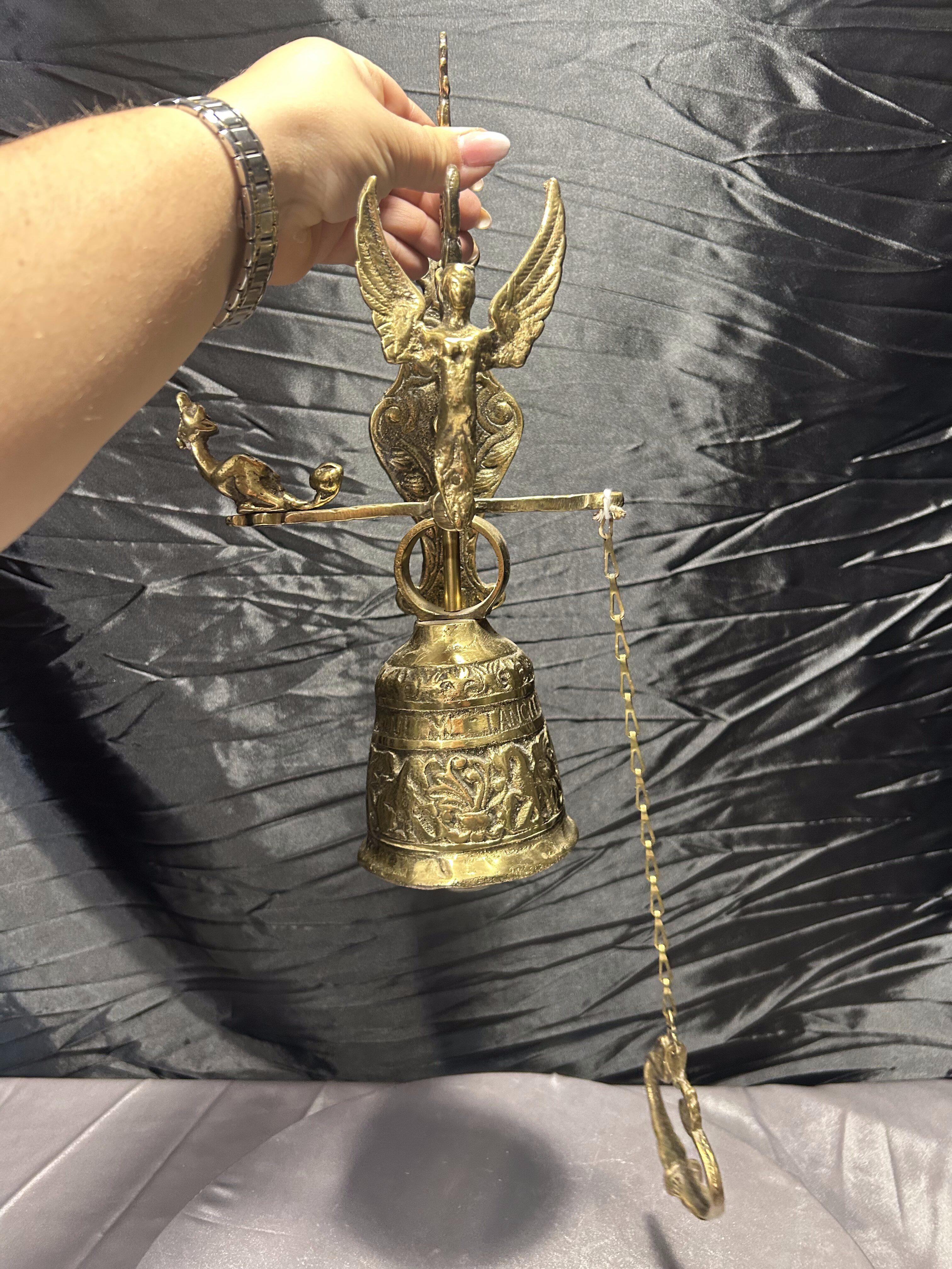 Mosiężny dzwonek ścienny z aniołem – dekoracyjny – ciężki, bogato zdobiony