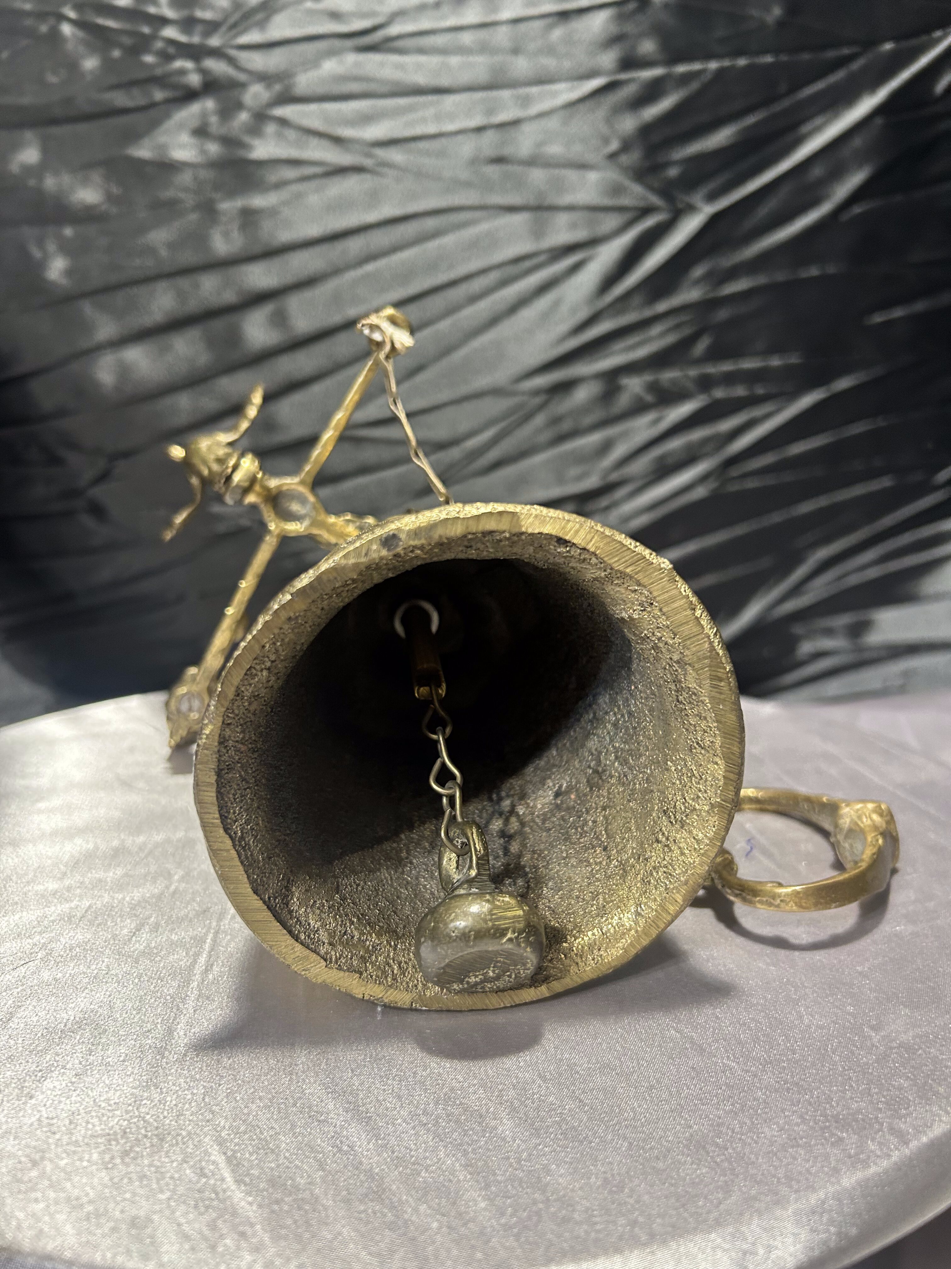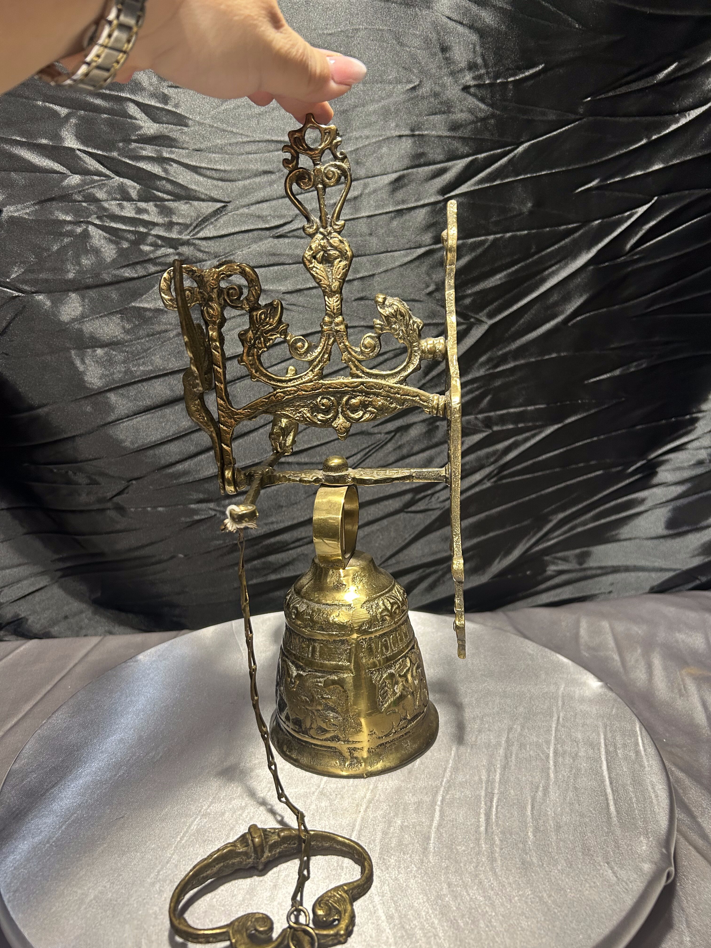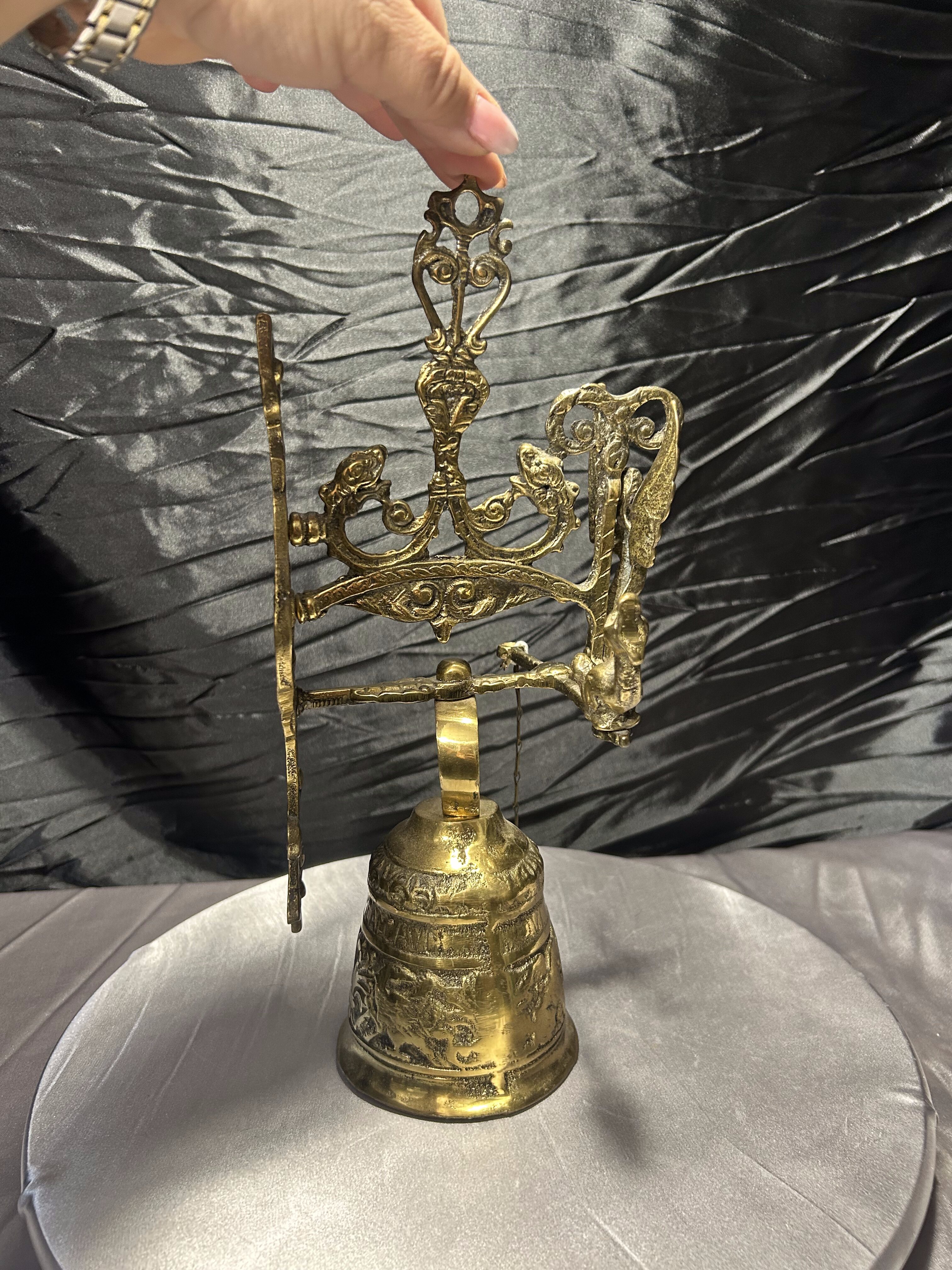 Okazały, mosiężny dzwonek ścienny o imponującej formie i bogatych zdobieniach. Wykonany z litego mosiądzu, zachwyca detalami – motywem anioła z rozpostartymi skrzydłami oraz finezyjnymi ornamentami roślinnymi. Dzwonek zawieszony jest na ozdobnym uchwycie i posiada łańcuszek z rączką do dzwonienia, dzięki czemu stanowi nie tylko element dekoracyjny, ale również w pełni funkcjonalny.
