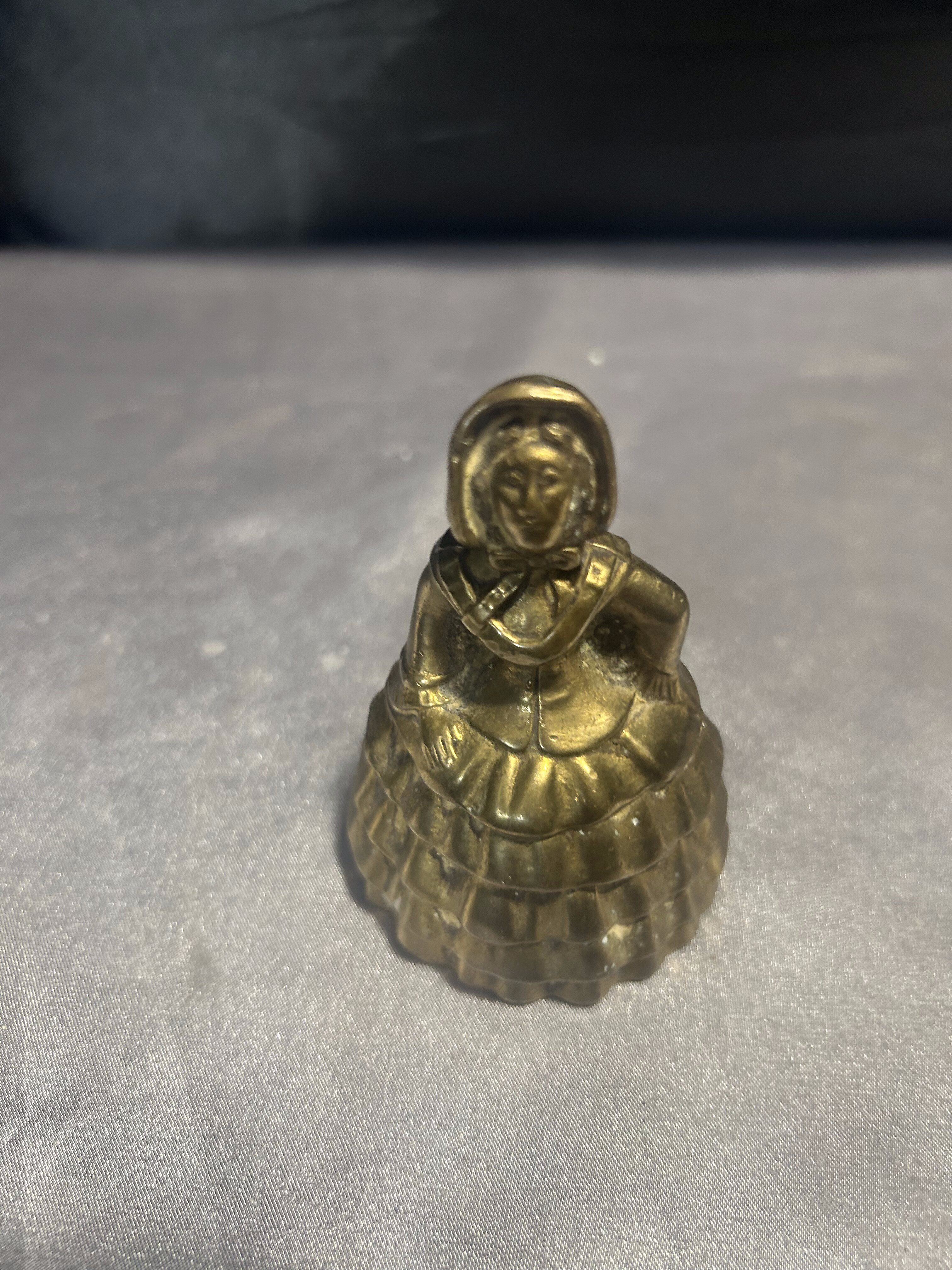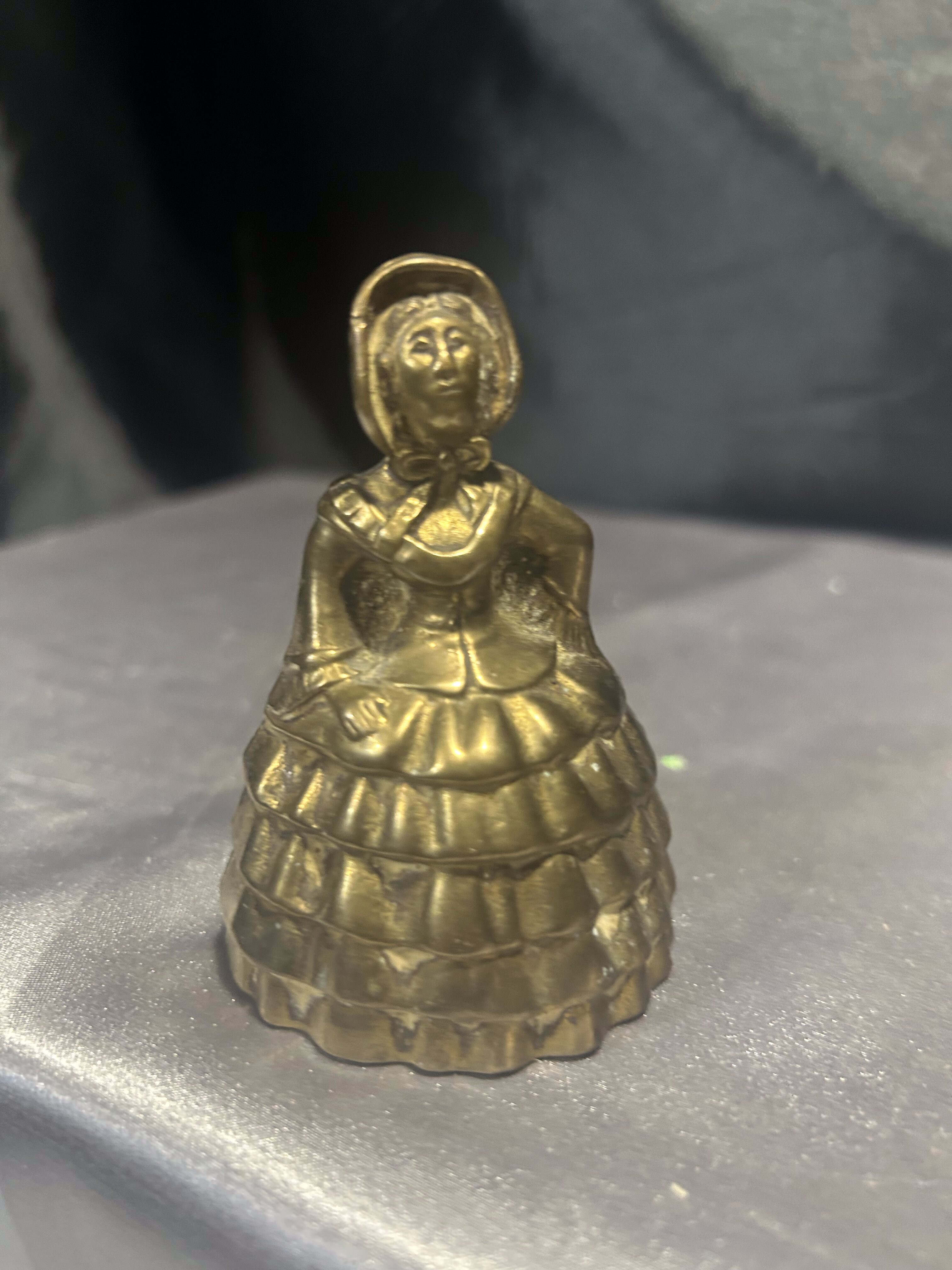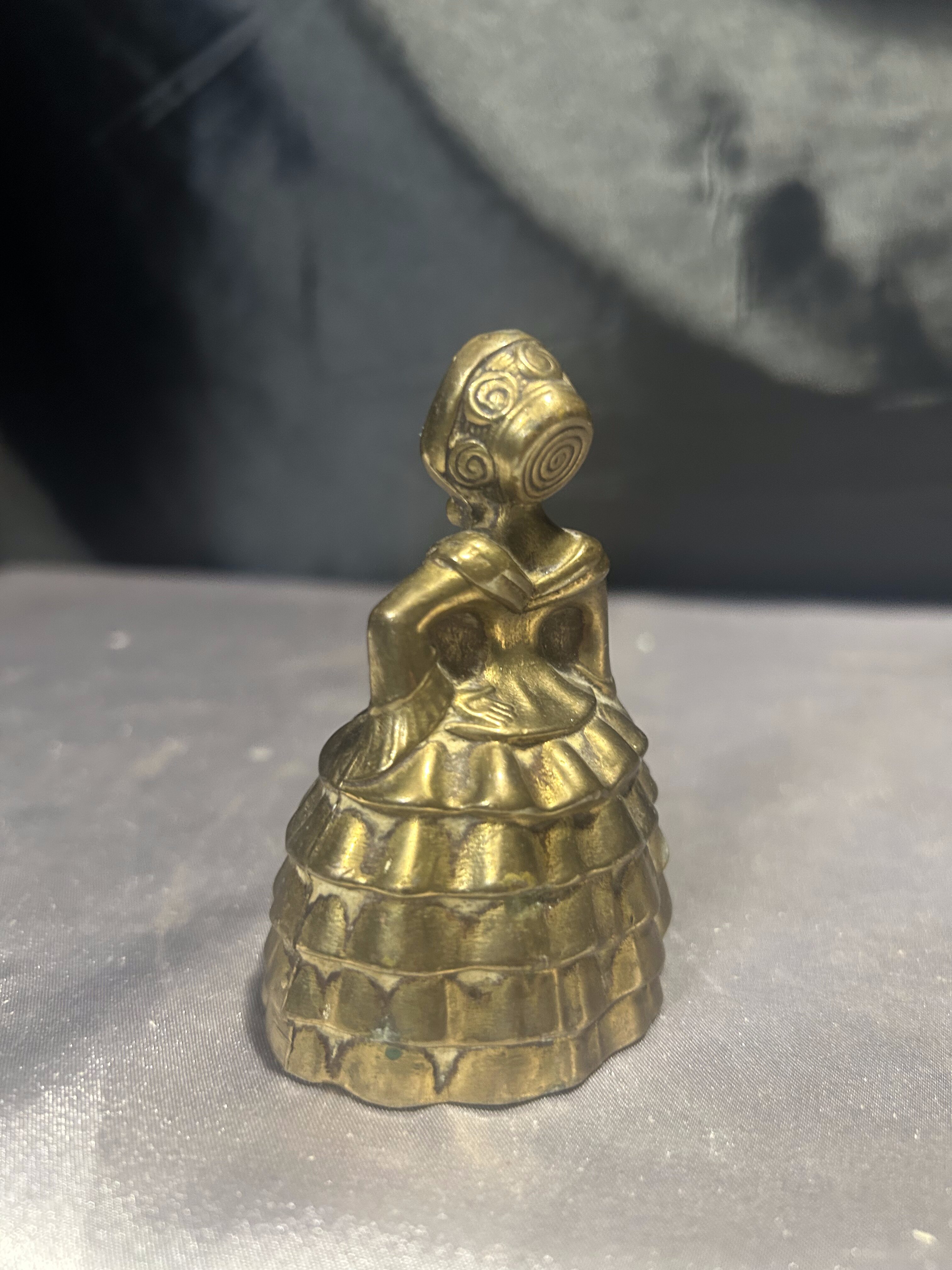 Na sprzedaż mosiężny dzwonek przedstawiający damę w eleganckiej sukni, sygnowany Made in England. Starannie wykonany, z dbałością o detale, o pięknym, czystym brzmieniu. To wyjątkowy przedmiot, idealny do kolekcji lub jako elegancka ozdoba wnętrza.