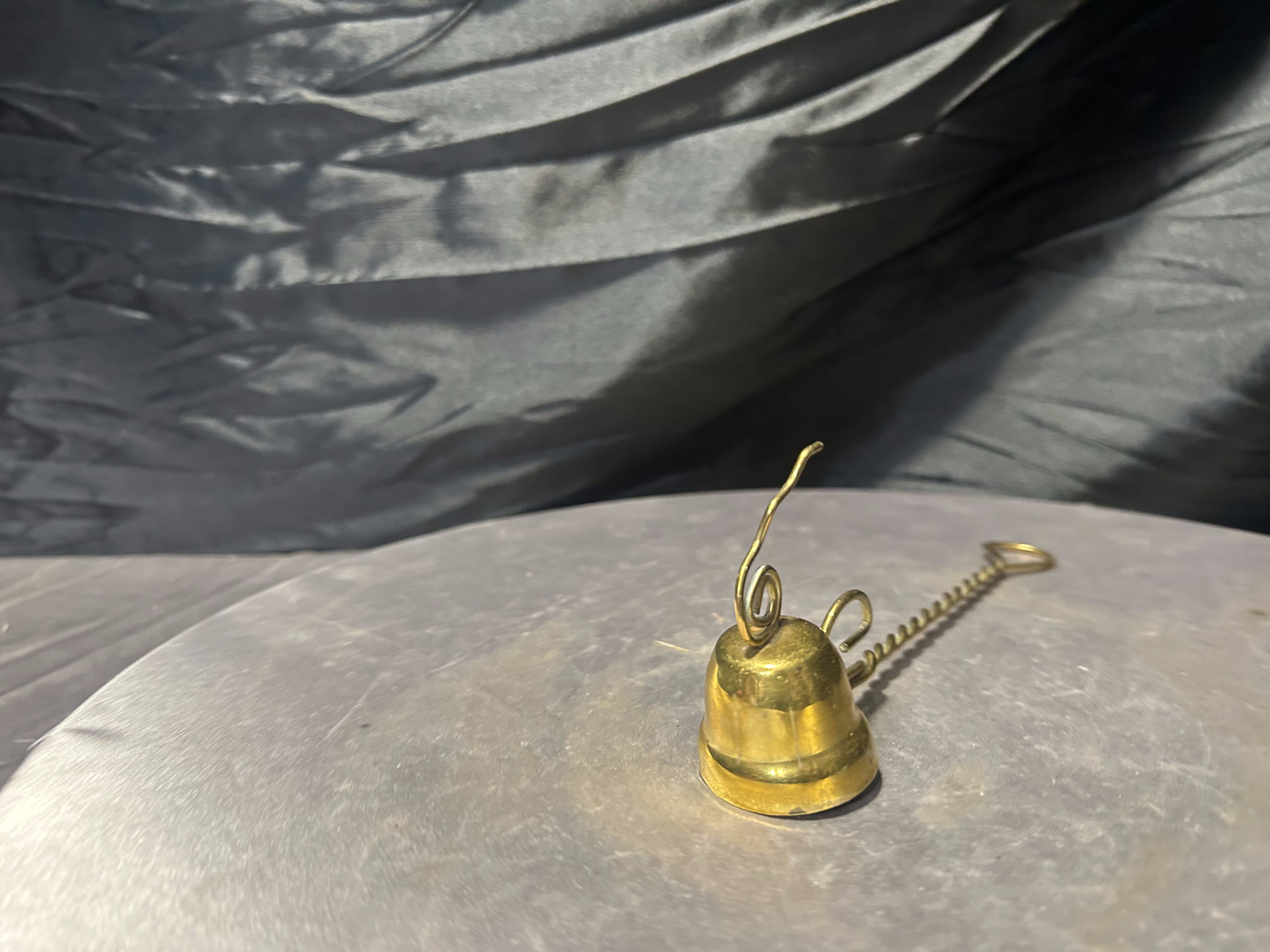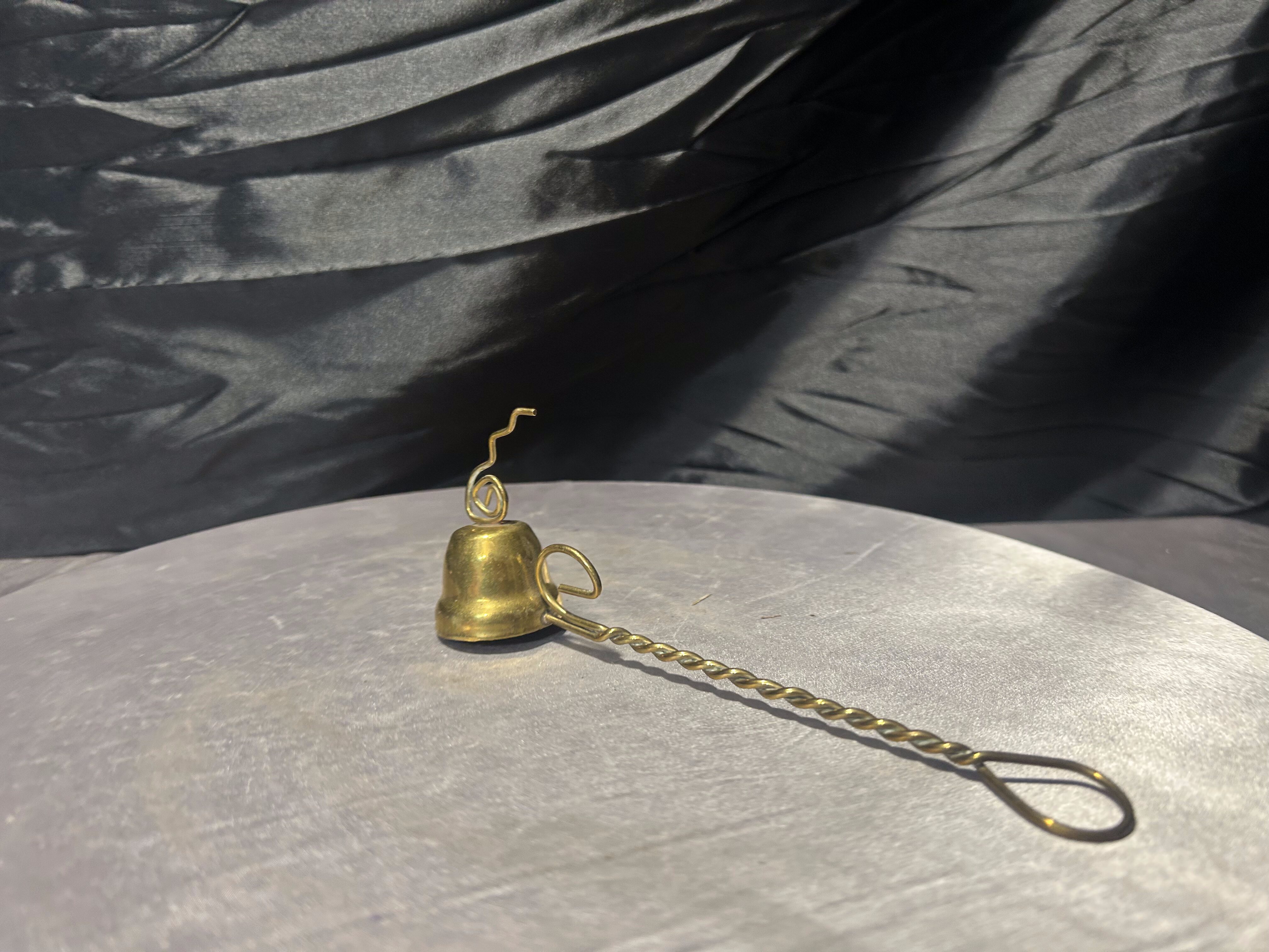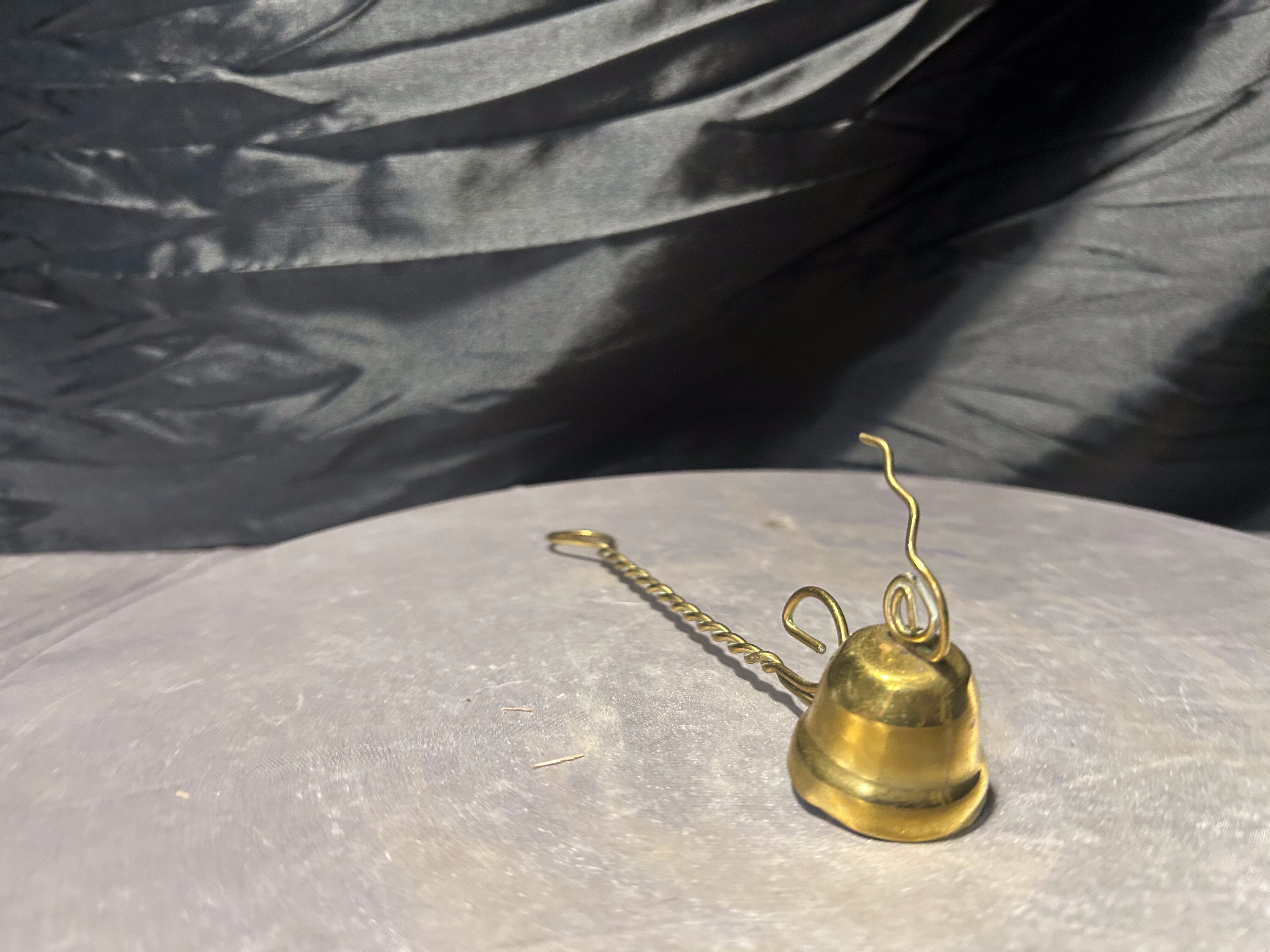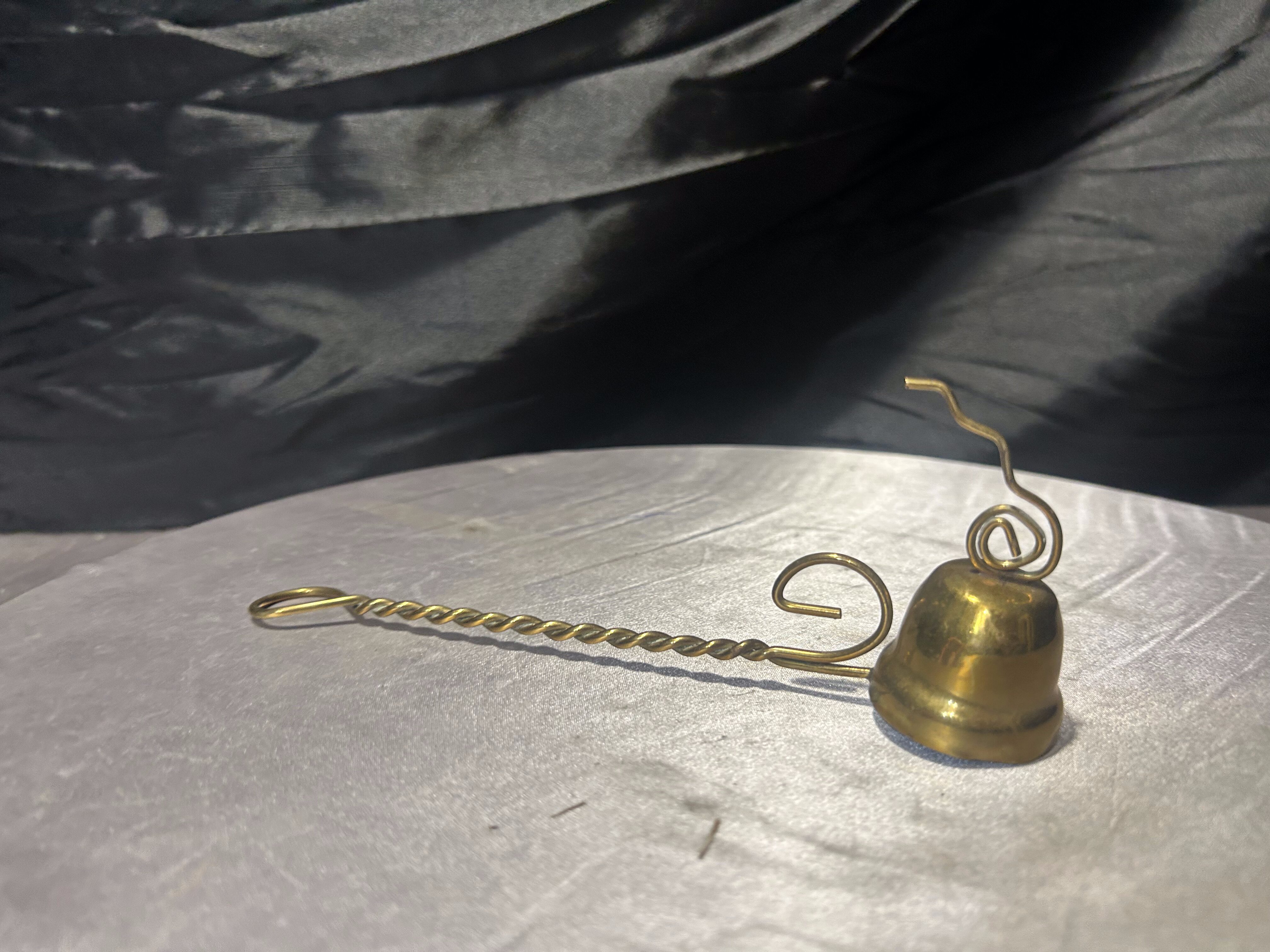 Klasyczny gasik do świec wykonany z mosiądzu, utrzymany w eleganckiej i dekoracyjnej formie. Narzędzie posiada charakterystyczny dzwonkowaty kaptur służący do bezpiecznego gaszenia płomienia oraz długi, skręcany uchwyt, który ułatwia wygodne użytkowanie.