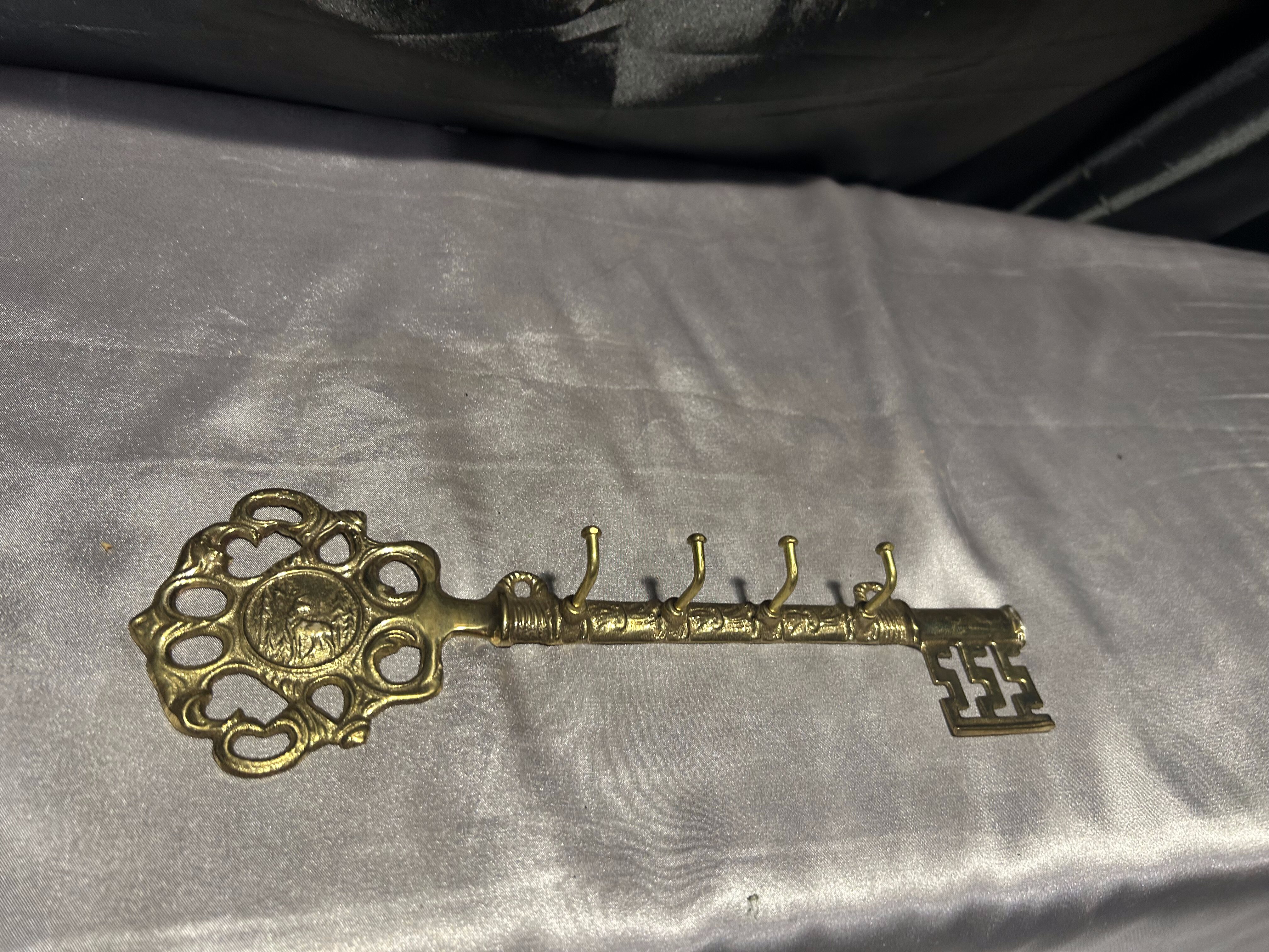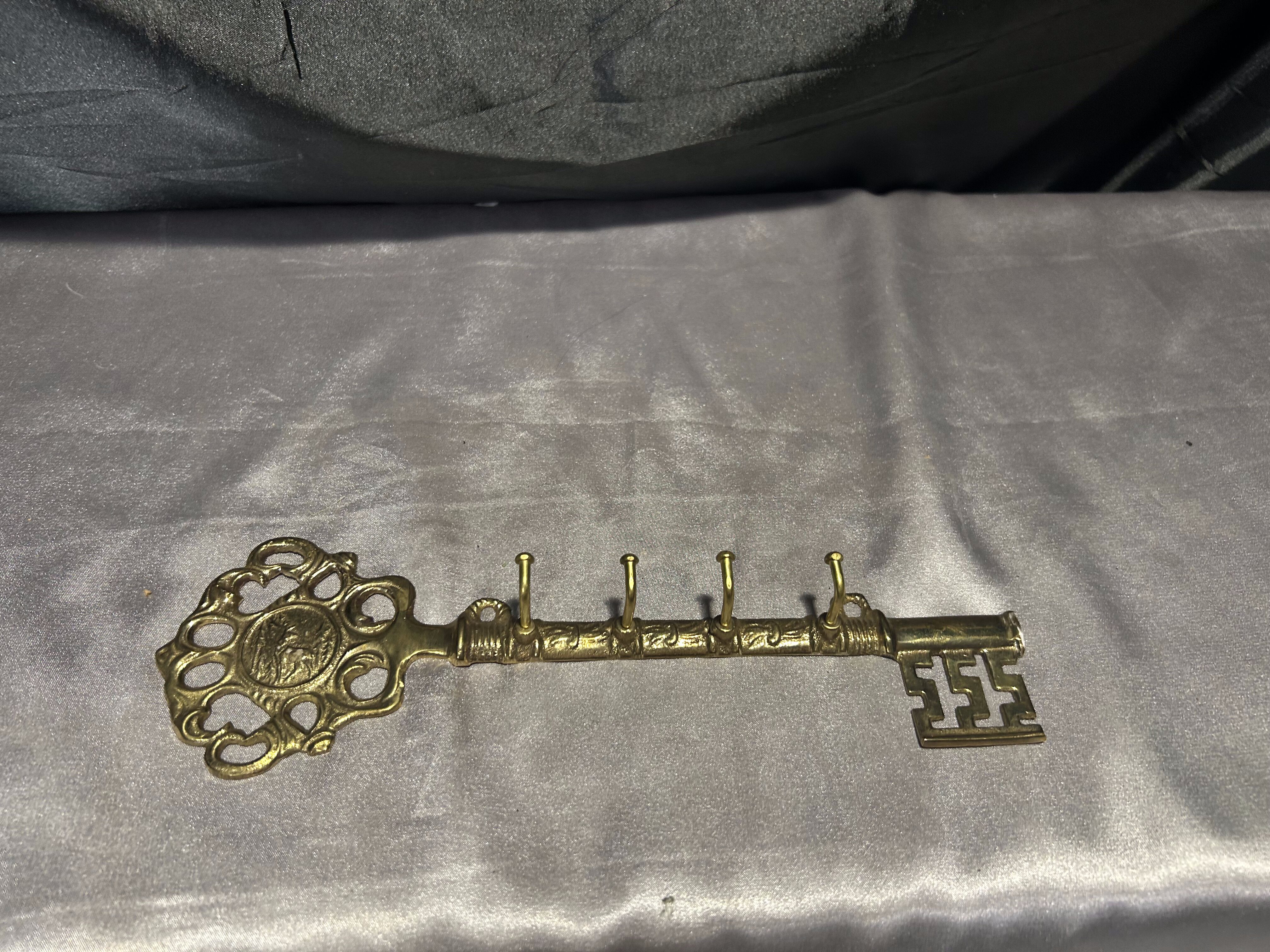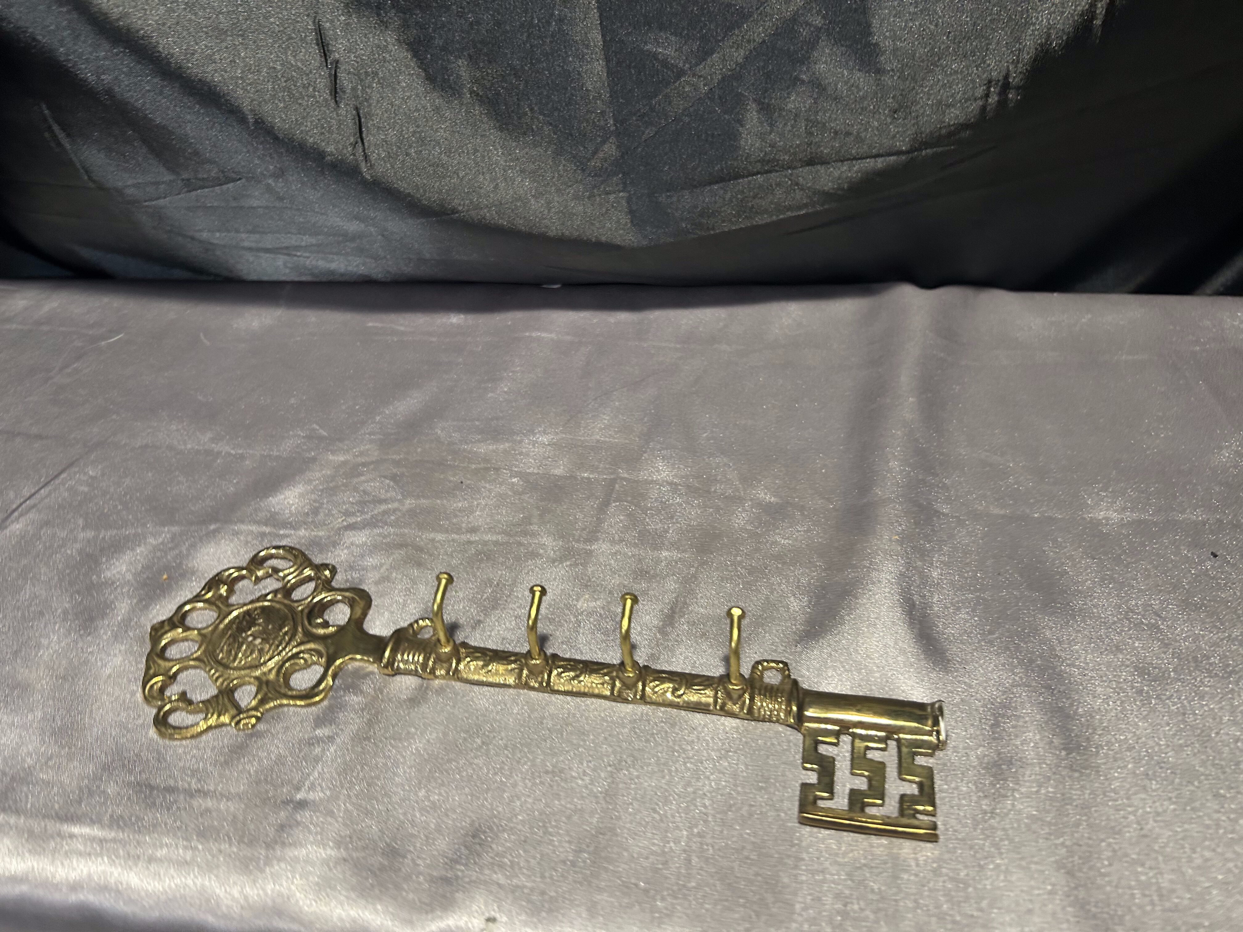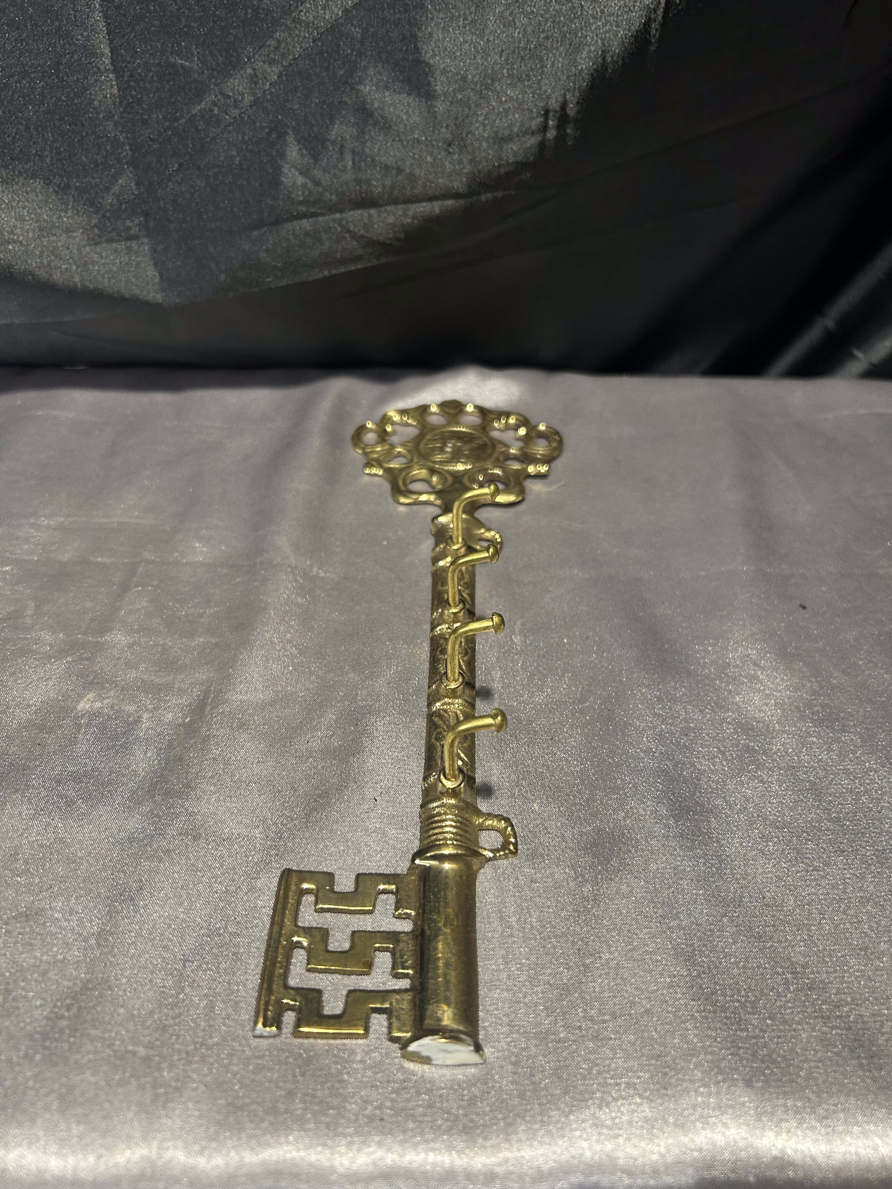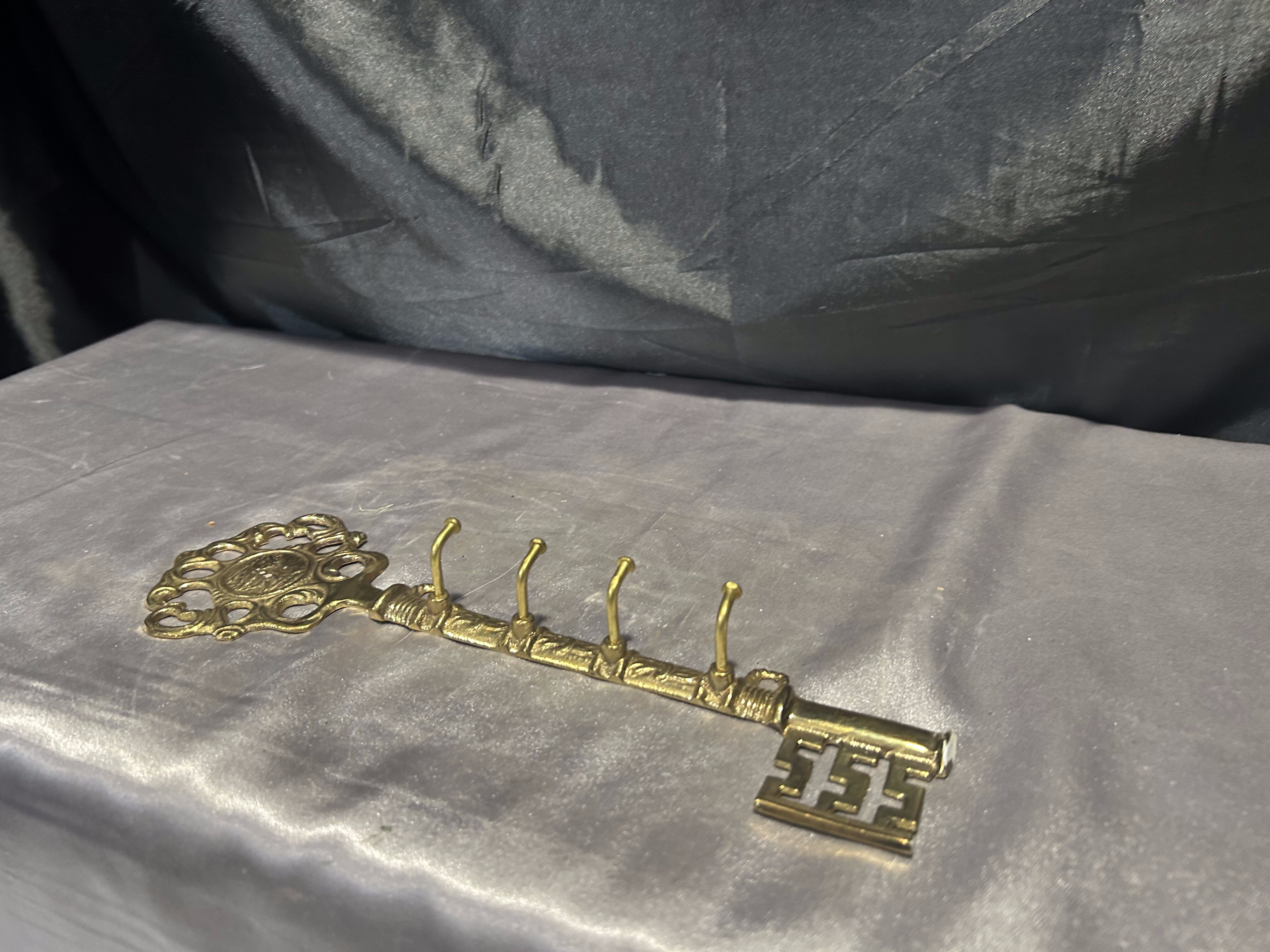 Przedstawiam piękny wieszak na klucze w formie dużego klucza, wykonany z mosiądzu.