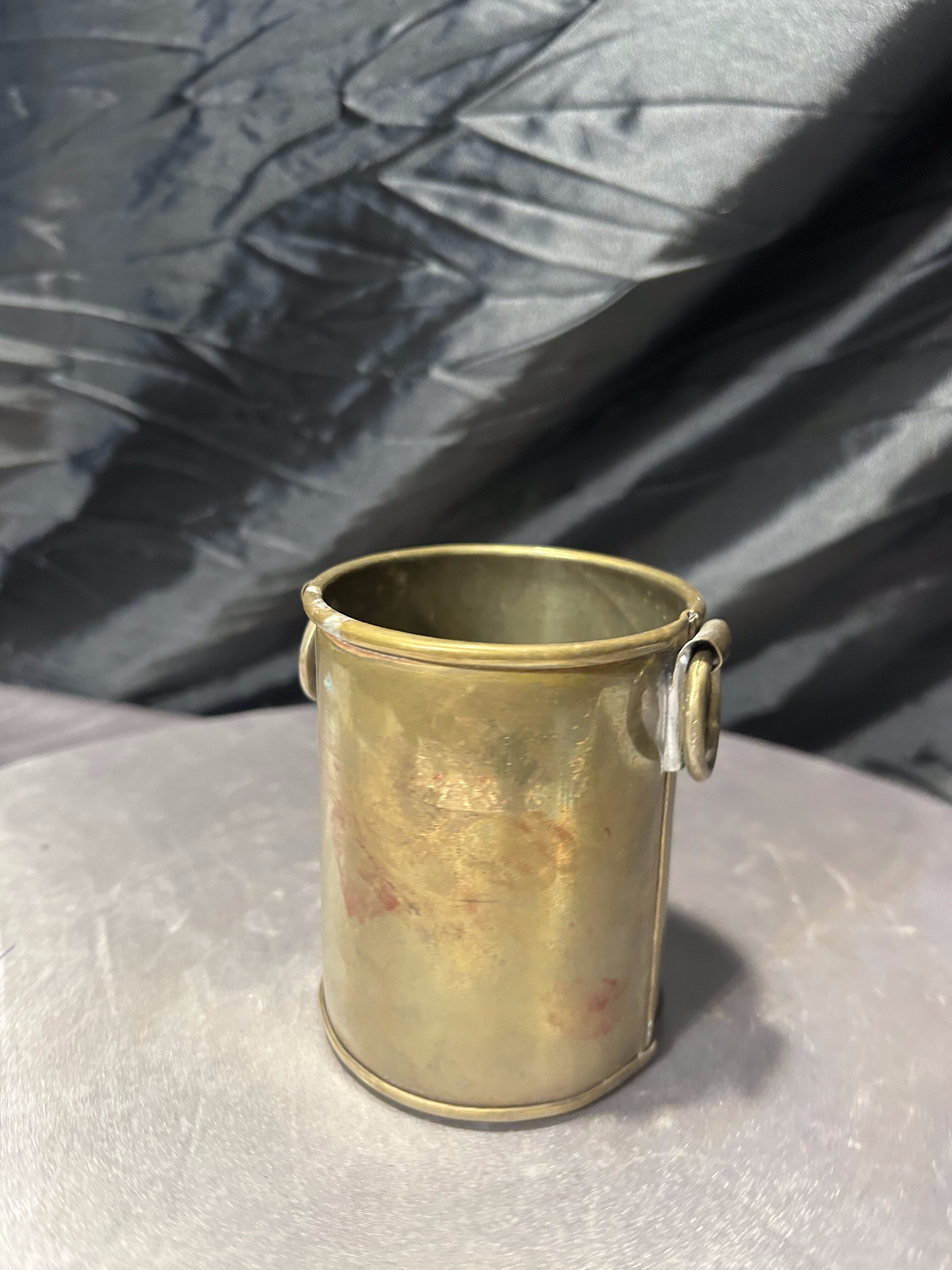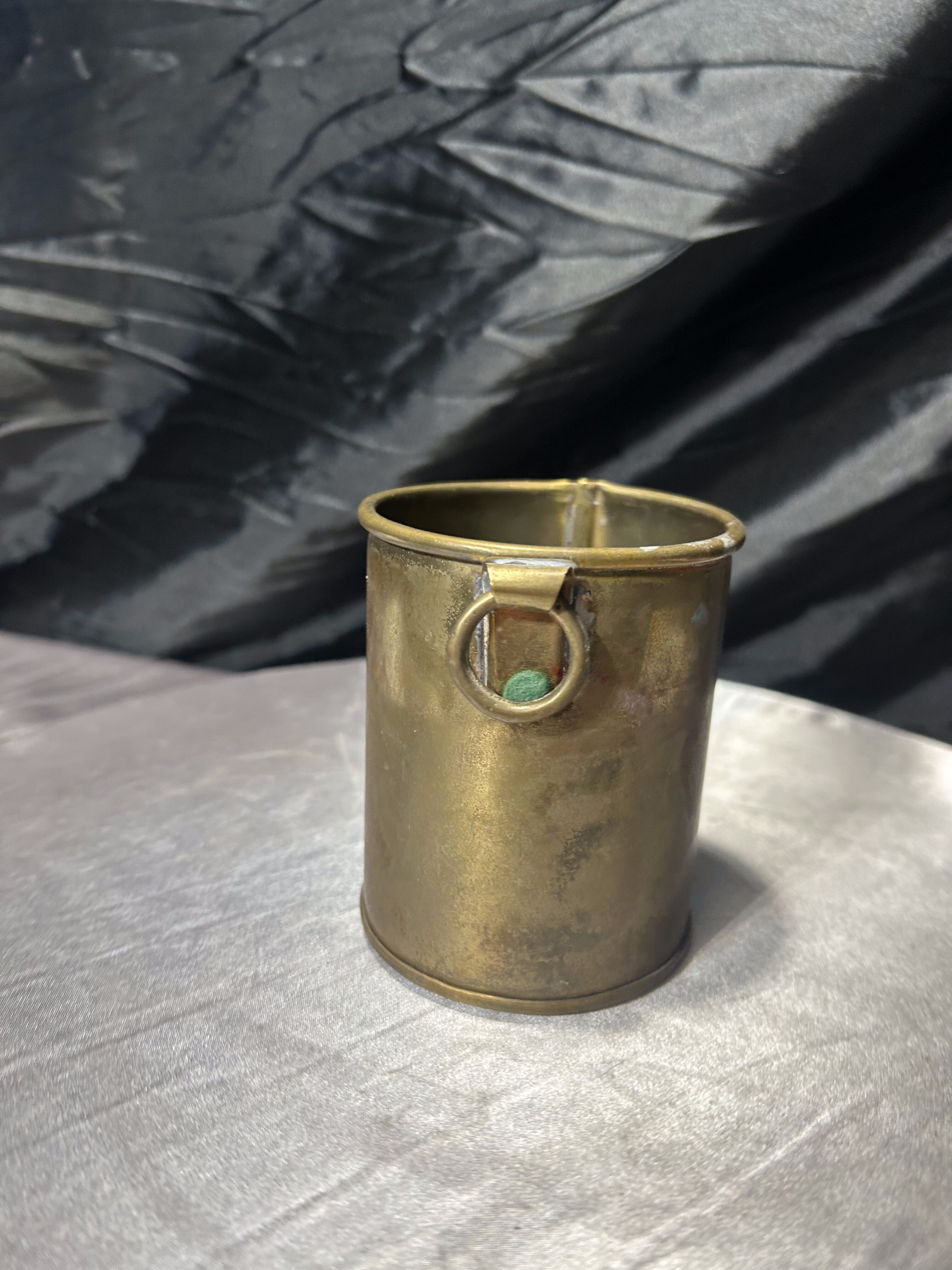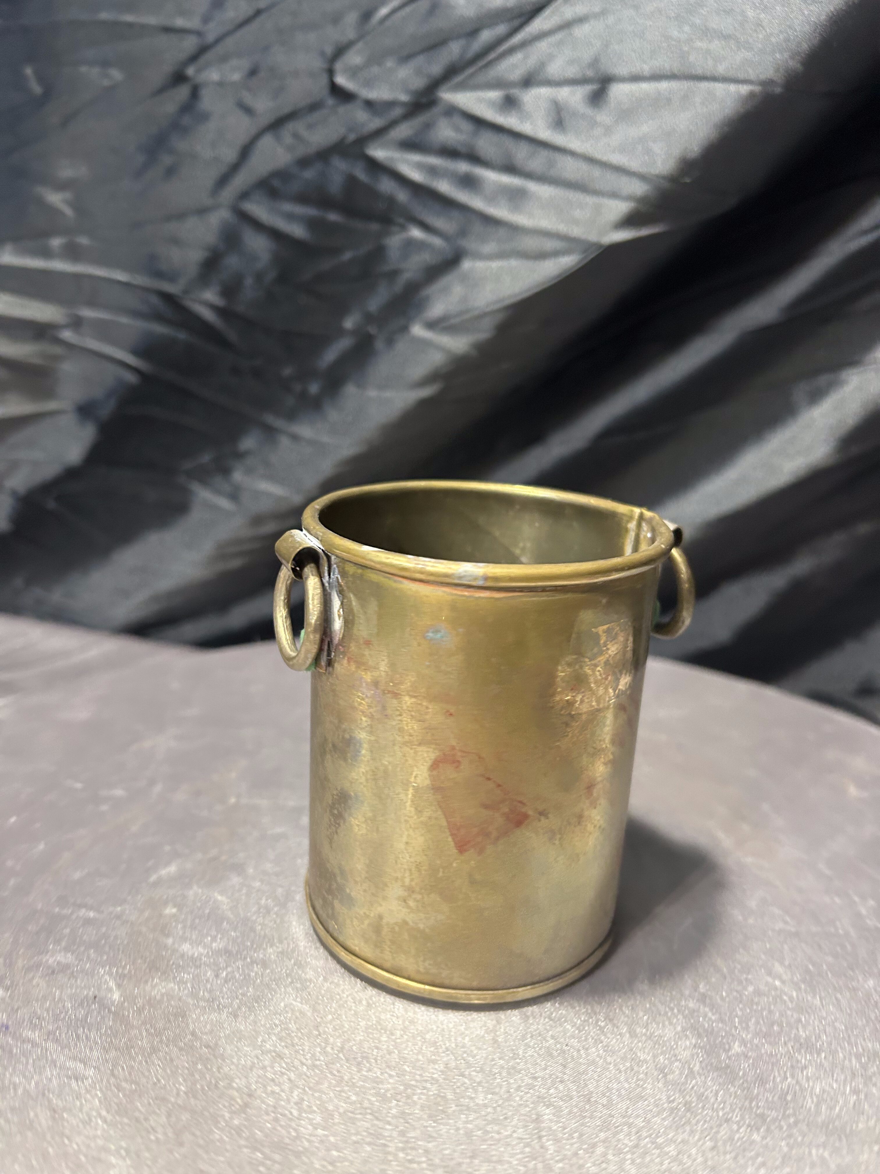 Niewielki, stylowy kwietnik wykonany z mosiądzu, ozdobiony dwoma okrągłymi uszkami po bokach. Jego prosta, cylindryczna forma oraz naturalna patyna nadają mu eleganckiego, klasycznego wyglądu, idealnego do wnętrz w stylu vintage, rustykalnym lub kolonialnym.