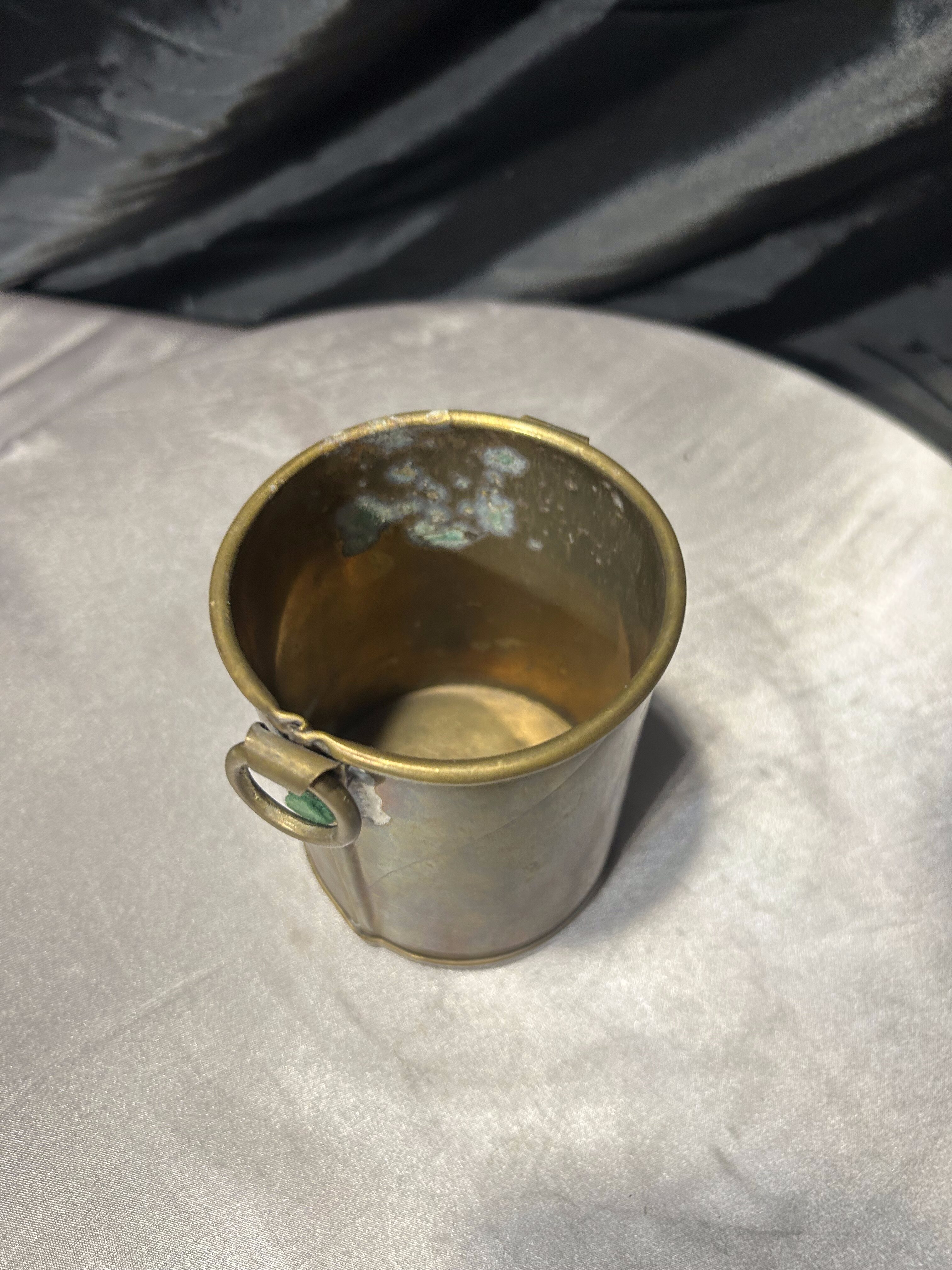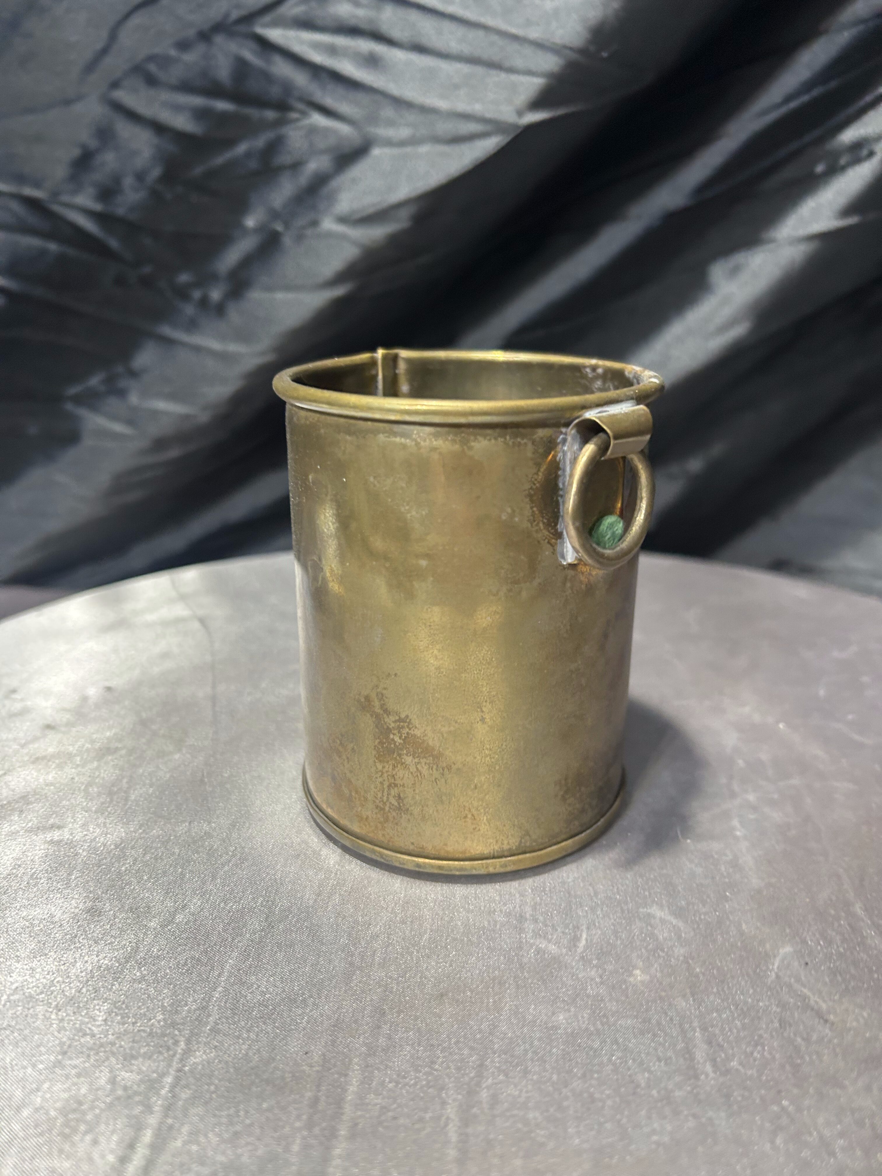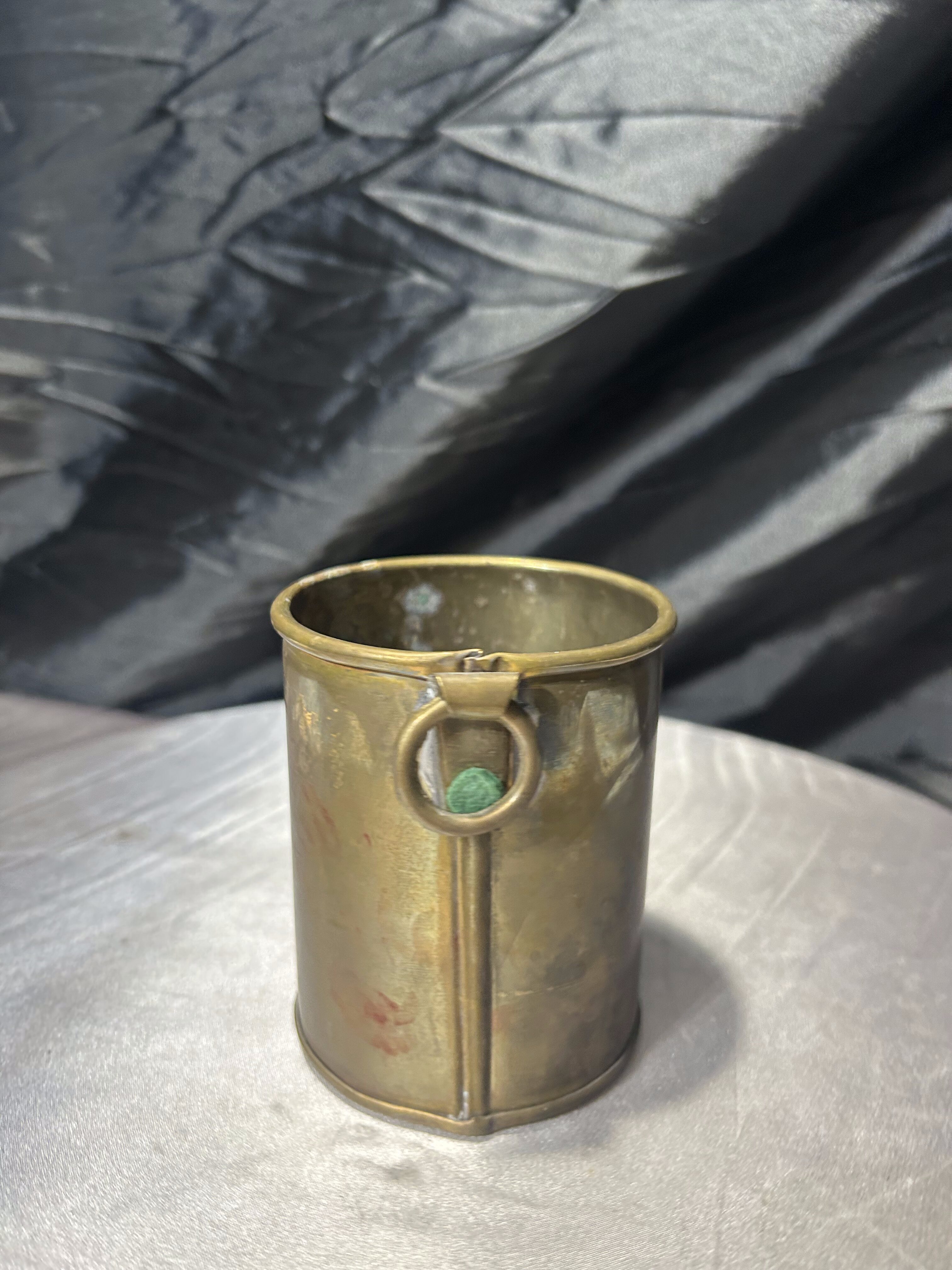 Niewielki, stylowy kwietnik wykonany z mosiądzu, ozdobiony dwoma okrągłymi uszkami po bokach. Jego prosta, cylindryczna forma oraz naturalna patyna nadają mu eleganckiego, klasycznego wyglądu, idealnego do wnętrz w stylu vintage, rustykalnym lub kolonialnym.