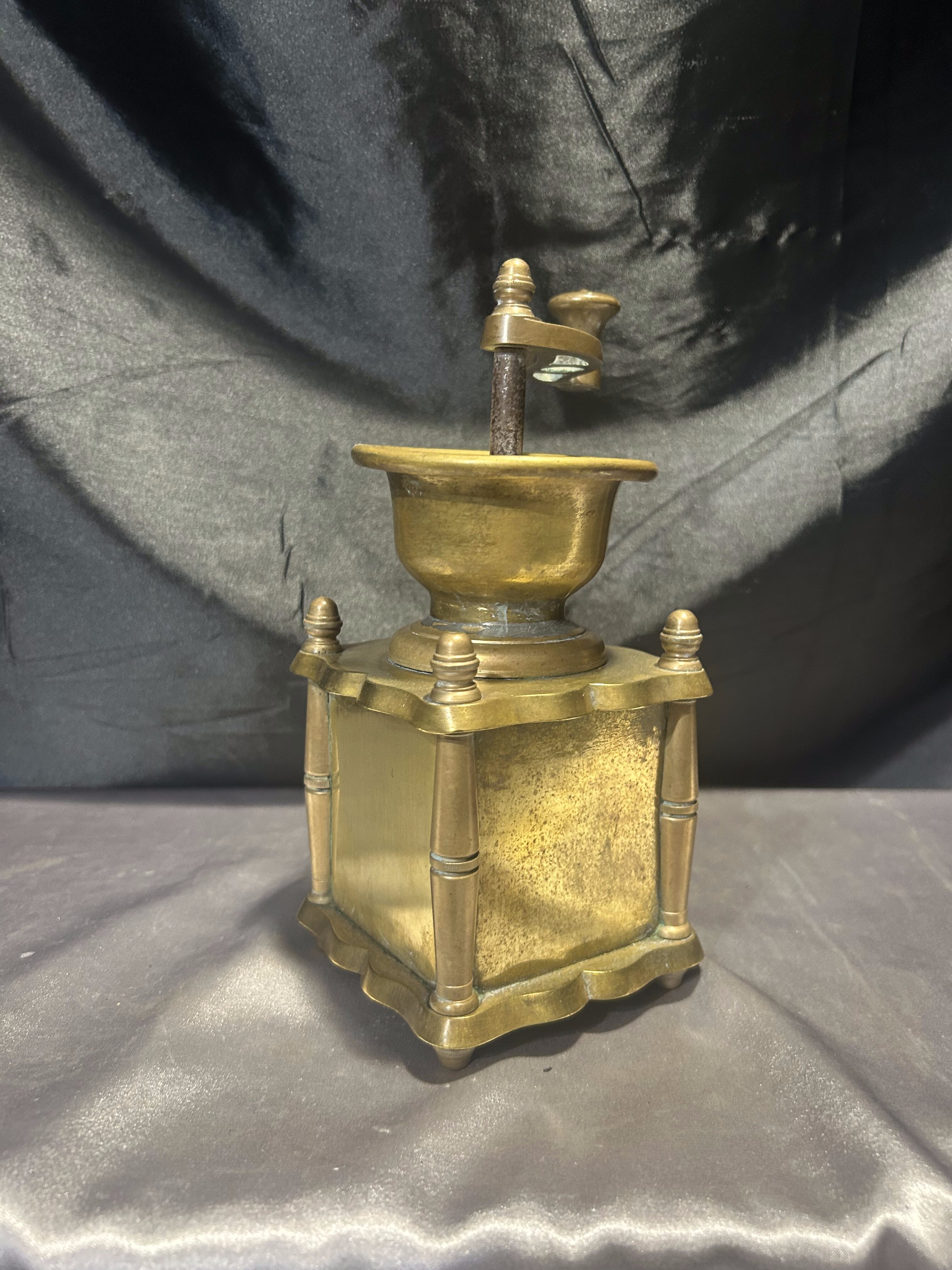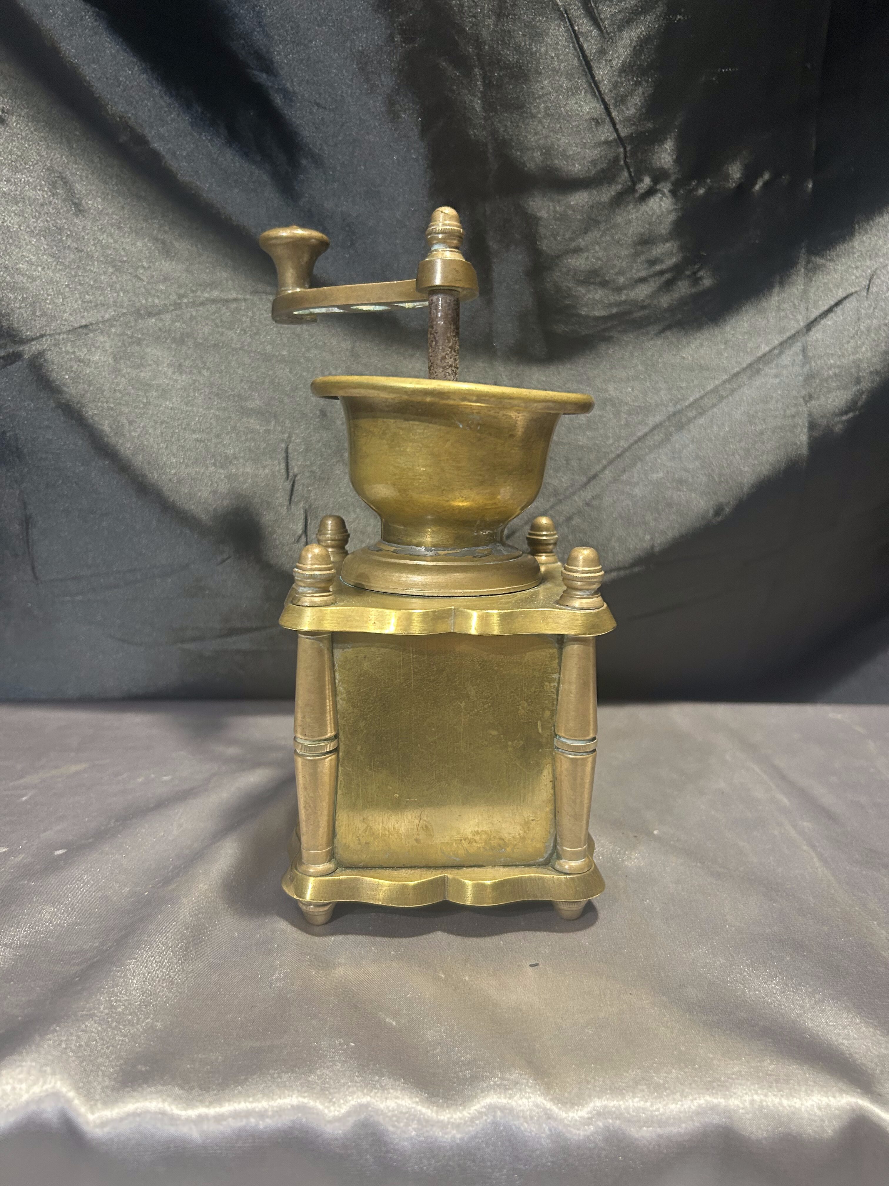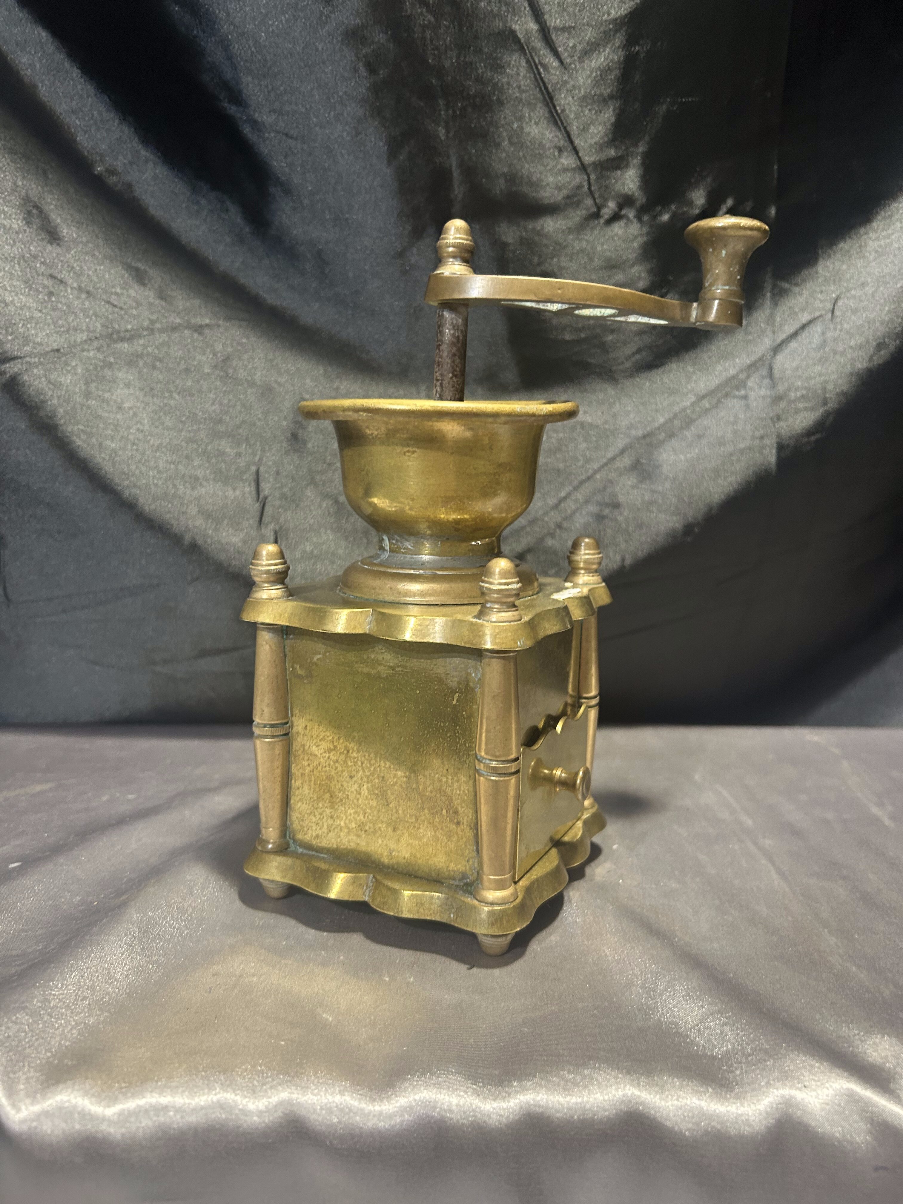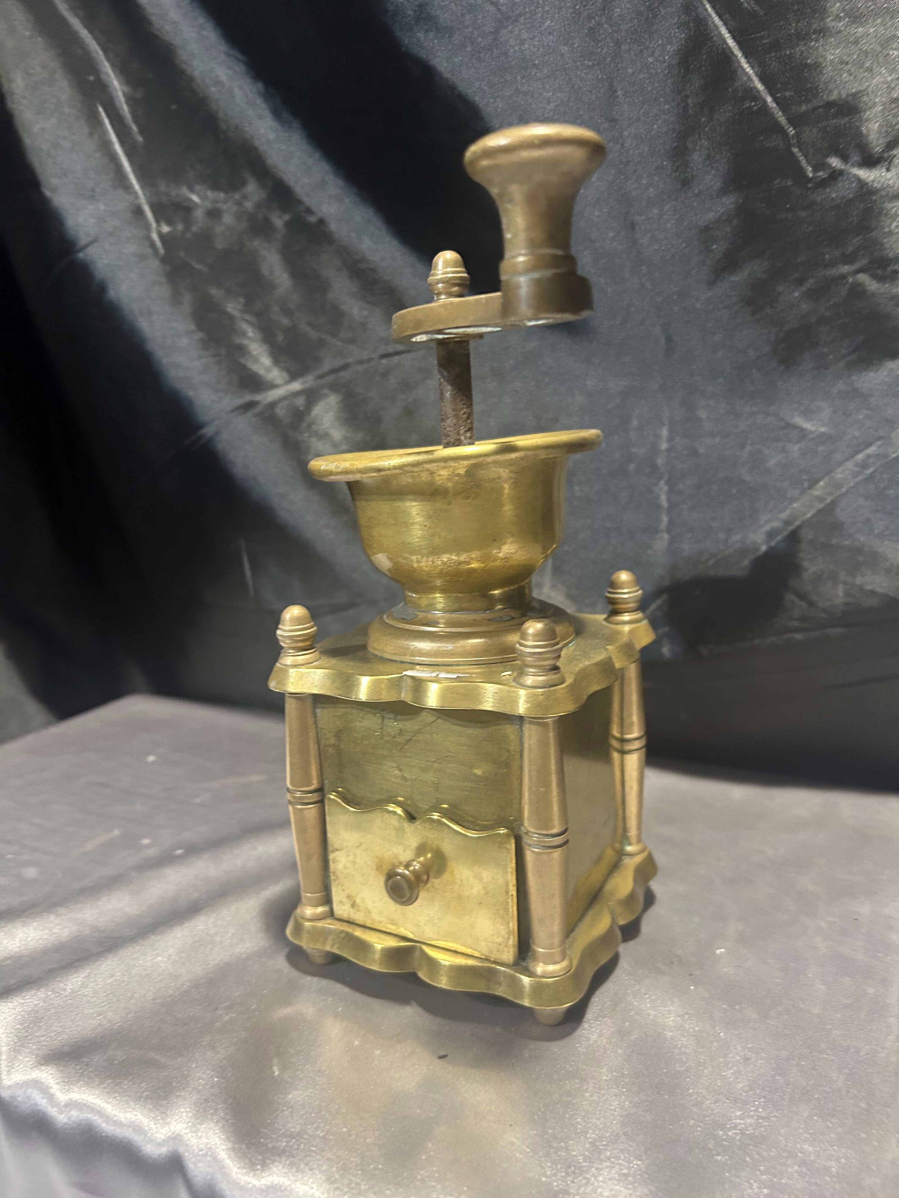 Na sprzedaż klasyczny młynek do kawy wykonany z mosiądzu, solidny i ciężki, o eleganckiej formie. Sygnowany, co potwierdza jego autentyczność i kolekcjonerską wartość. Młynek wyróżnia się precyzyjnym wykonaniem i ponadczasowym stylem – doskonały zarówno jako dekoracja, jak i dla pasjonatów starych przedmiotów użytkowych.