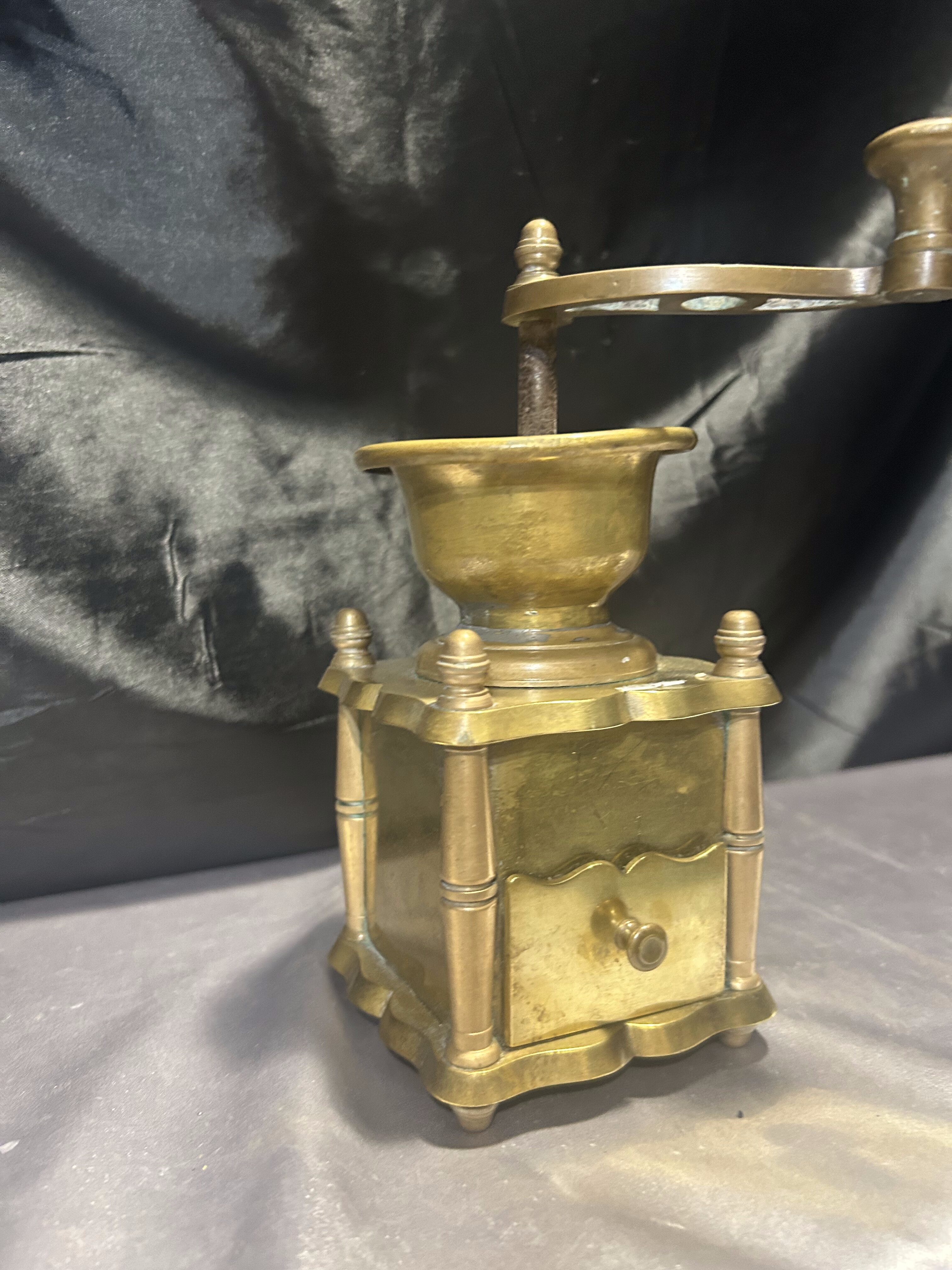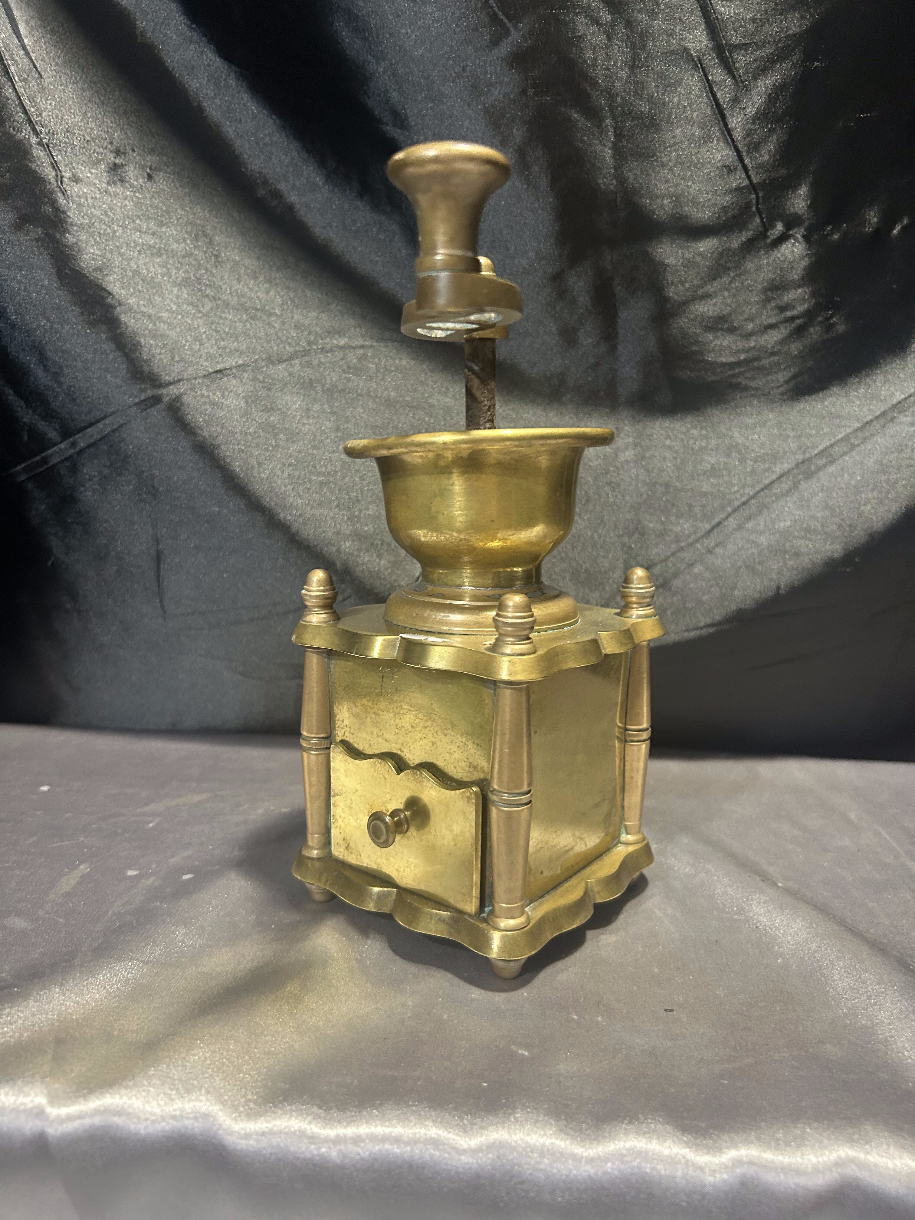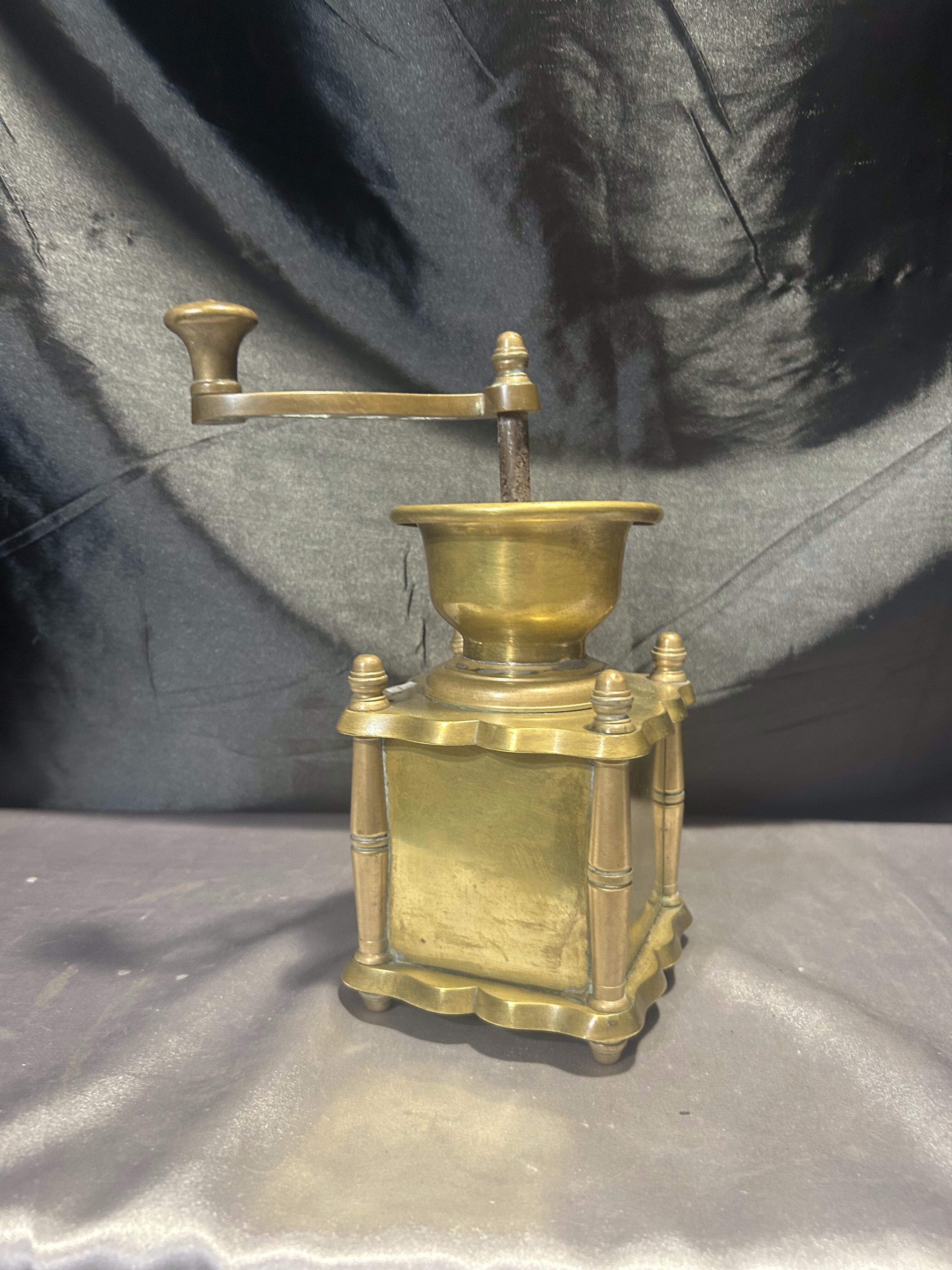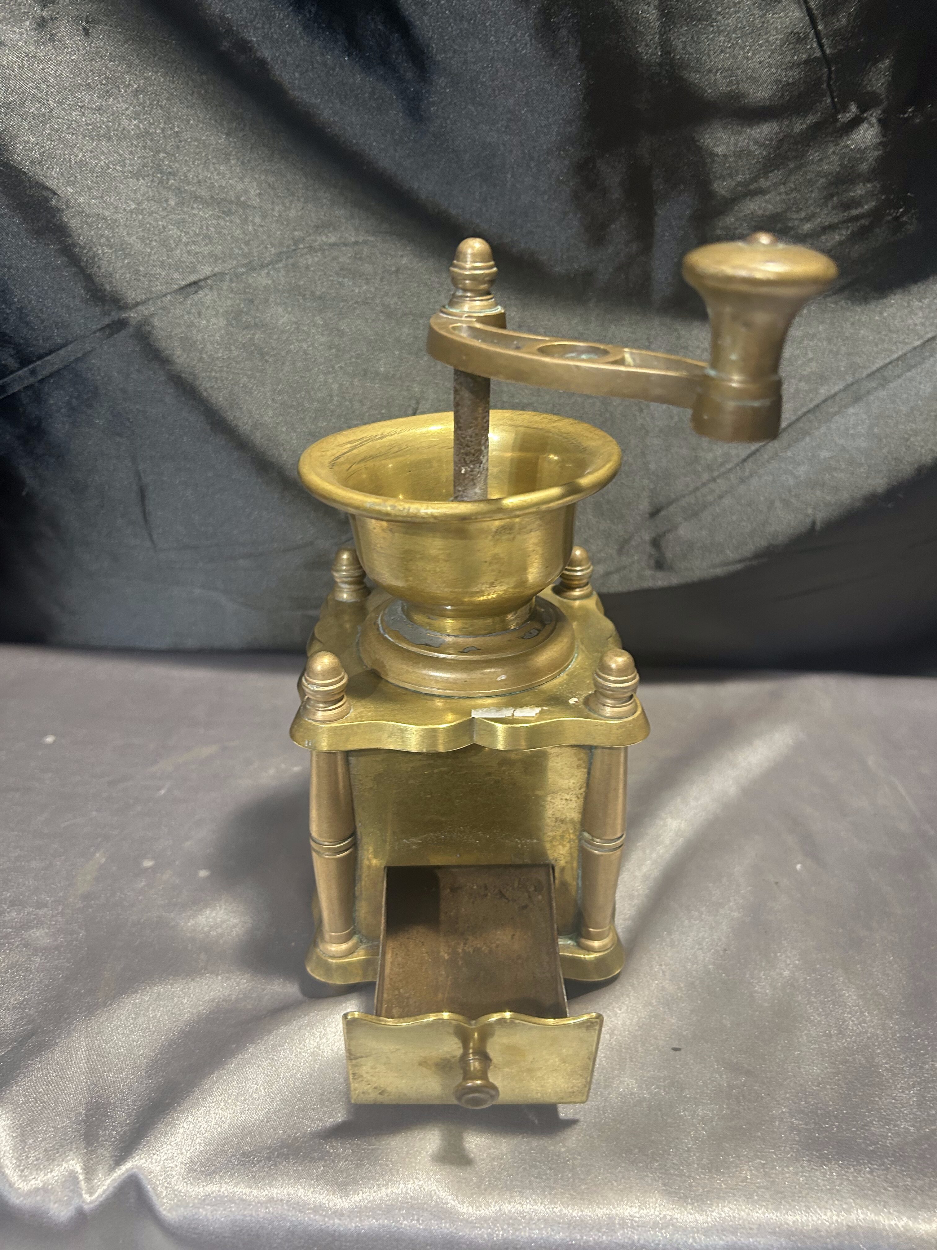 Na sprzedaż klasyczny młynek do kawy wykonany z mosiądzu, solidny i ciężki, o eleganckiej formie. Sygnowany, co potwierdza jego autentyczność i kolekcjonerską wartość. Młynek wyróżnia się precyzyjnym wykonaniem i ponadczasowym stylem – doskonały zarówno jako dekoracja, jak i dla pasjonatów starych przedmiotów użytkowych.