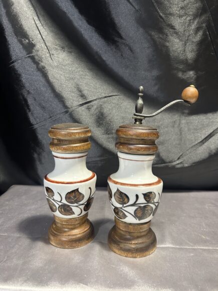 Solniczka i pieprzniczka – Drewniano-ceramiczny zestaw z młynkiem – Ręcznie malowany