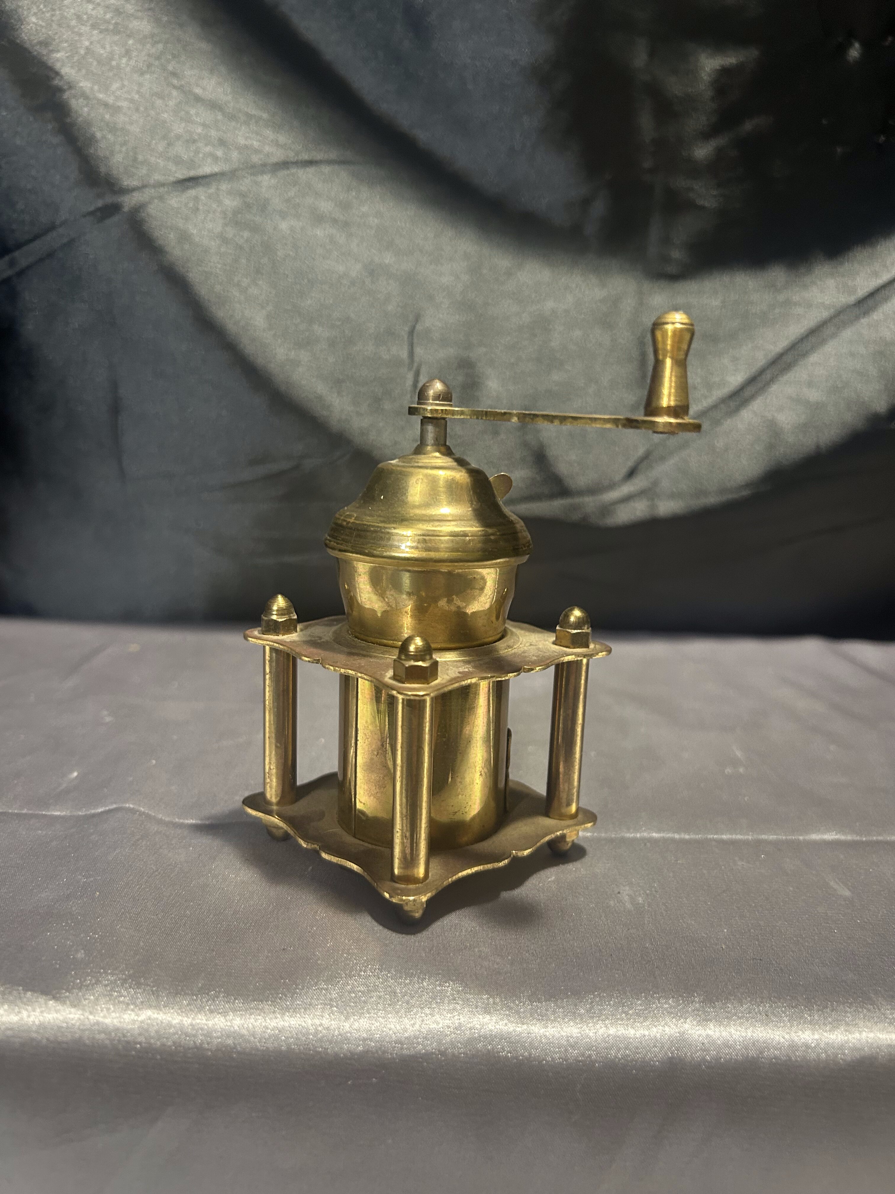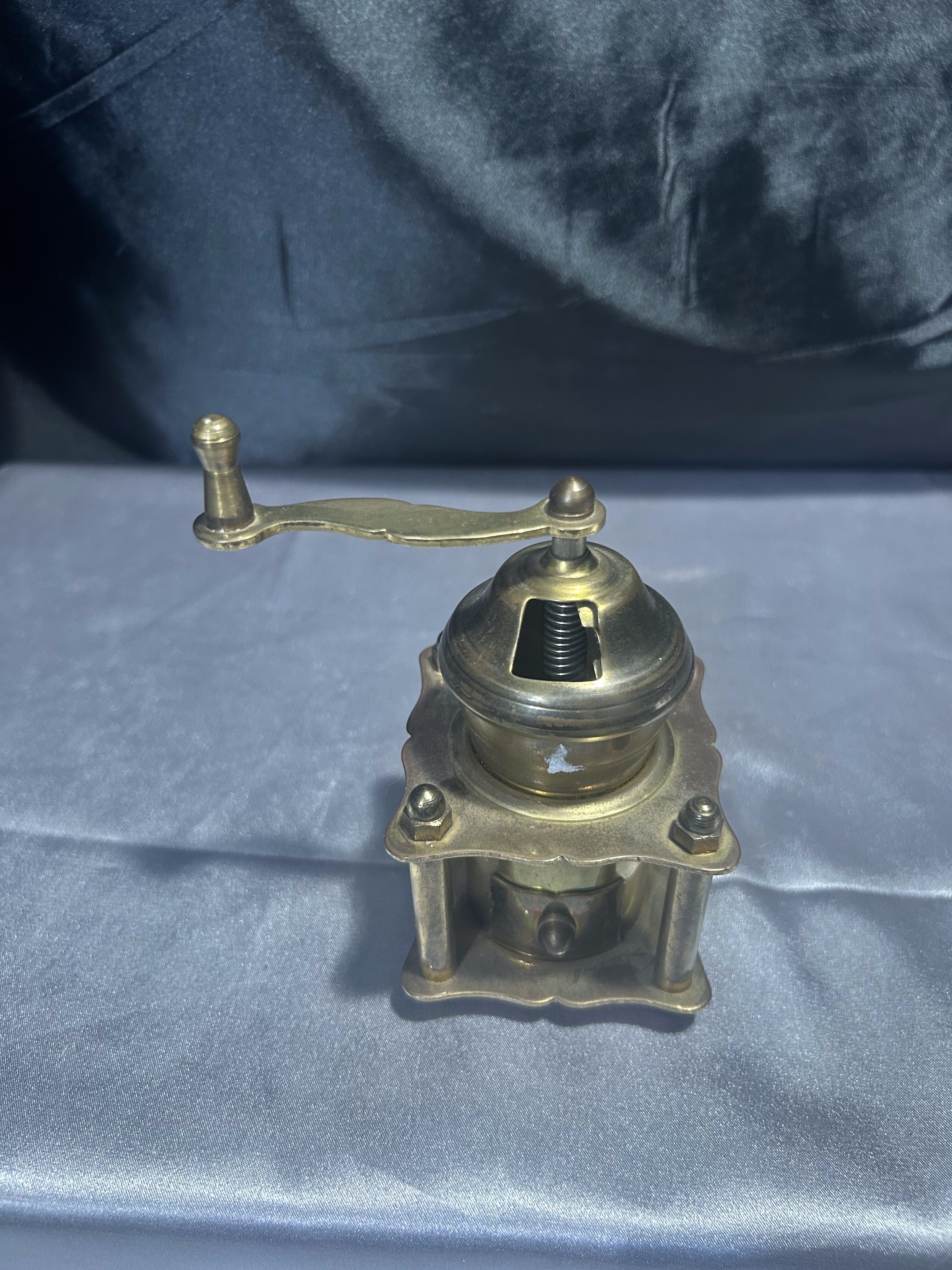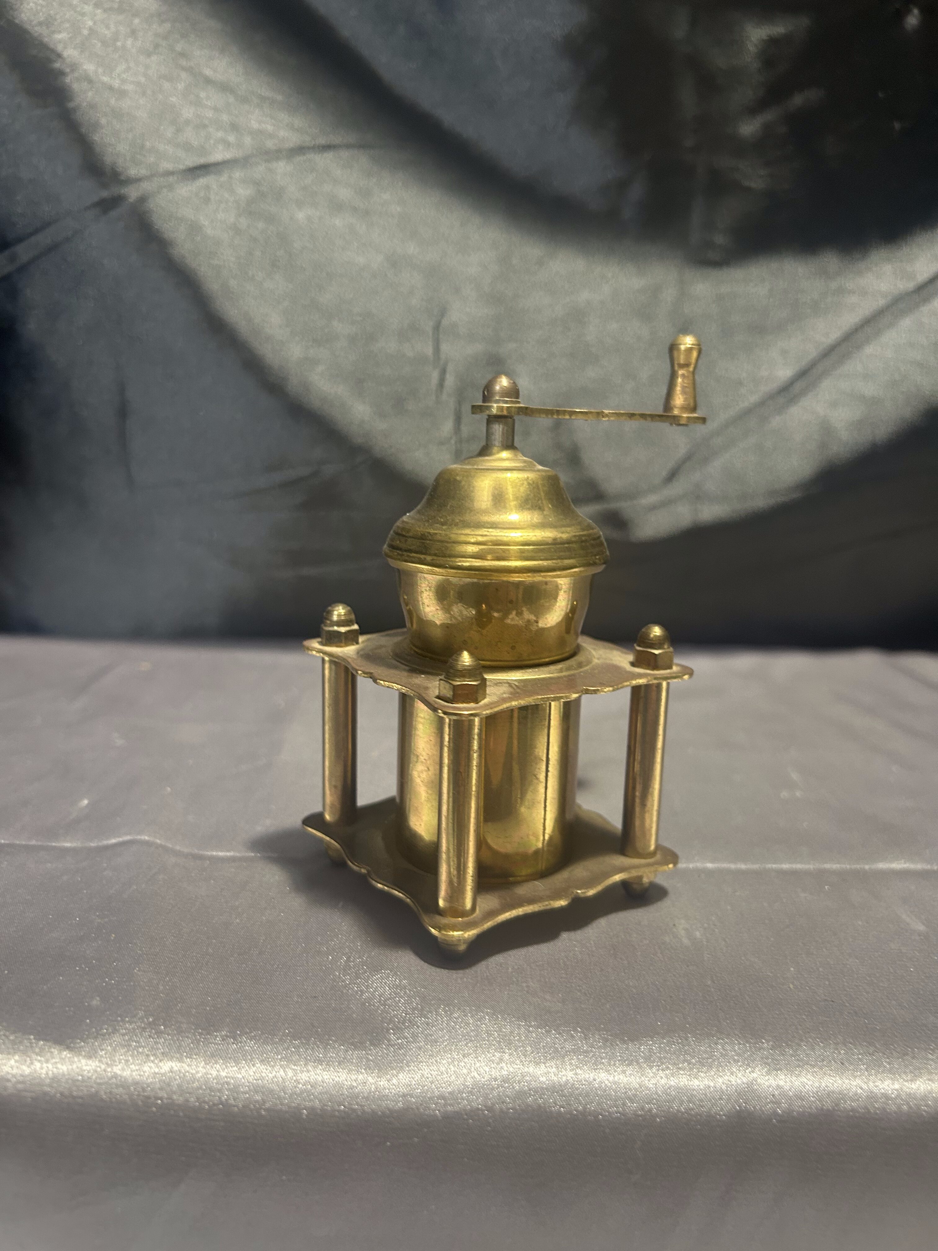 Na sprzedaż elegancki młynek do pieprzu wykonany z mosiądzu, ozdobiony dekoracyjnymi tłoczeniami. Solidna, kwadratowa podstawa i klasyczna konstrukcja nadają mu wyjątkowego charakteru. Idealny do codziennego użytku lub jako stylowy element kuchennej kolekcji w stylu vintage.