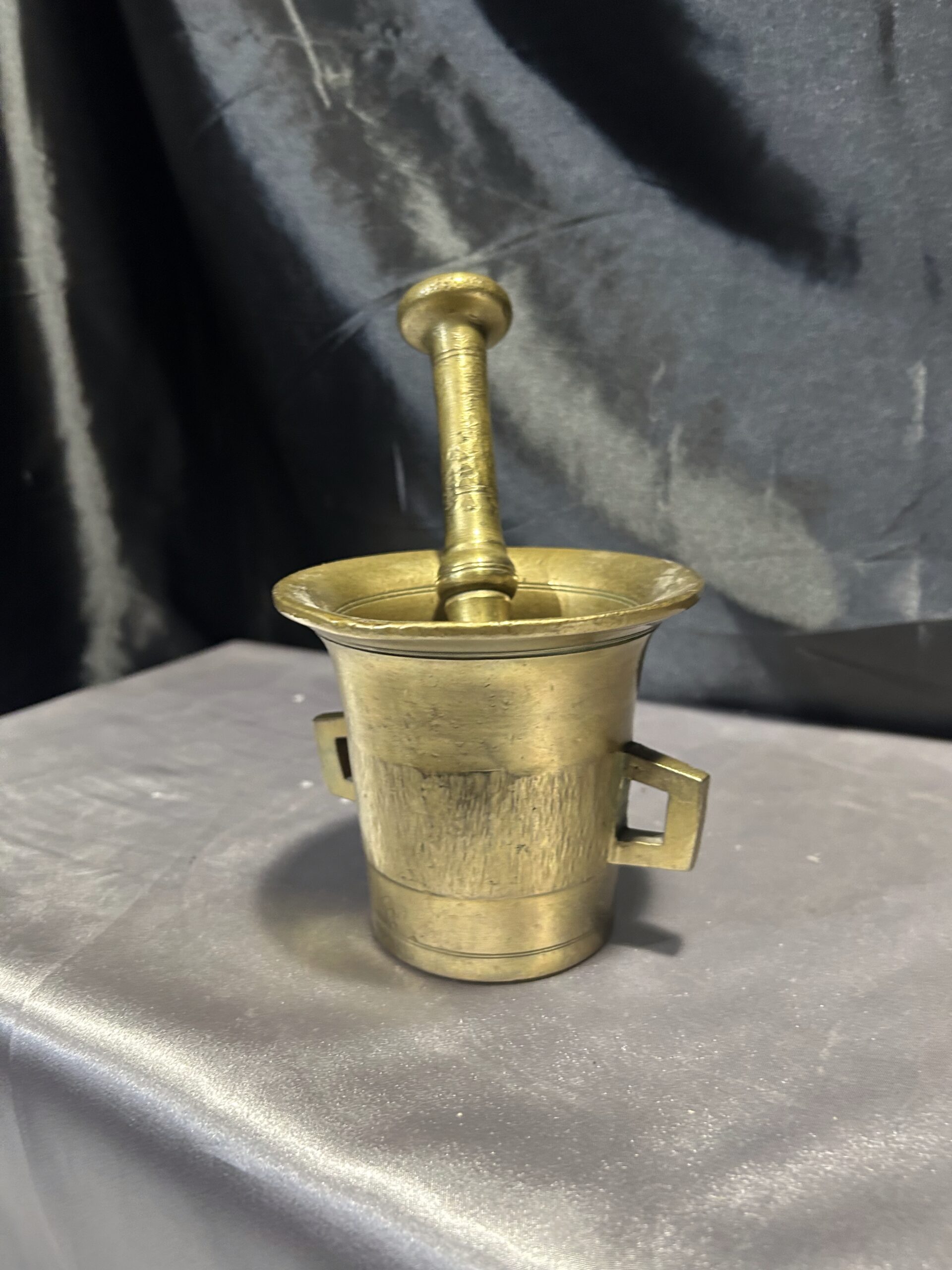 Kompaktowy, solidny moździerz wykonany z mosiądzu, wyposażony w dwa ozdobne uszy po bokach oraz tłuczek (pistel). Dzięki swojej masywnej konstrukcji doskonale sprawdzi się do ręcznego ucierania przypraw, ziół i innych składników, a jego elegancki wygląd nawiązuje do tradycyjnych akcesoriów kuchennych i aptekarskich.