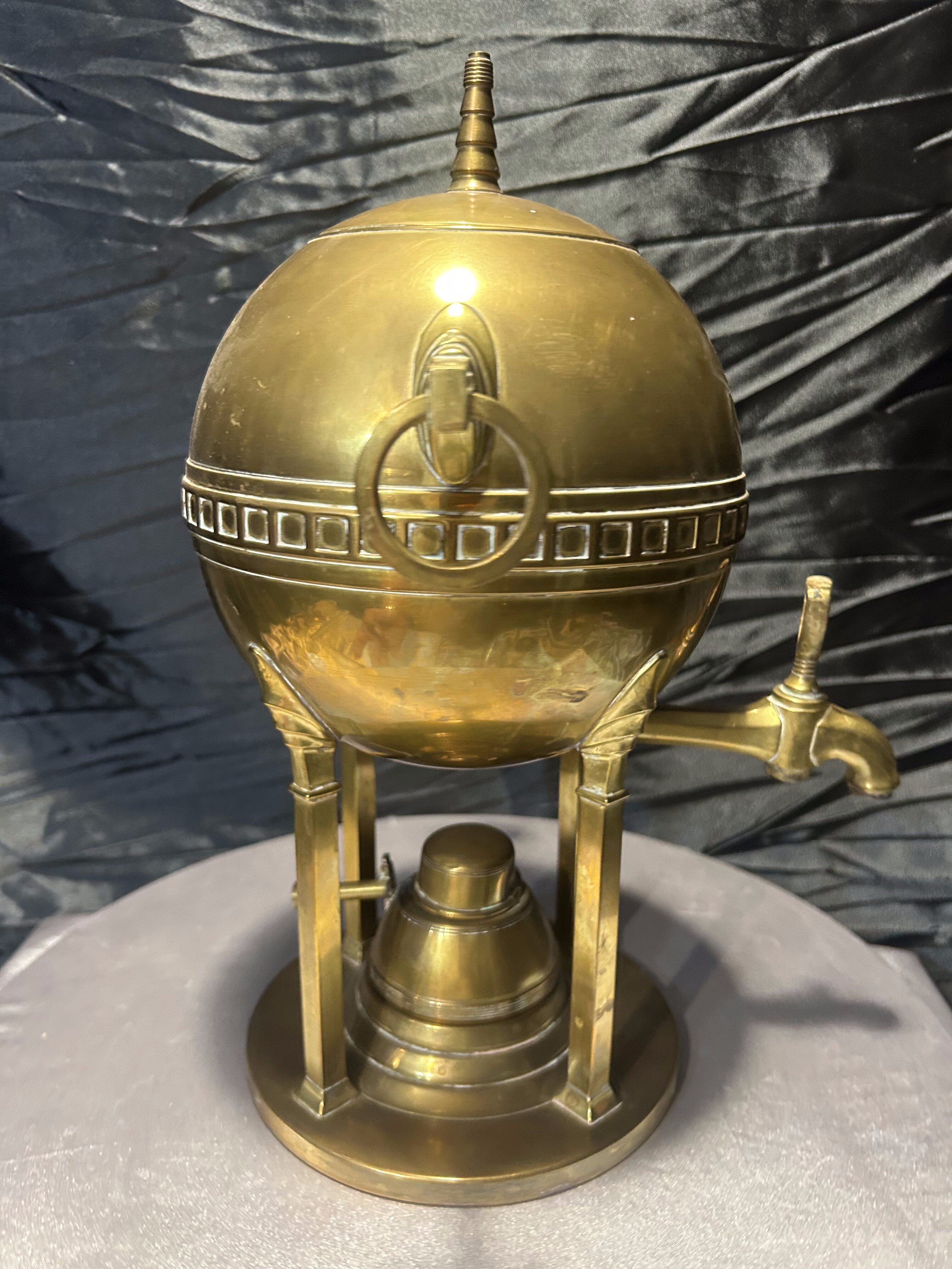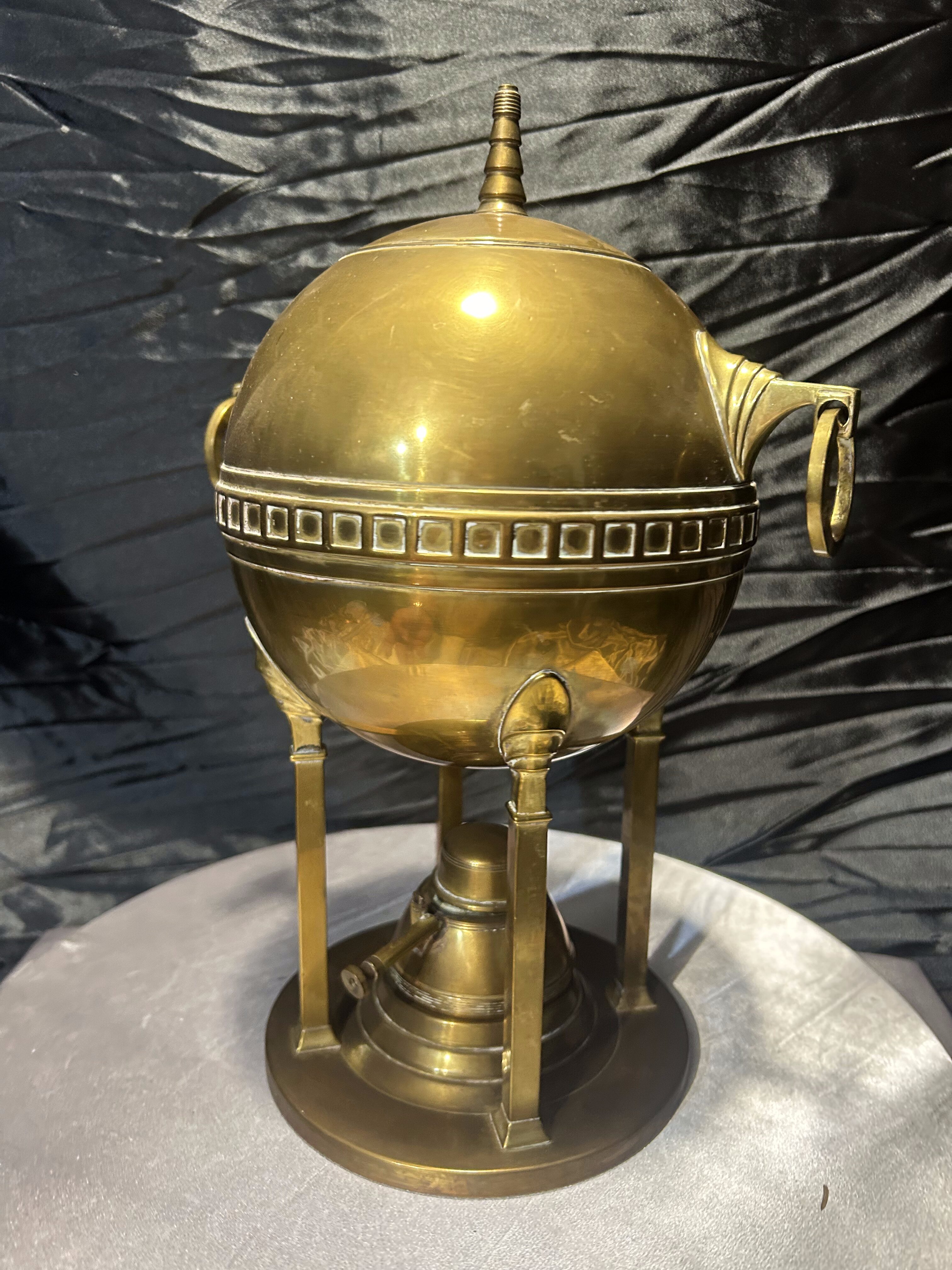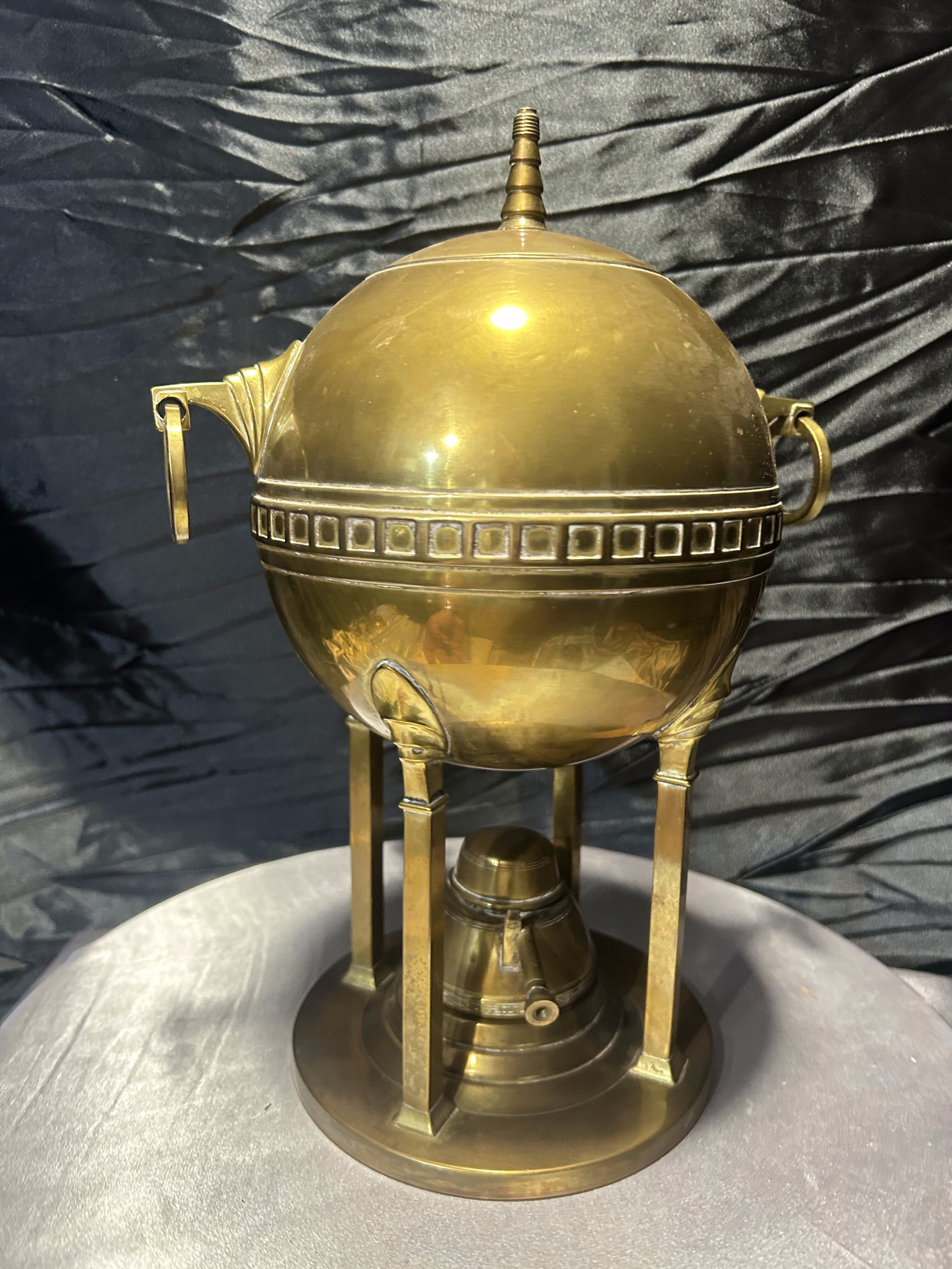 Oryginalny mosiężny podgrzewacz stołowy w formie dekoracyjnej, nawiązującej do kształtu samowaru. Korpus w kształcie kuli, osadzony na trzech nogach, zdobiony geometrycznym fryzem i zakończony smukłym uchwytem w pokrywie. Po bokach znajdują się ozdobne uchwyty pierścieniowe, a całość spoczywa na stabilnej, okrągłej podstawie.