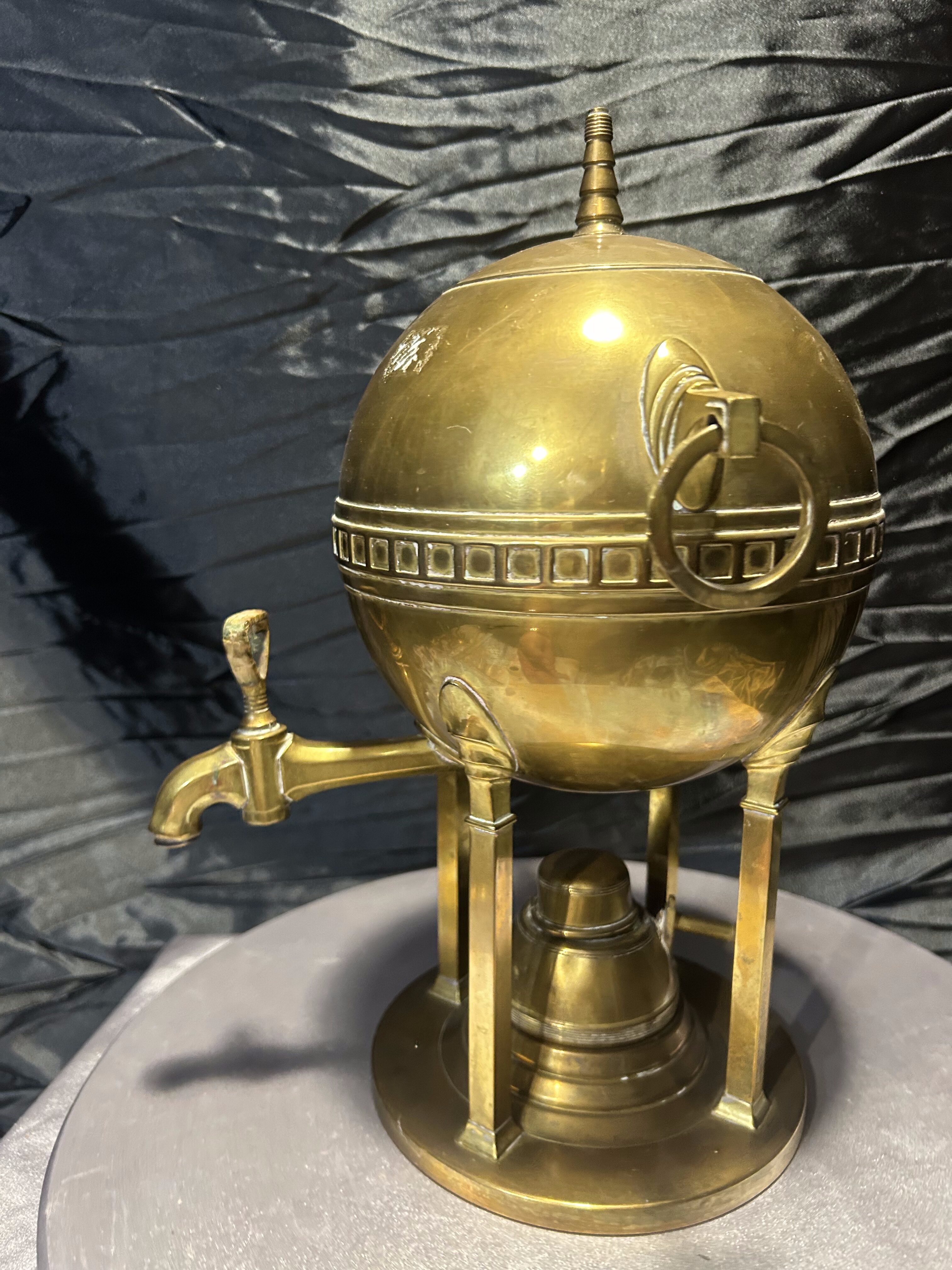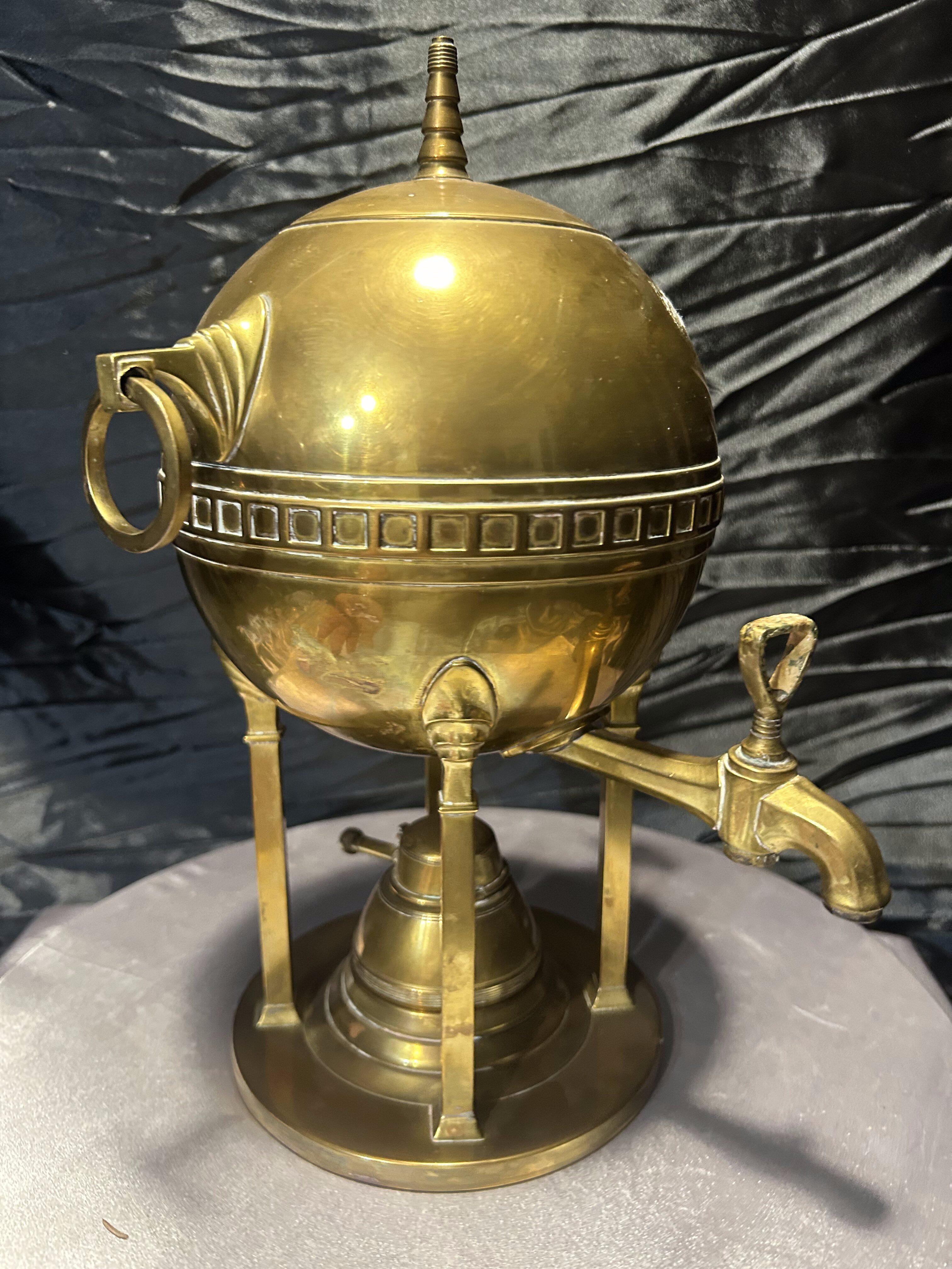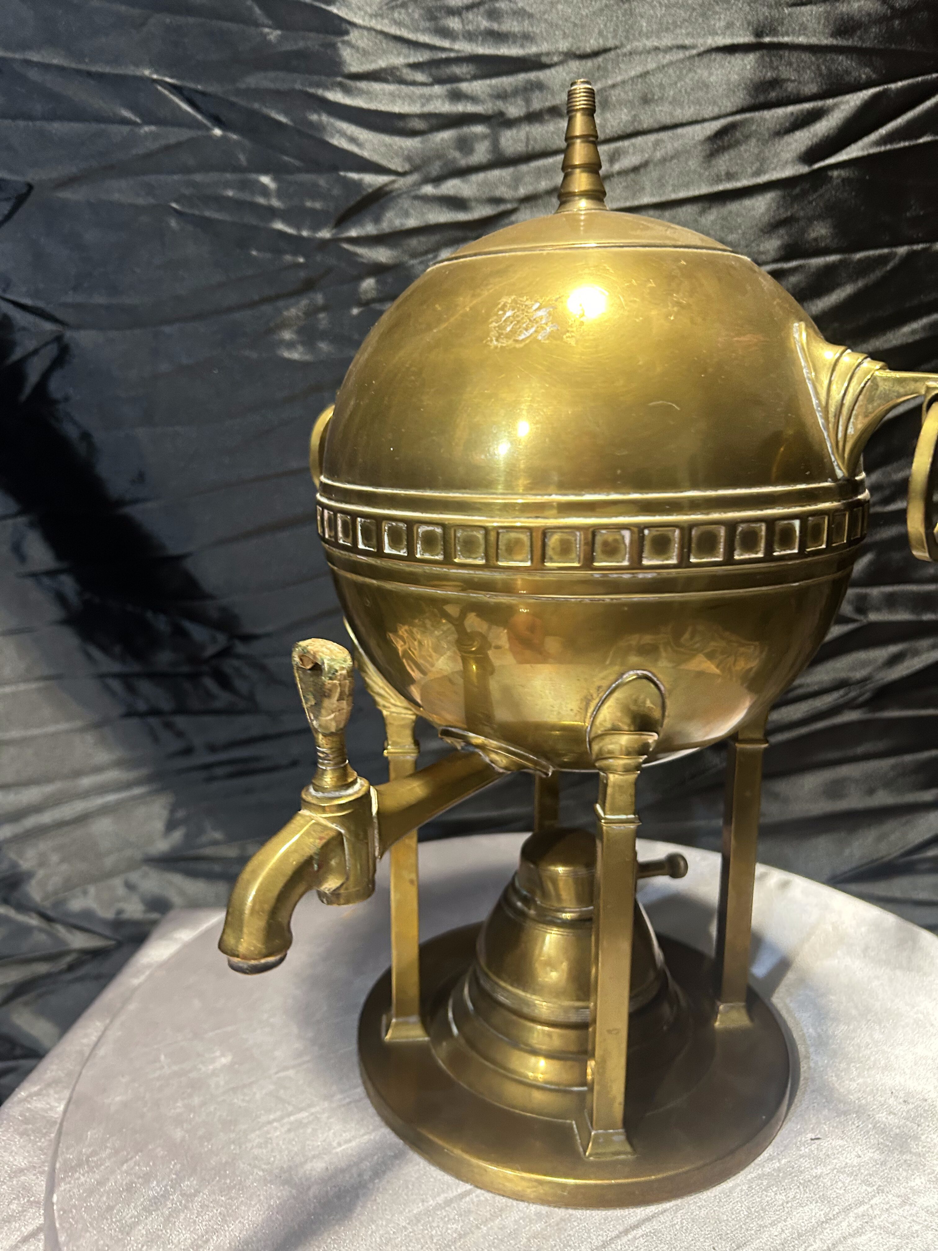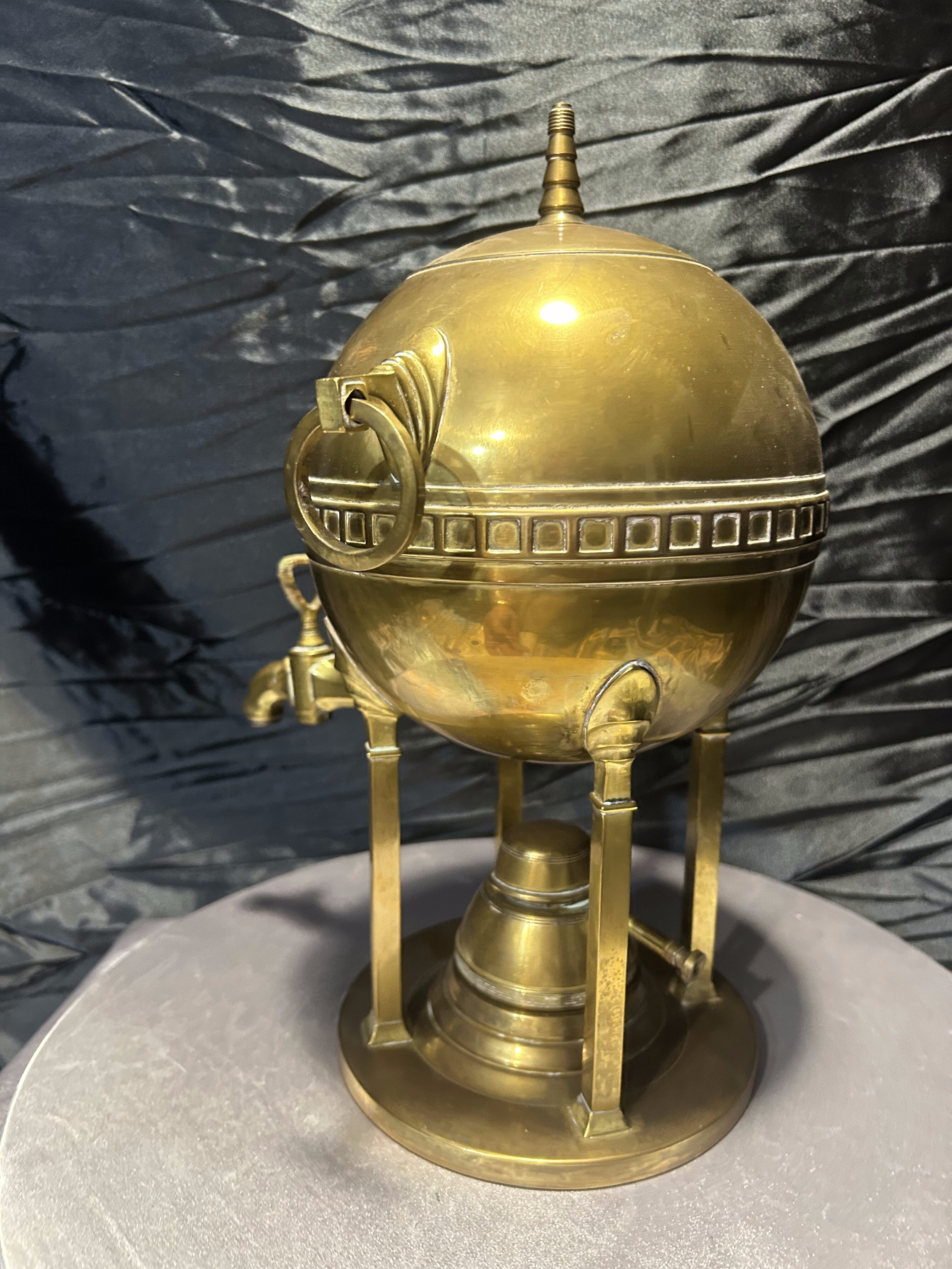 Oryginalny mosiężny podgrzewacz stołowy w formie dekoracyjnej, nawiązującej do kształtu samowaru. Korpus w kształcie kuli, osadzony na trzech nogach, zdobiony geometrycznym fryzem i zakończony smukłym uchwytem w pokrywie. Po bokach znajdują się ozdobne uchwyty pierścieniowe, a całość spoczywa na stabilnej, okrągłej podstawie.