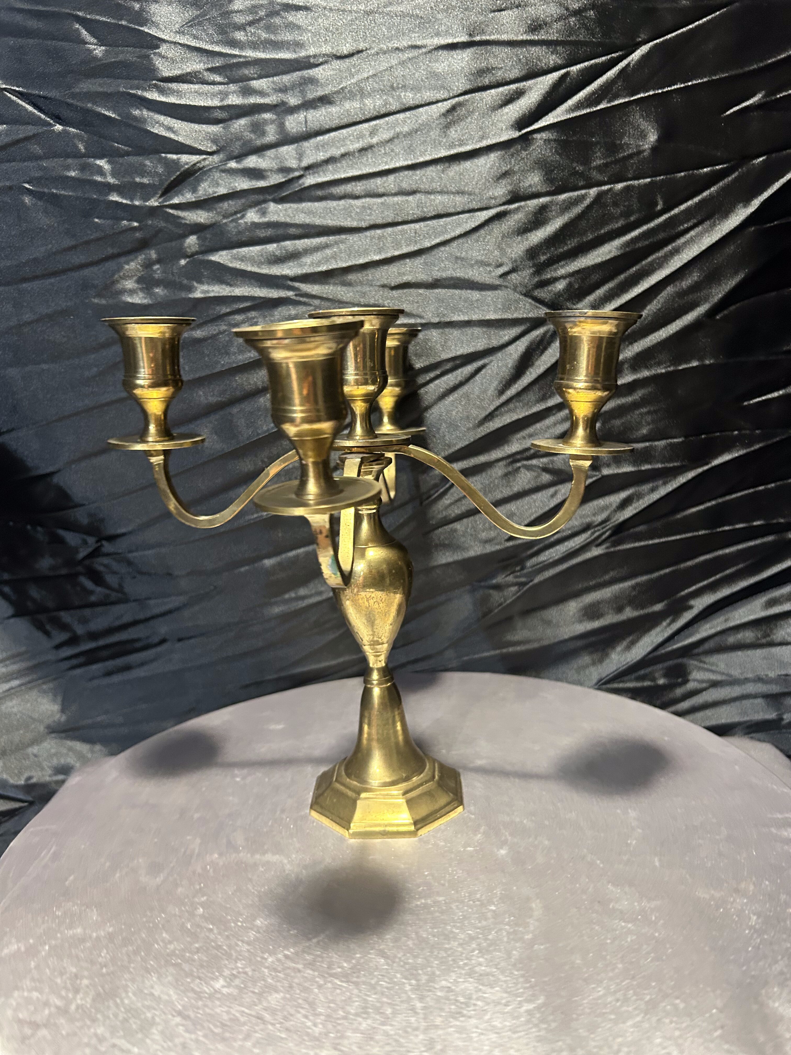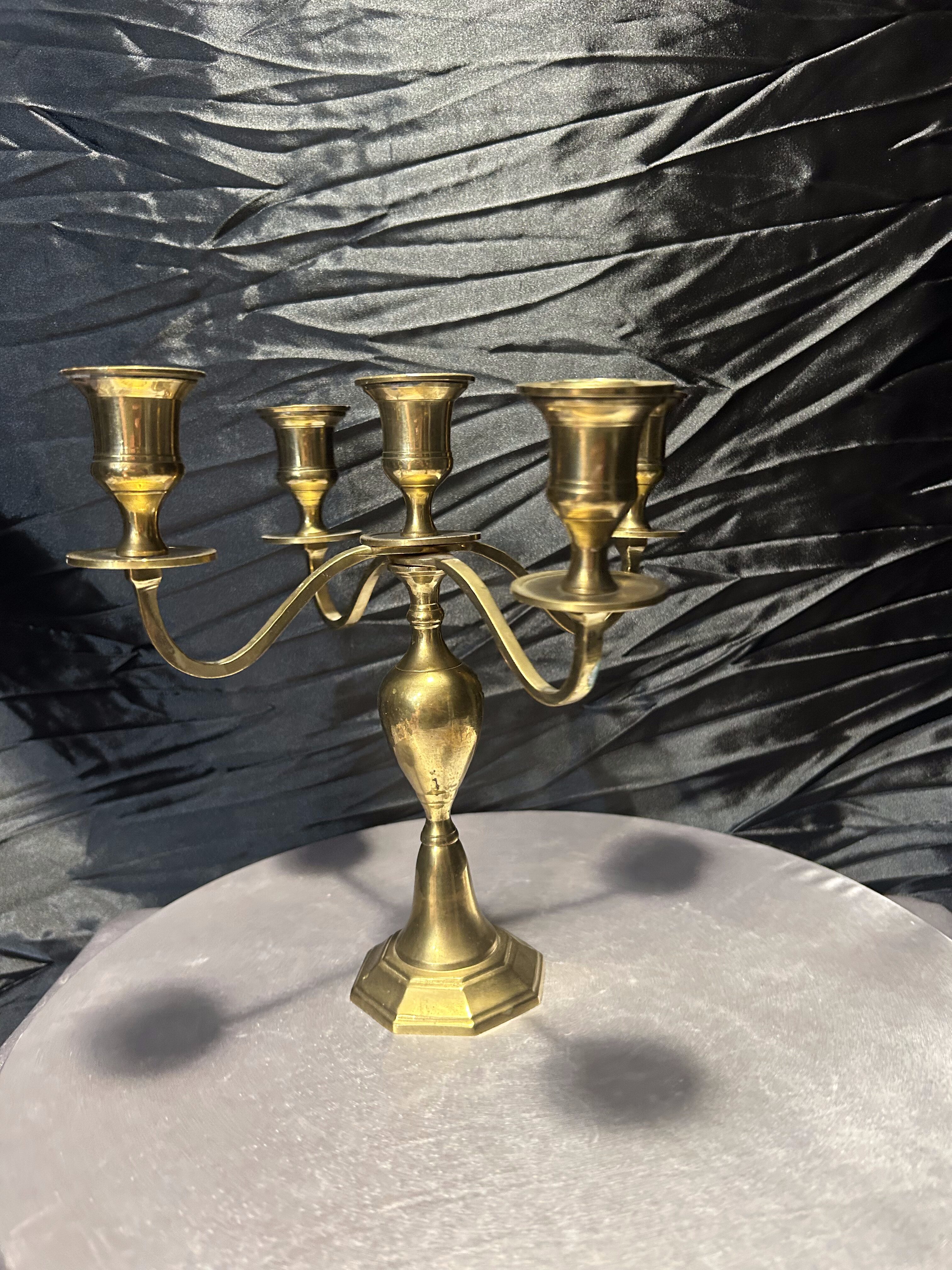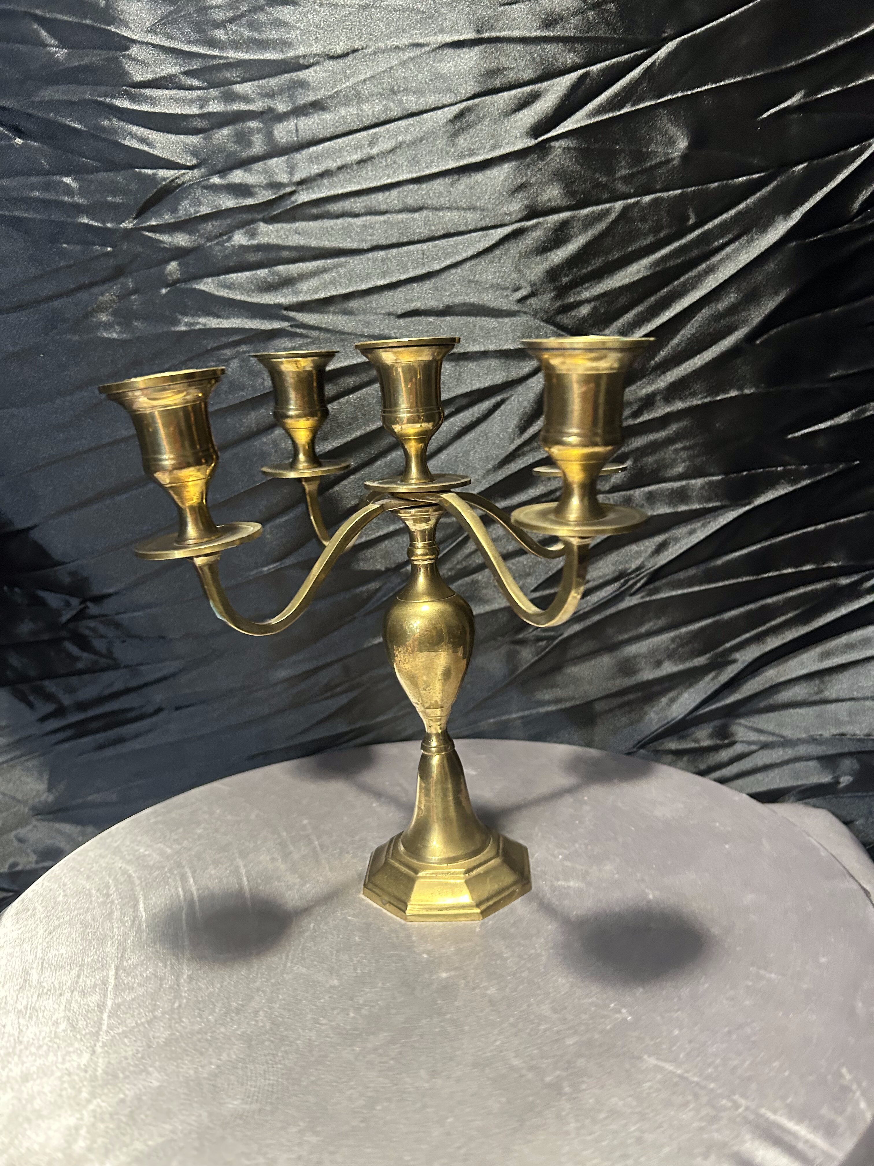 Elegancki świecznik wykonany z masywnego mosiądzu, zaprojektowany na pięć świec, umieszczonych na czterech ramionach z centralnym punktem świetlnym. Jego stabilna podstawa o geometrycznej formie oraz pękaty trzpień nadają mu wyjątkowej harmonii i klasycznego charakteru. Doskonale wpisze się w aranżacje wnętrz w stylu tradycyjnym, vintage czy eklektycznym, tworząc atmosferę pełną ciepła i elegancji.