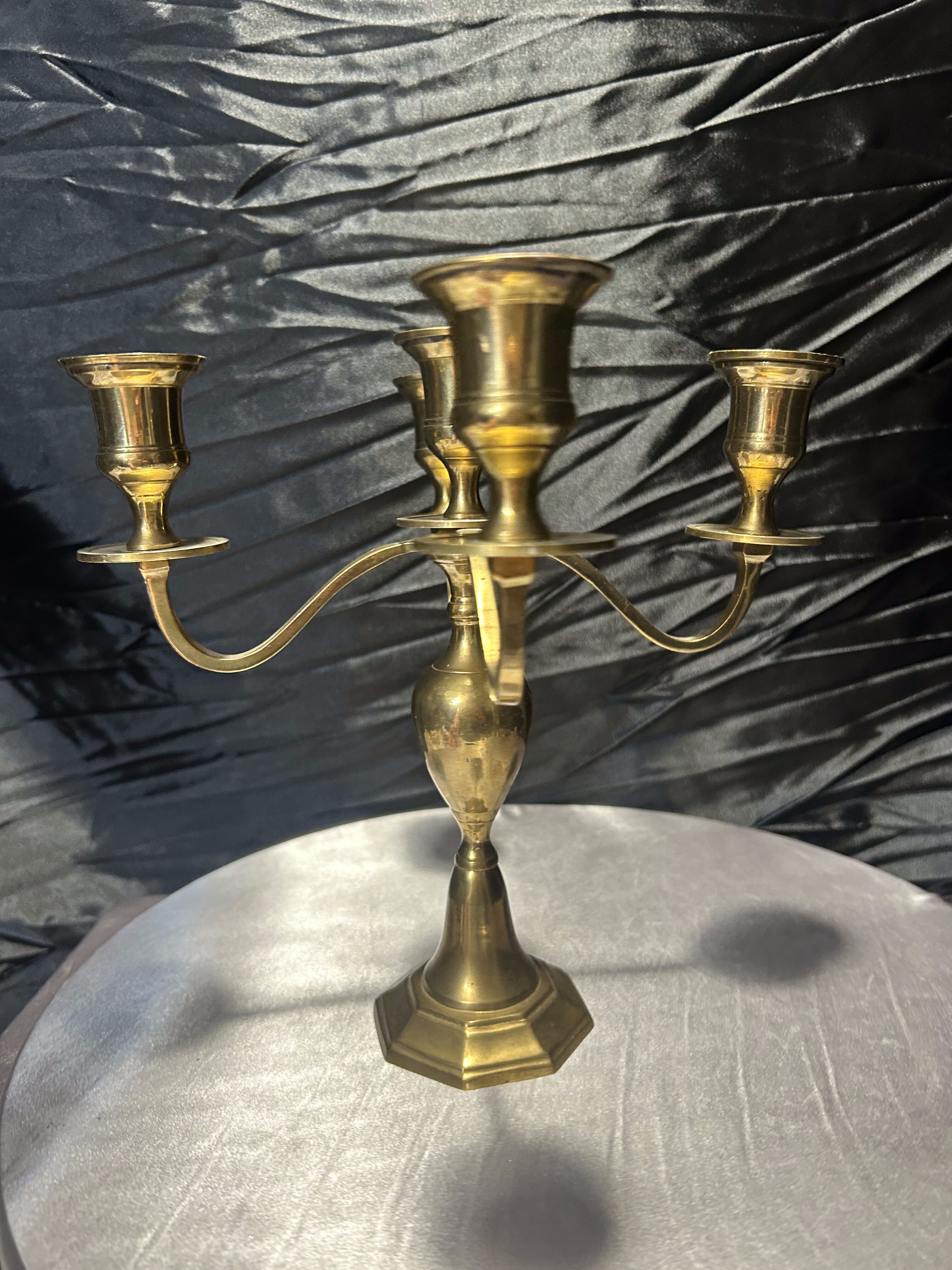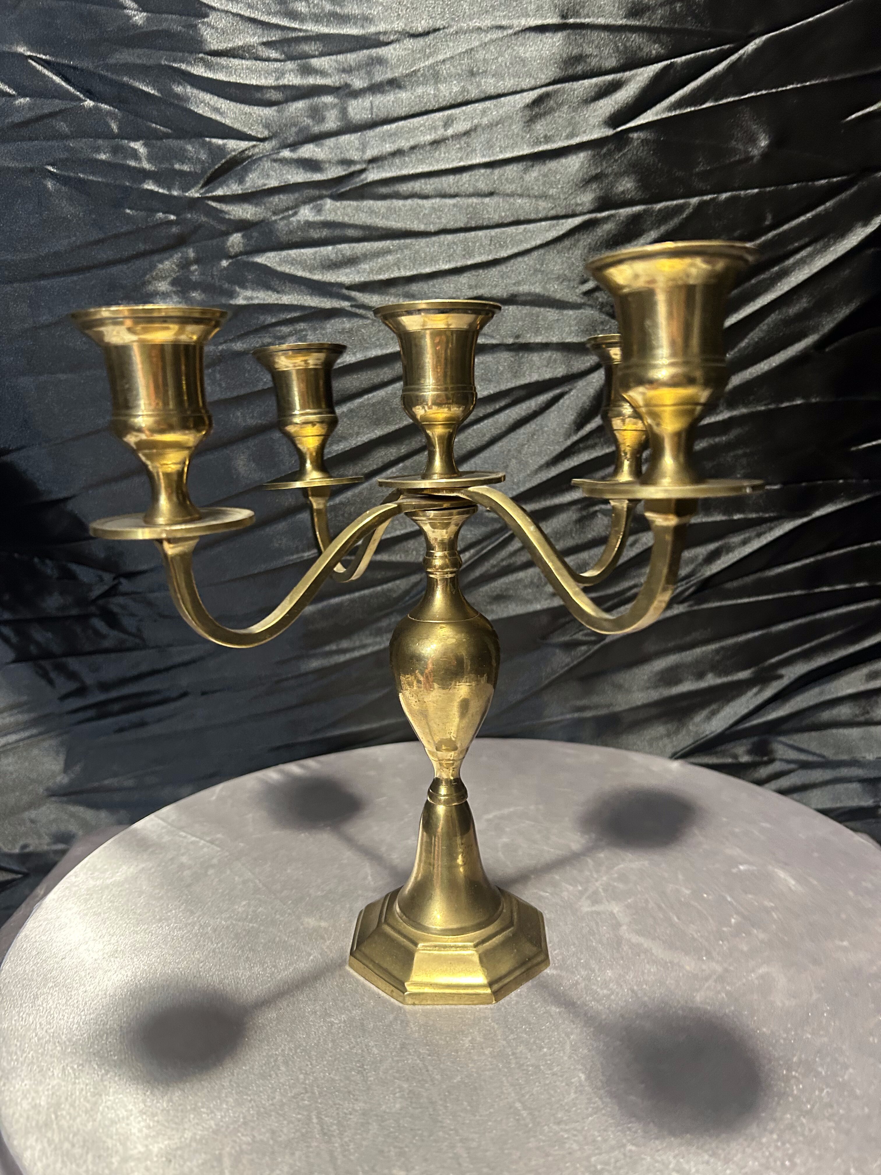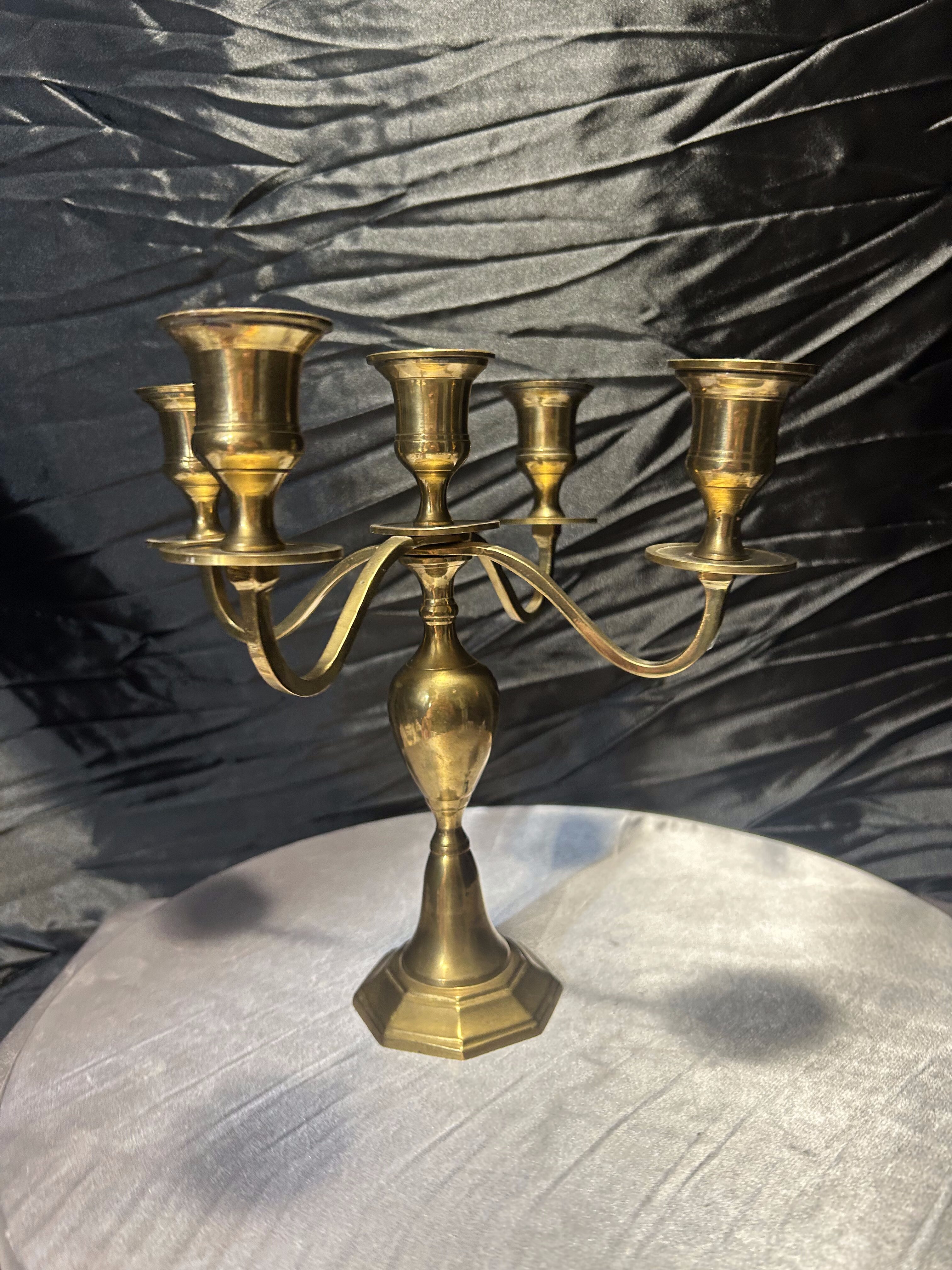 Elegancki świecznik wykonany z masywnego mosiądzu, zaprojektowany na pięć świec, umieszczonych na czterech ramionach z centralnym punktem świetlnym. Jego stabilna podstawa o geometrycznej formie oraz pękaty trzpień nadają mu wyjątkowej harmonii i klasycznego charakteru. Doskonale wpisze się w aranżacje wnętrz w stylu tradycyjnym, vintage czy eklektycznym, tworząc atmosferę pełną ciepła i elegancji.