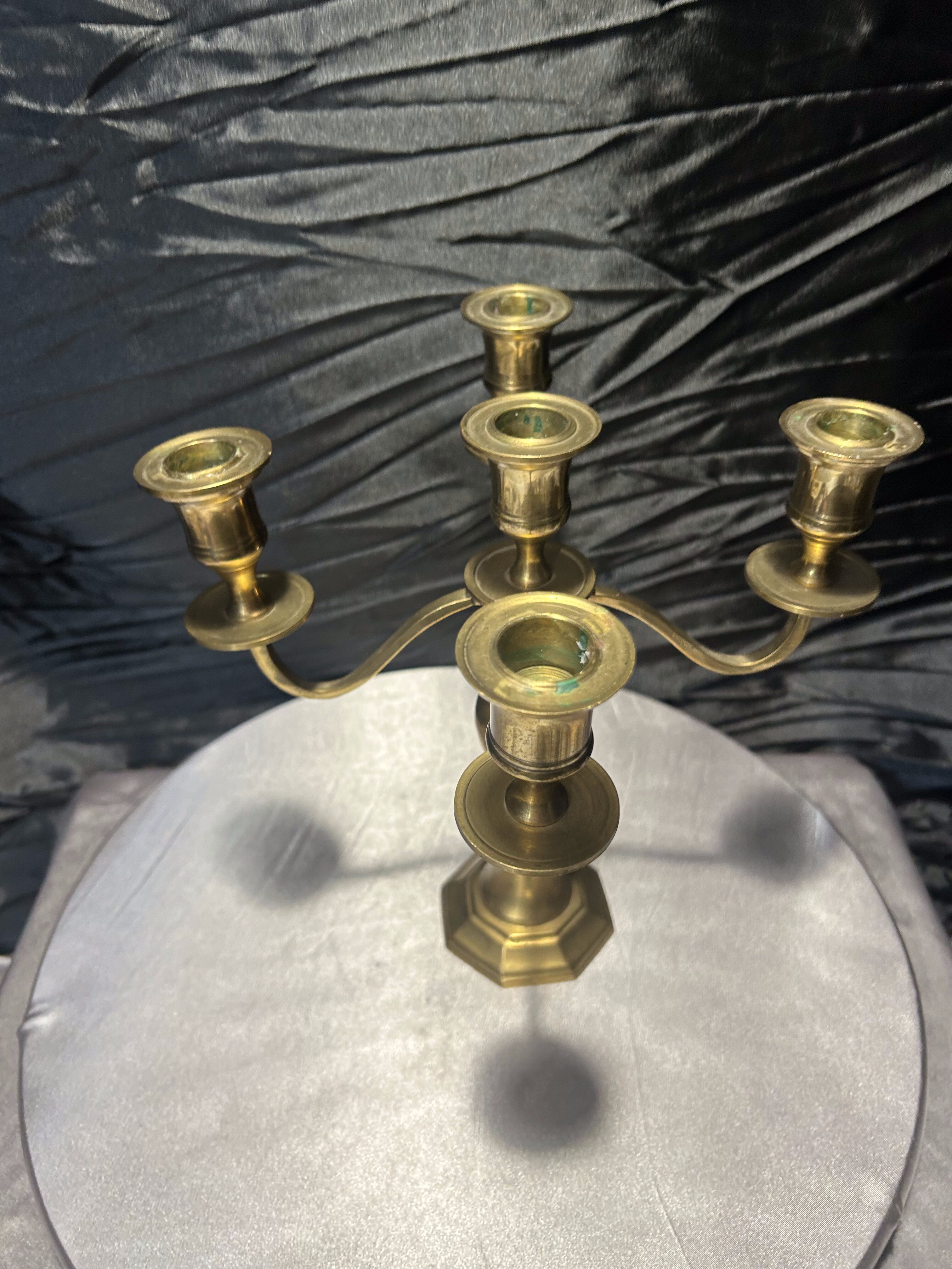 Mosiężny świecznik czteroramienny na pięć świec – klasyczna forma – solidne wykonanie