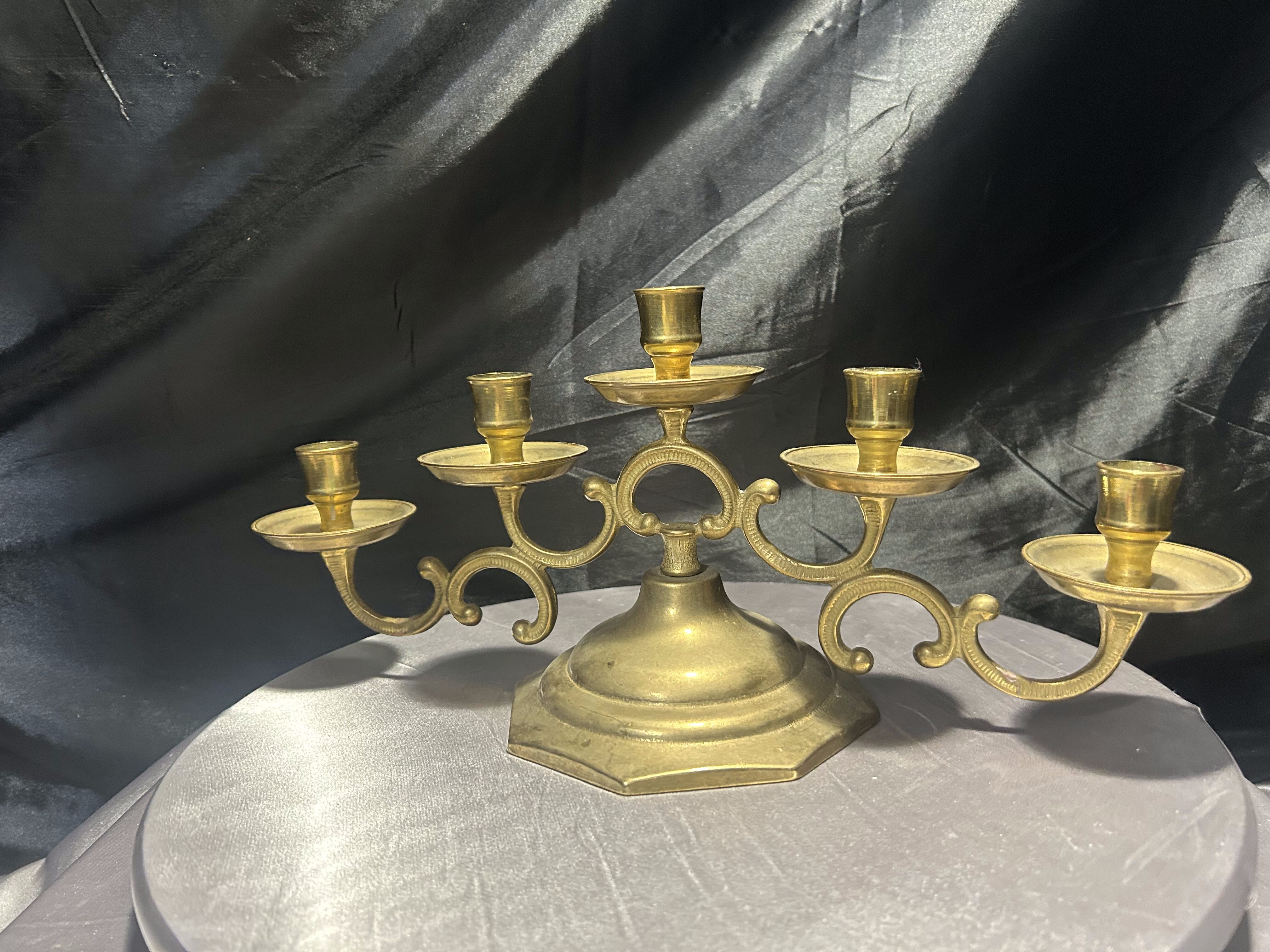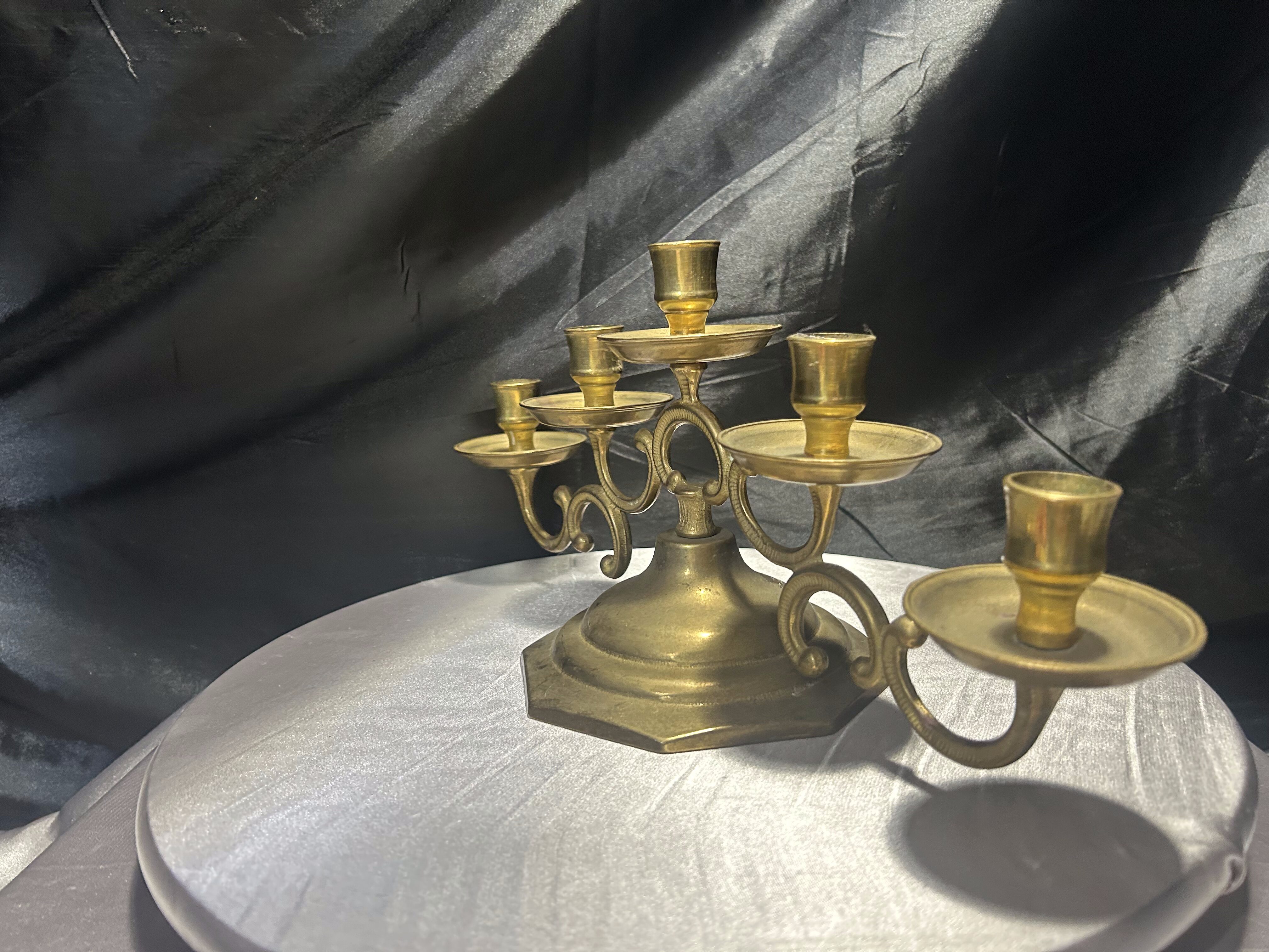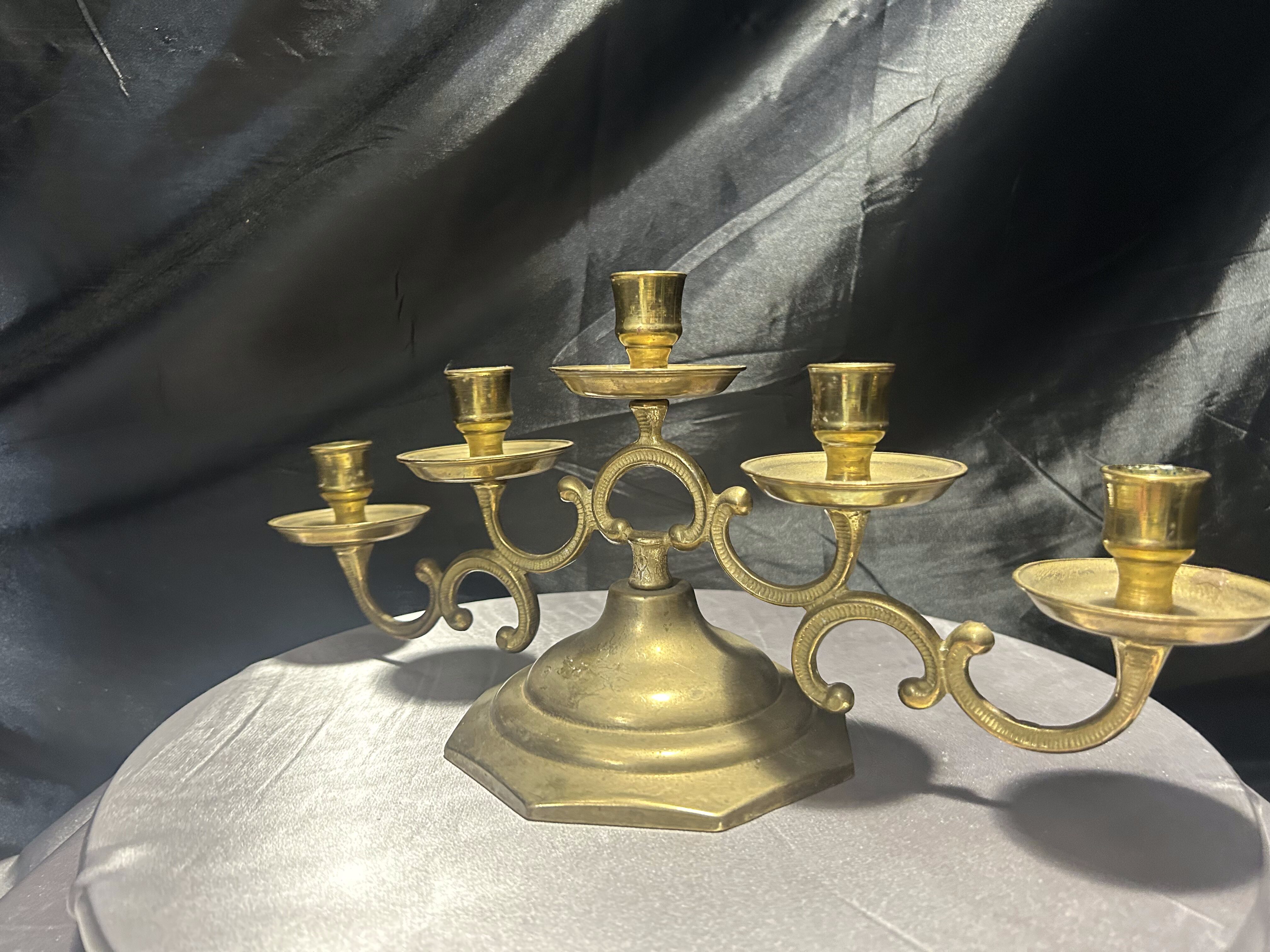 Mosiężny świecznik na 5 świec – bogato zdobiony – klasyczna elegancja