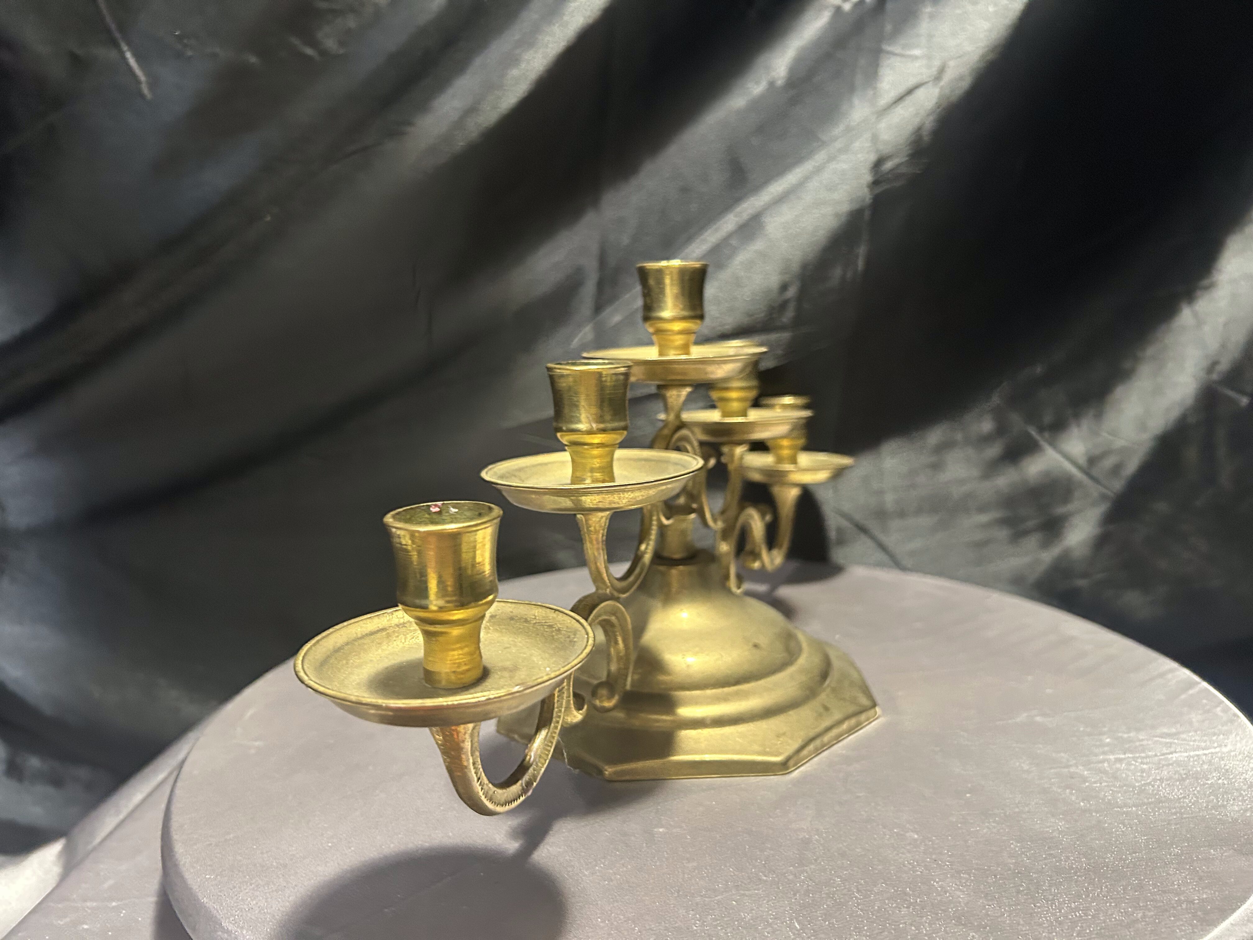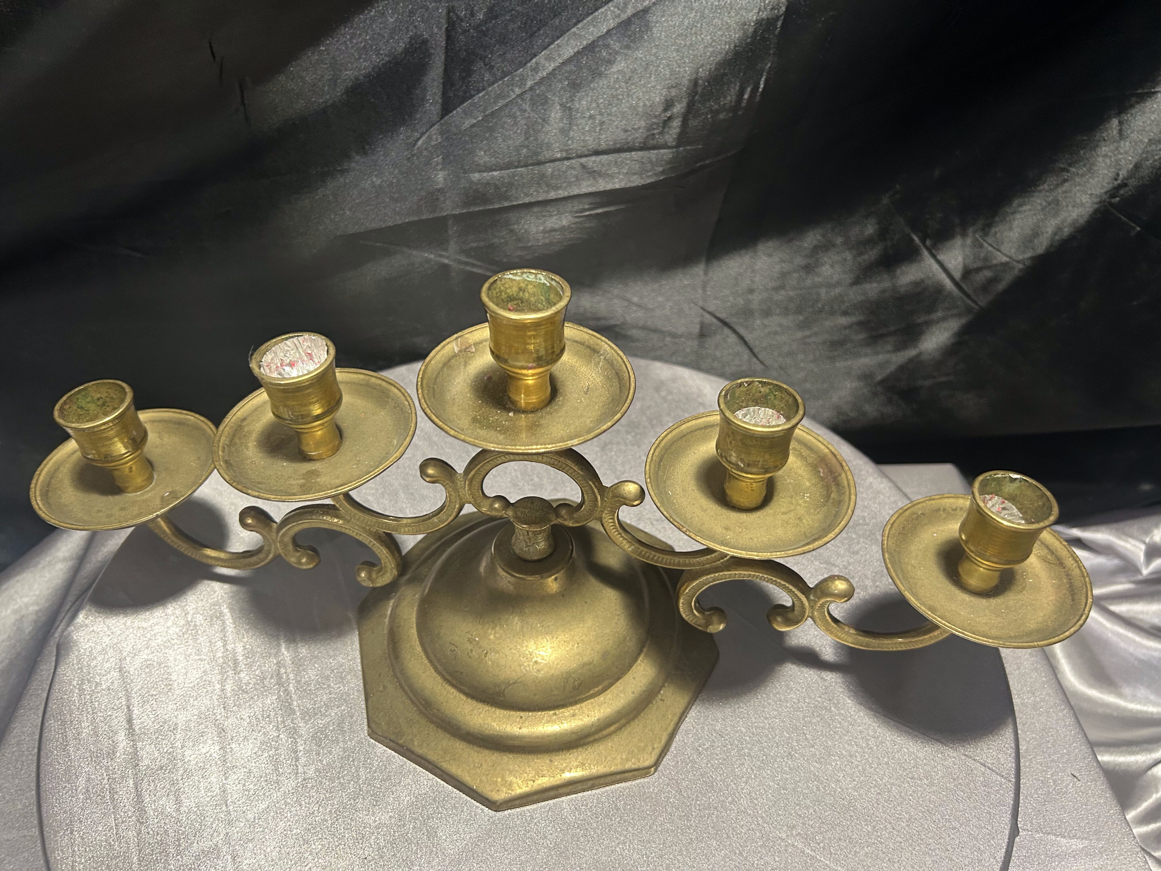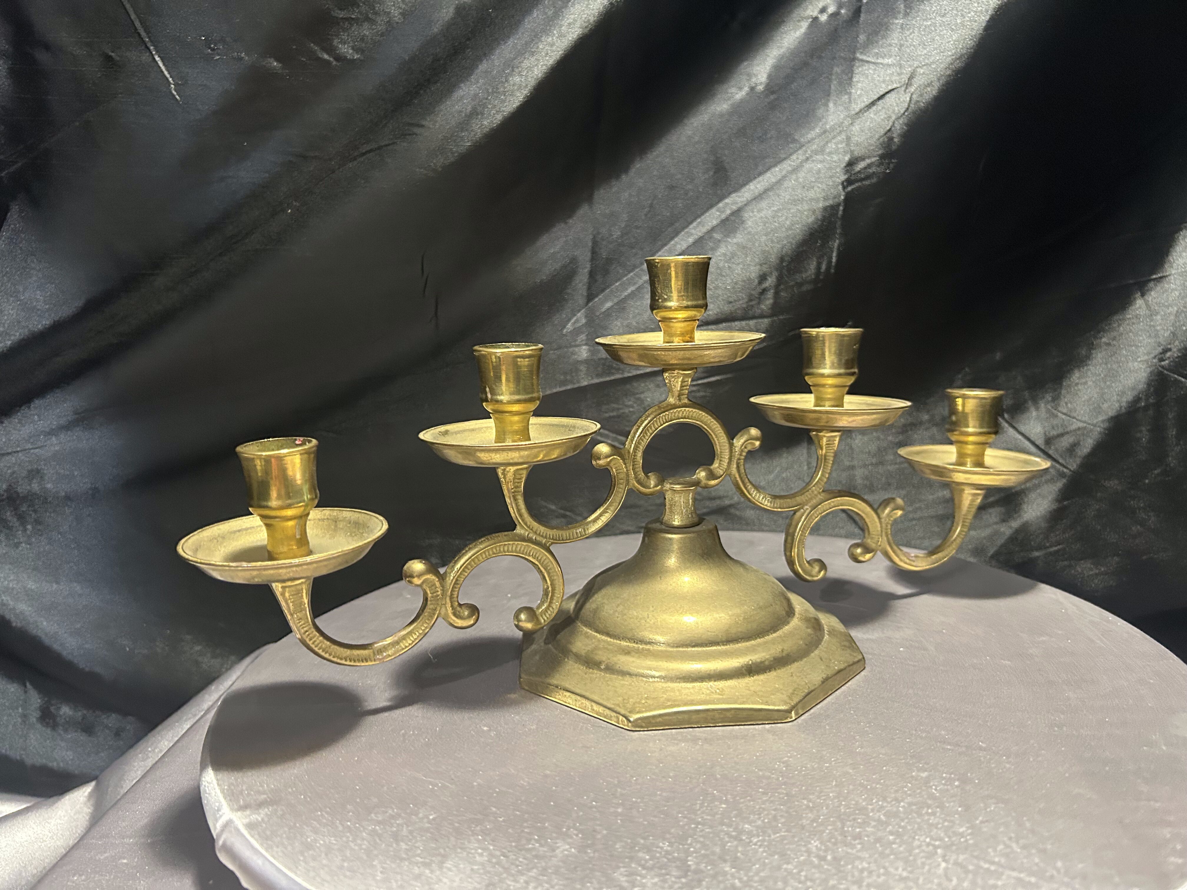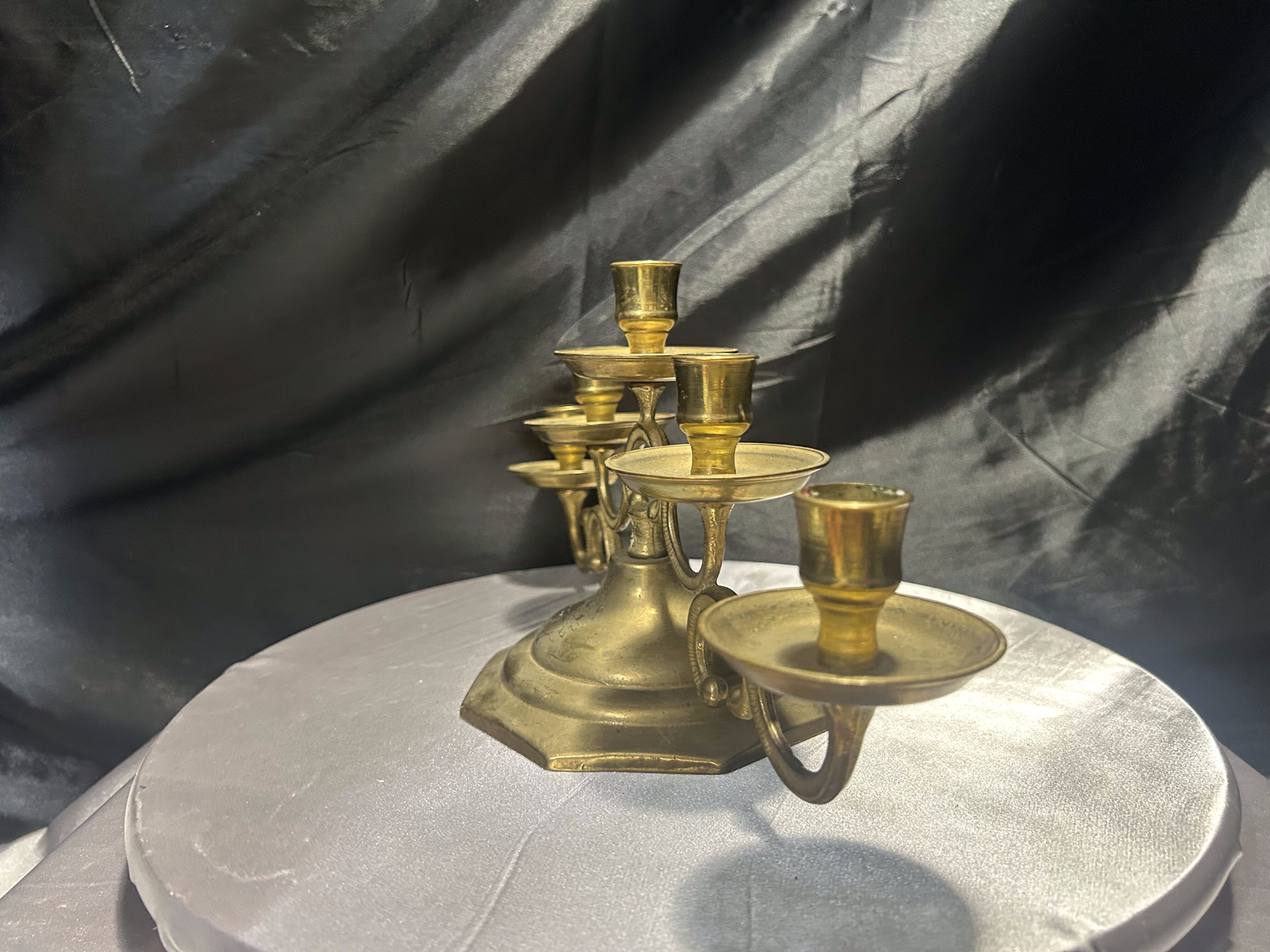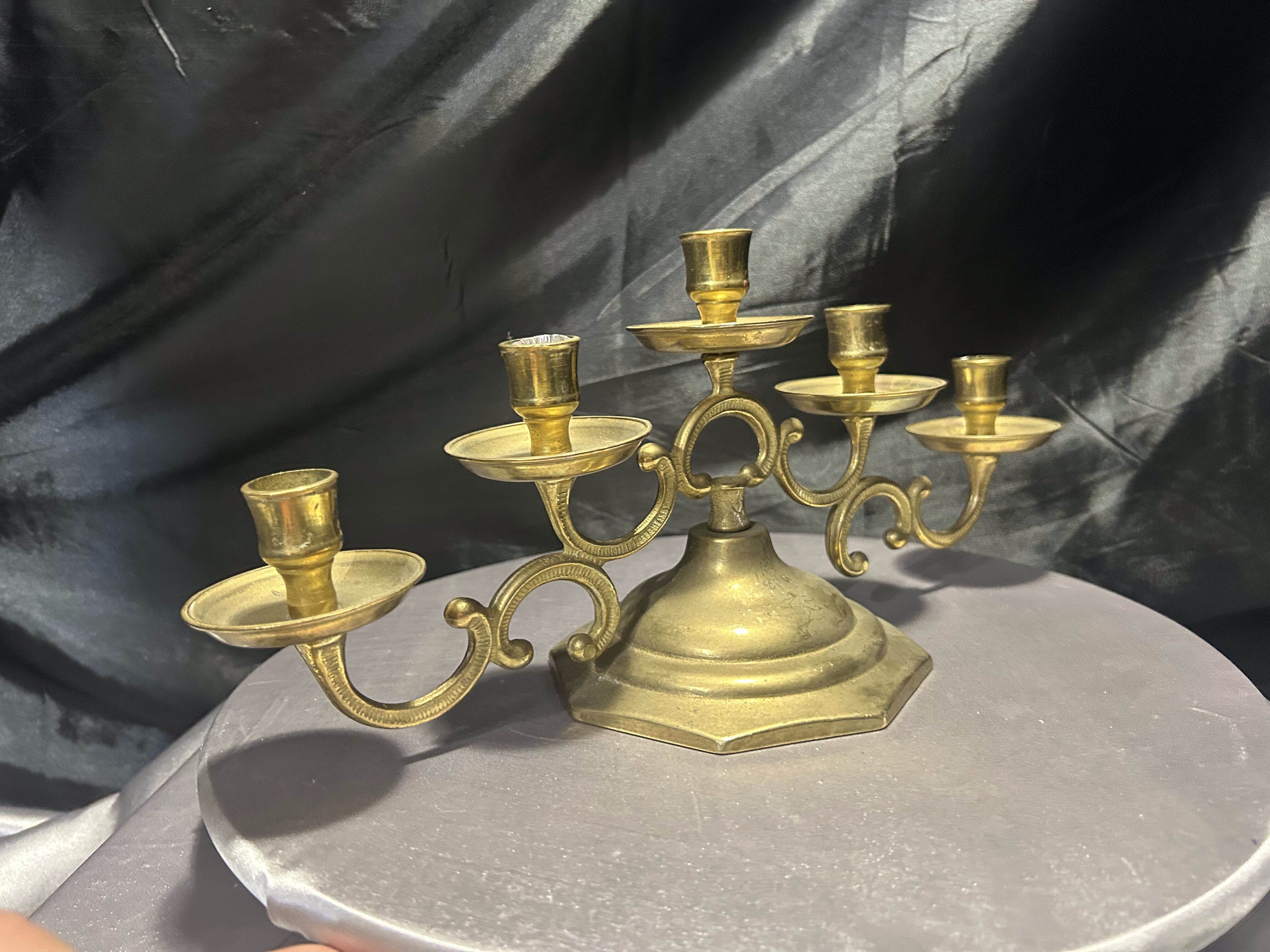 - Mosiężny świecznik na 5 świec – bogato zdobiony – klasyczna elegancja