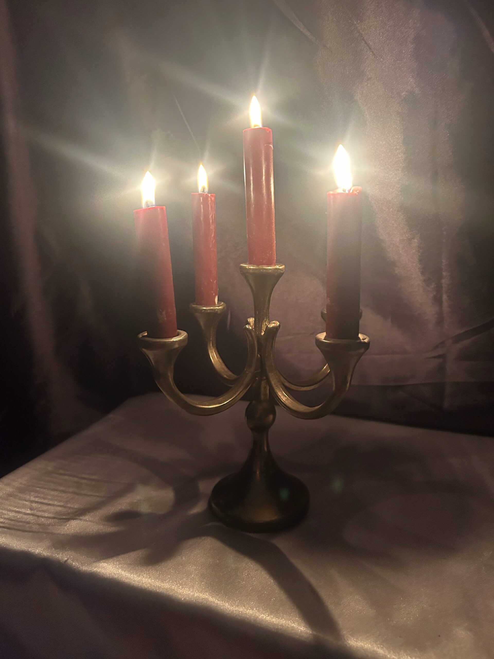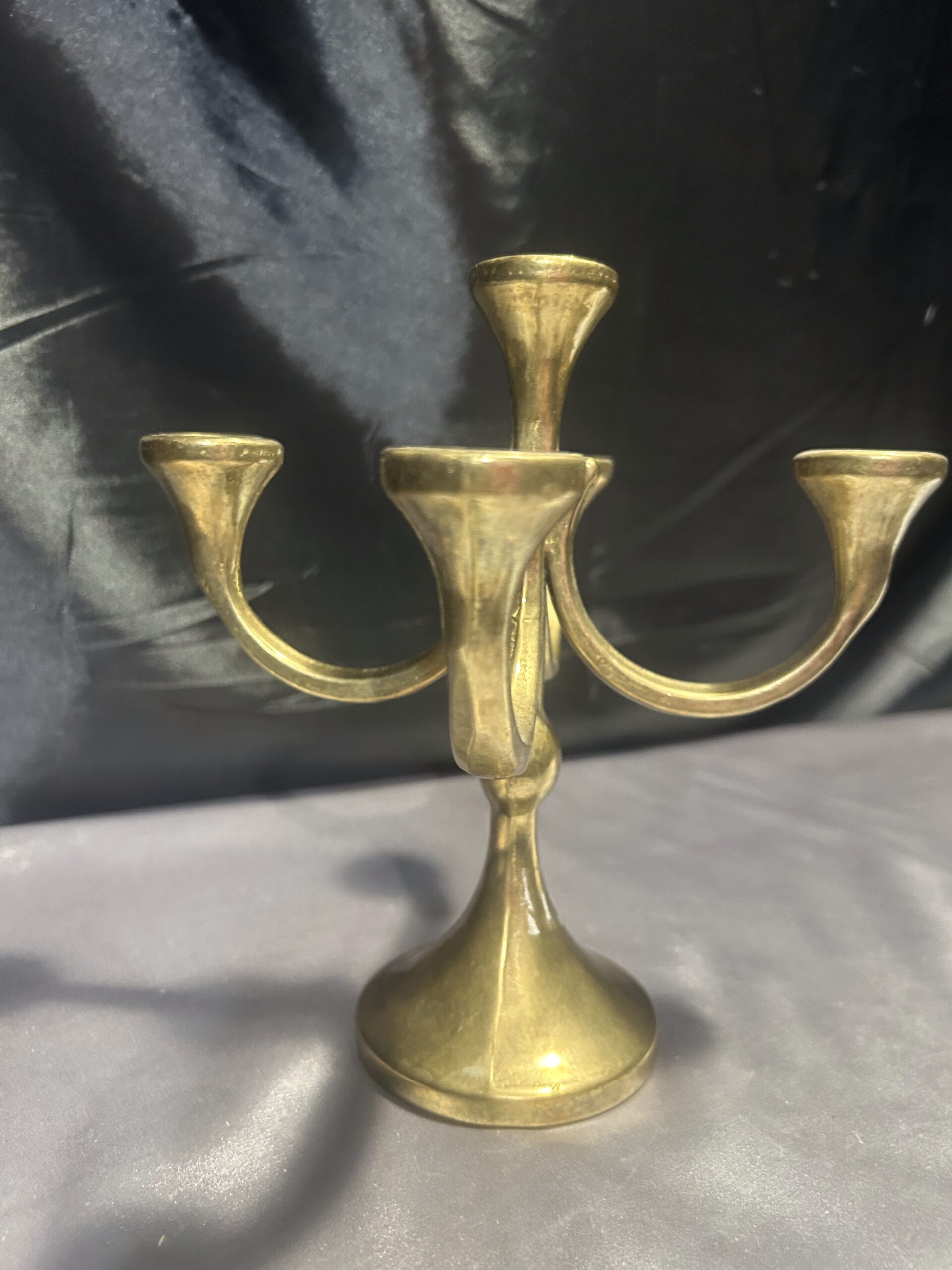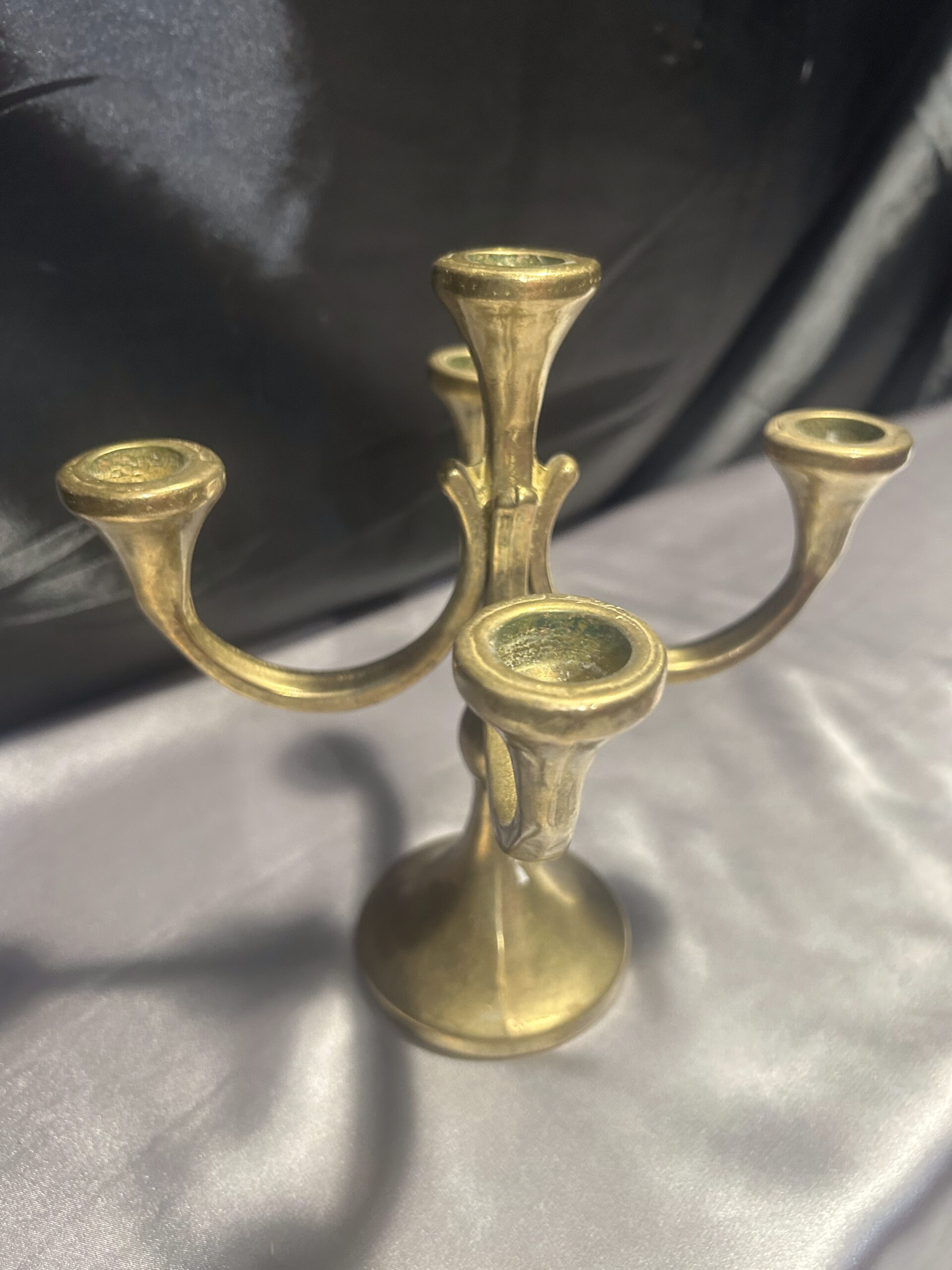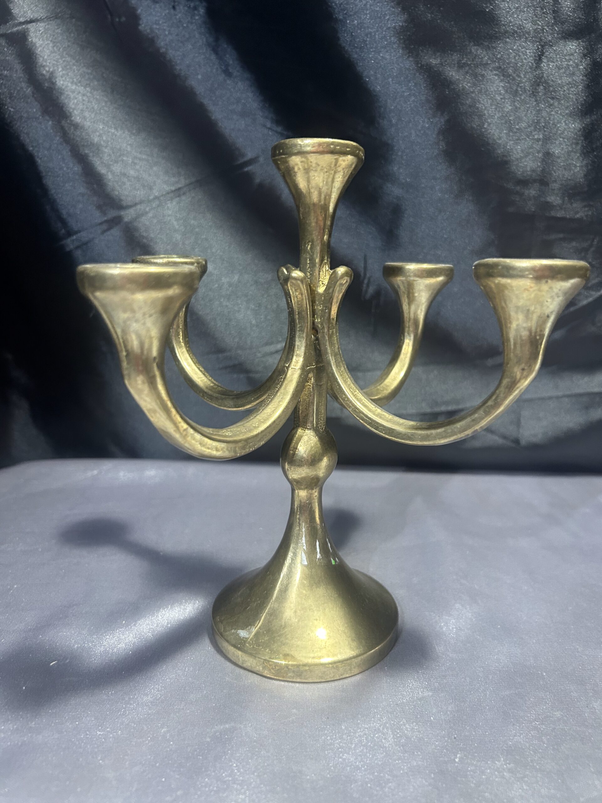 Oferujemy elegancki mosiężny świecznik, przeznaczony na 5 świec, z czterema ramionami. Jego solidna konstrukcja i klasyczny design sprawiają, że doskonale sprawdzi się jako dekoracja stołu, komody czy kominka. To wyjątkowy element wystroju, który doda wnętrzu ciepła i elegancji.