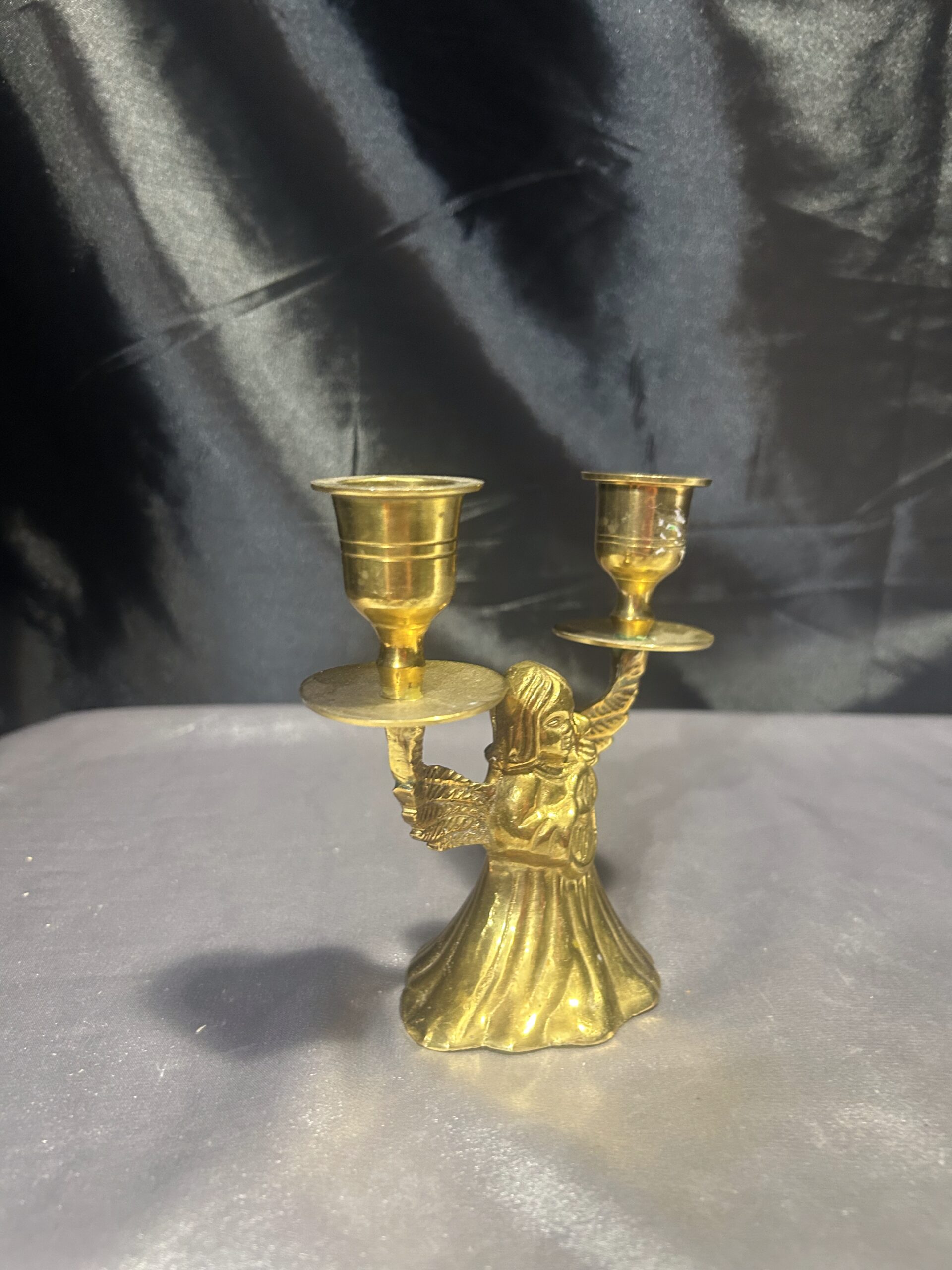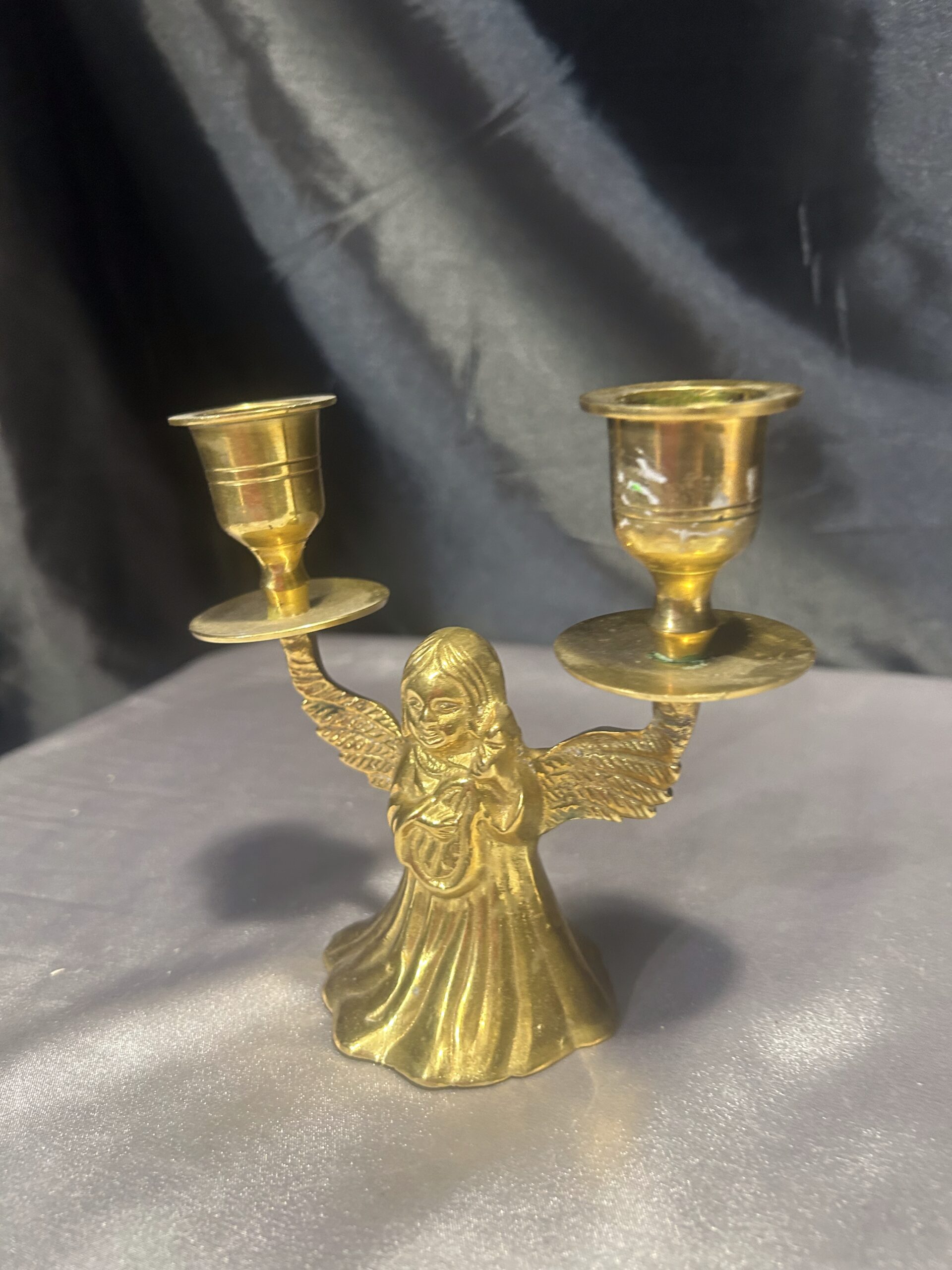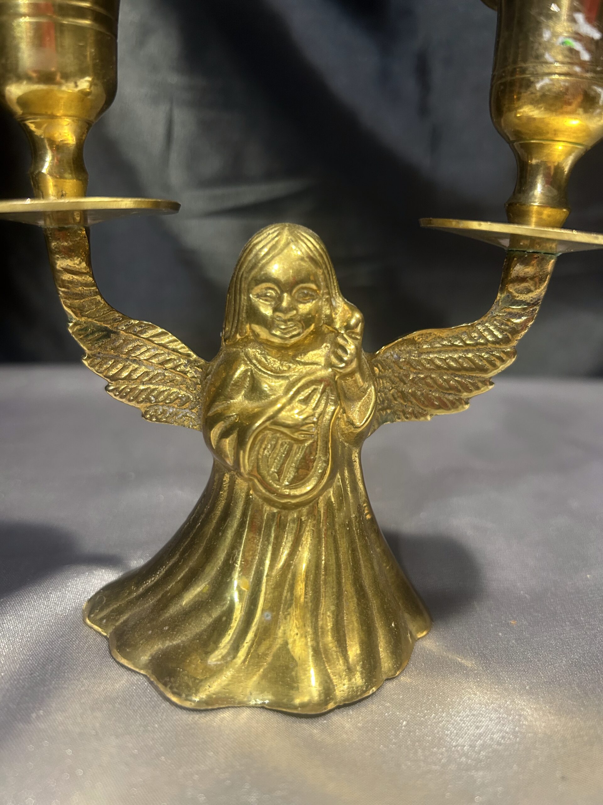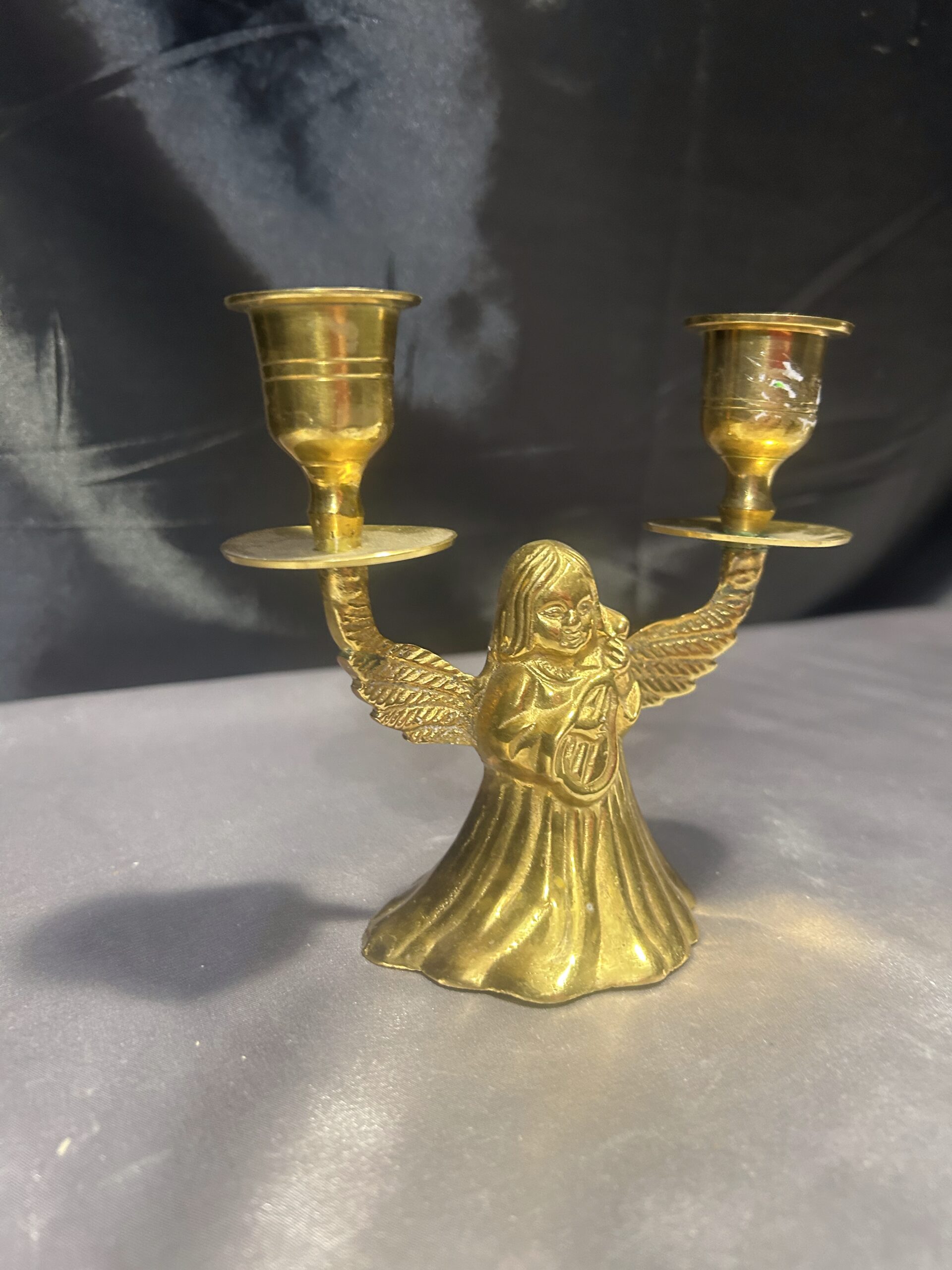 Mosiężny Świecznik w Kształcie Anioła – Dwuramienny, z Lutnią