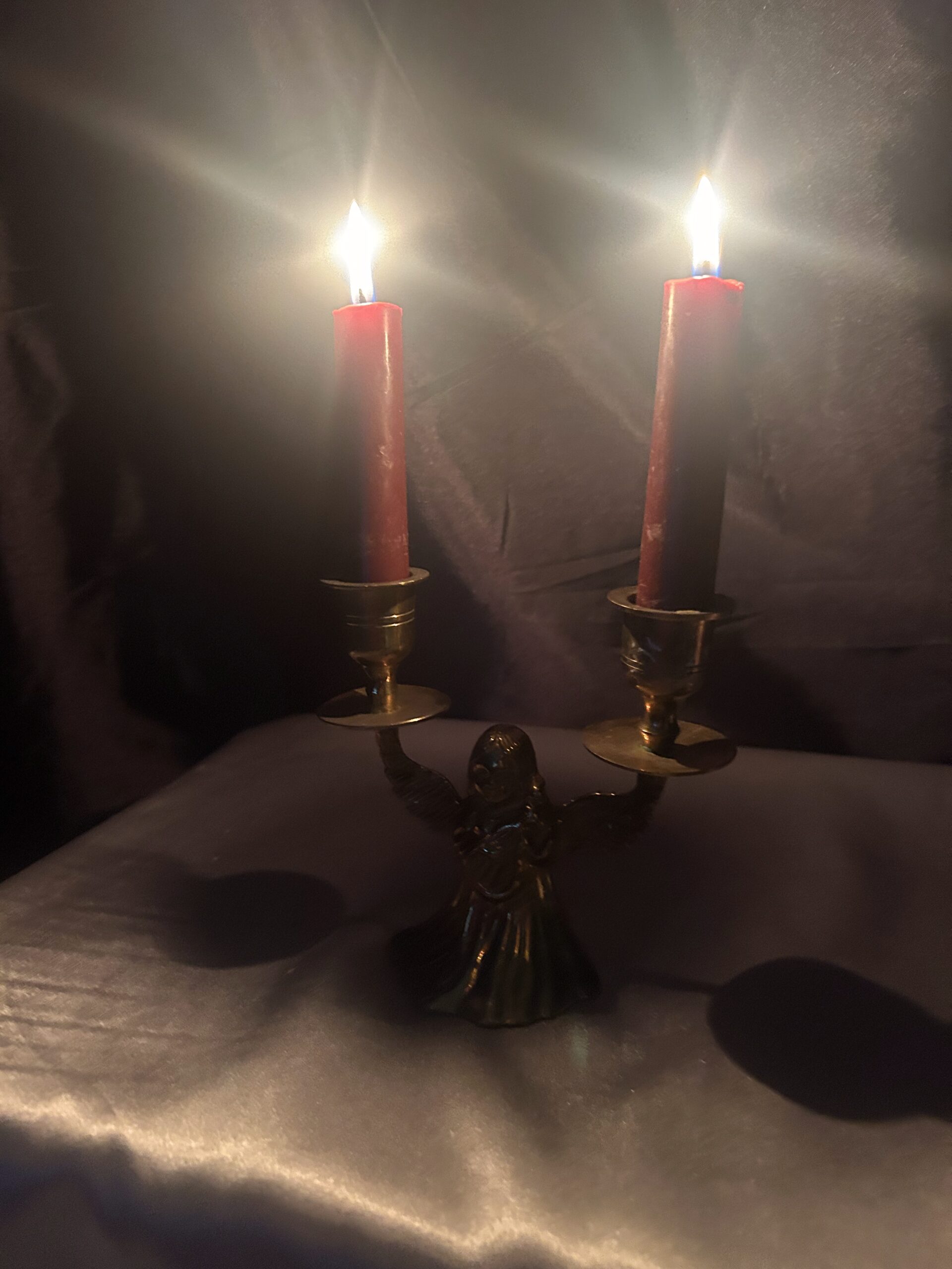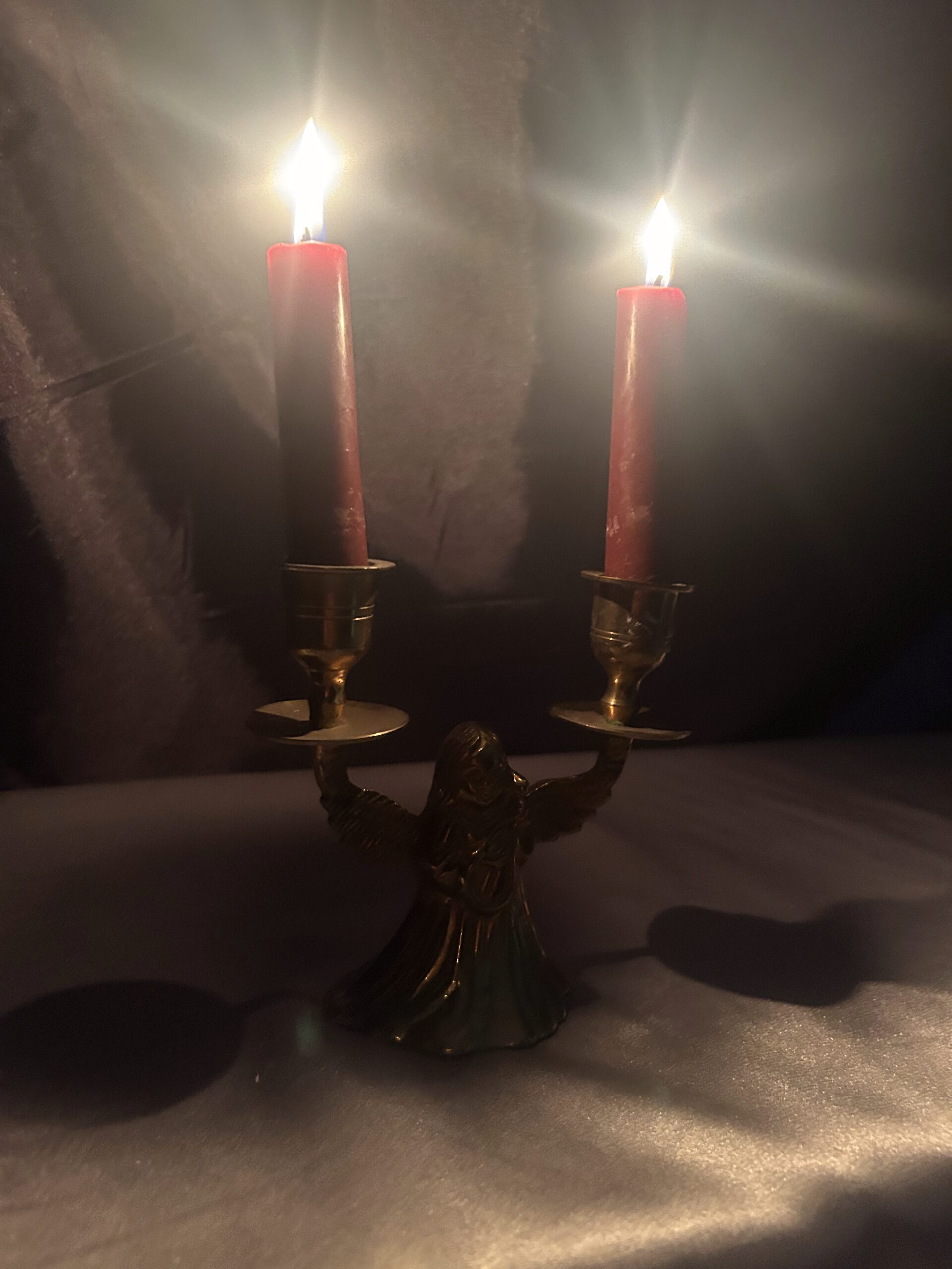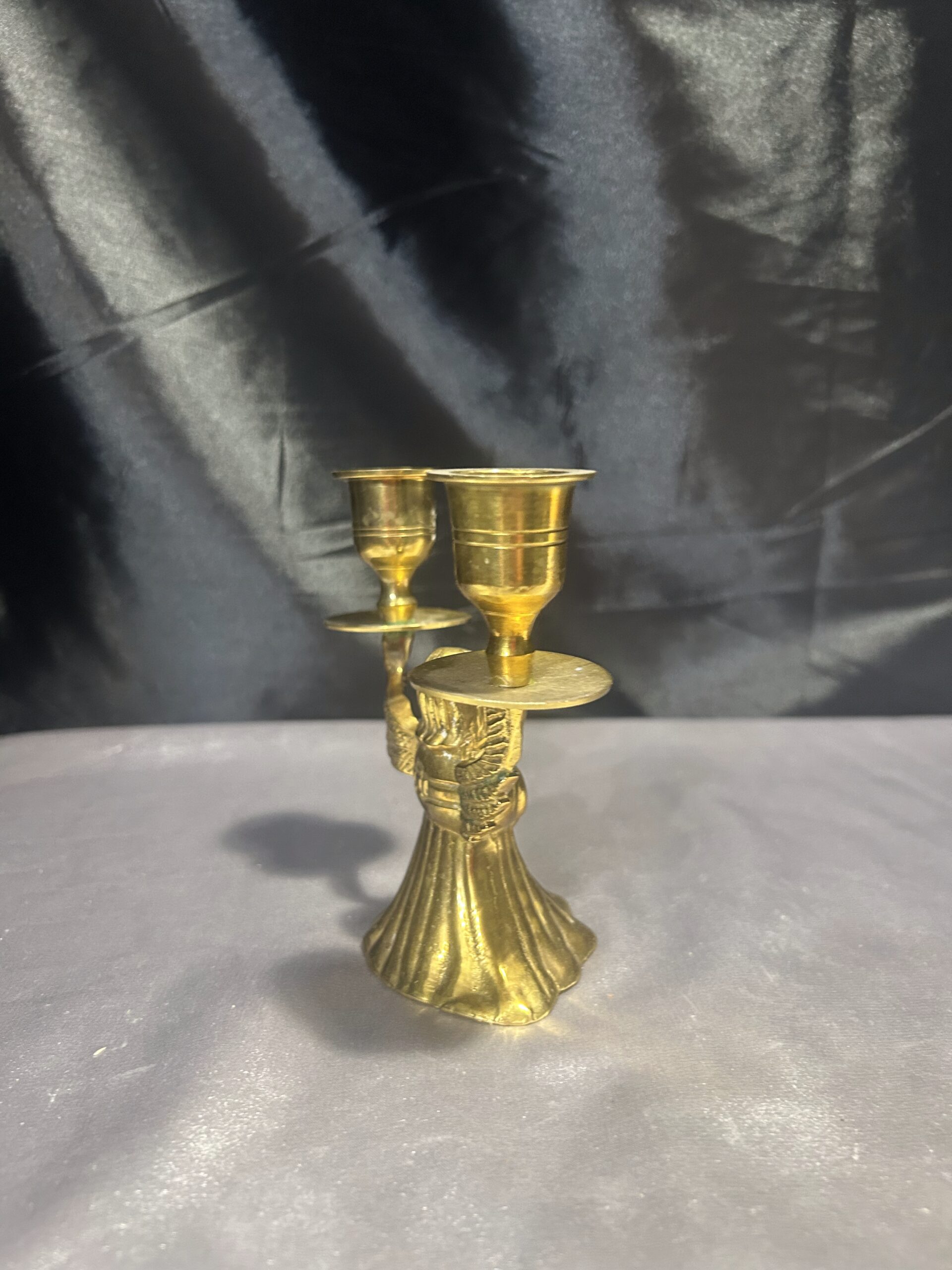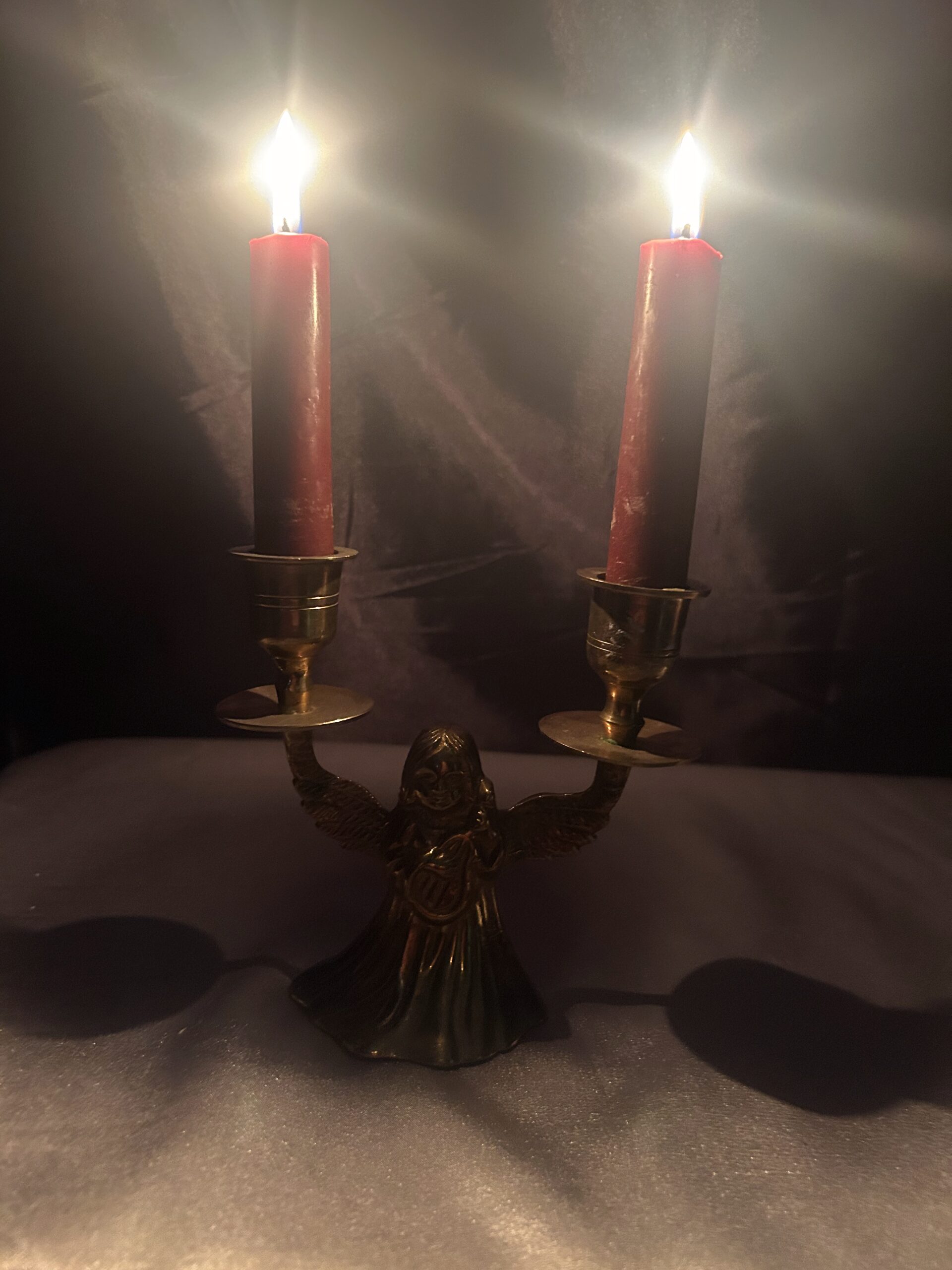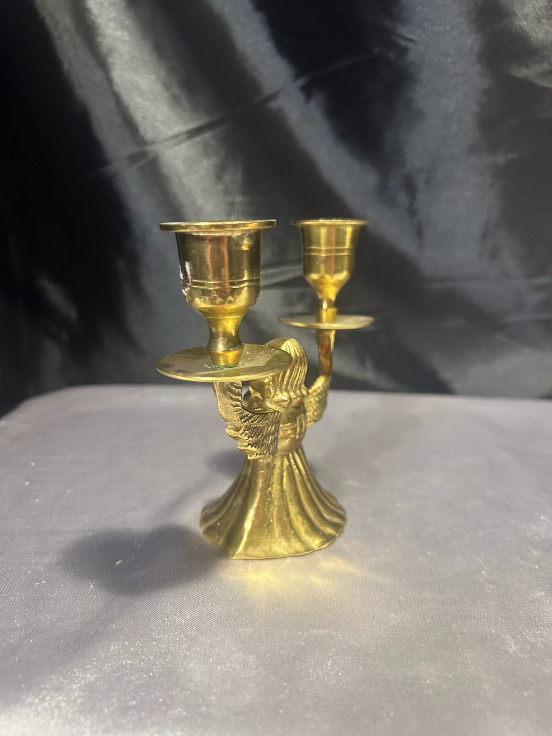 Mosiężny Świecznik w Kształcie Anioła – Dwuramienny, z Lutnią