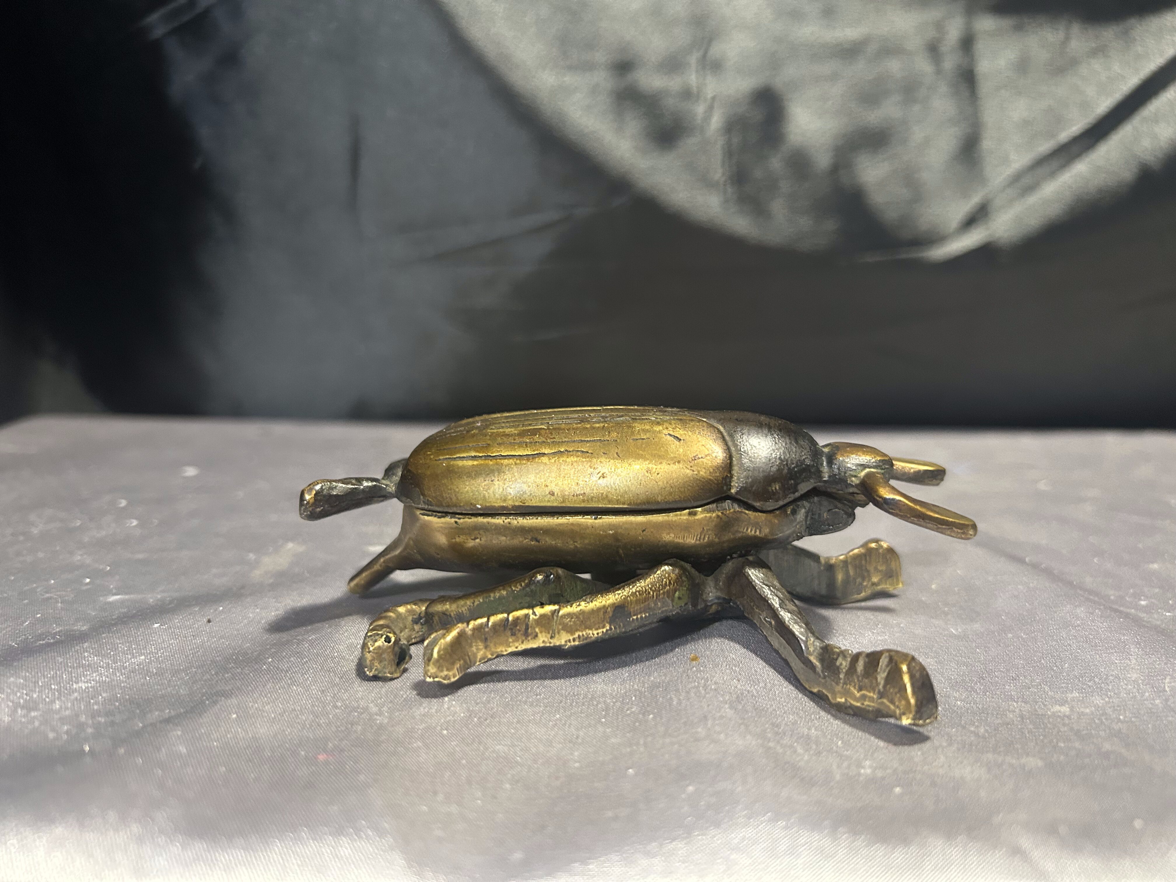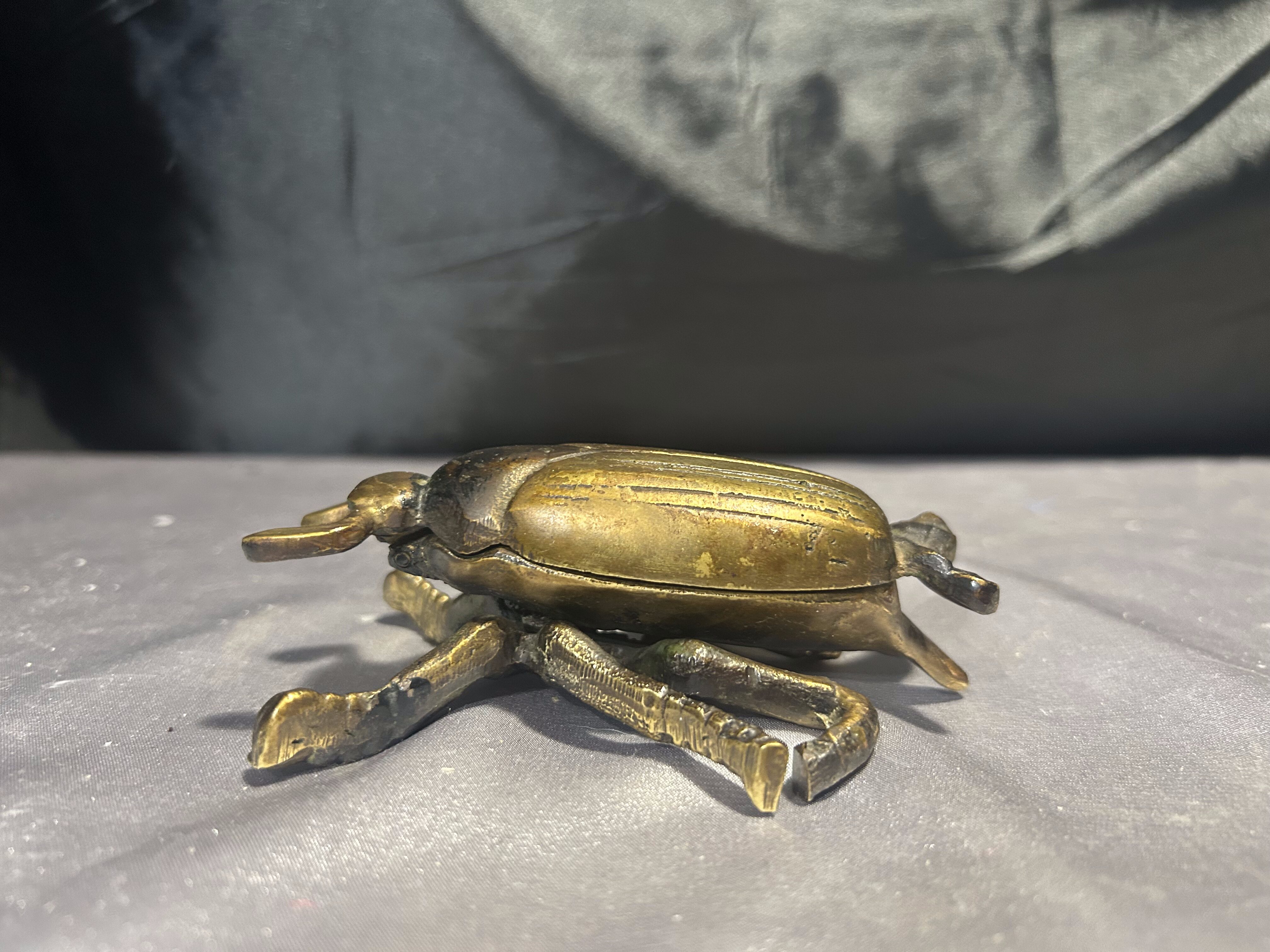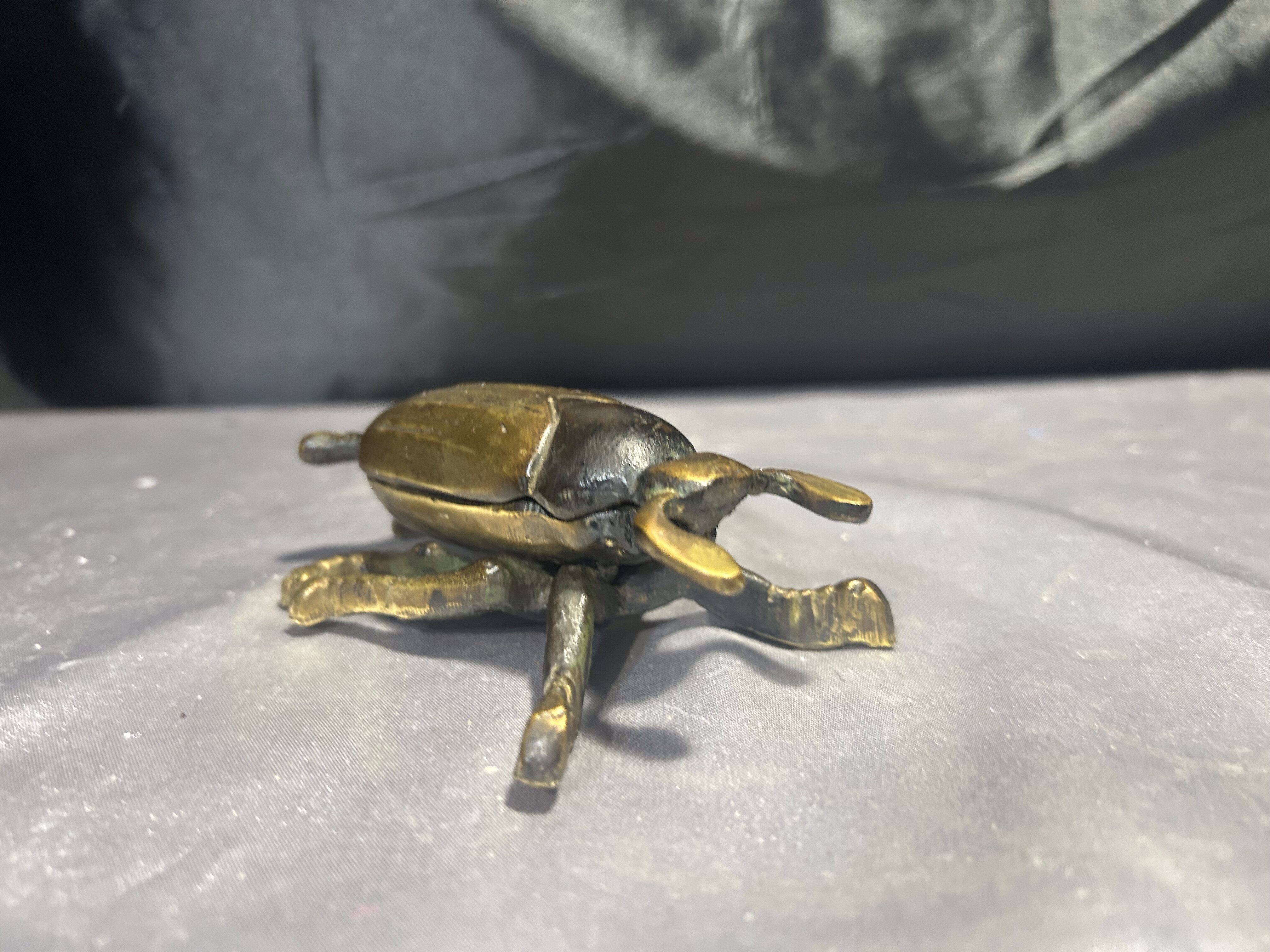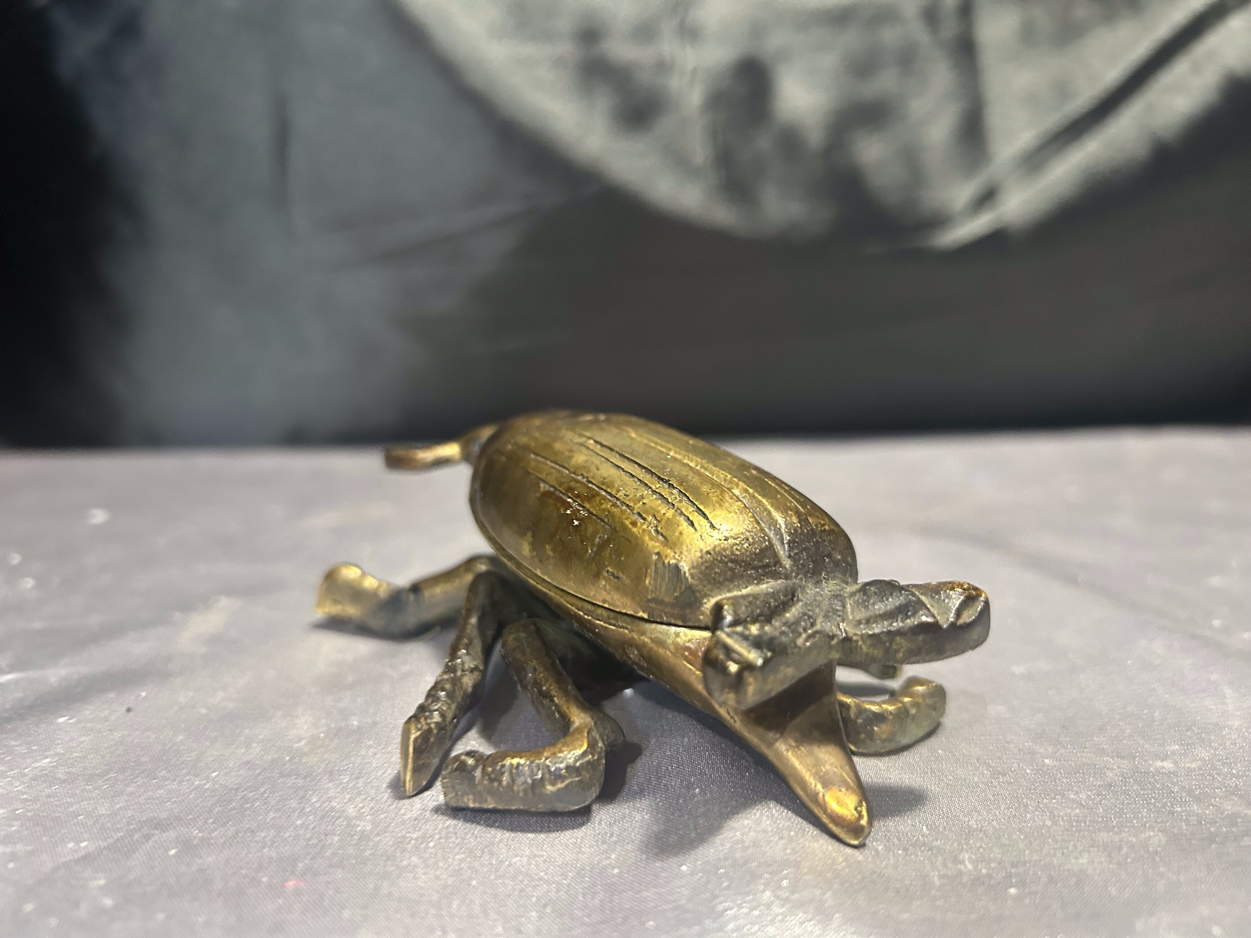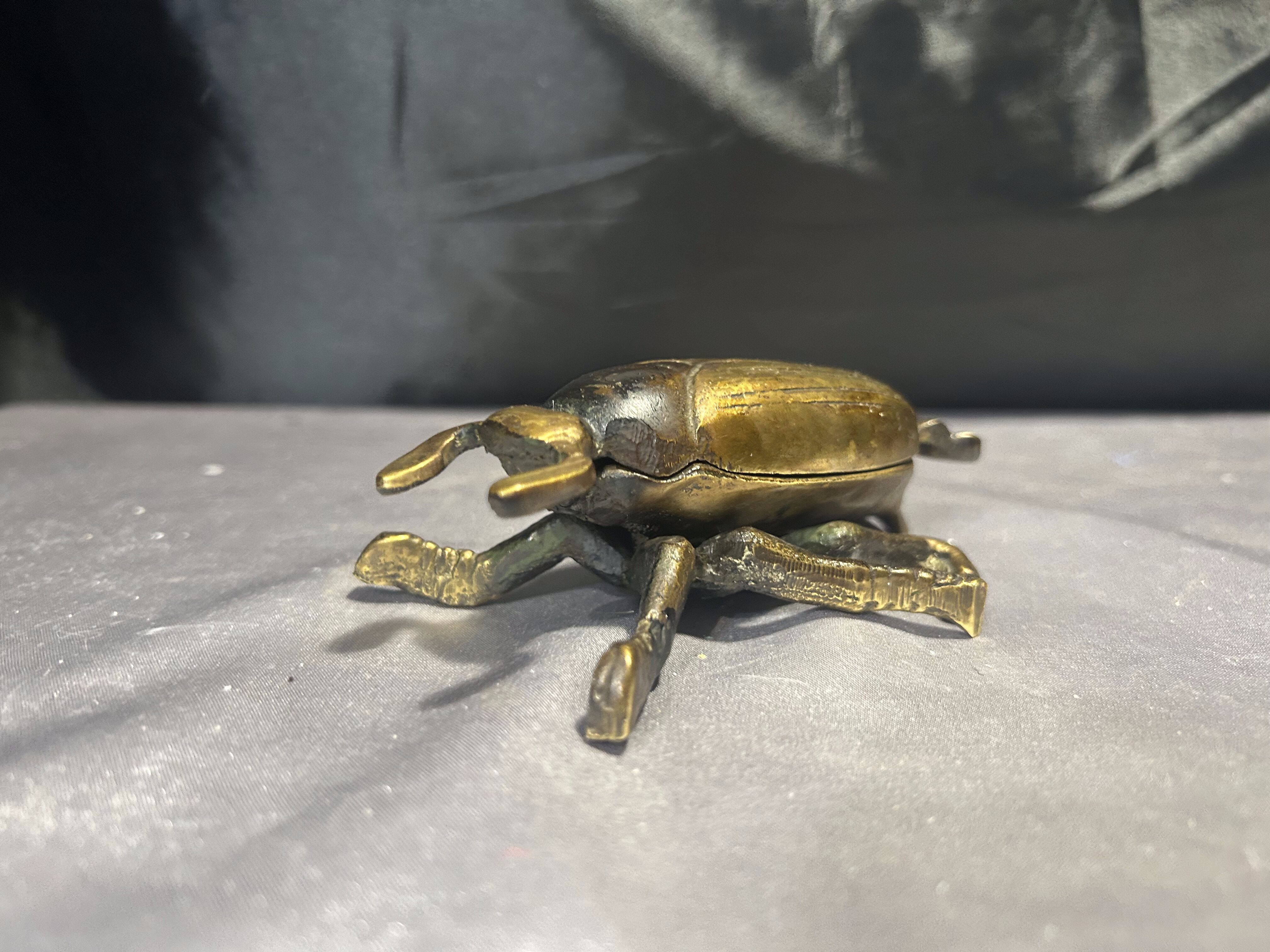 Unikatowy żuk z mosiądzu, pełniący funkcję zamykanej popielniczki lub puzderka. Starannie wykonany, z pięknie odwzorowanymi detalami, stanowi wyjątkową ozdobę o niebanalnym charakterze. Świetnie sprawdzi się zarówno jako praktyczne pudełeczko na drobiazgi, jak i efektowna dekoracja wnętrza.