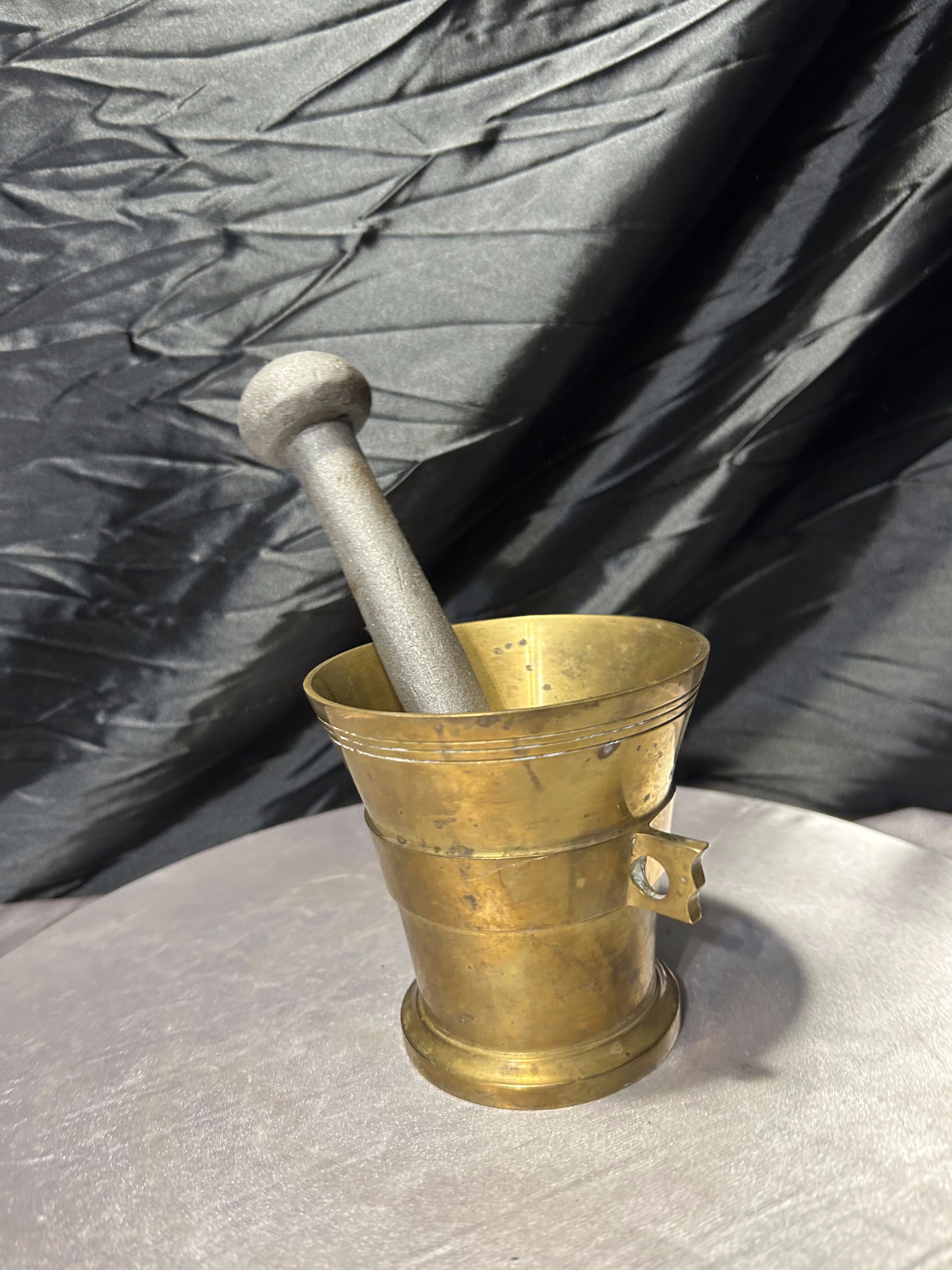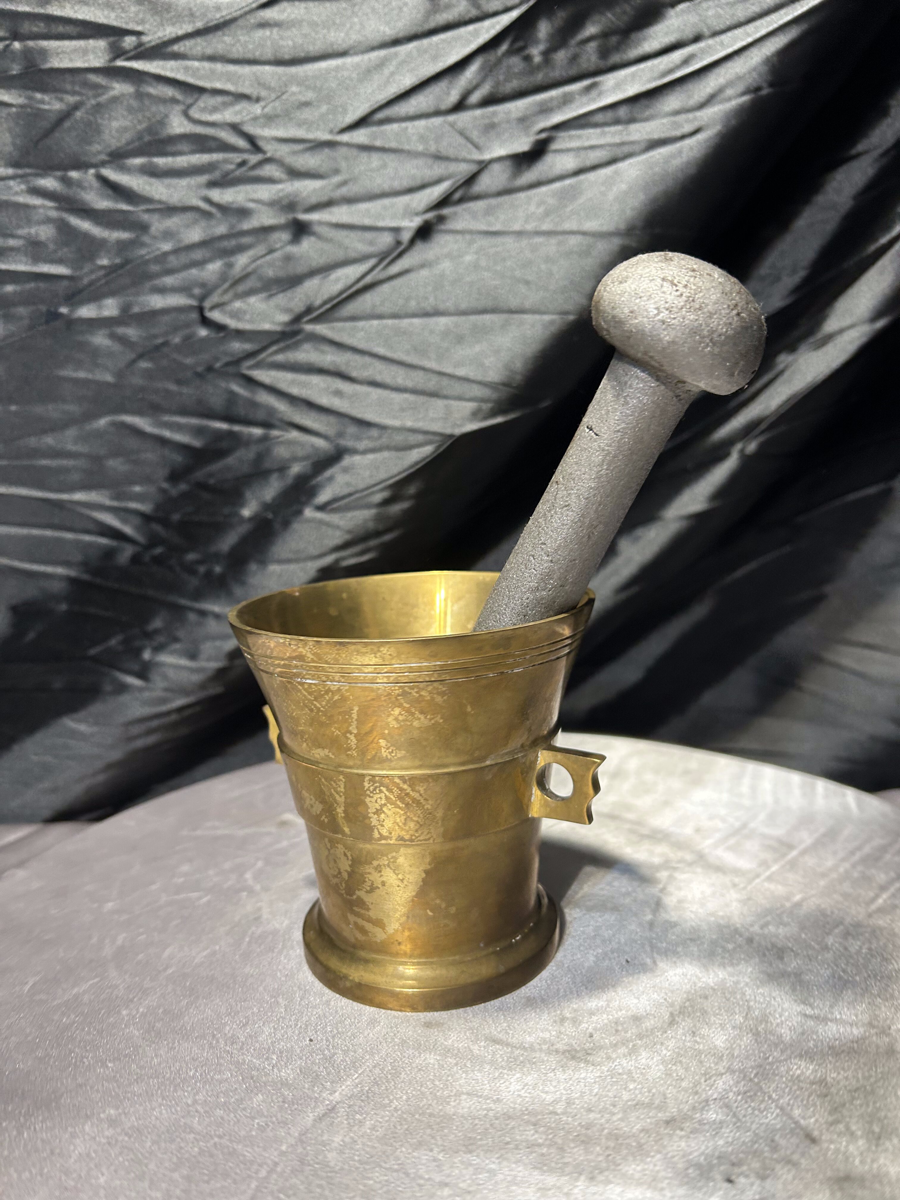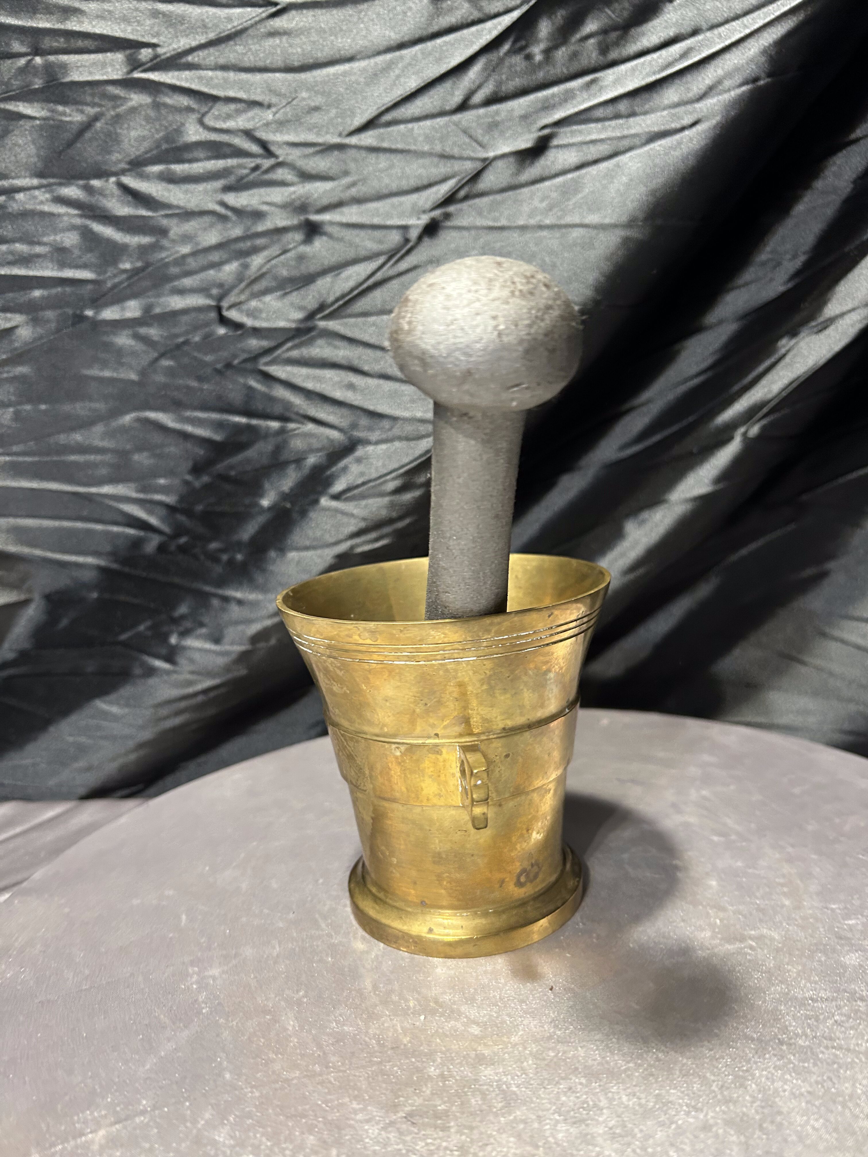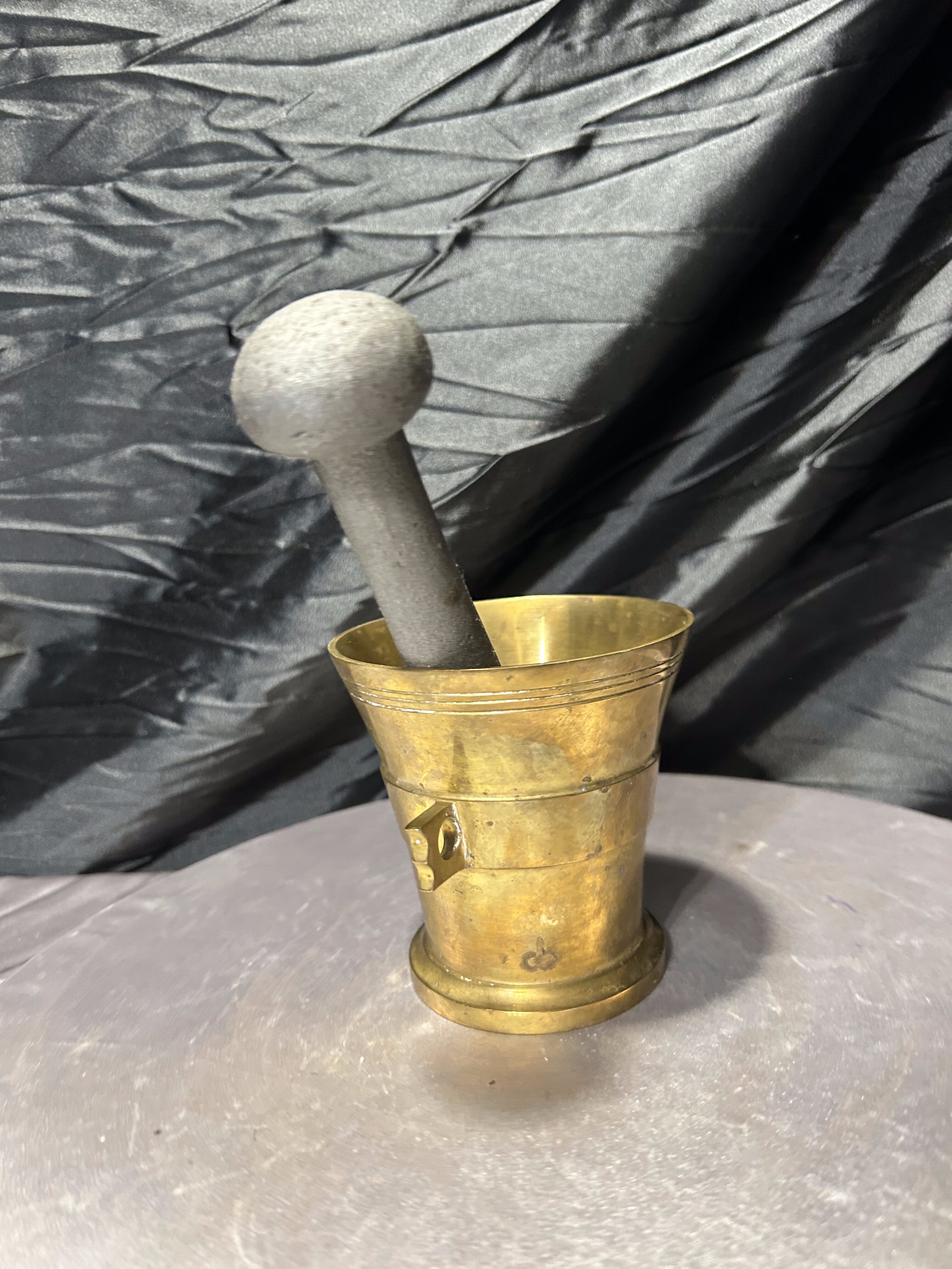 Moździerz mosiężny z 1851 roku – sygnowany – Antyk z tłuczkiem