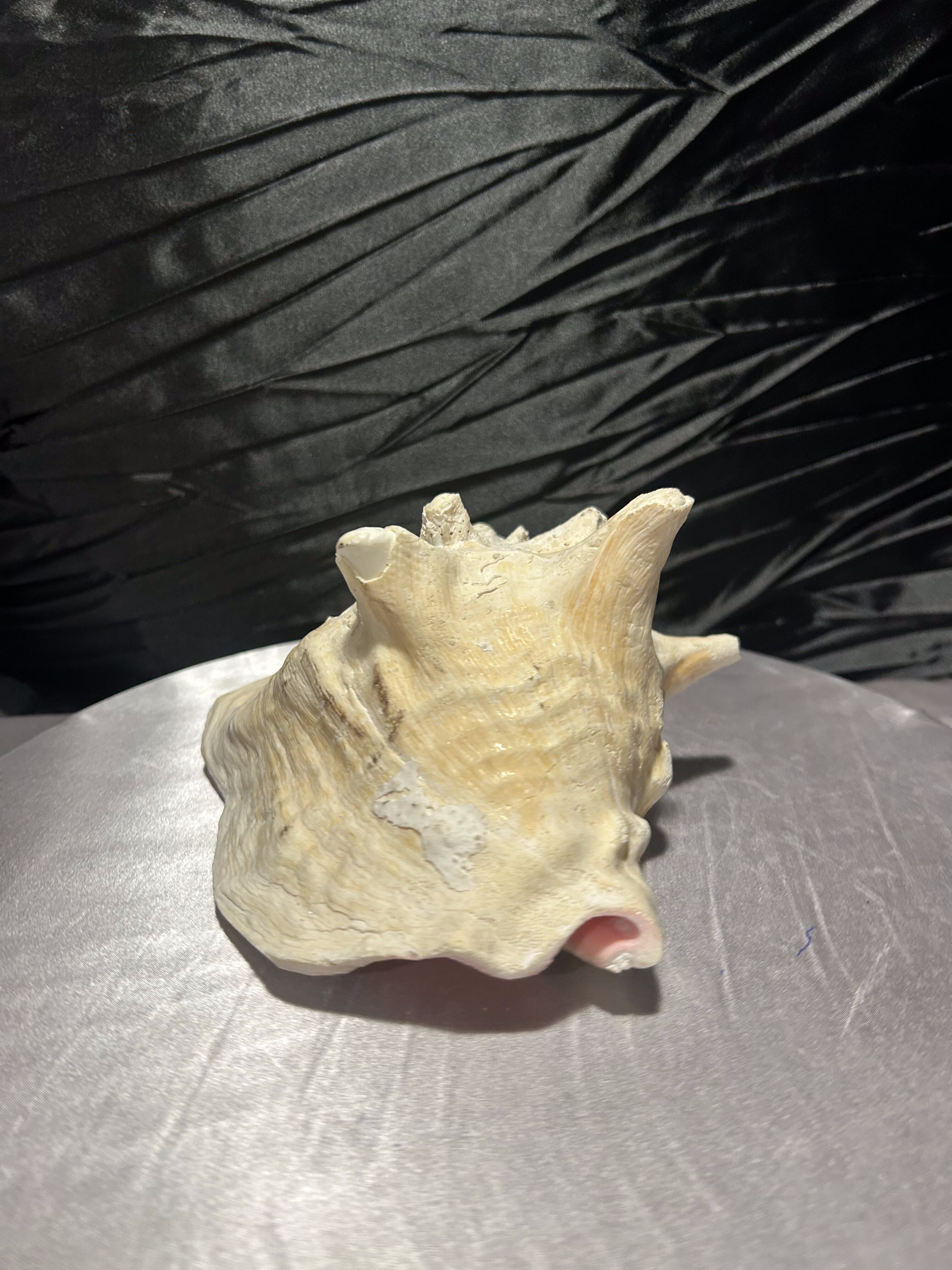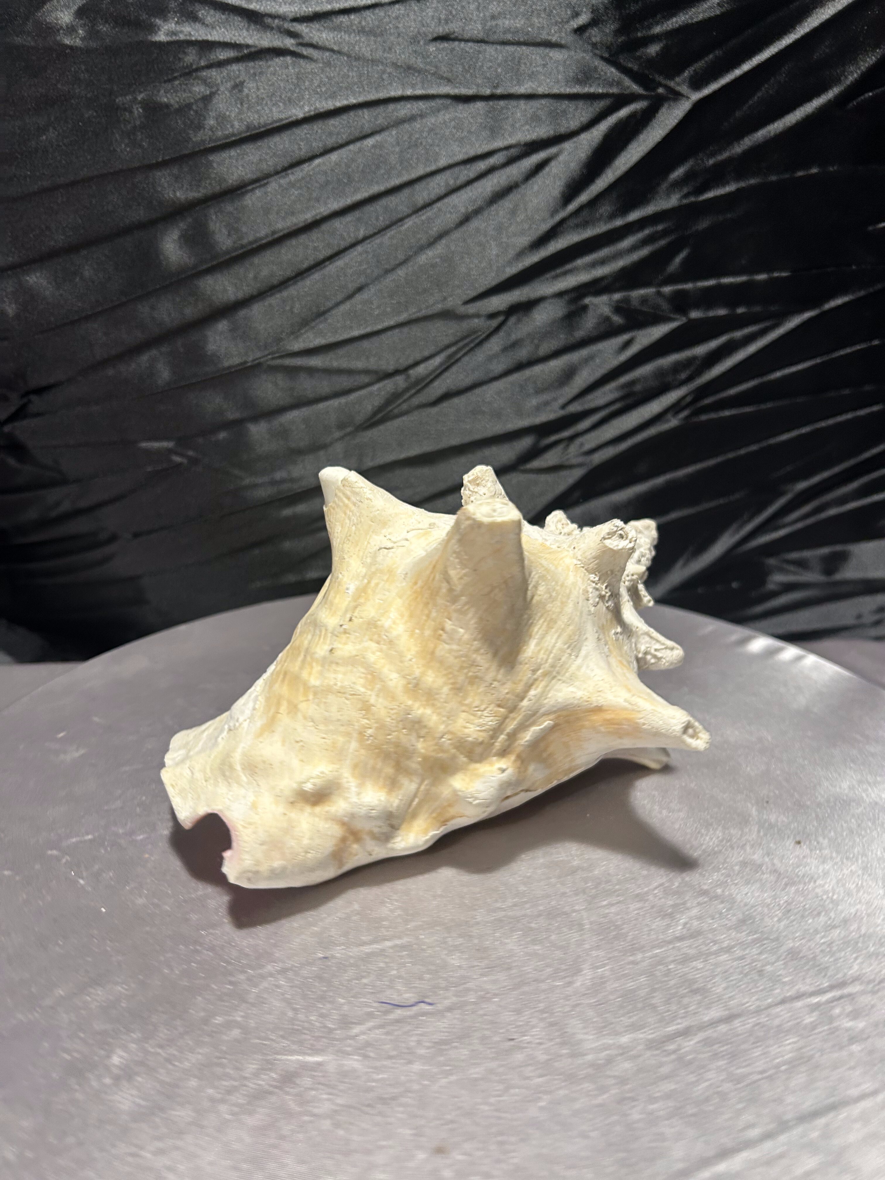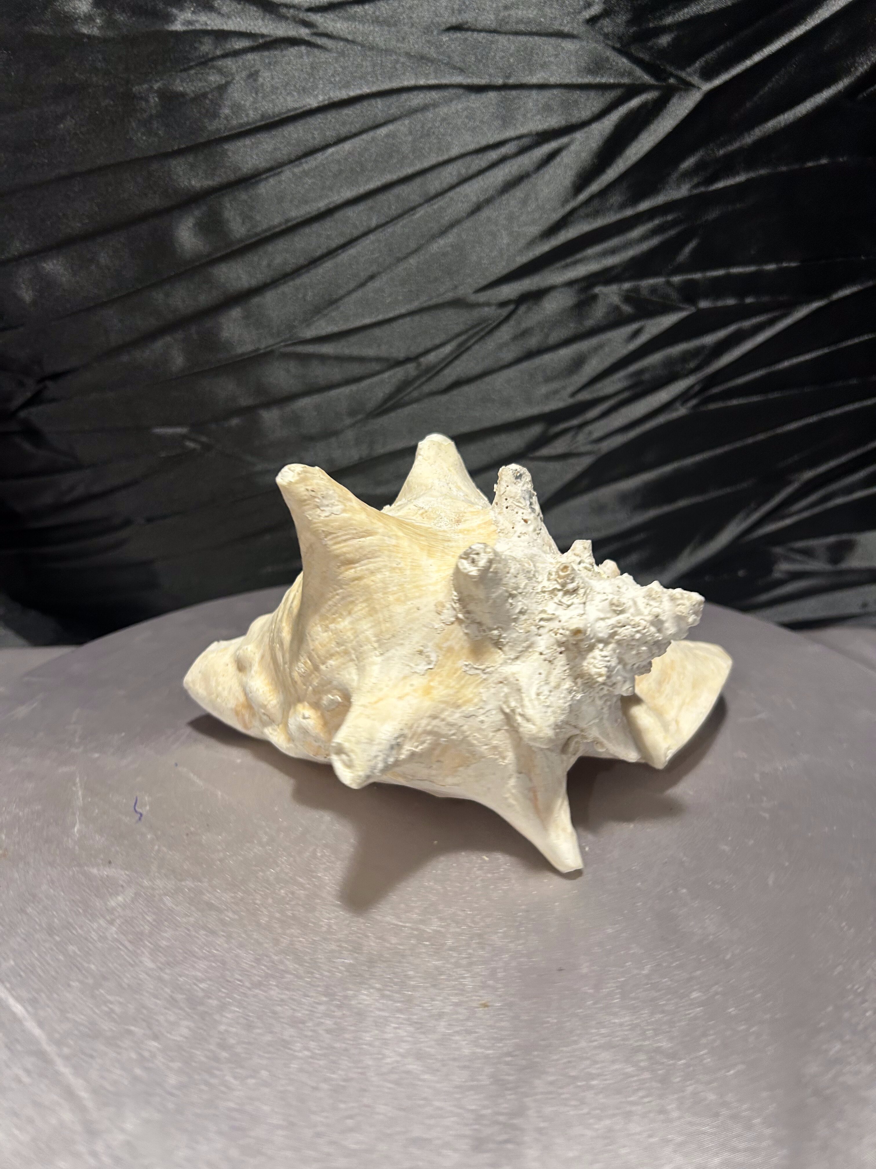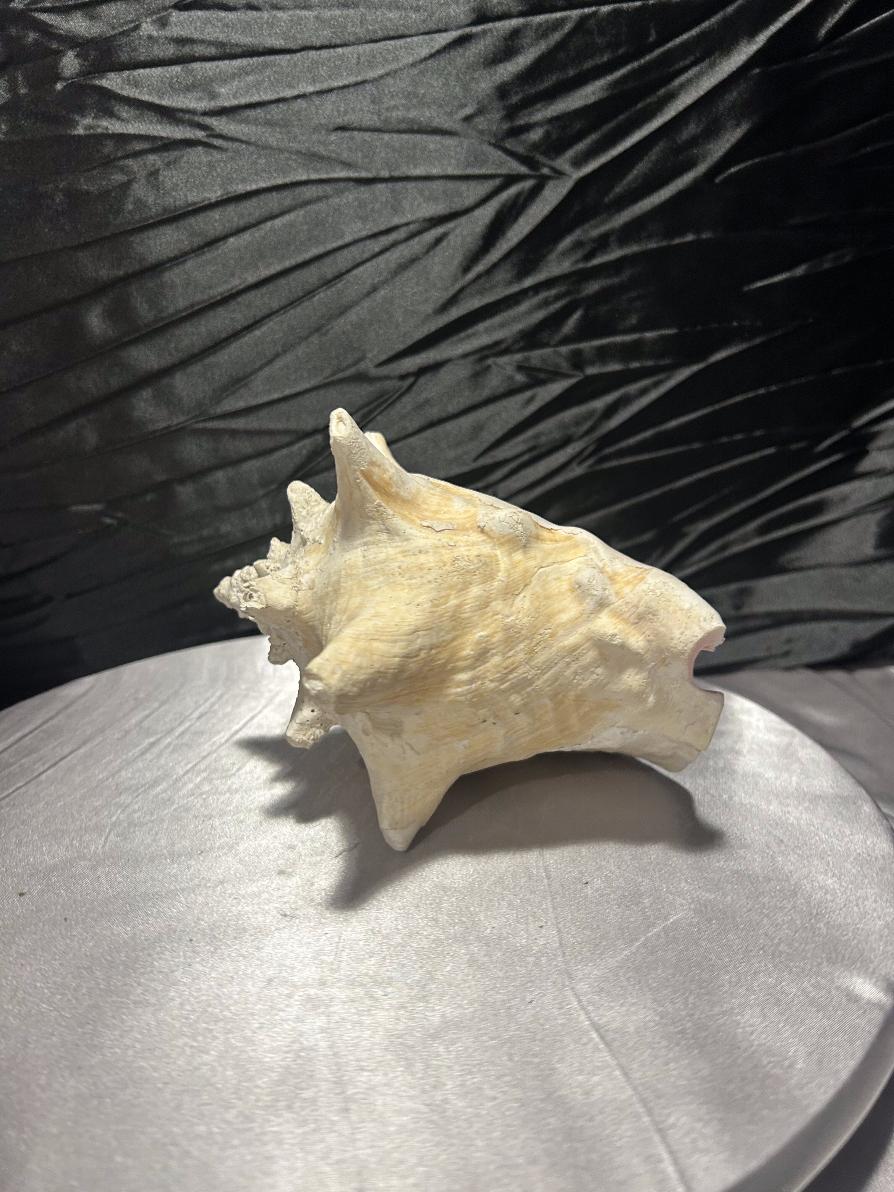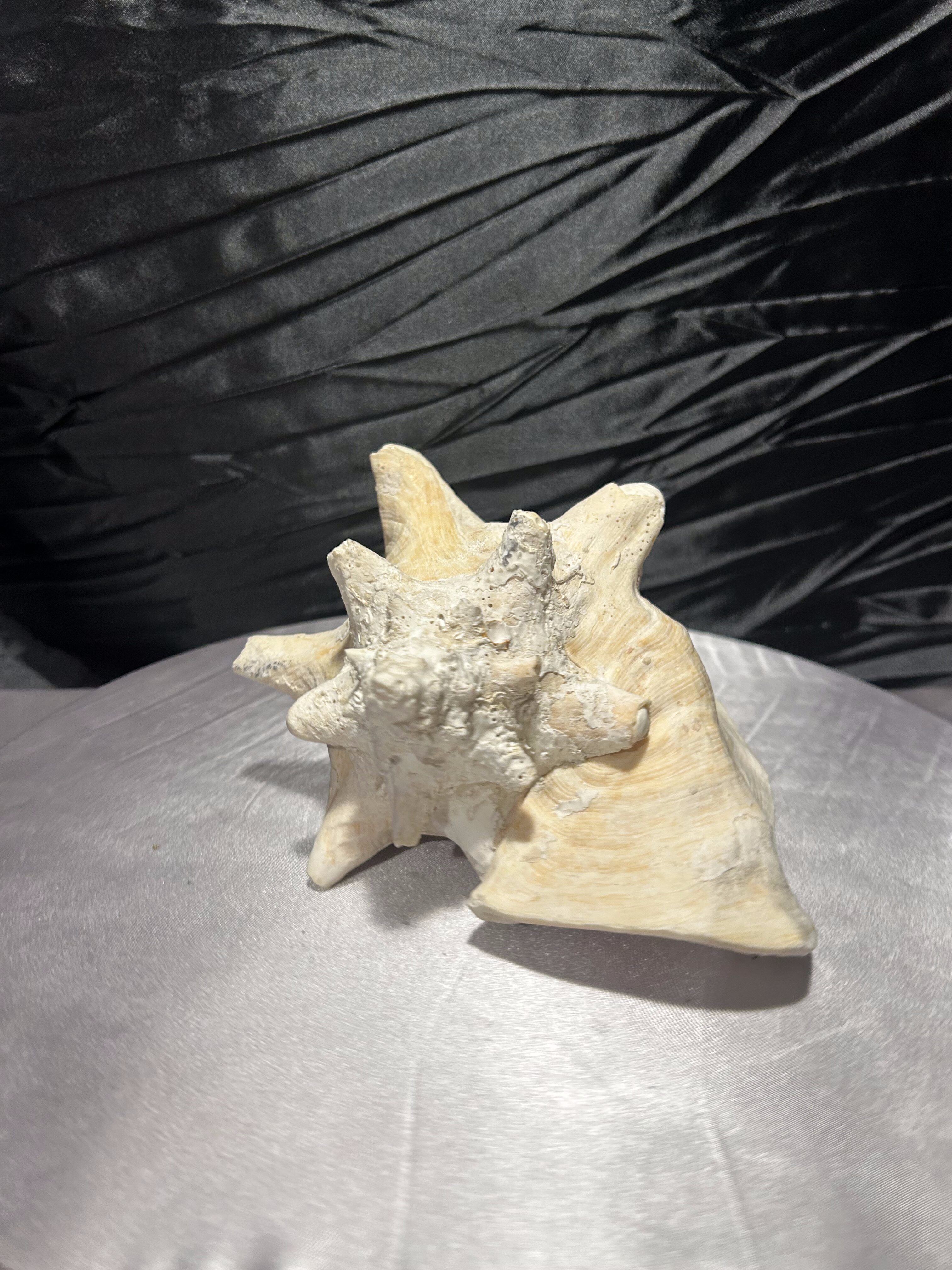 Wyjątkowa, naturalna muszla o imponującej formie i pięknie zachowanej strukturze. Jej wielowymiarowy kształt, liczne wypustki oraz subtelne przejścia kolorystyczne – od jasnych beżów po delikatne kremy – podkreślają jej autentyczne pochodzenie i unikatowość.