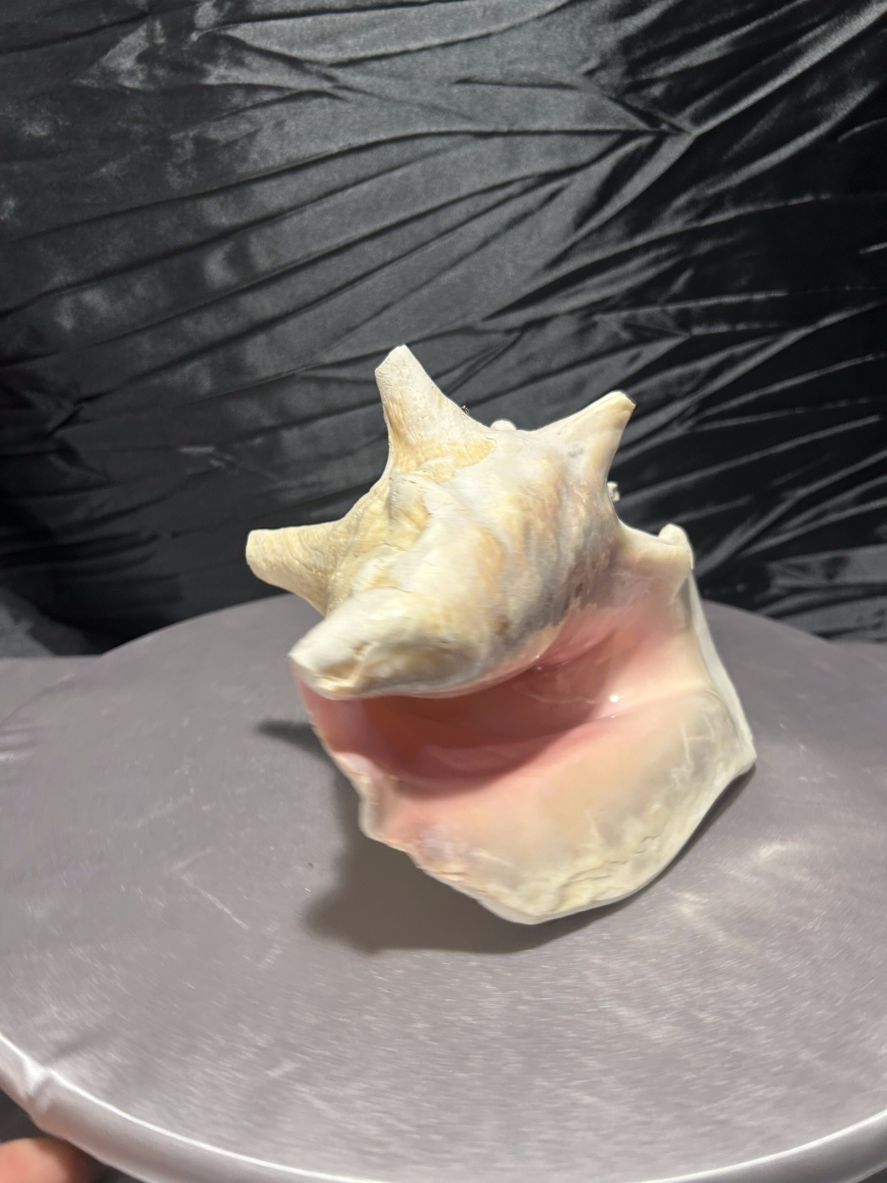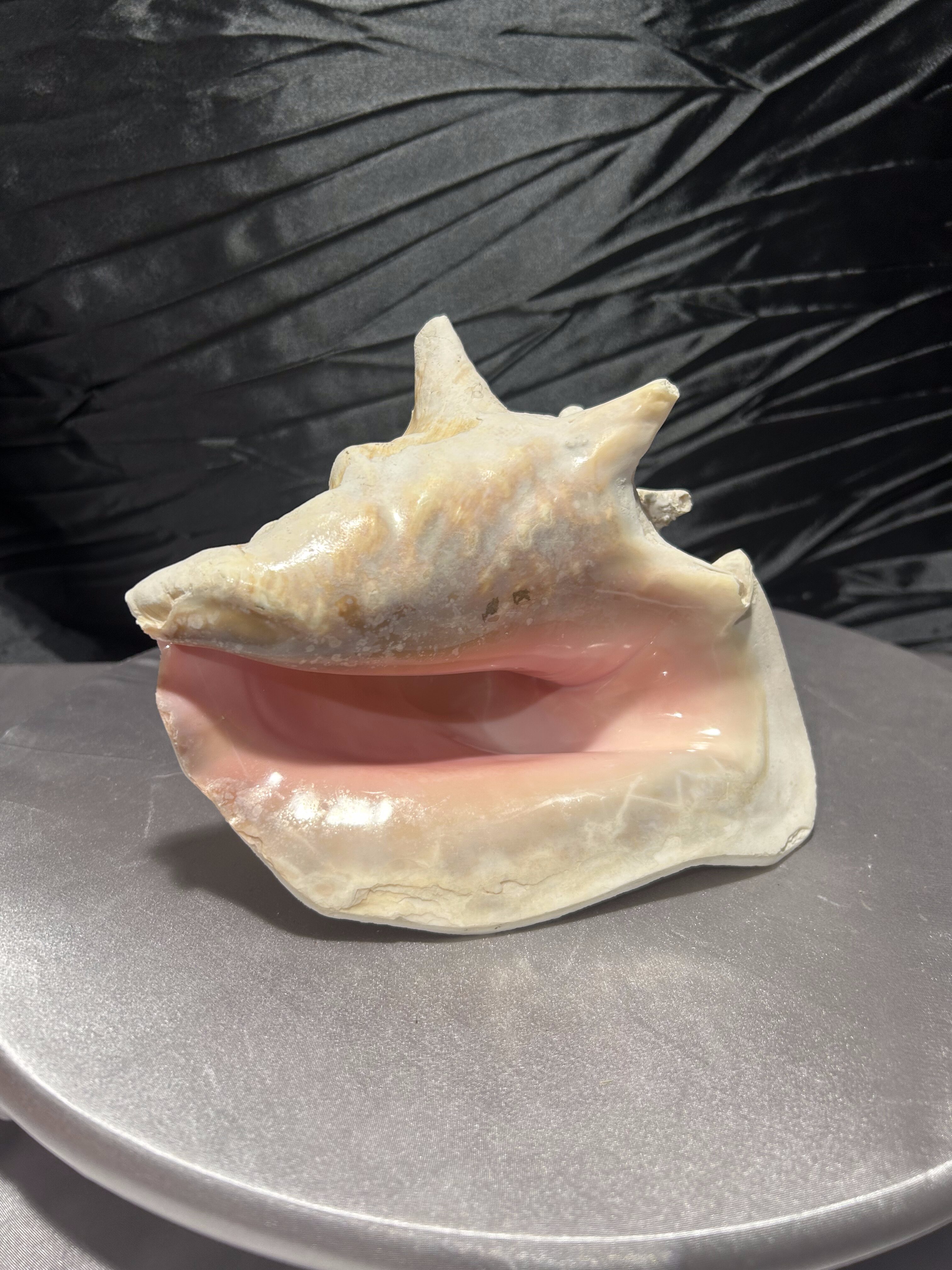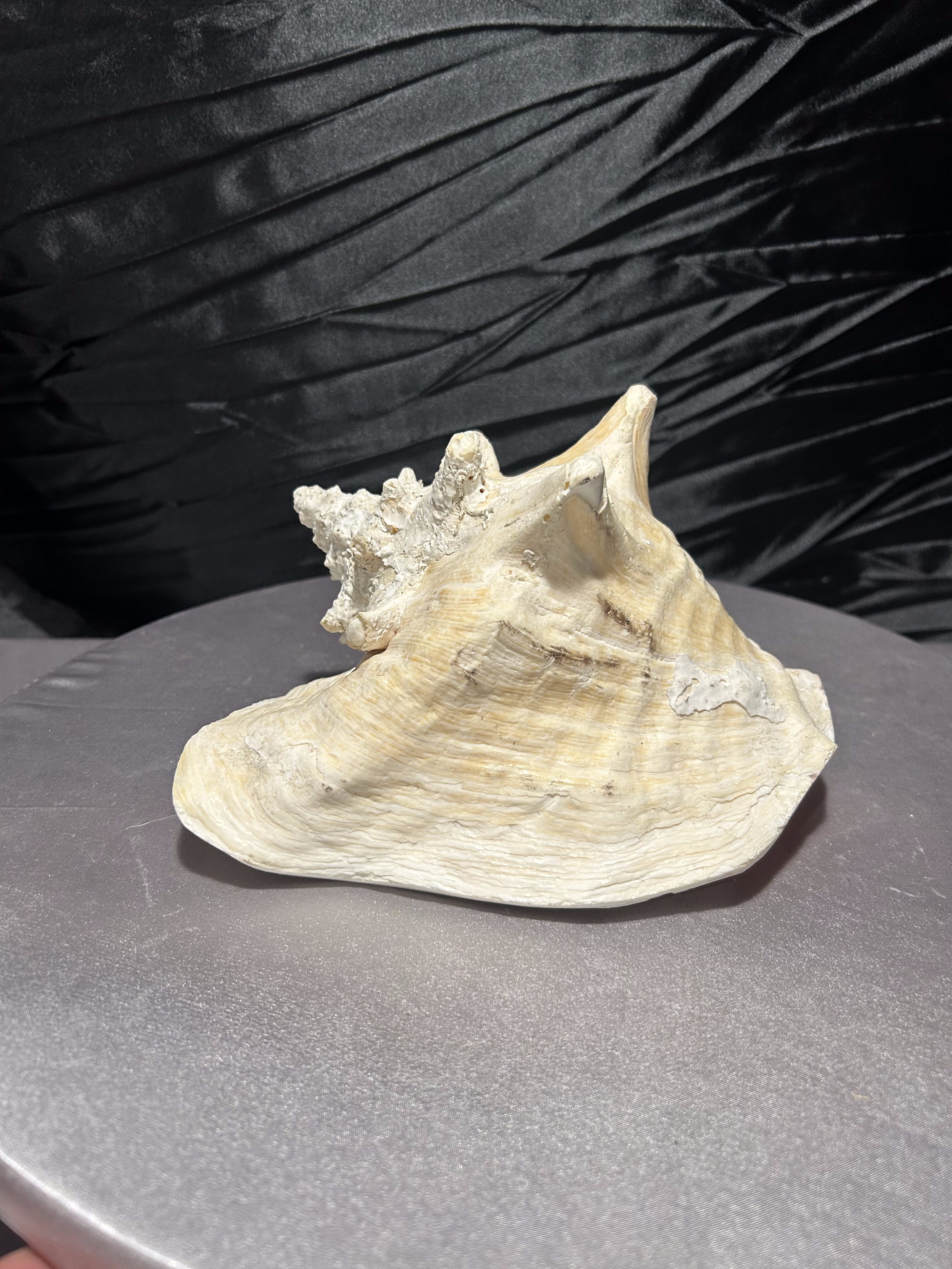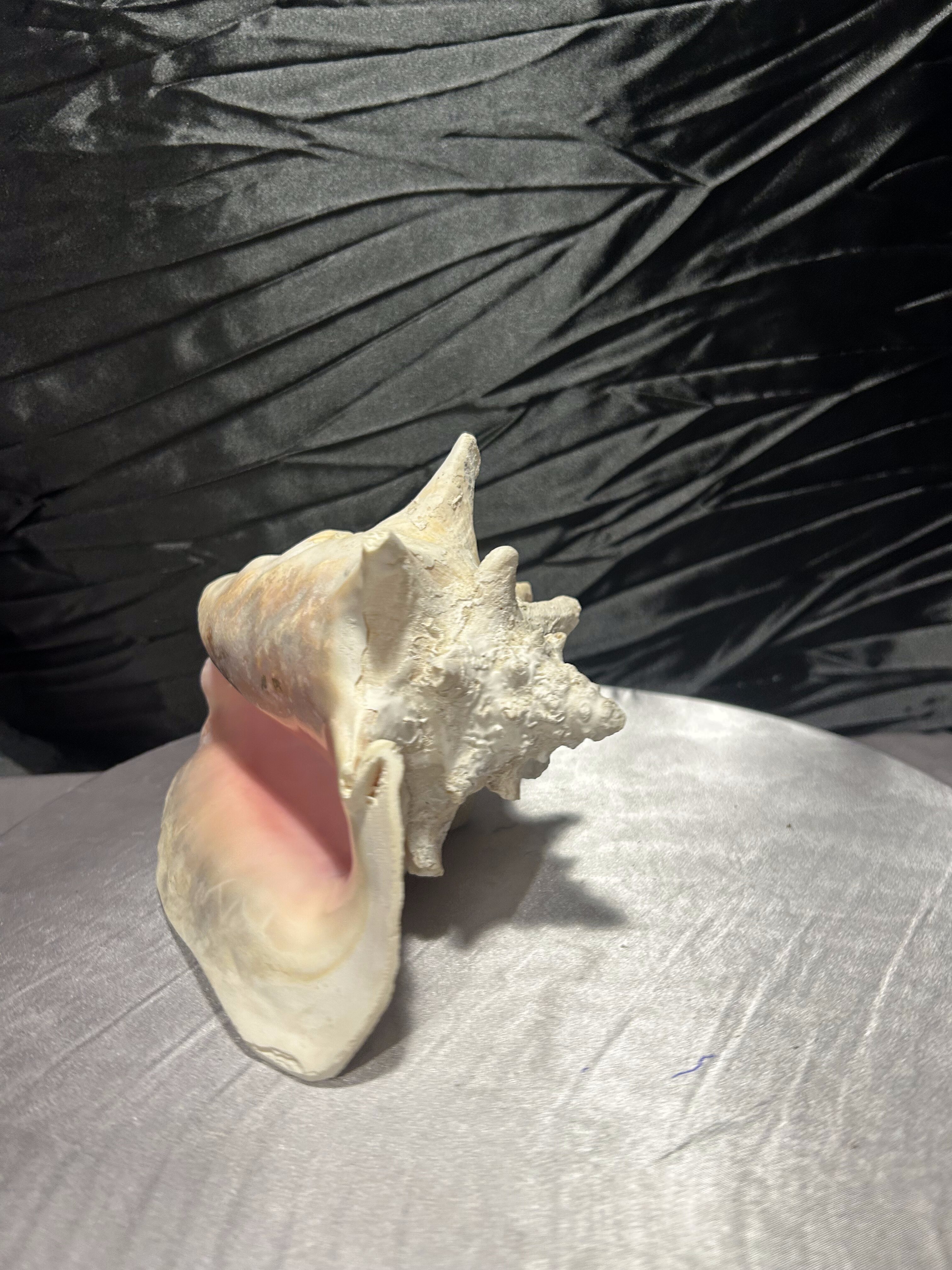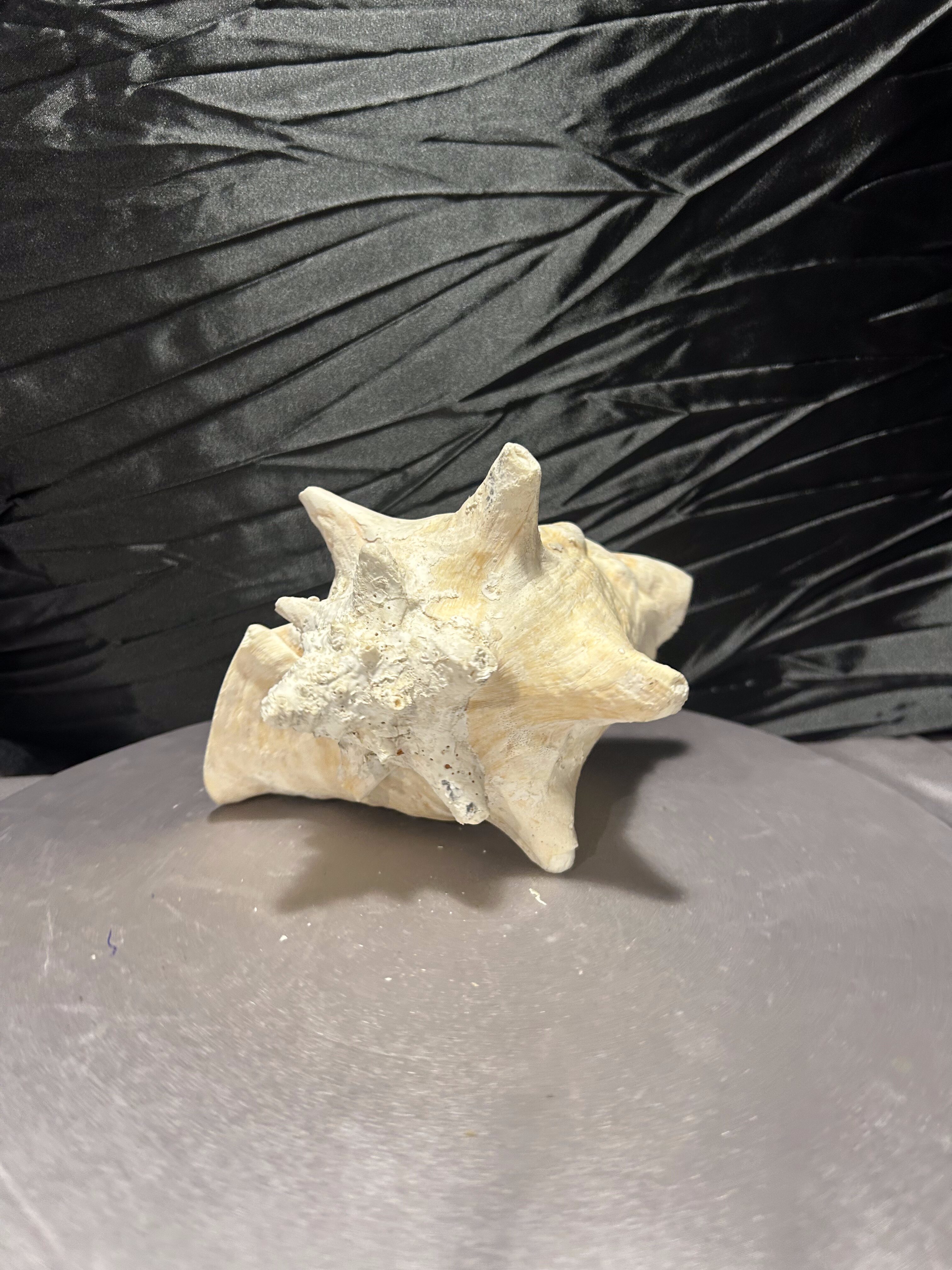 Wyjątkowa, naturalna muszla o imponującej formie i pięknie zachowanej strukturze. Jej wielowymiarowy kształt, liczne wypustki oraz subtelne przejścia kolorystyczne – od jasnych beżów po delikatne kremy – podkreślają jej autentyczne pochodzenie i unikatowość.
