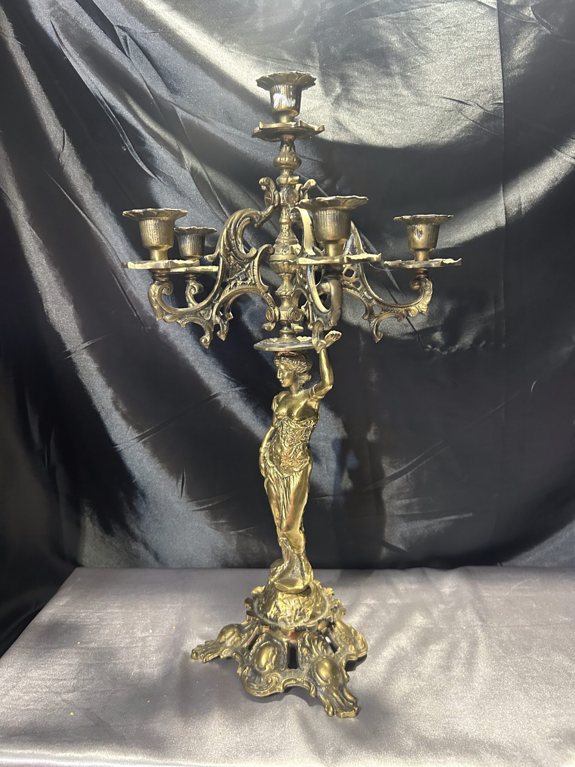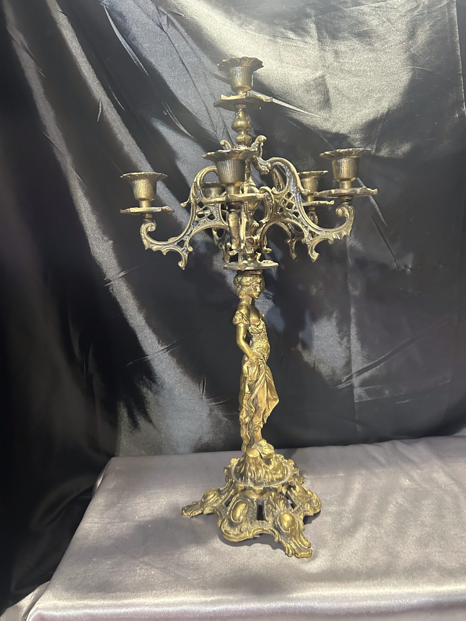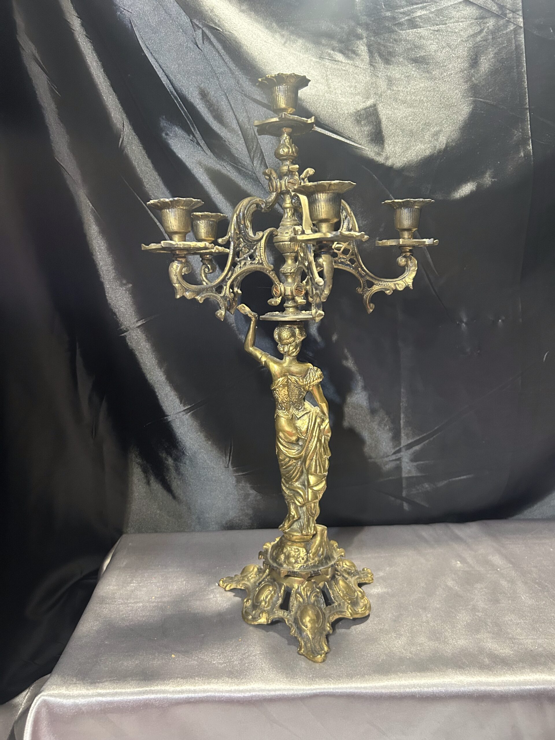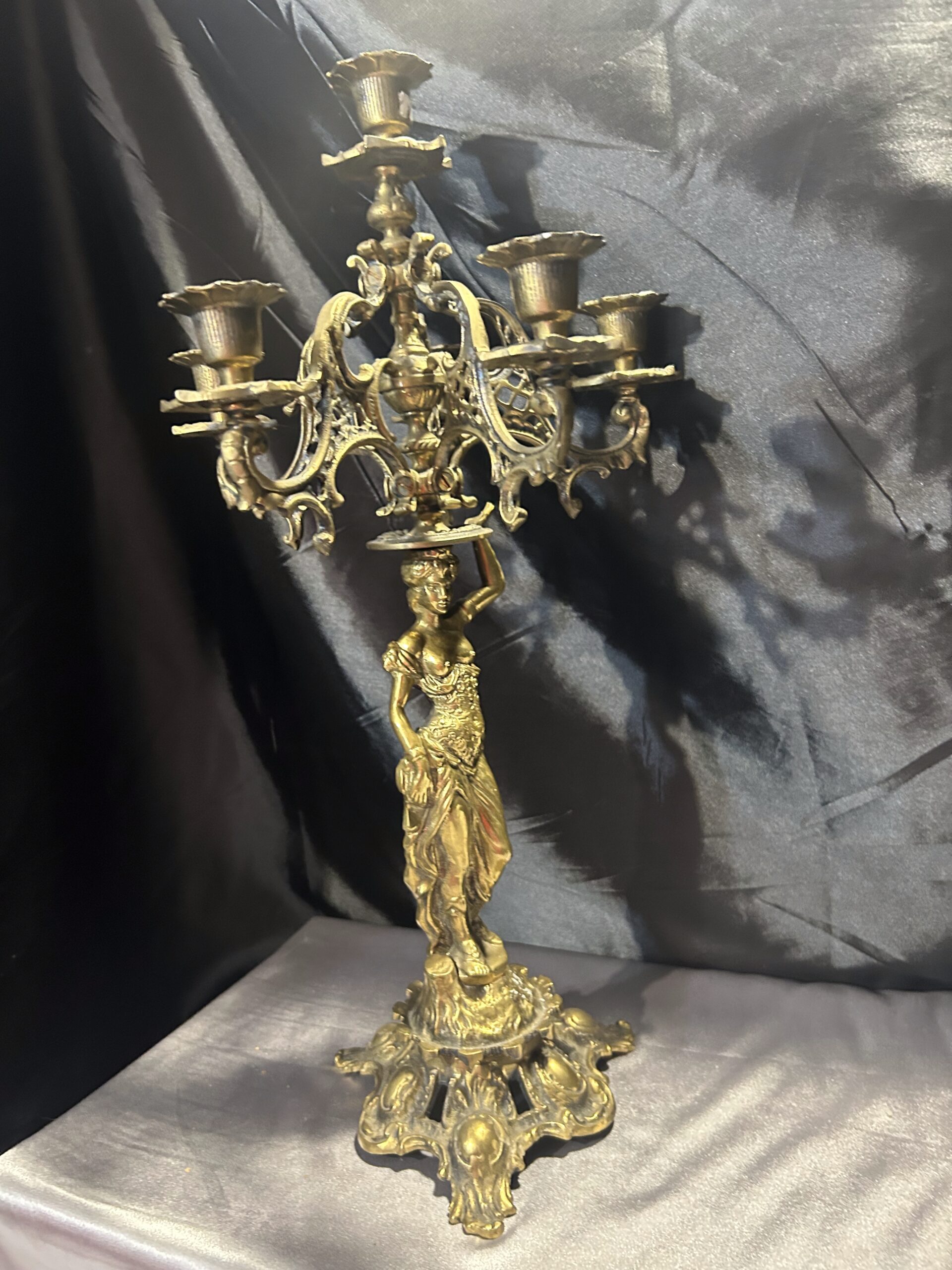 Oferujemy wyjątkowy świecznik wykonany z mosiądzu, którego podstawa to piękna figurka półnagiej kobiety trzymającej sześć ramion na świece. Starannie zdobiona konstrukcja oraz misternie wykonane detale nadają mu niezwykle elegancki i artystyczny charakter. To prawdziwy antyk o unikalnym uroku, idealny do klasycznych i stylowych wnętrz.