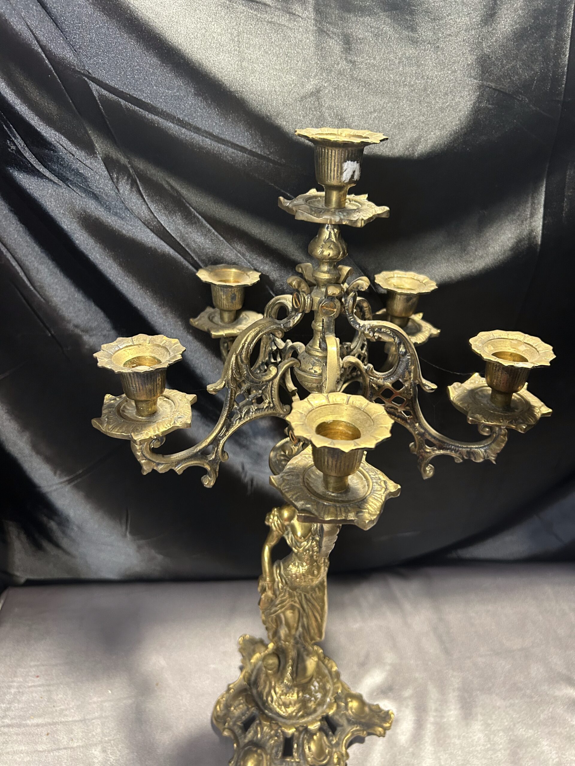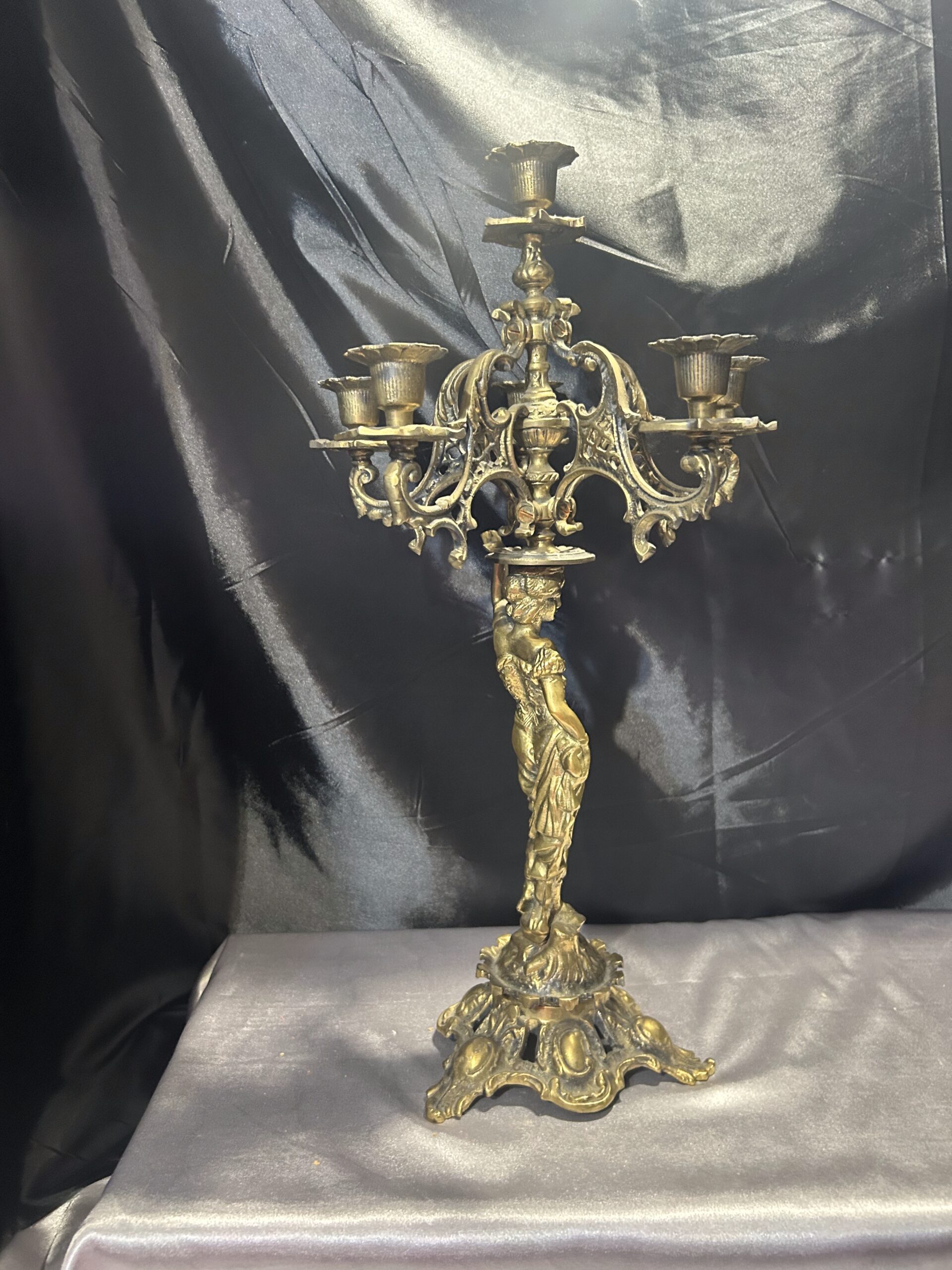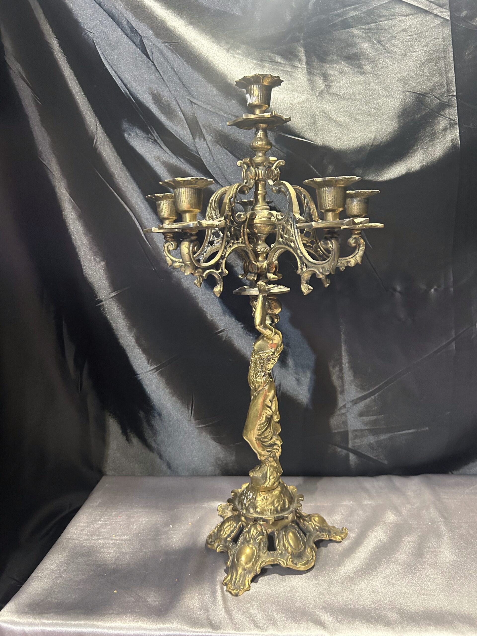 Oferujemy wyjątkowy świecznik wykonany z mosiądzu, którego podstawa to piękna figurka półnagiej kobiety trzymającej sześć ramion na świece. Starannie zdobiona konstrukcja oraz misternie wykonane detale nadają mu niezwykle elegancki i artystyczny charakter. To prawdziwy antyk o unikalnym uroku, idealny do klasycznych i stylowych wnętrz.