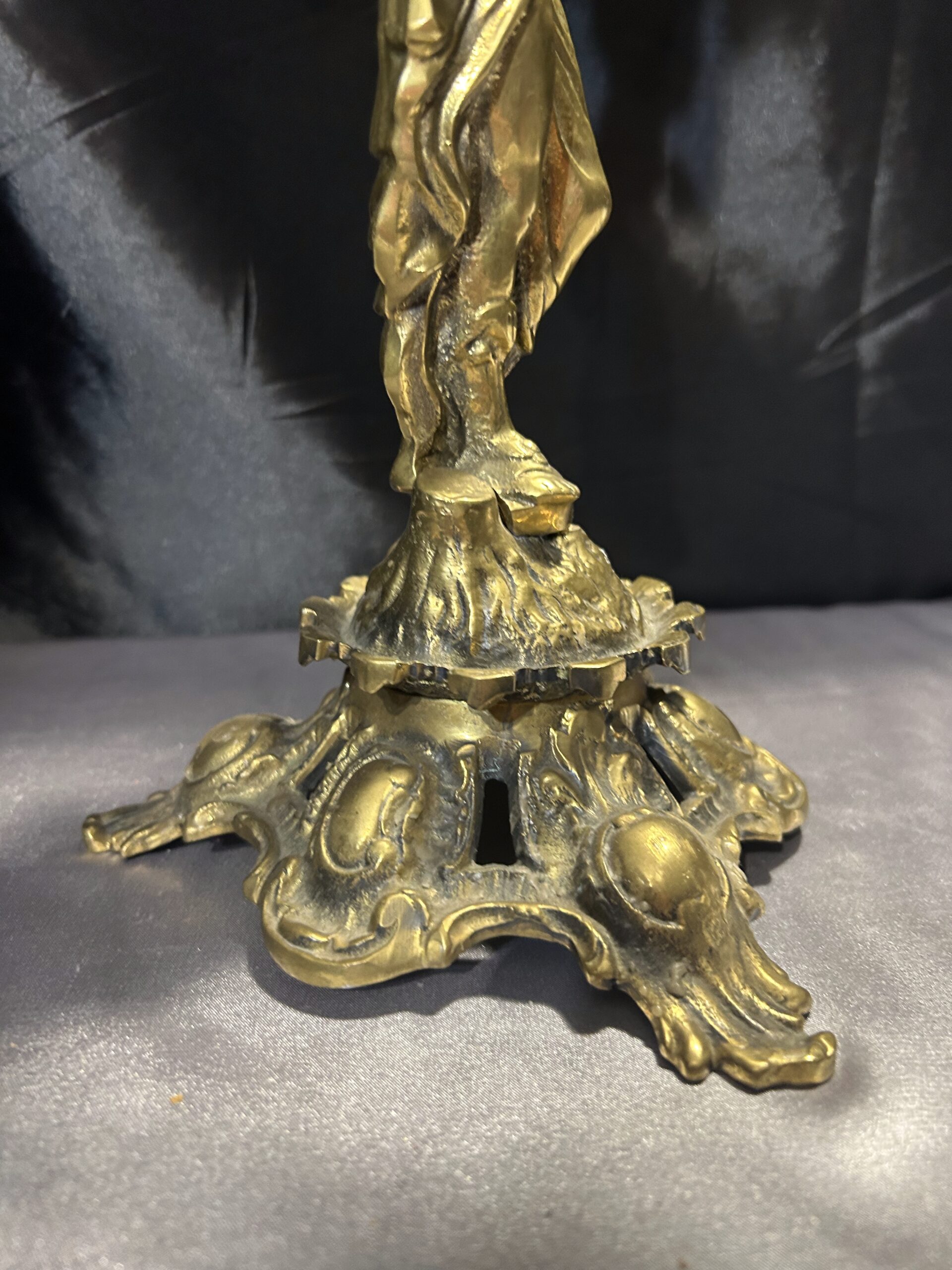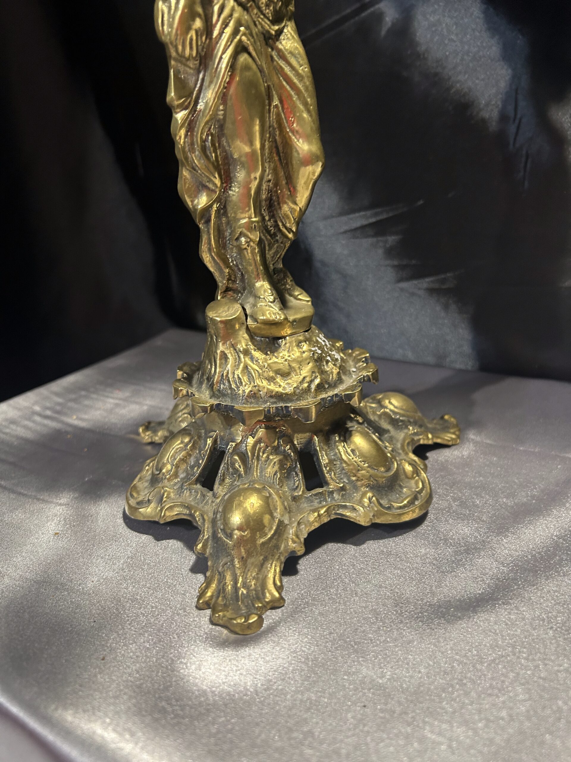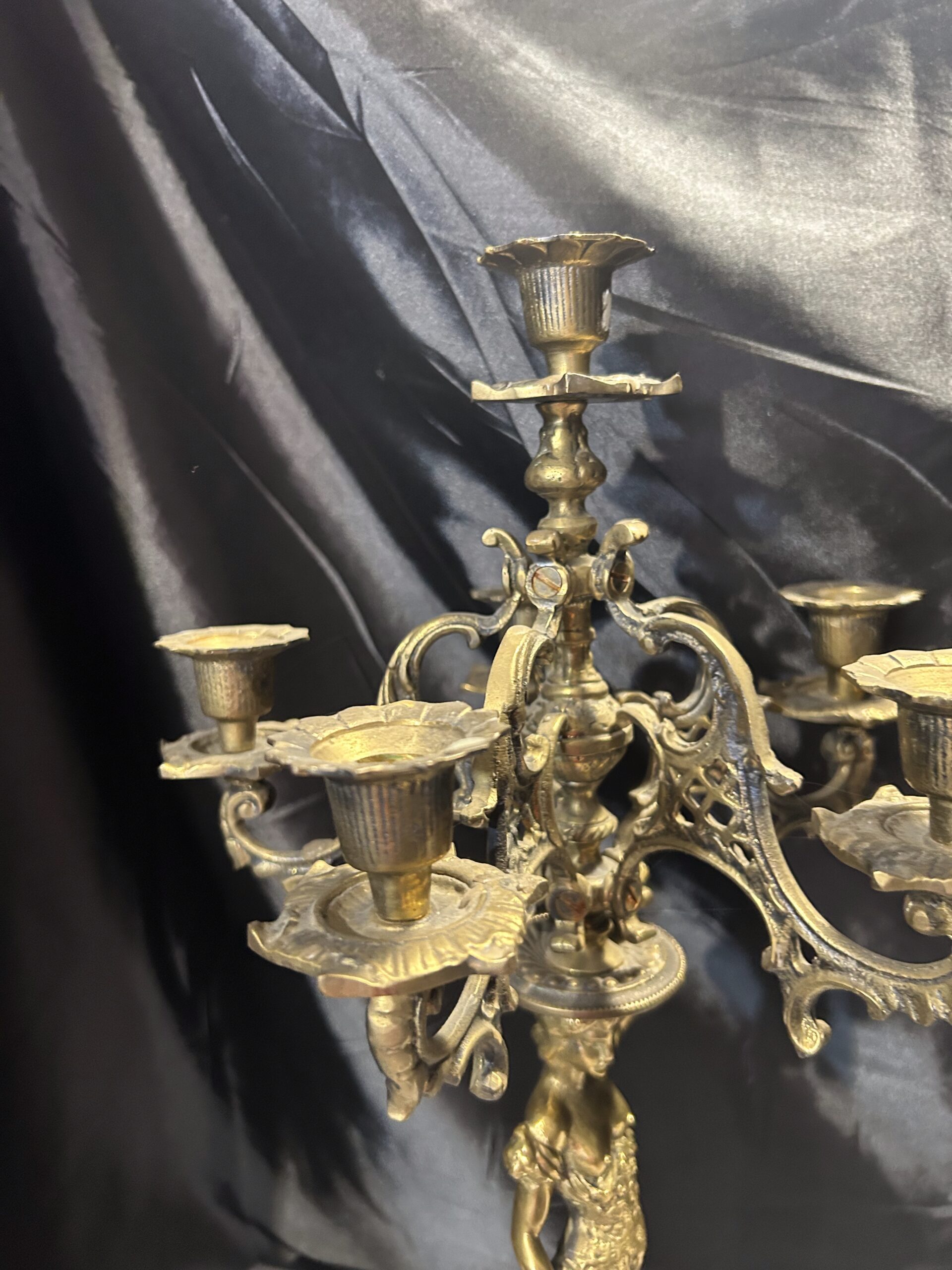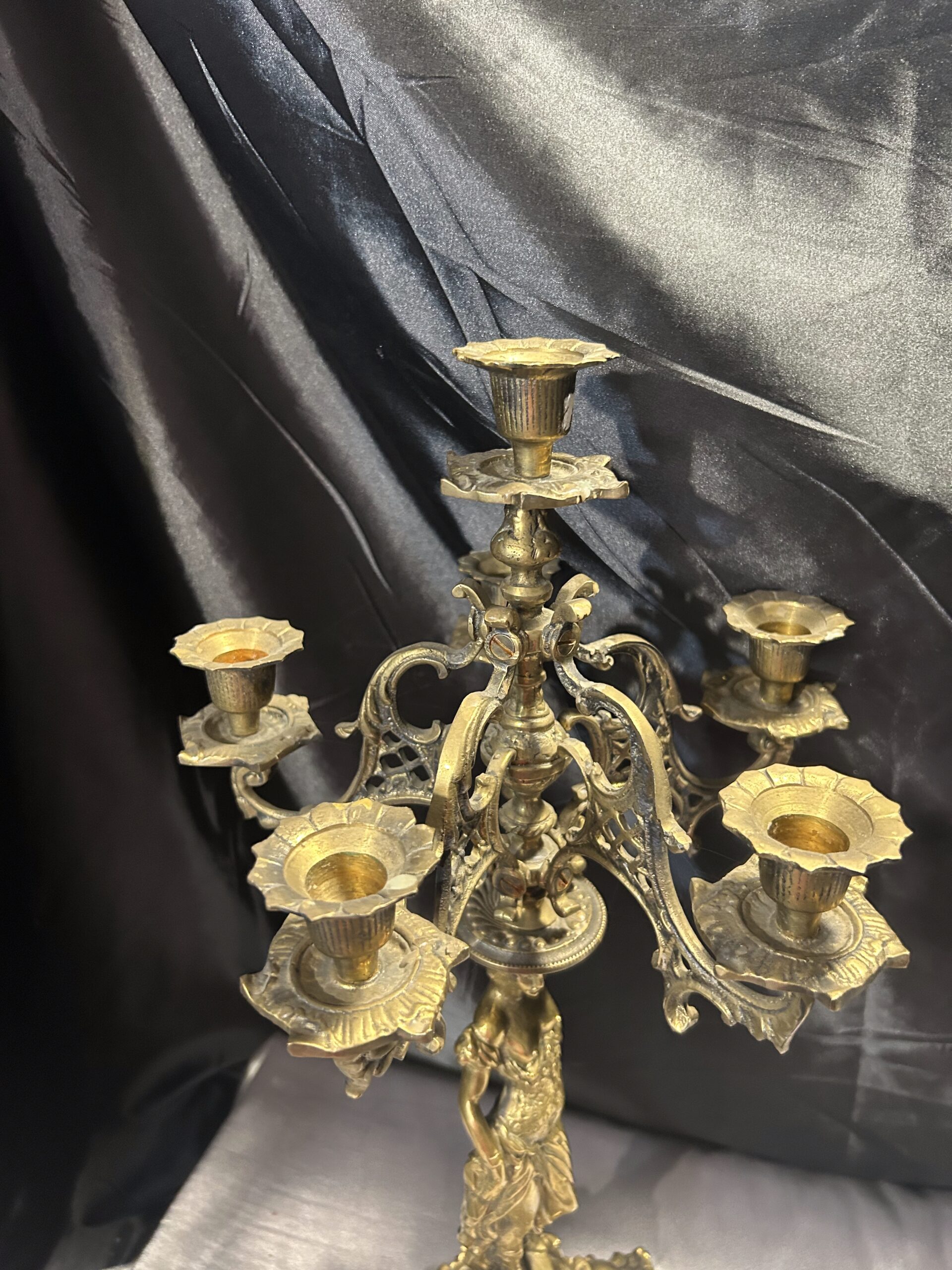 Oferujemy wyjątkowy świecznik wykonany z mosiądzu, którego podstawa to piękna figurka półnagiej kobiety trzymającej sześć ramion na świece. Starannie zdobiona konstrukcja oraz misternie wykonane detale nadają mu niezwykle elegancki i artystyczny charakter. To prawdziwy antyk o unikalnym uroku, idealny do klasycznych i stylowych wnętrz.
