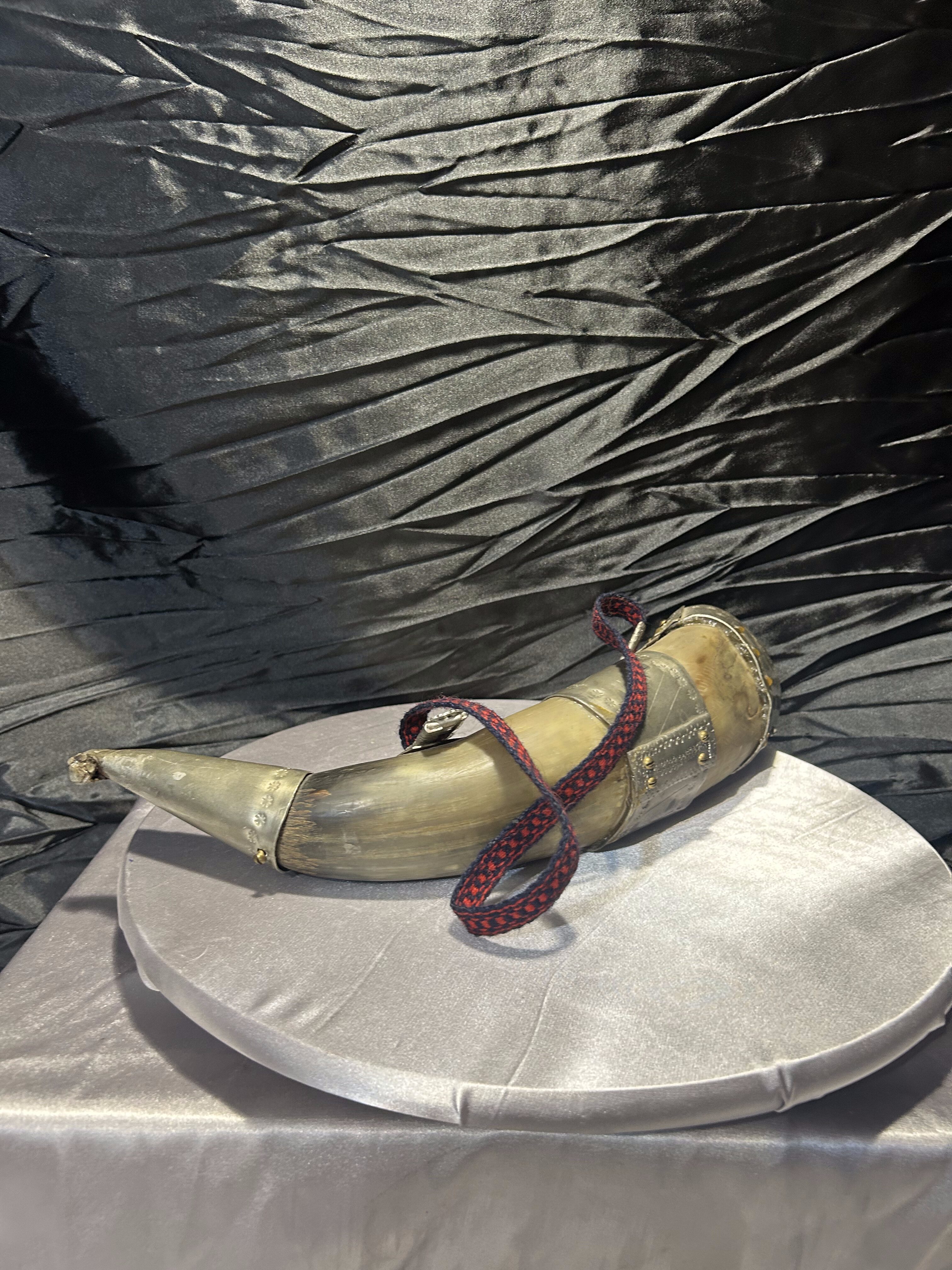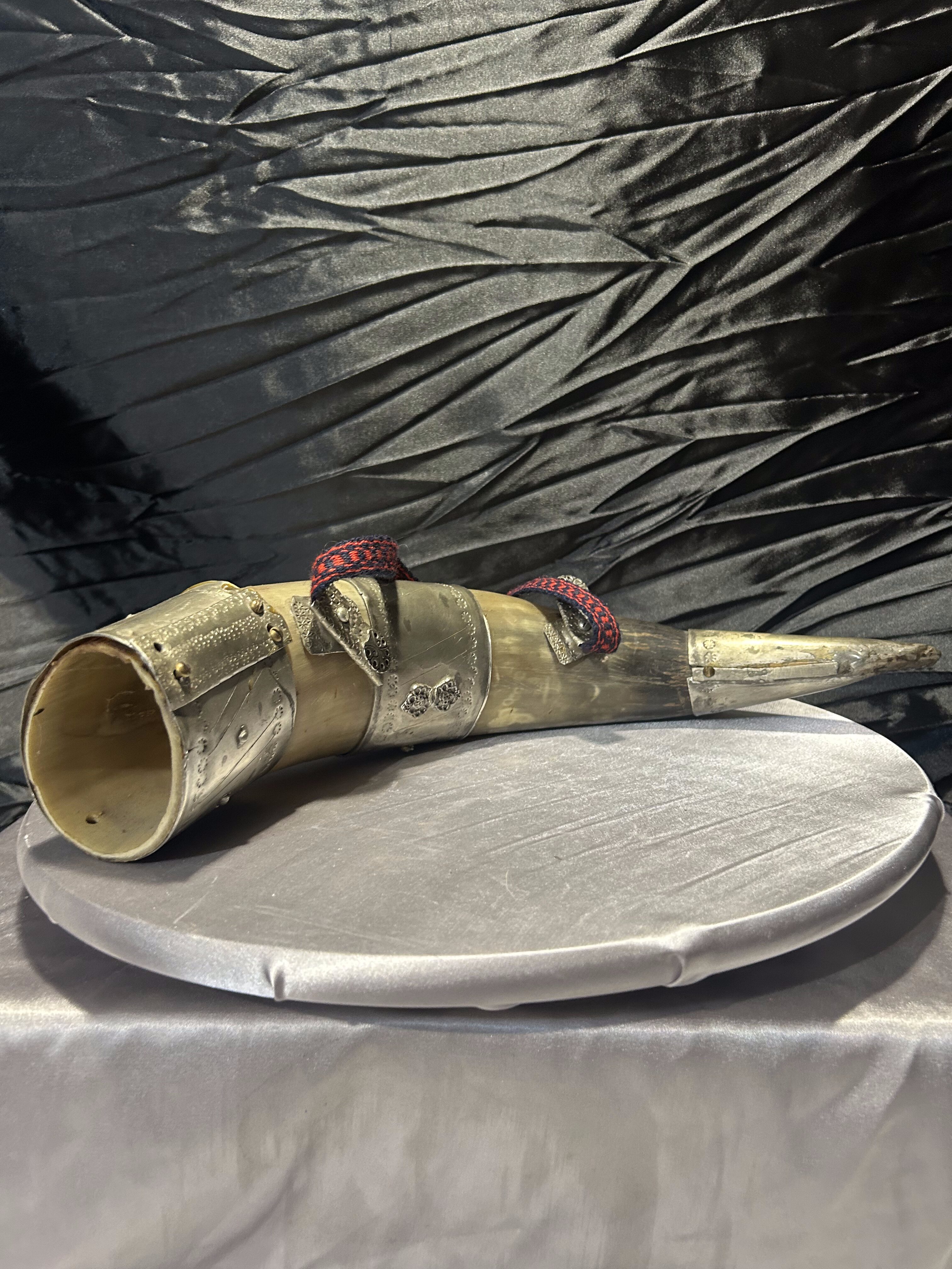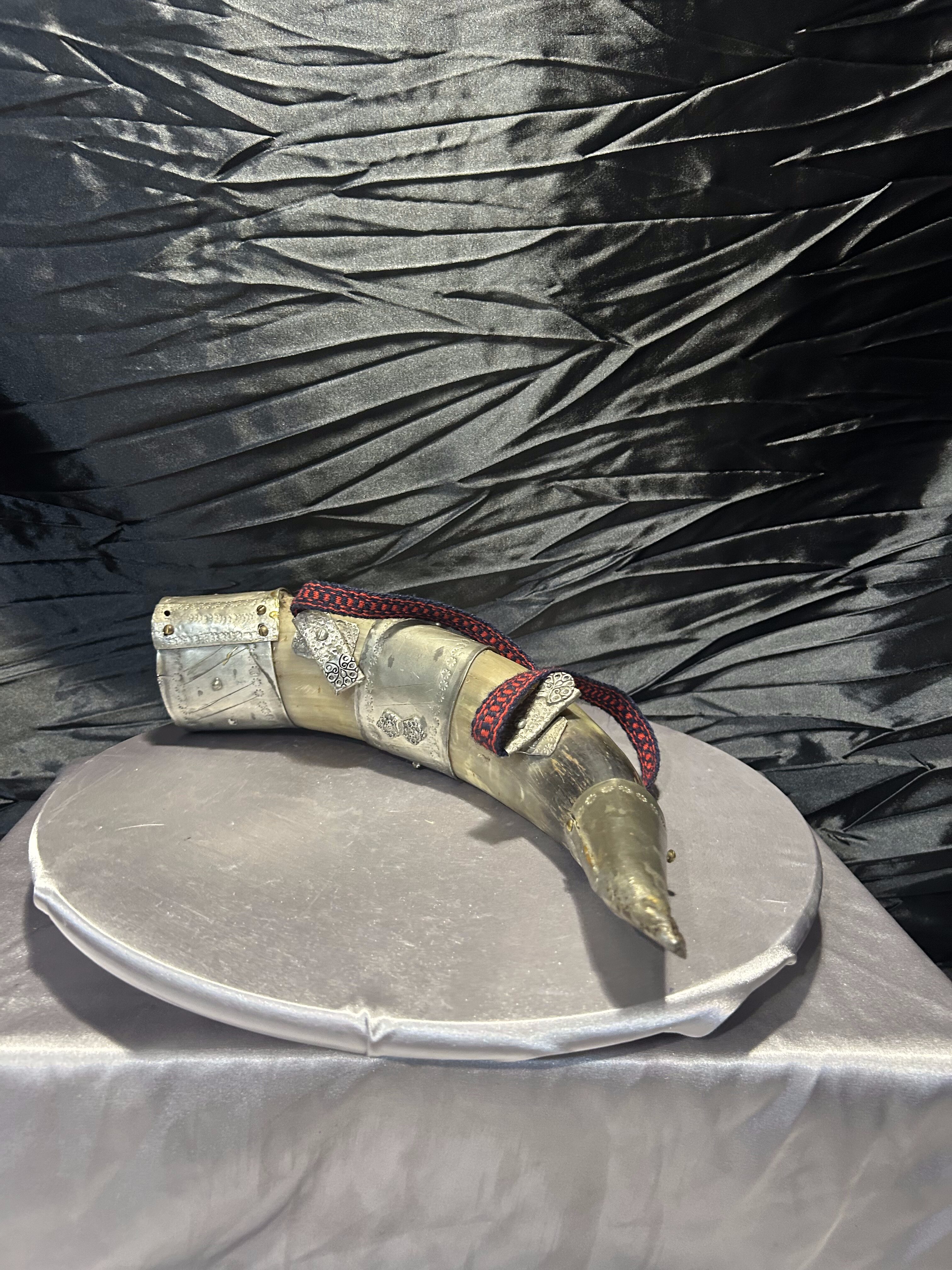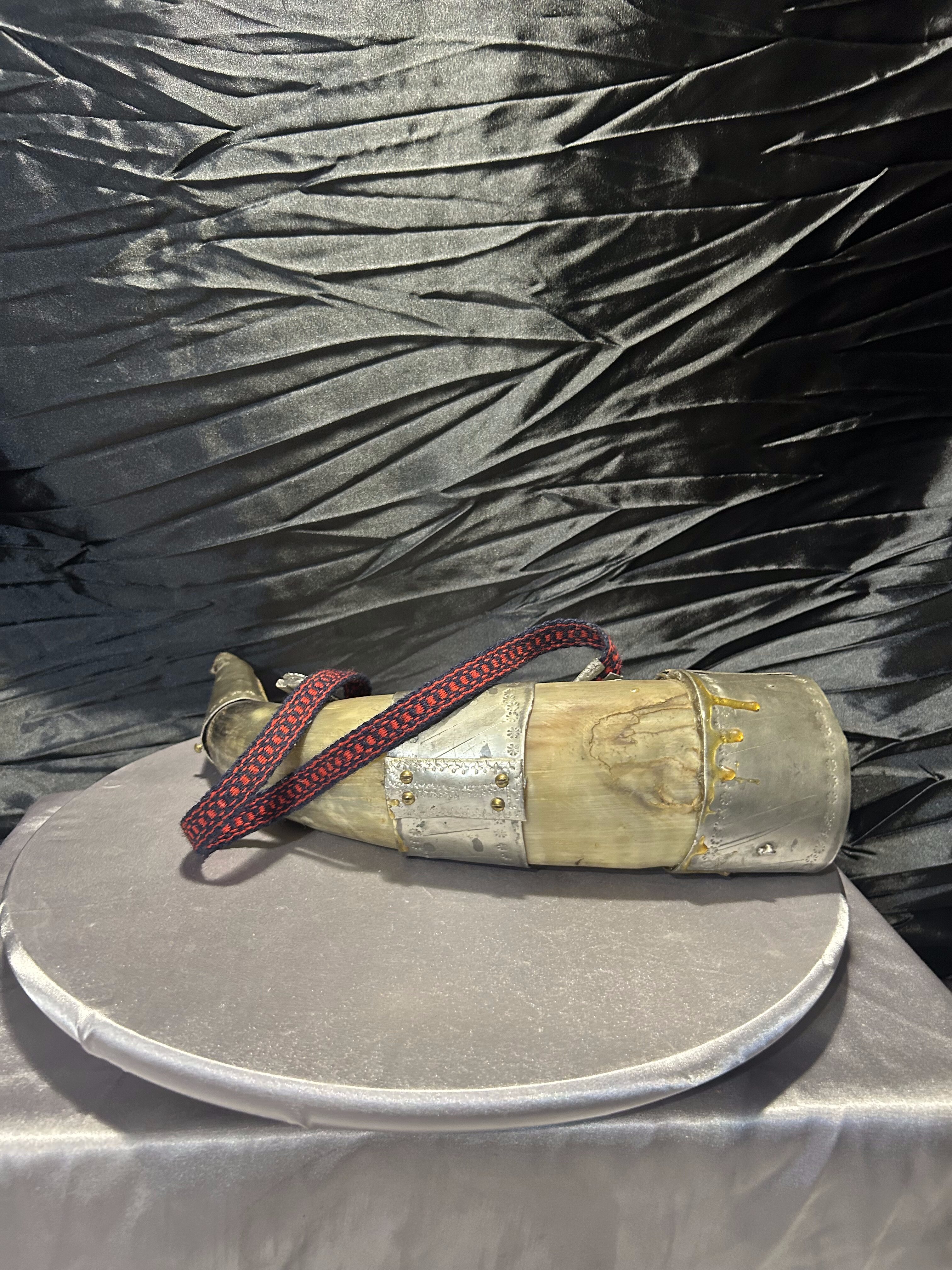 Bardzo duży, ręcznie zdobiony róg do zawieszenia, pochodzący z Norwegii. Wykonany z naturalnego rogu, ozdobiony metalowymi aplikacjami i dekoracyjnym pasem materiałowym, dzięki czemu zyskuje niepowtarzalny charakter. To wyjątkowa ozdoba, która świetnie sprawdzi się we wnętrzach rustykalnych, historycznych czy inspirowanych klimatem nordyckim. Idealny jako element kolekcji lub oryginalny akcent dekoracyjny na ścianę.