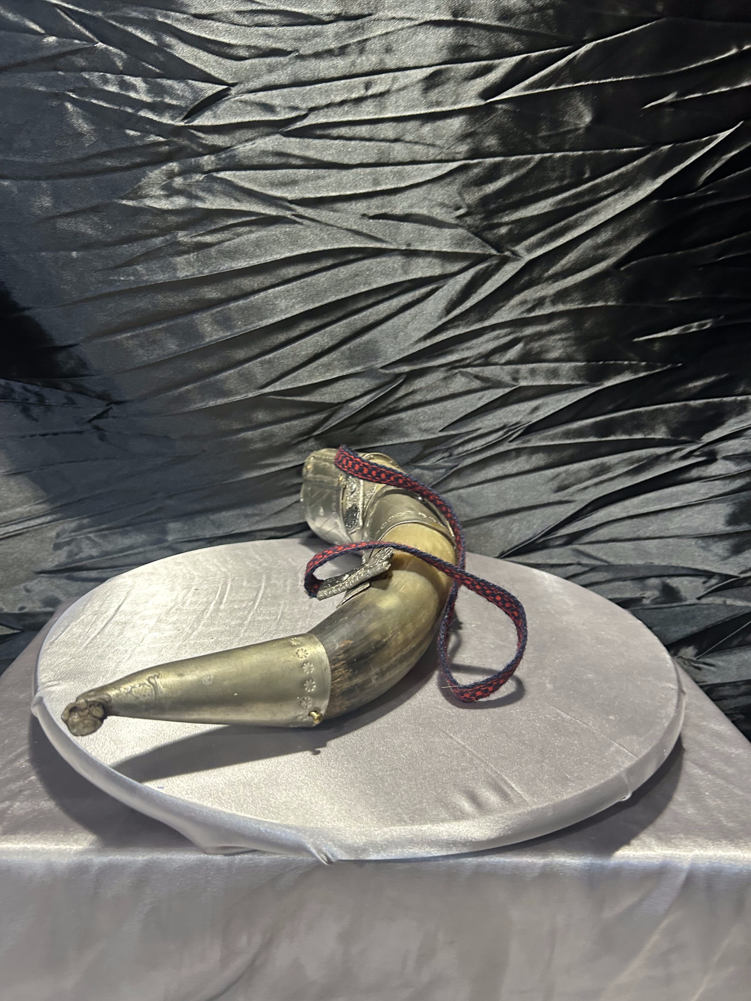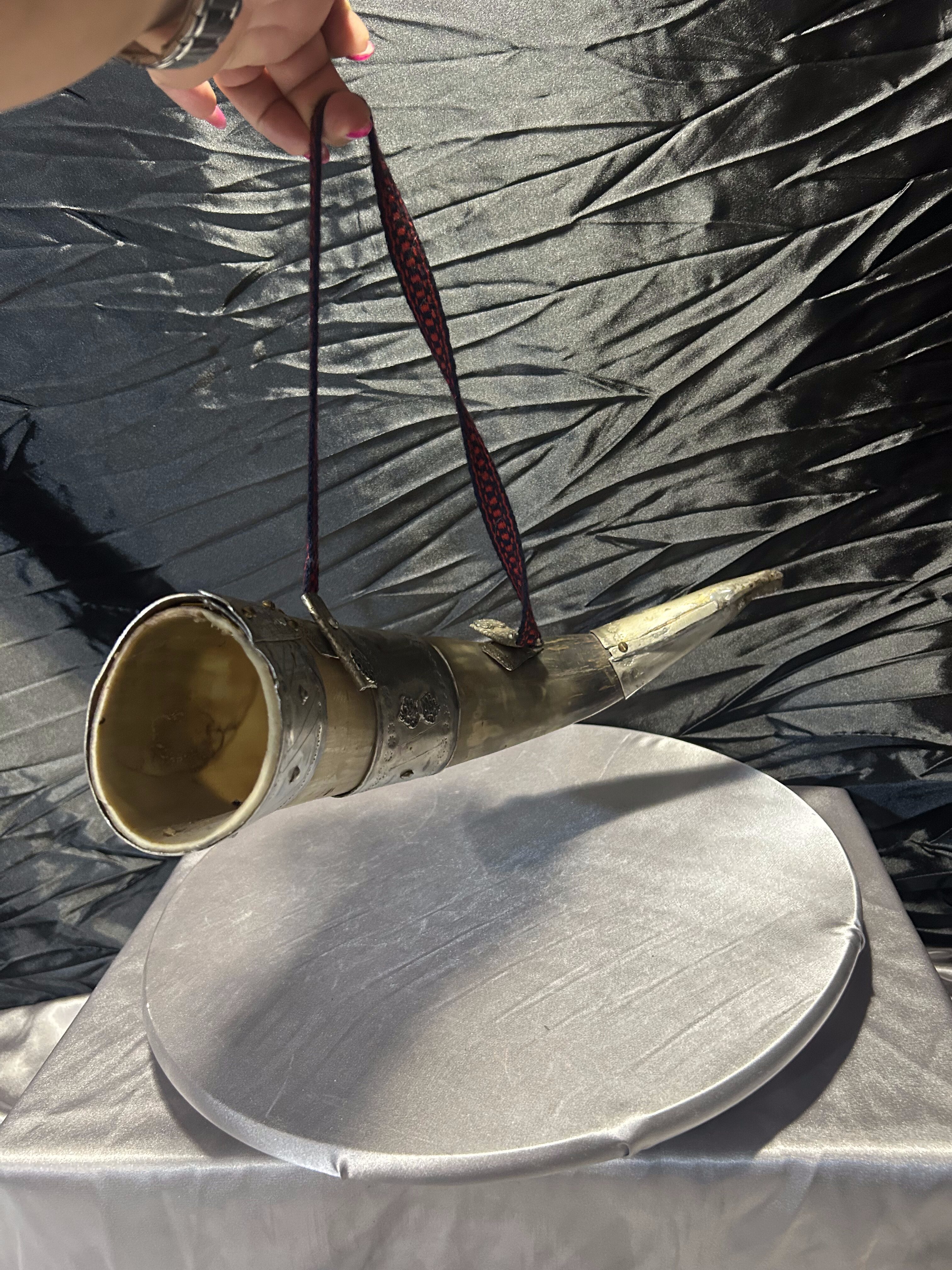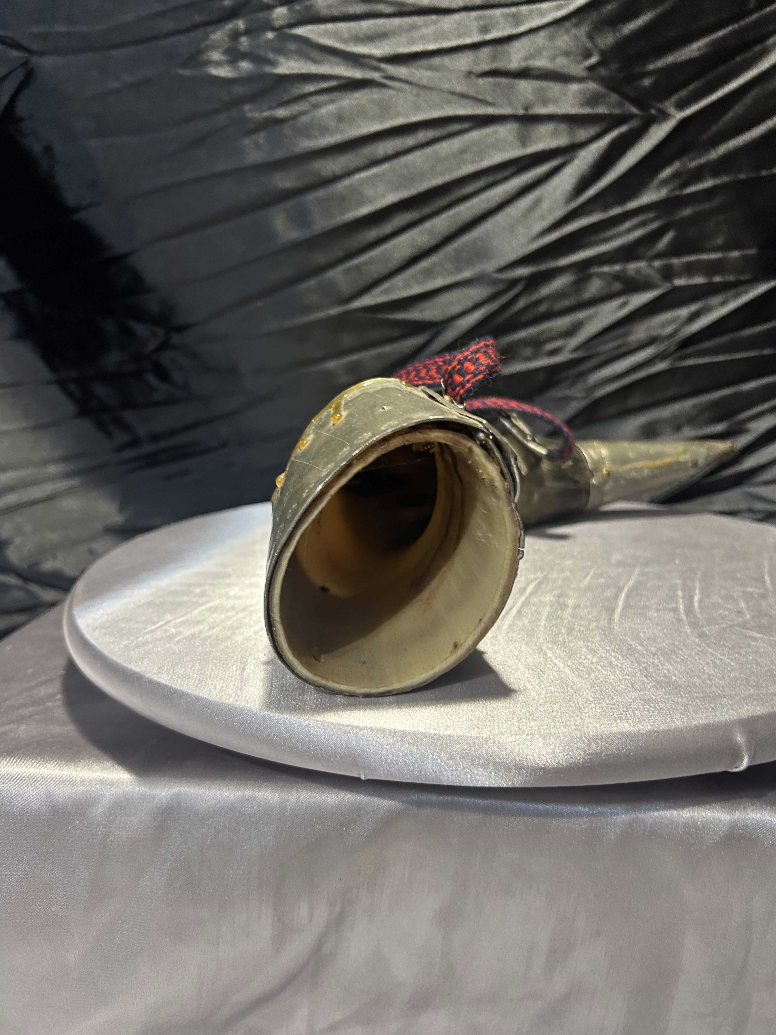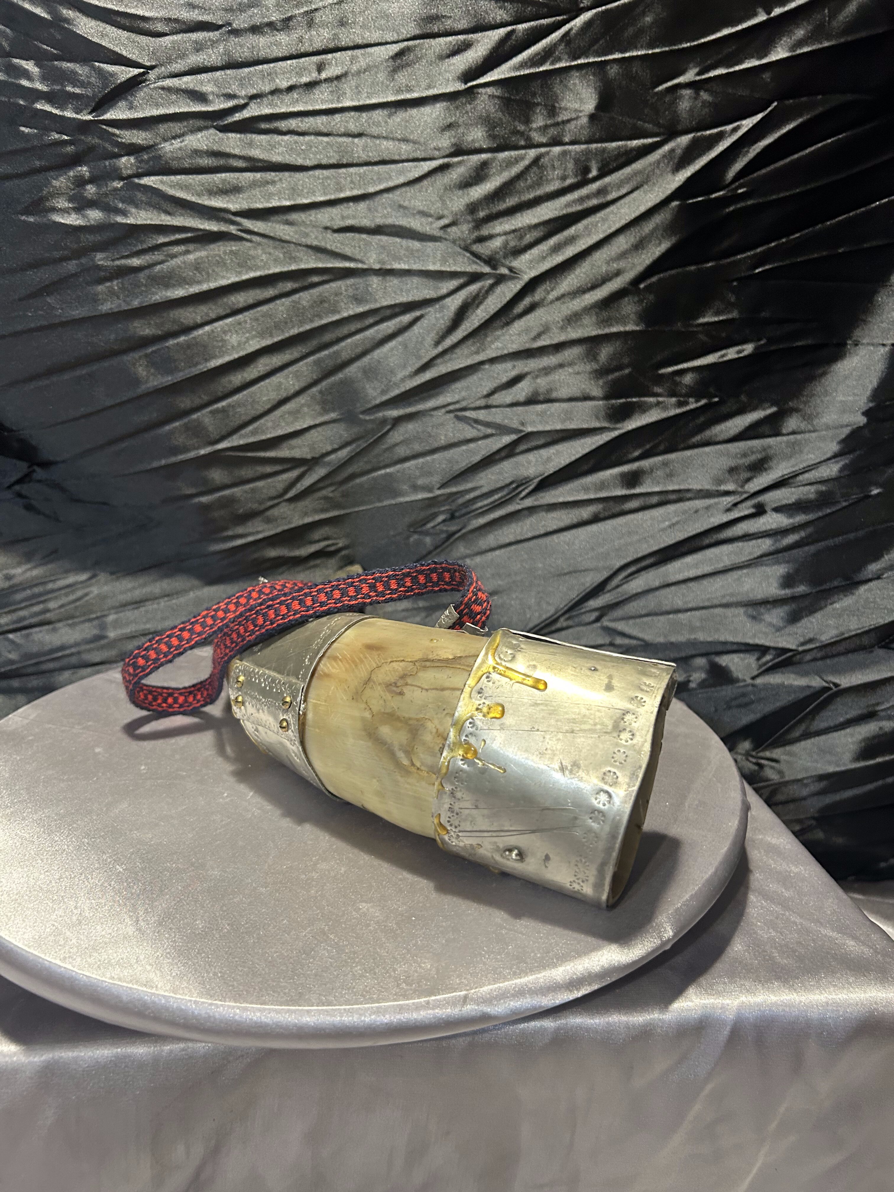 Bardzo duży, ręcznie zdobiony róg do zawieszenia, pochodzący z Norwegii. Wykonany z naturalnego rogu, ozdobiony metalowymi aplikacjami i dekoracyjnym pasem materiałowym, dzięki czemu zyskuje niepowtarzalny charakter. To wyjątkowa ozdoba, która świetnie sprawdzi się we wnętrzach rustykalnych, historycznych czy inspirowanych klimatem nordyckim. Idealny jako element kolekcji lub oryginalny akcent dekoracyjny na ścianę.