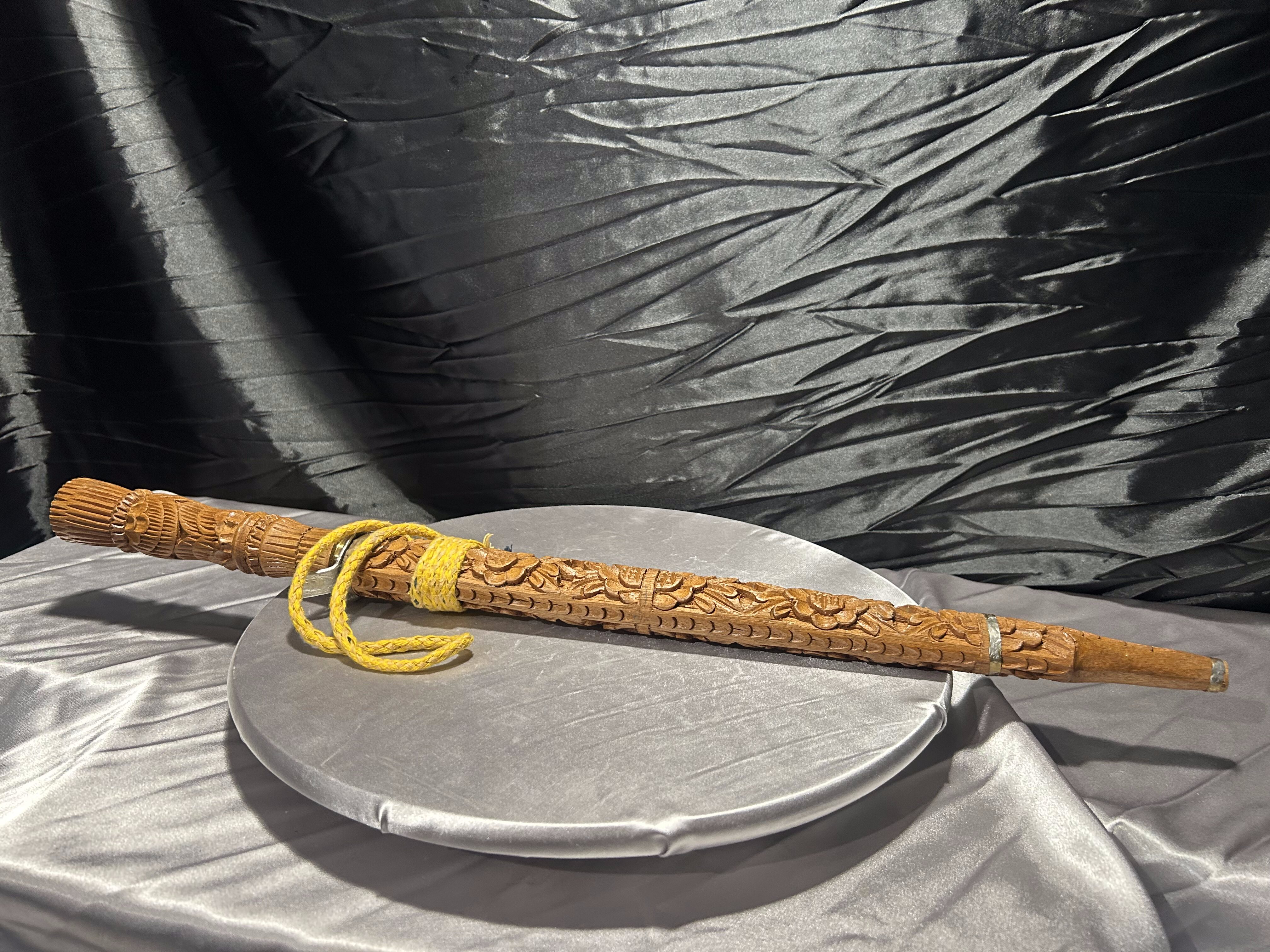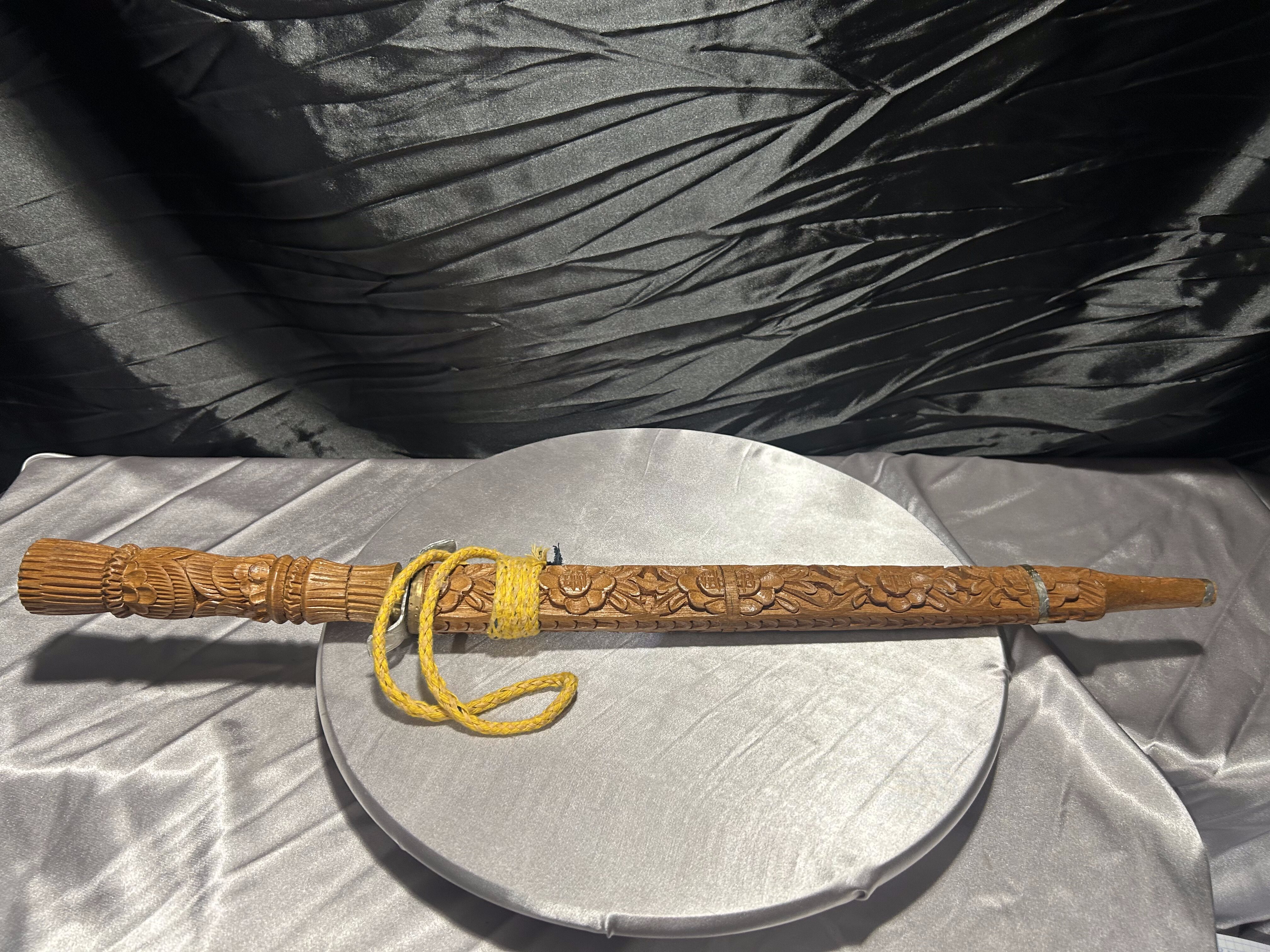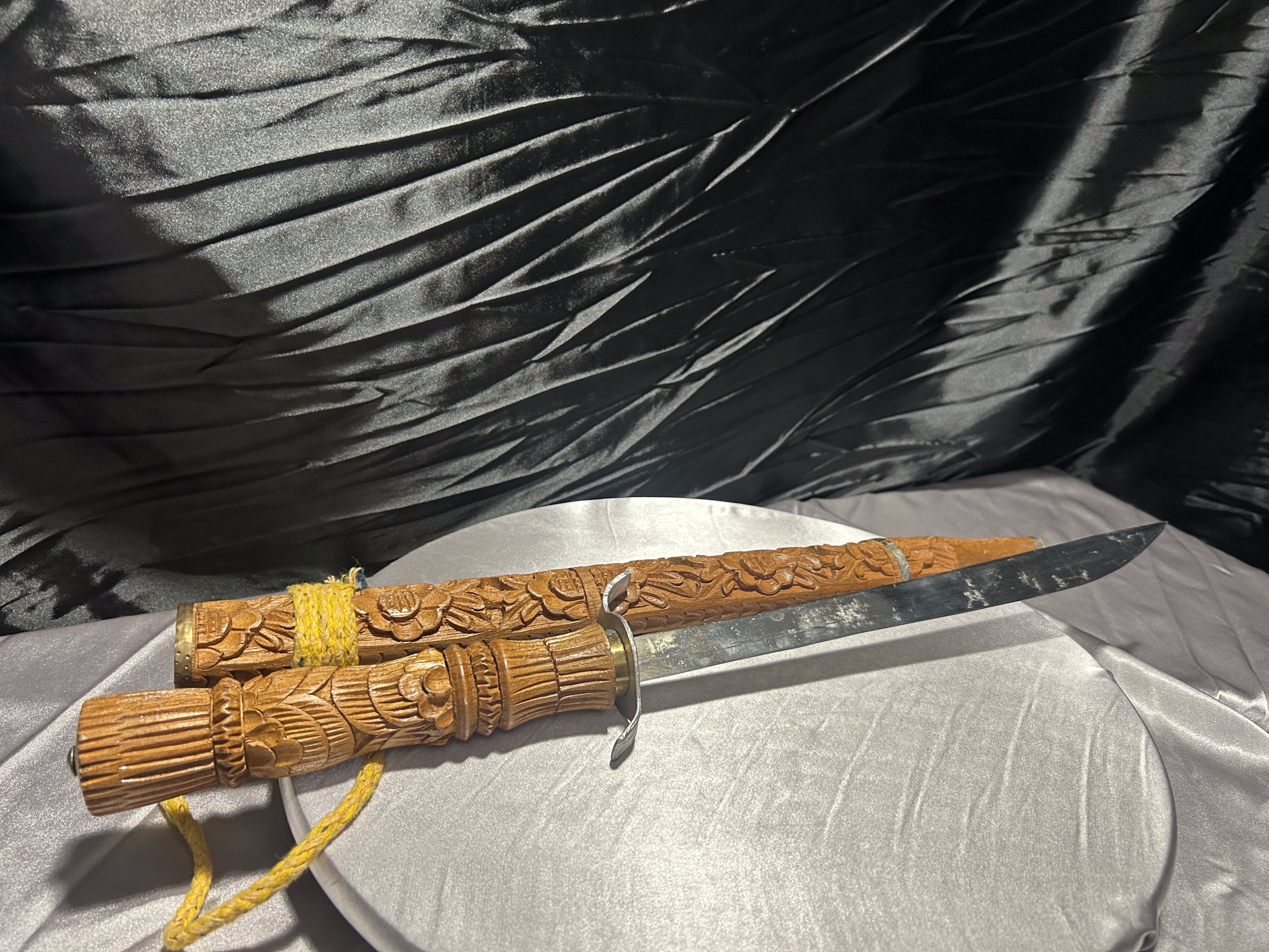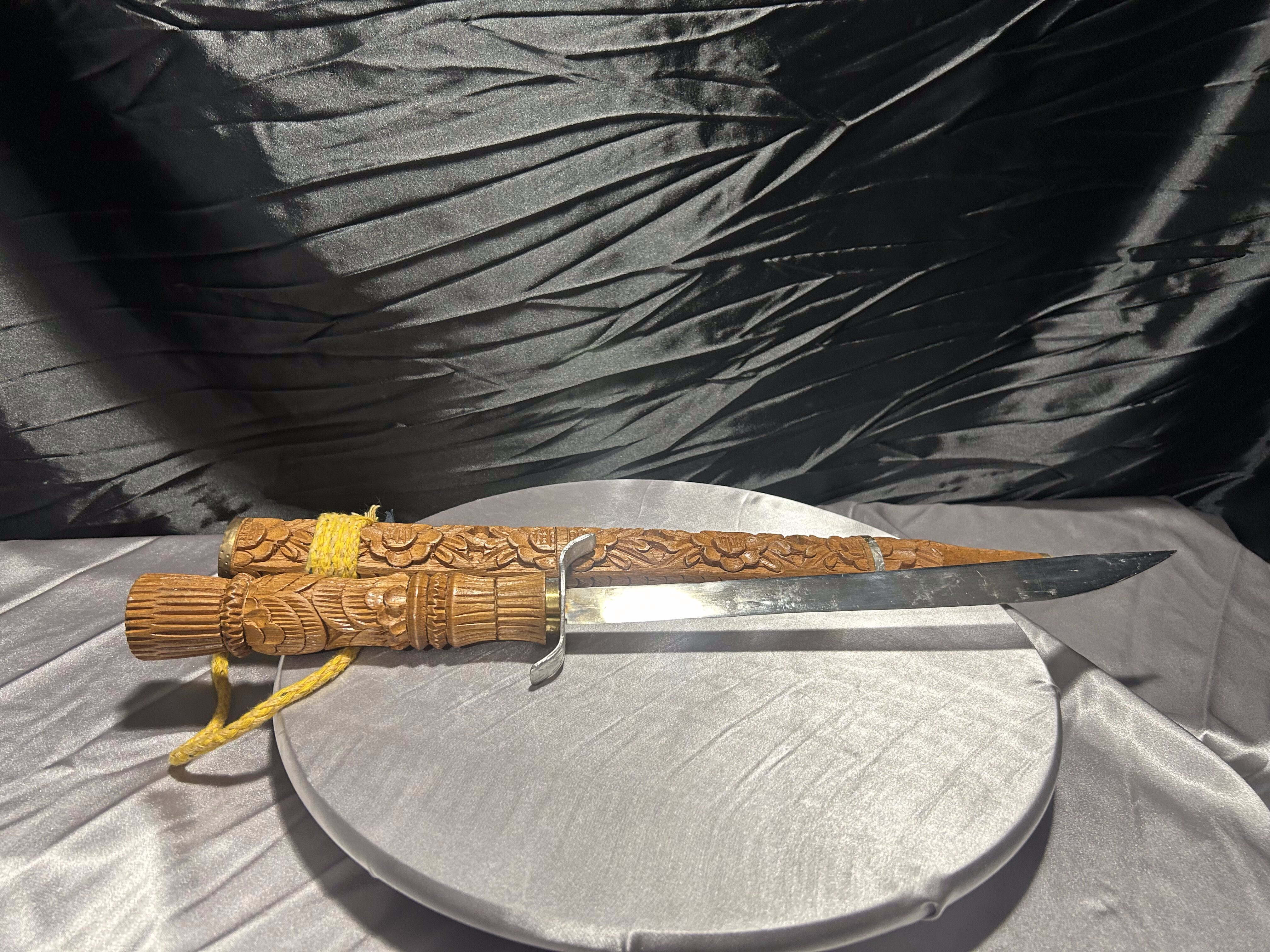 Tego typu noże z rzeźbionymi pochwami wywodzą się z tradycji Azji Południowo-Wschodniej i wykonywane były zarówno jako elementy użytkowe, jak i ozdobne. Prezentowany egzemplarz ma charakter dekoracyjny i jest ciekawą propozycją dla osób poszukujących nietuzinkowych przedmiotów do kolekcji.