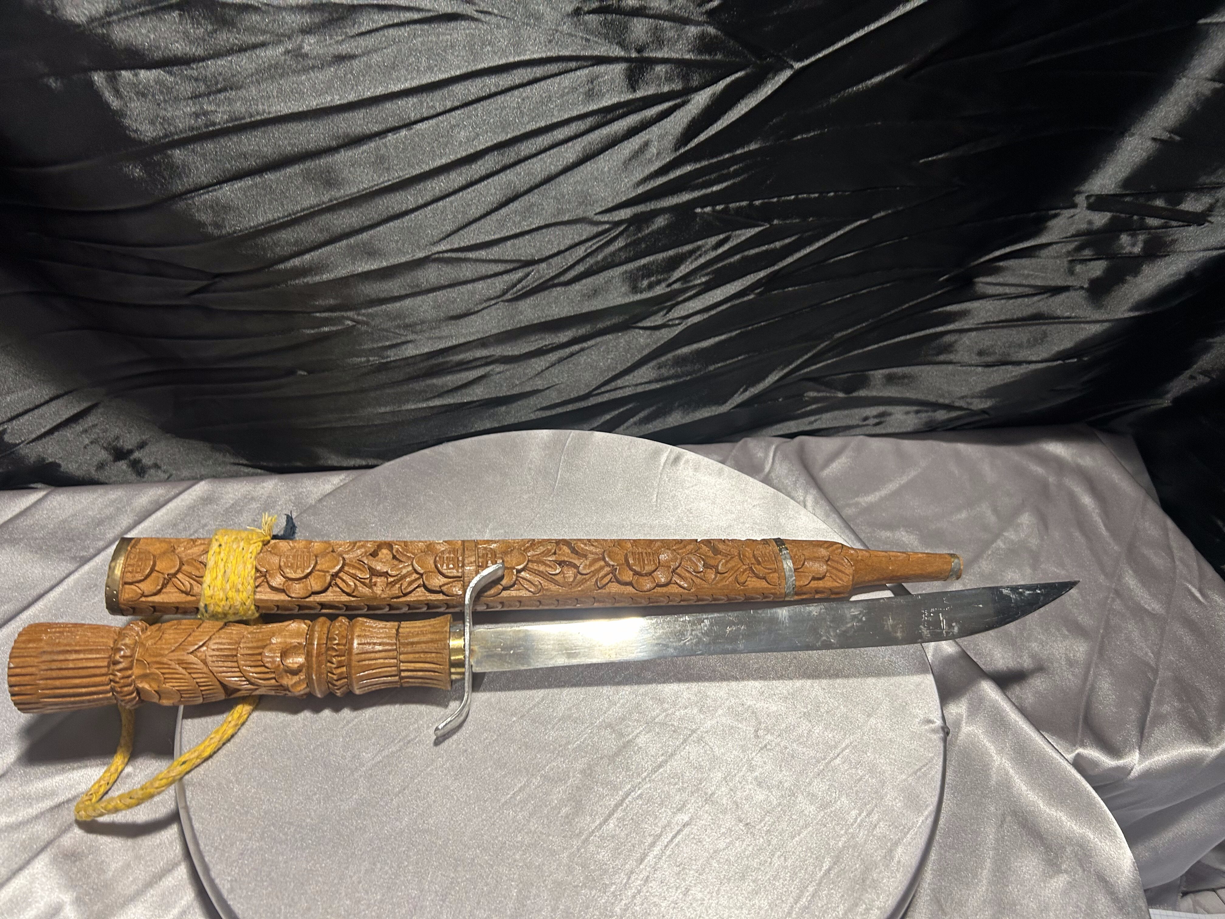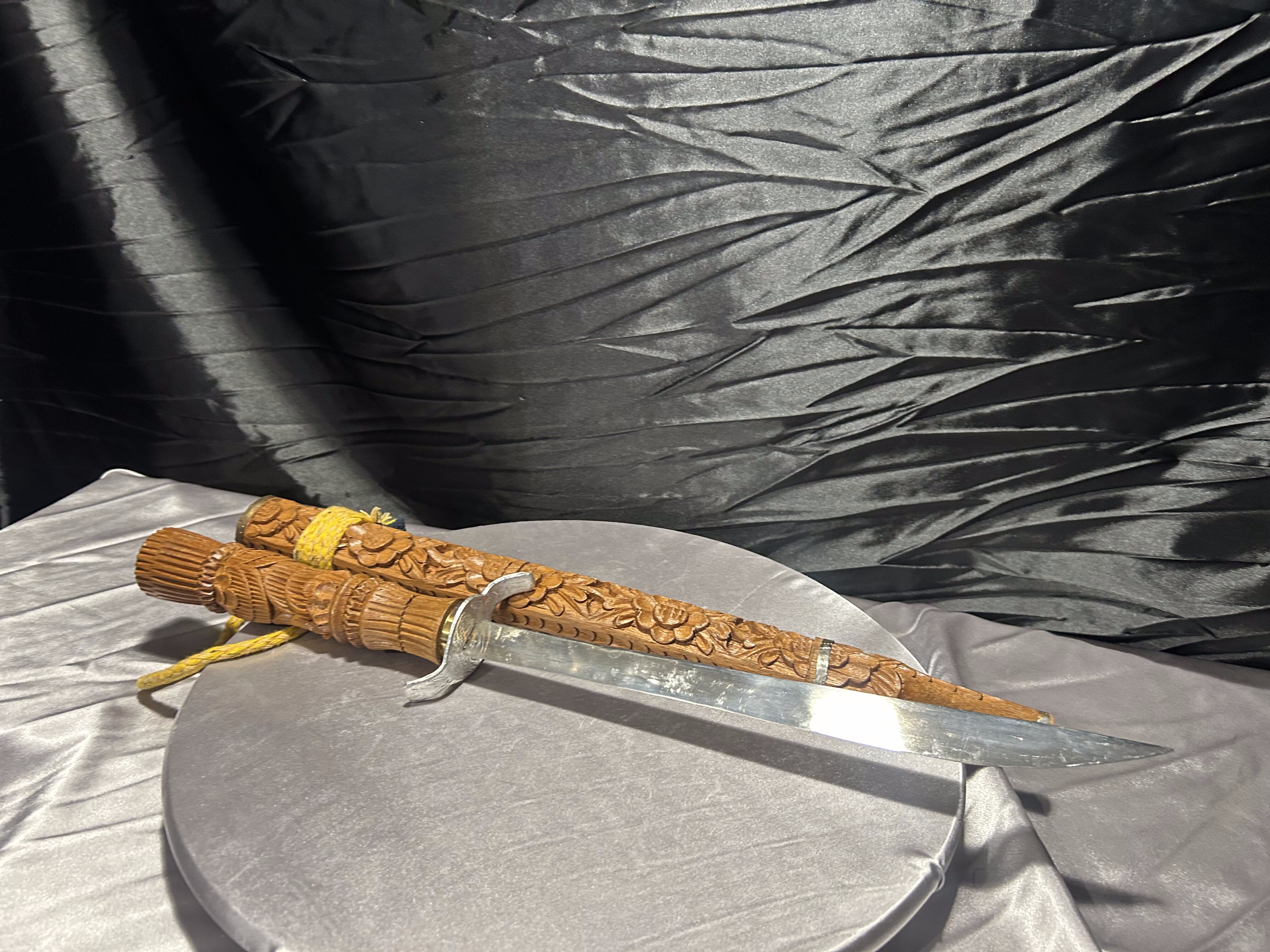 – nóż dekoracyjny z drewnianą, rzeźbioną pochwą
