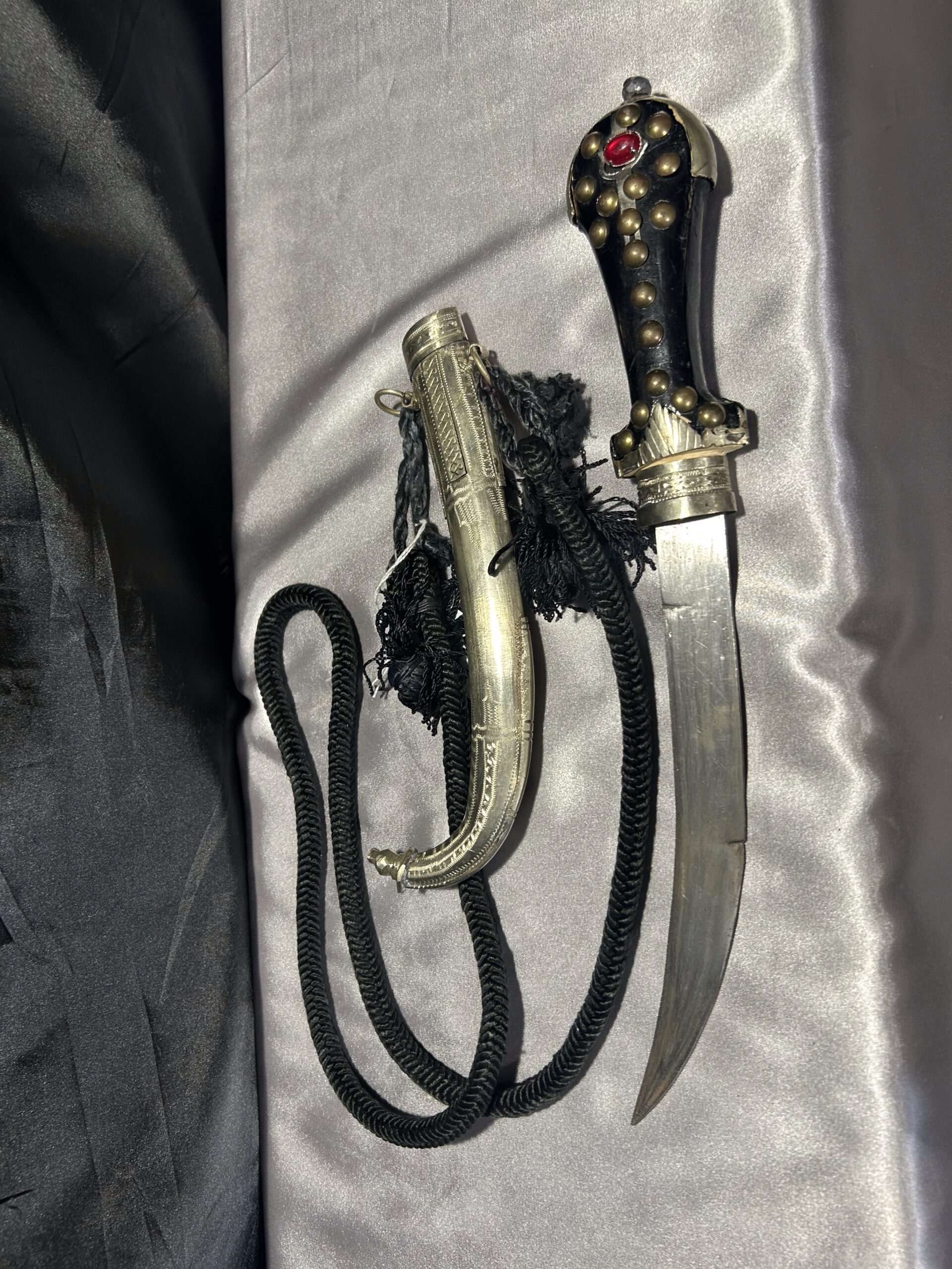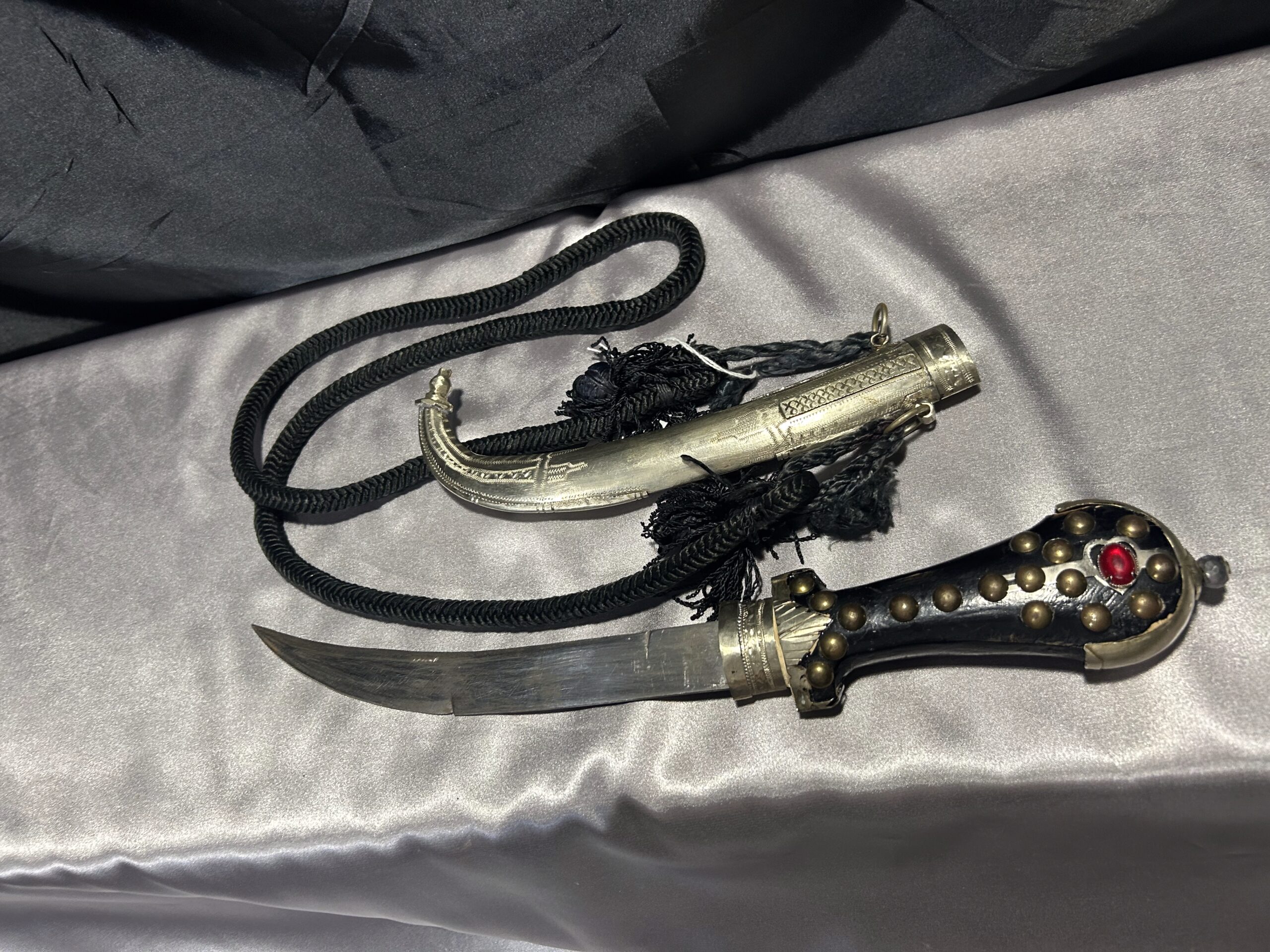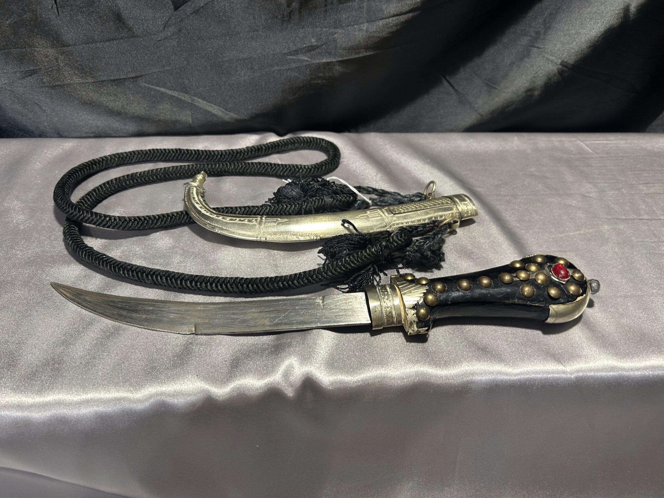 Pięknie zdobiony nóż sztylet, który łączy w sobie funkcjonalność i artystyczny kunszt. Metalowa pochwa z bogatymi zdobieniami podkreśla unikalny charakter sztyletu, a drewniana rękojeść z metalowymi okuciami i ozdobą z czerwonym kamieniem dodaje elegancji. Całość uzupełnia czarny sznur, umożliwiający wygodne przepasanie.