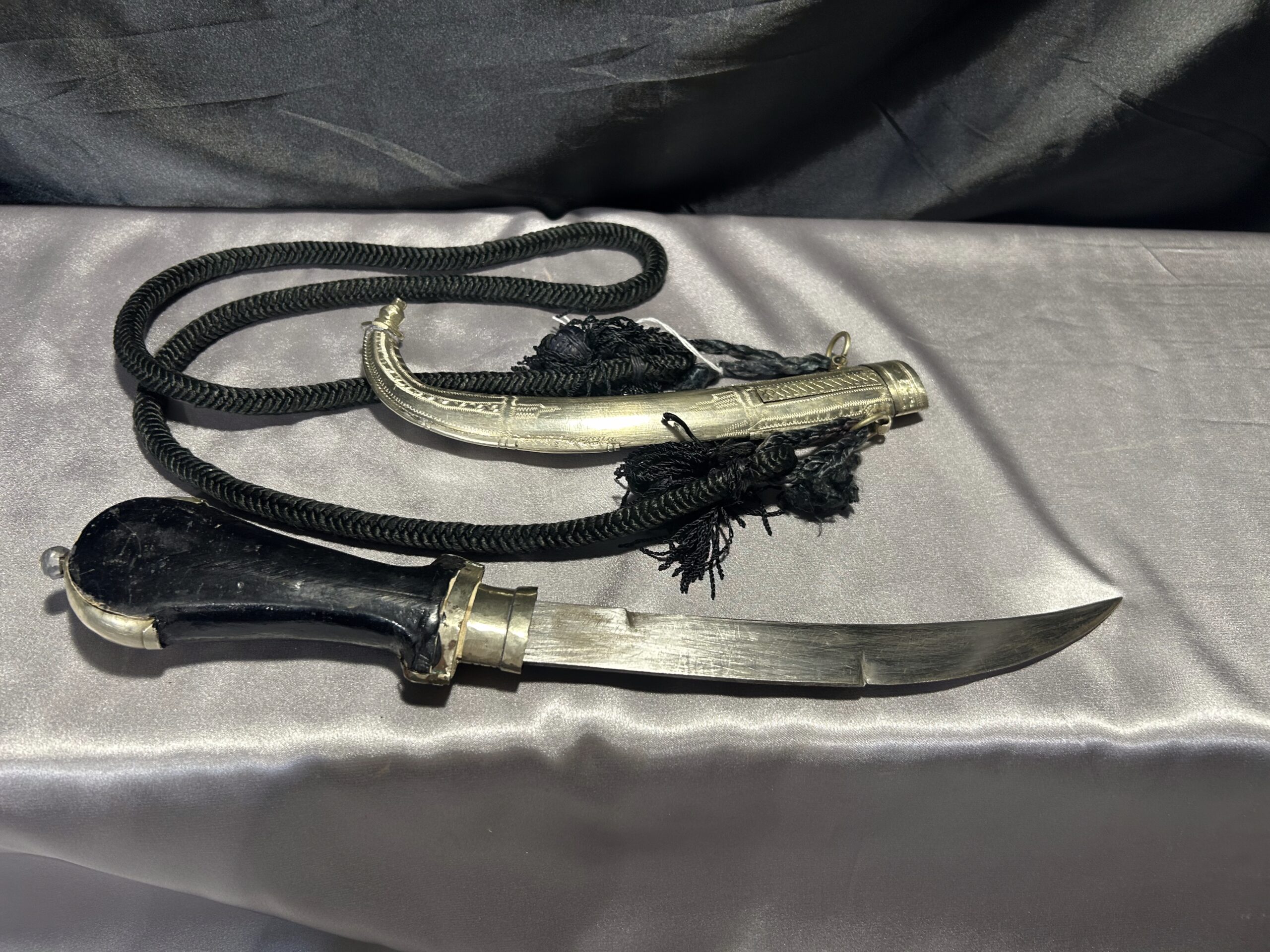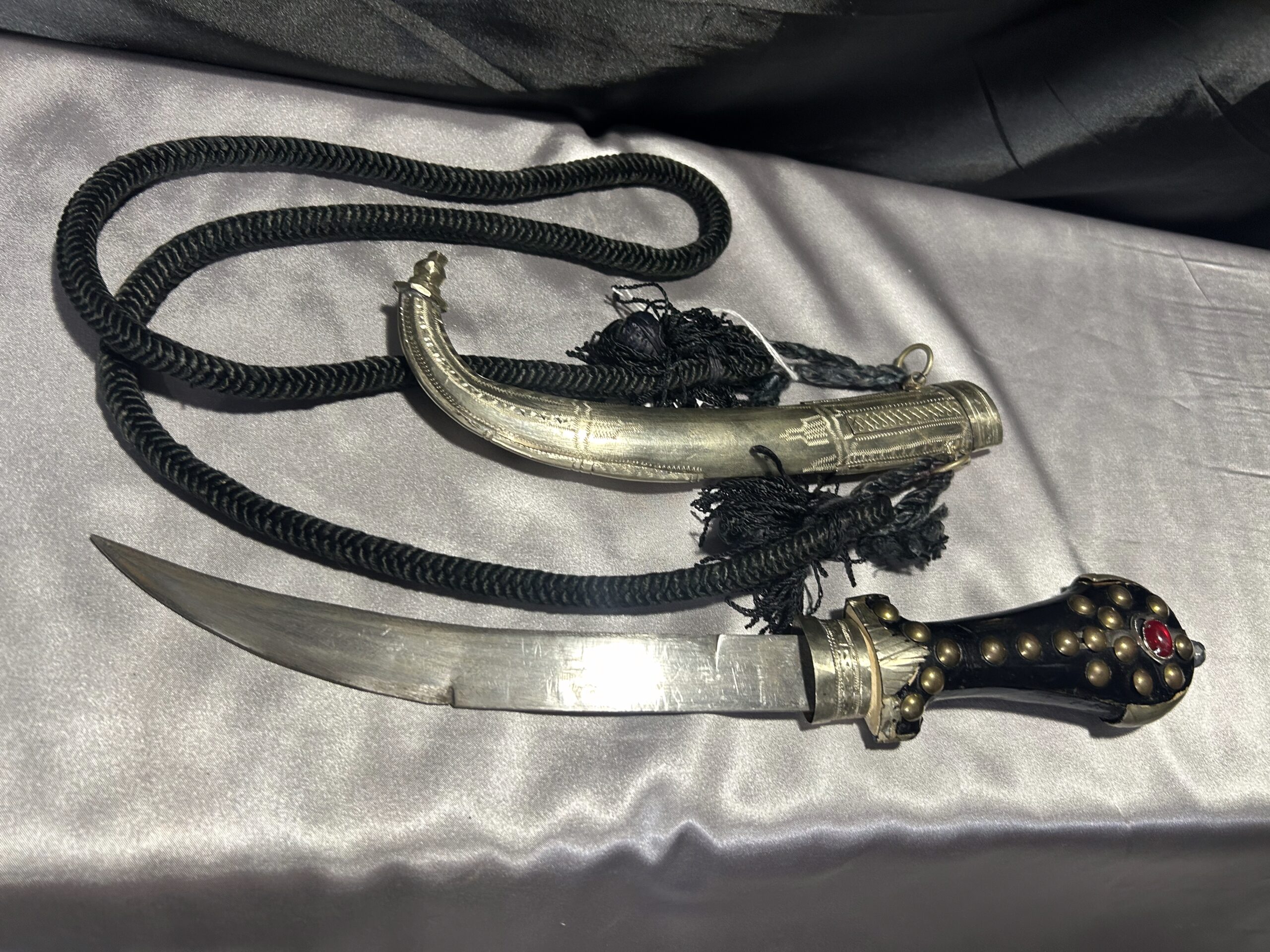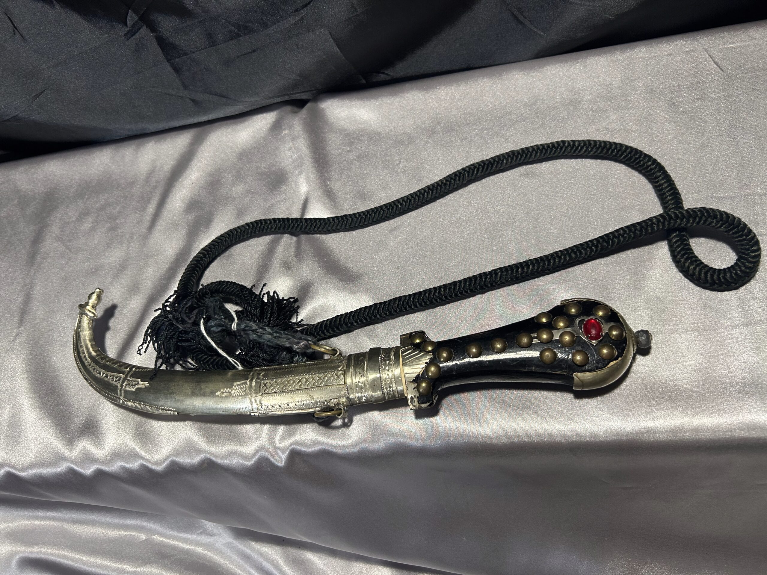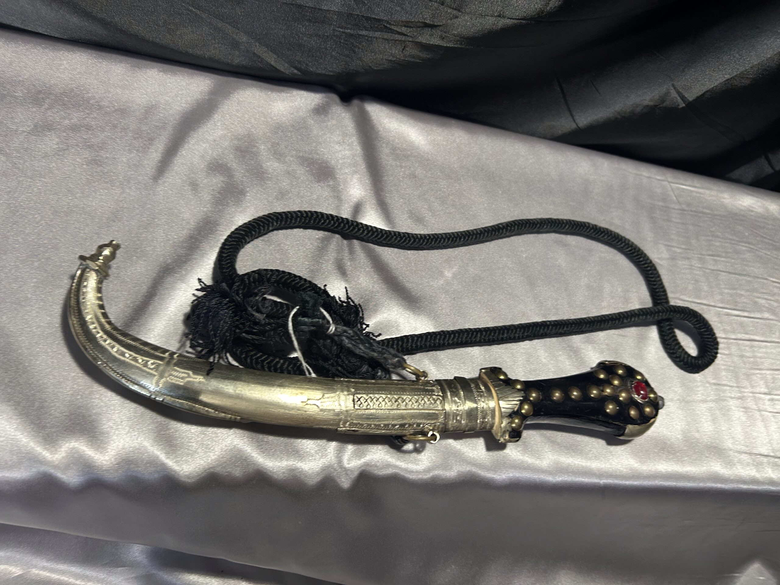 Pięknie zdobiony nóż sztylet, który łączy w sobie funkcjonalność i artystyczny kunszt. Metalowa pochwa z bogatymi zdobieniami podkreśla unikalny charakter sztyletu, a drewniana rękojeść z metalowymi okuciami i ozdobą z czerwonym kamieniem dodaje elegancji. Całość uzupełnia czarny sznur, umożliwiający wygodne przepasanie.