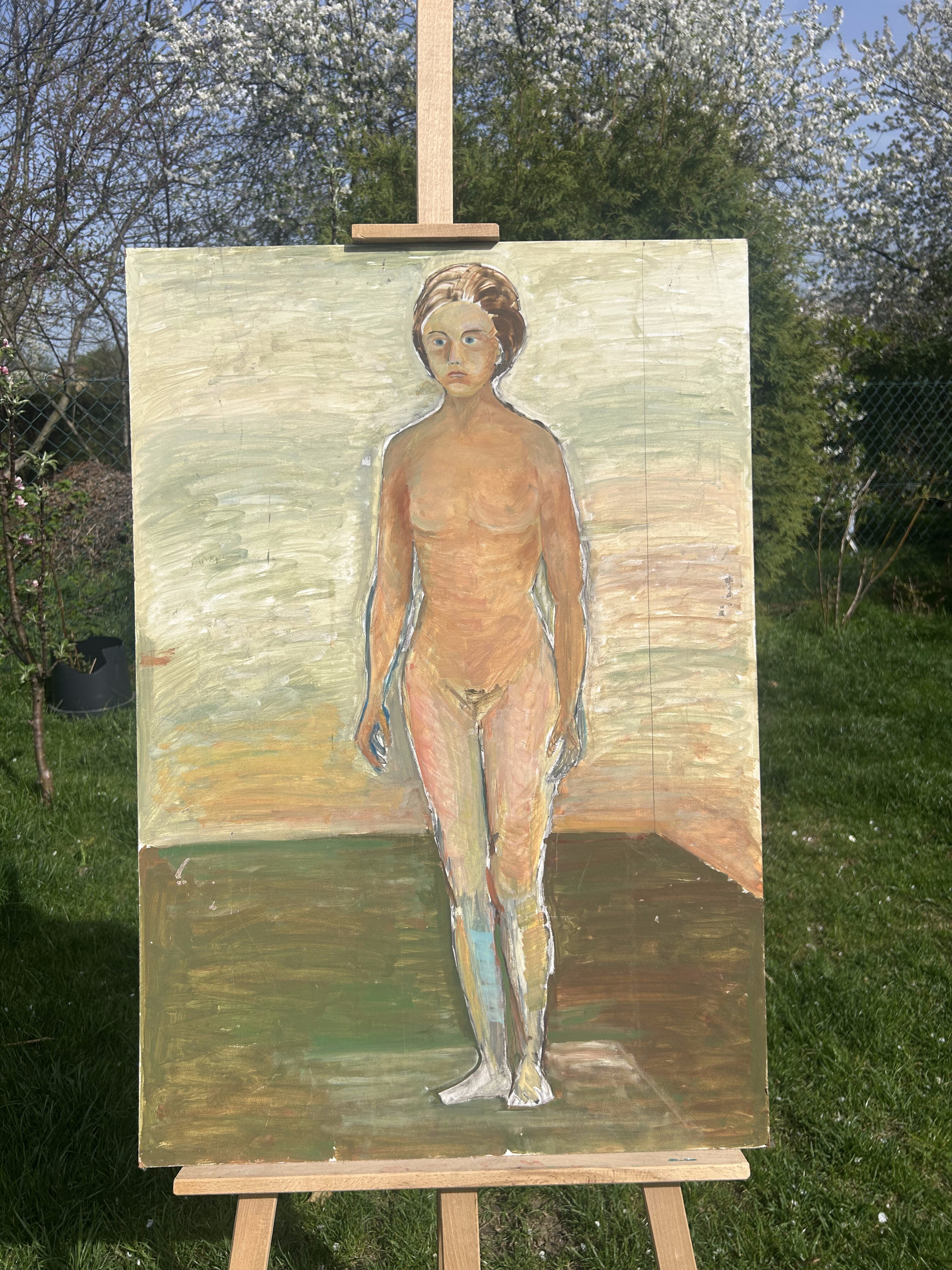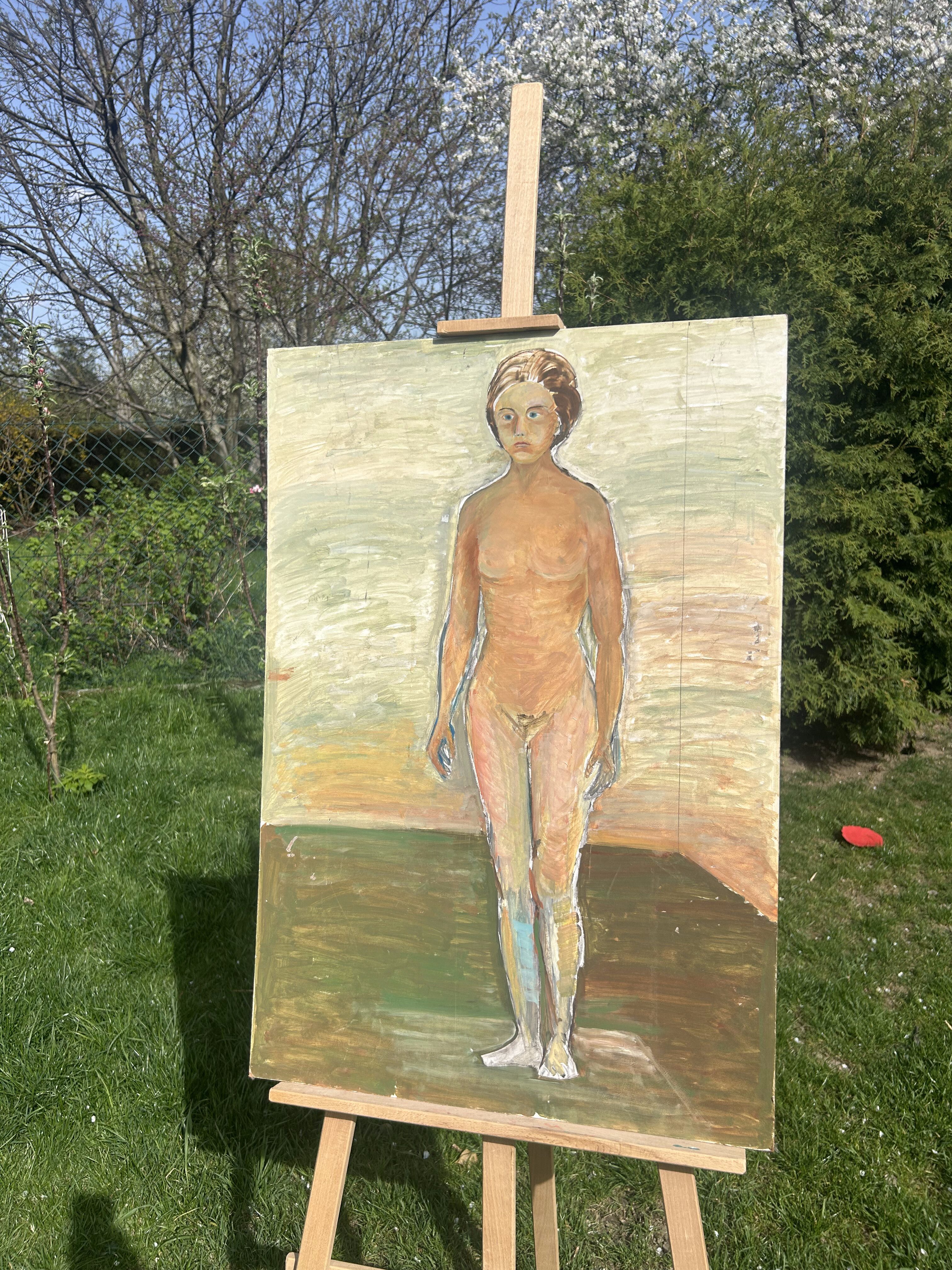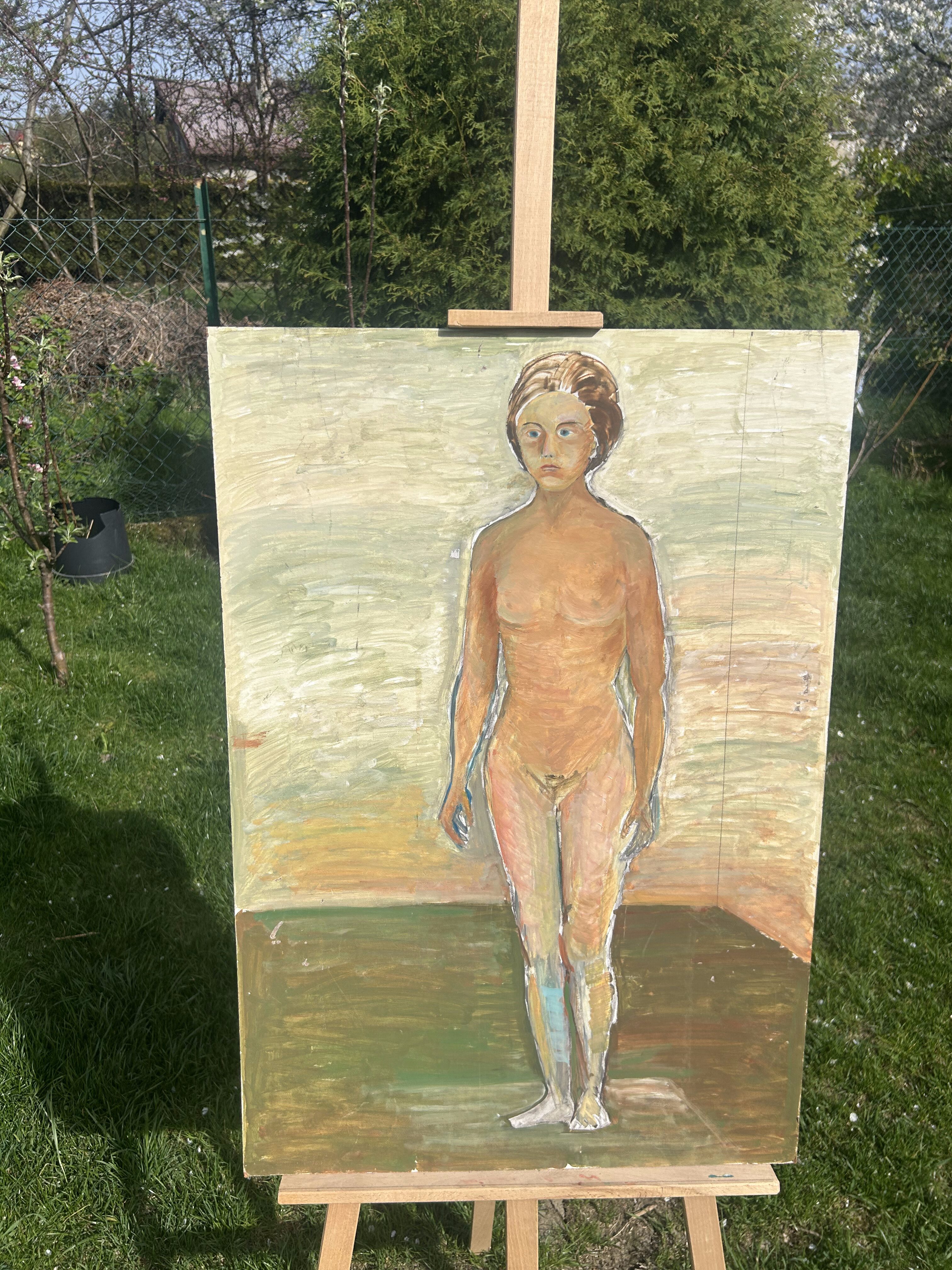 Wyrazisty obraz olejny malowany na desce, przedstawiający pełnopostaciowy akt kobiecy na tle abstrakcyjnego, geometrycznego pejzażu. Kompozycja utrzymana w surowym, ekspresyjnym stylu, przyciąga wzrok mocnymi pociągnięciami pędzla i kontrastową kolorystyką.