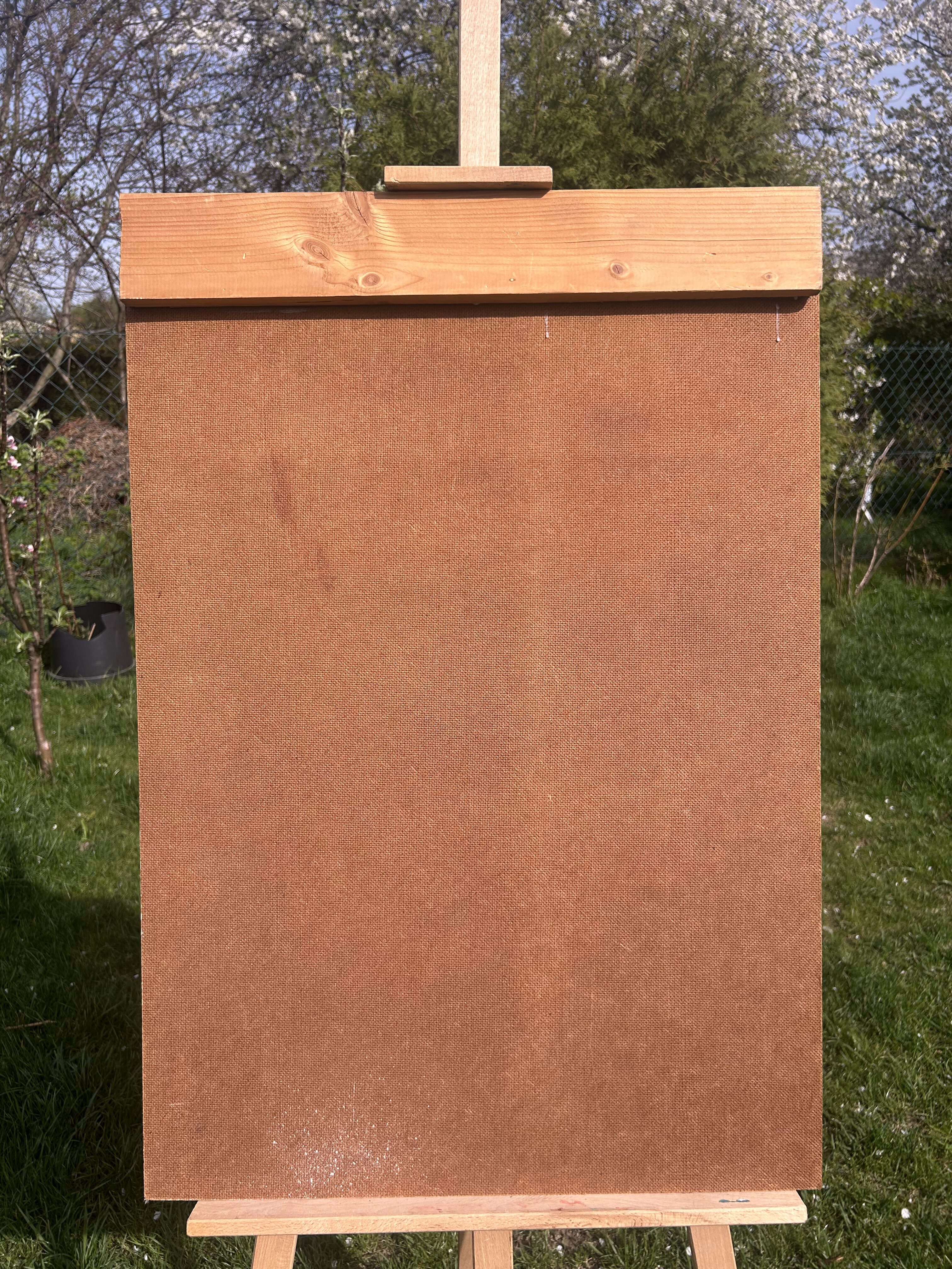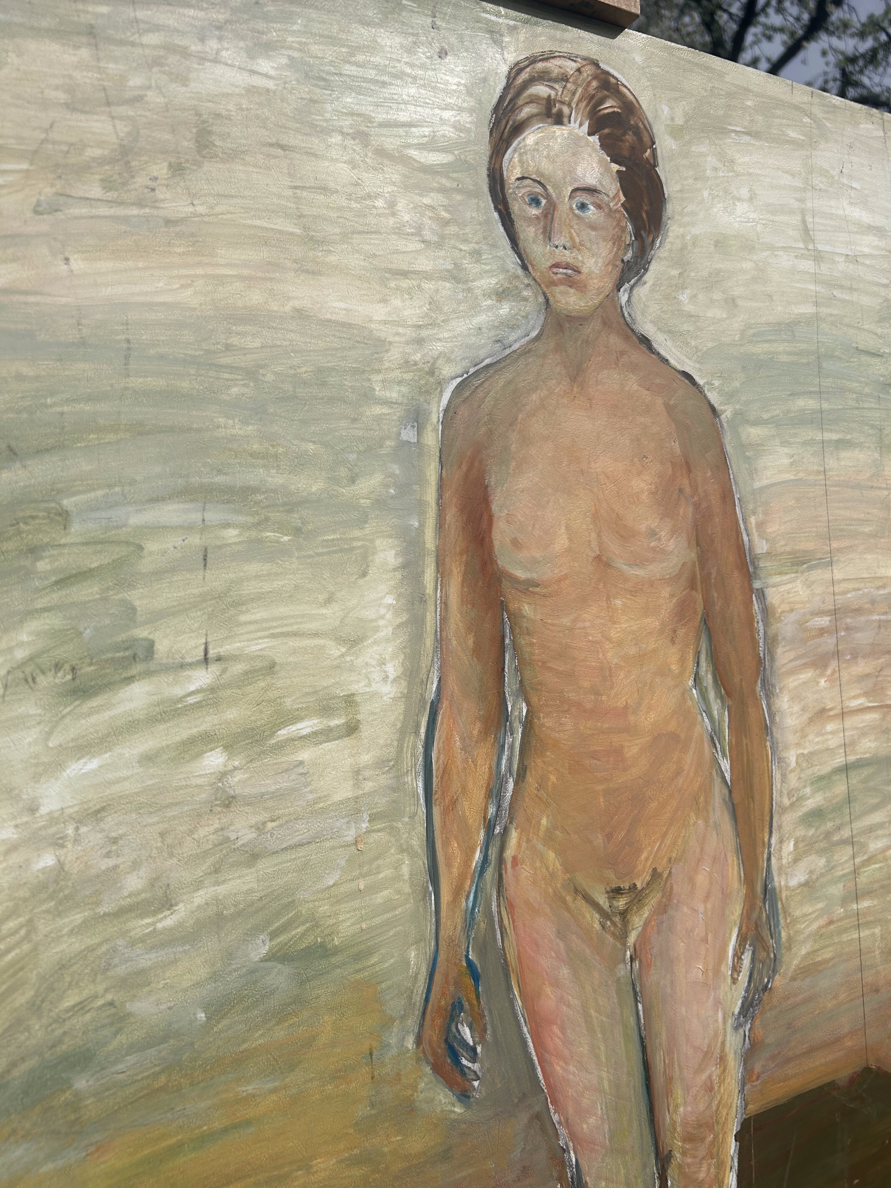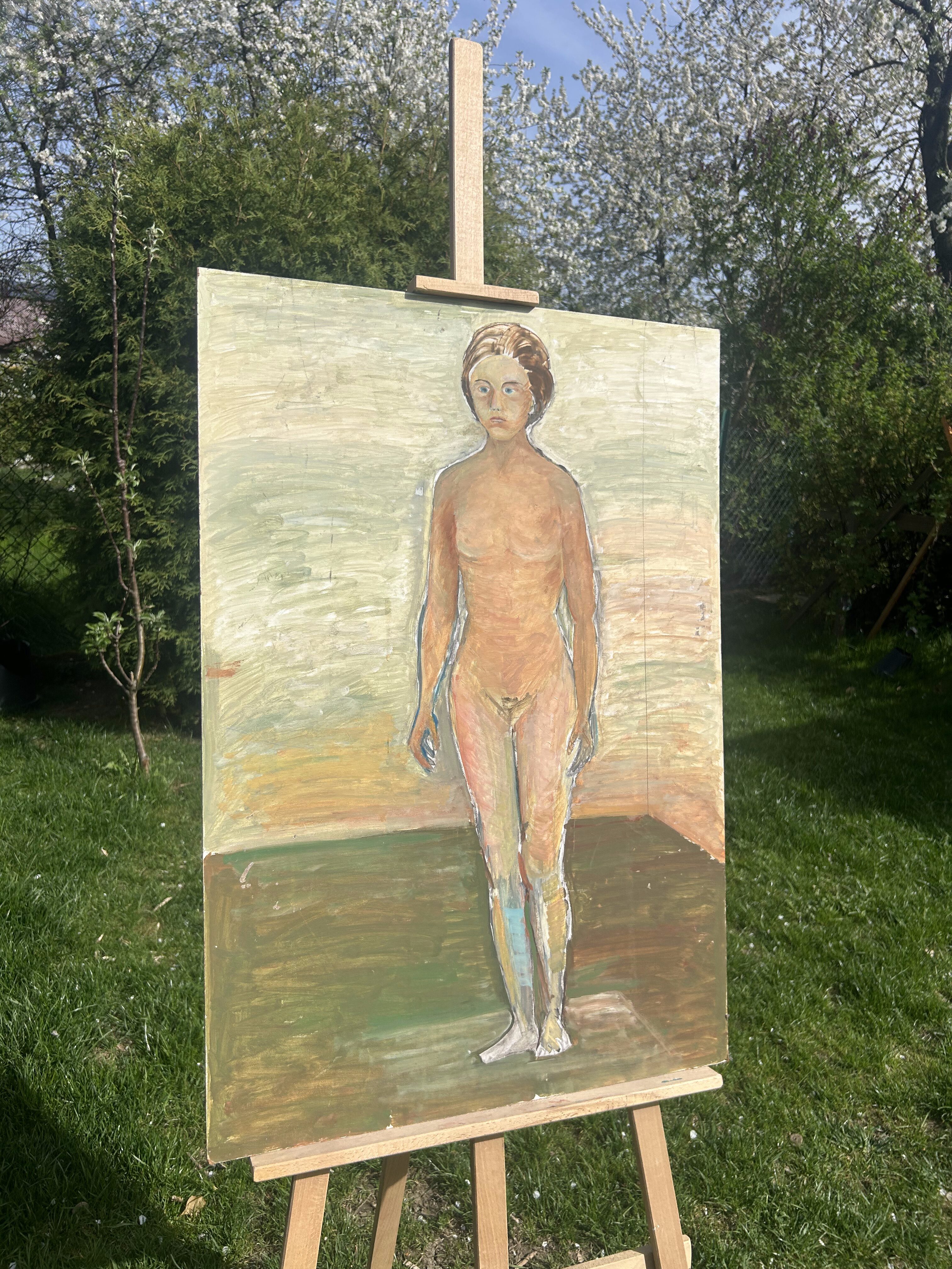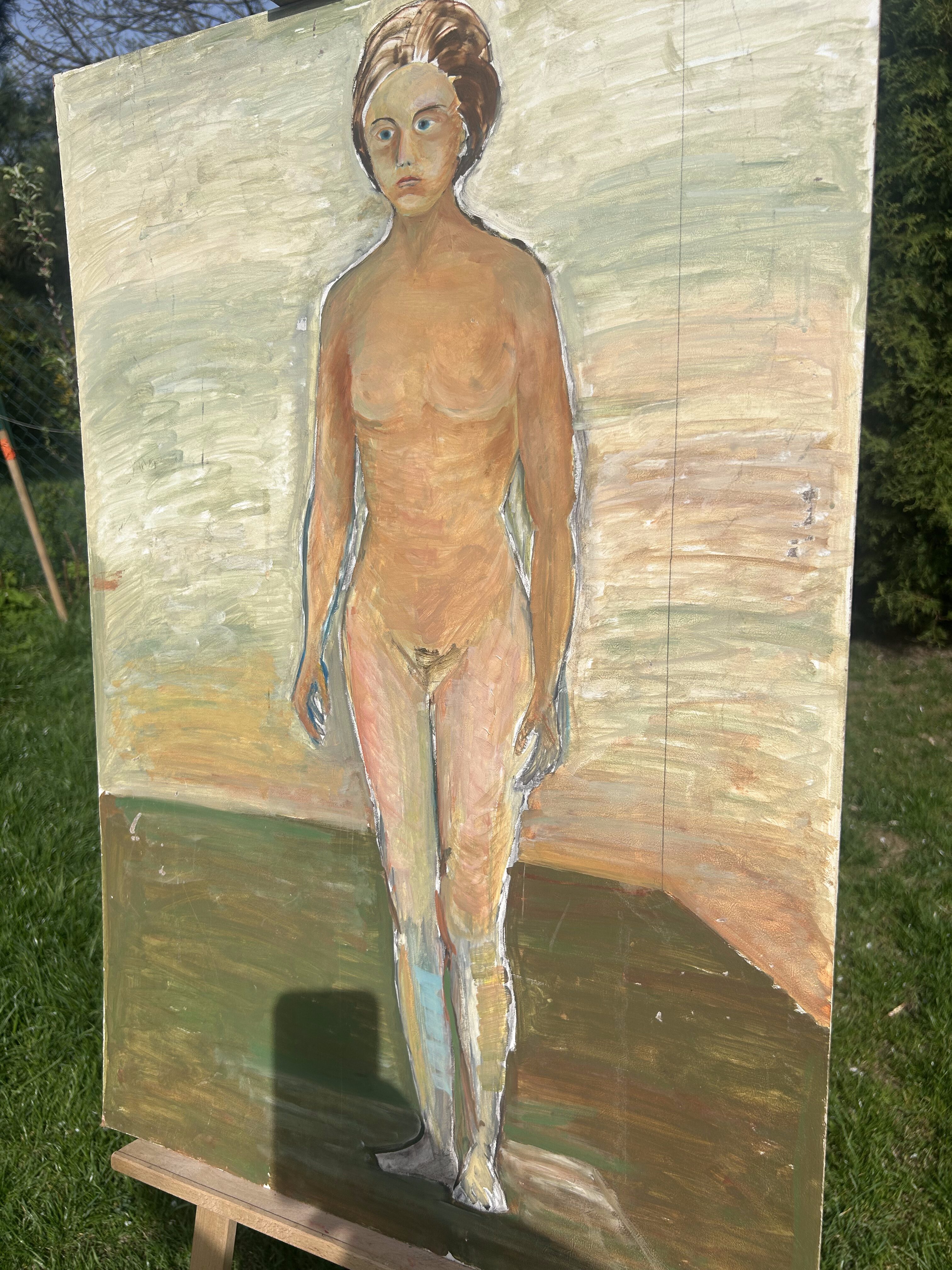 Wyrazisty obraz olejny malowany na desce, przedstawiający pełnopostaciowy akt kobiecy na tle abstrakcyjnego, geometrycznego pejzażu. Kompozycja utrzymana w surowym, ekspresyjnym stylu, przyciąga wzrok mocnymi pociągnięciami pędzla i kontrastową kolorystyką.