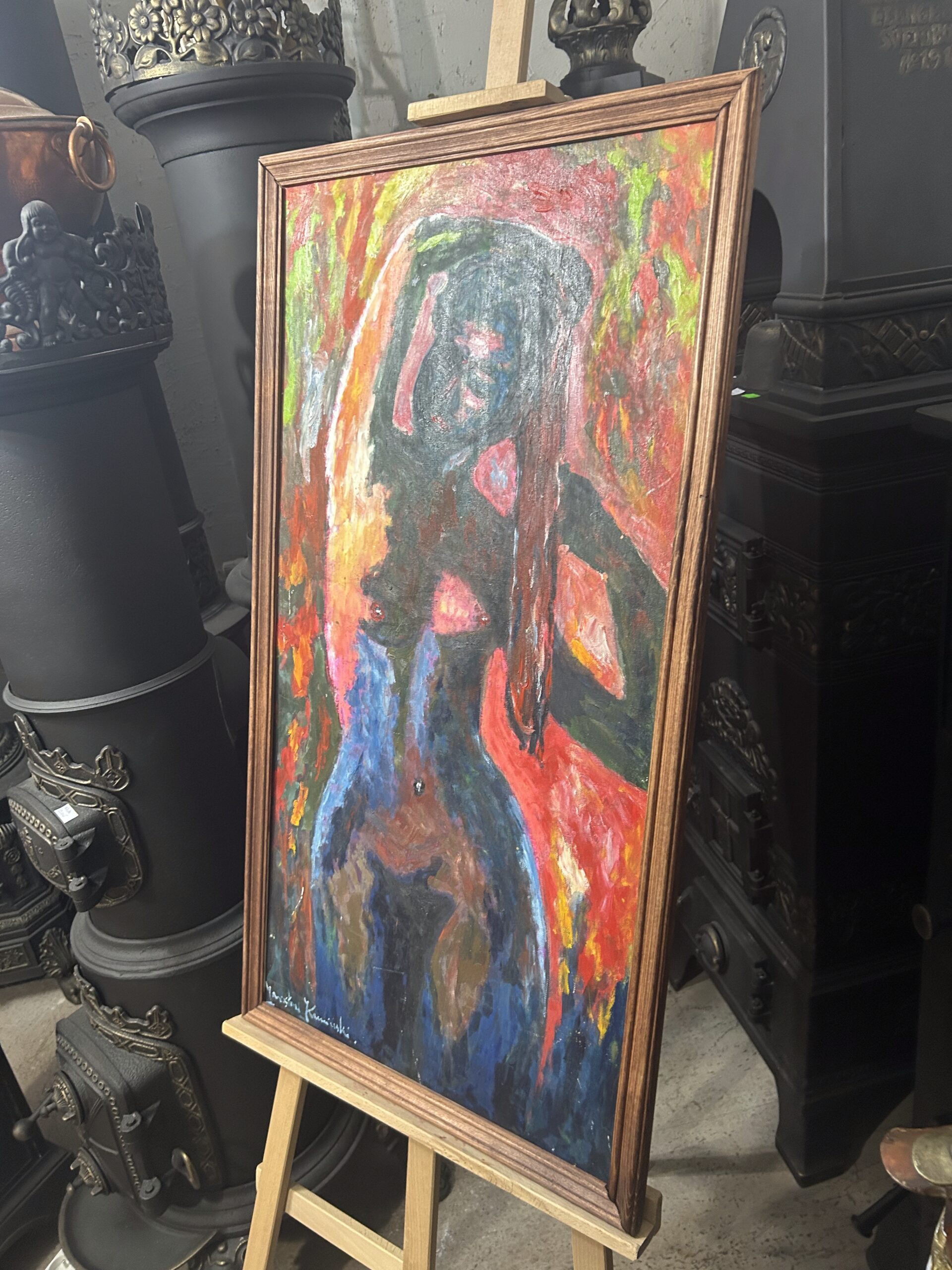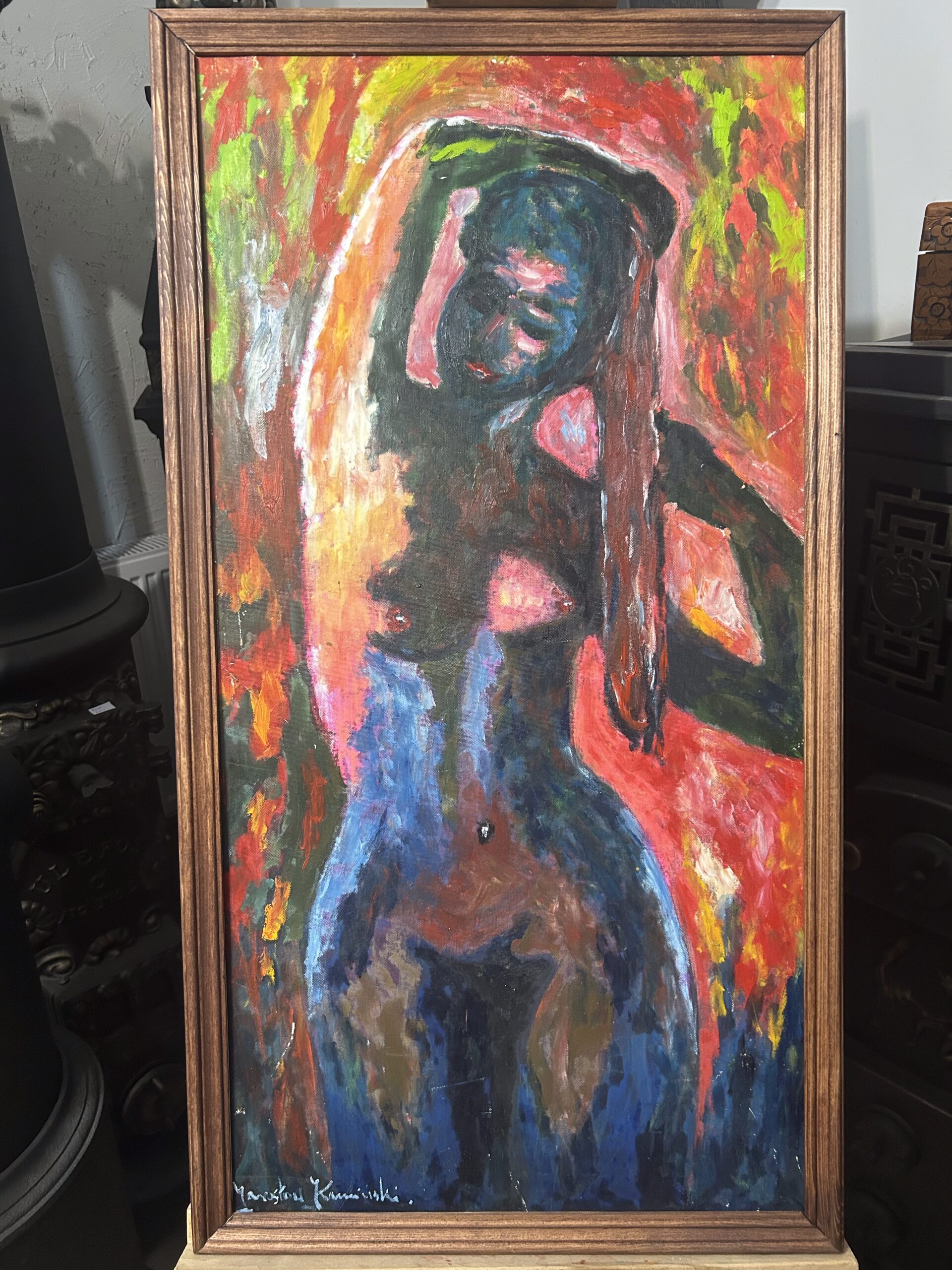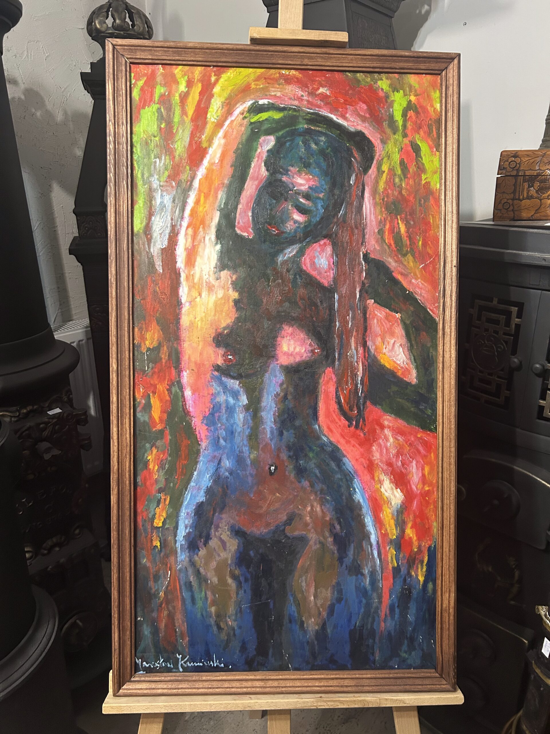 Zanurz się w świecie sztuki z wyjątkowym obrazem autorstwa Jarosława Kamińskiego, przedstawiającym akt kobiety. To dzieło, namalowane farbami olejnymi na desce, zachwyca subtelnością, mistrzowskim operowaniem światłocieniem oraz delikatnością formy. Artysta w niezwykły sposób uchwycił piękno i zmysłowość kobiecego ciała, tworząc kompozycję pełną harmonii i emocji. Drewniana rama podkreśla klasyczny charakter obrazu, dodając mu elegancji.