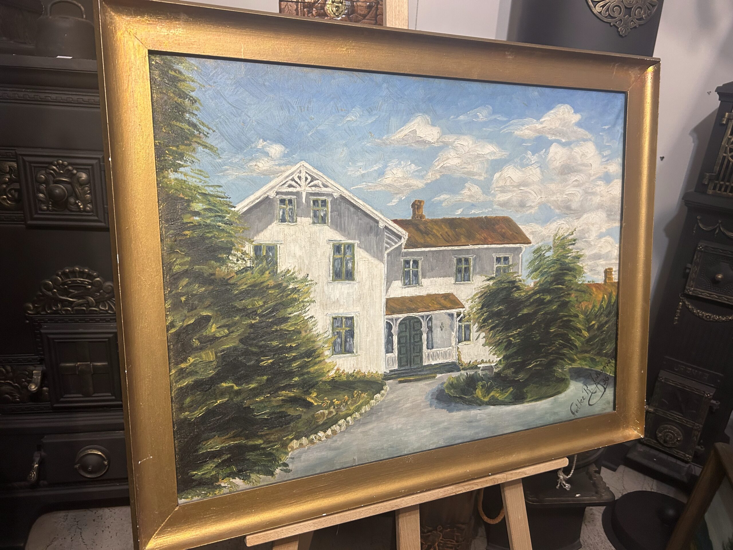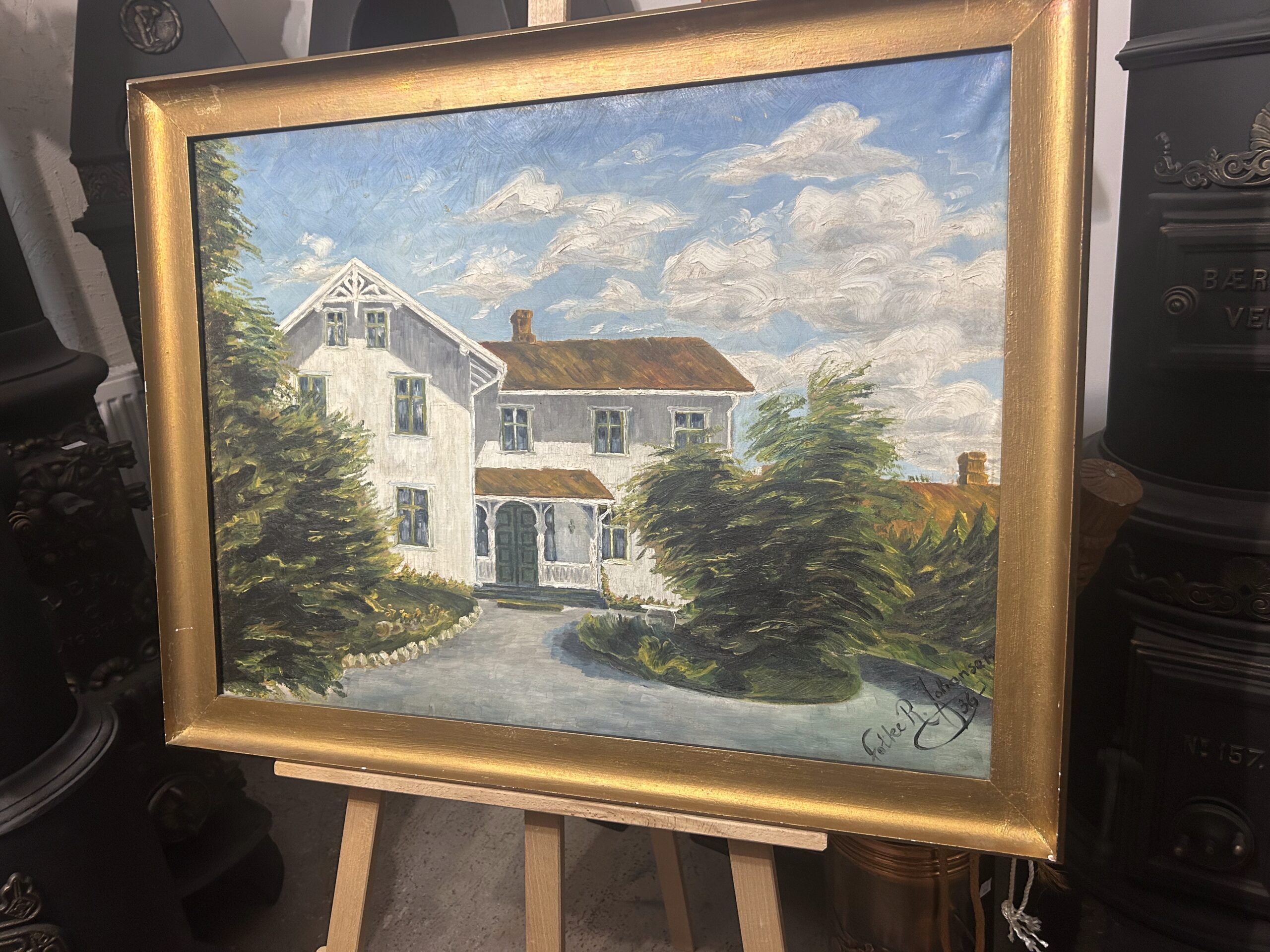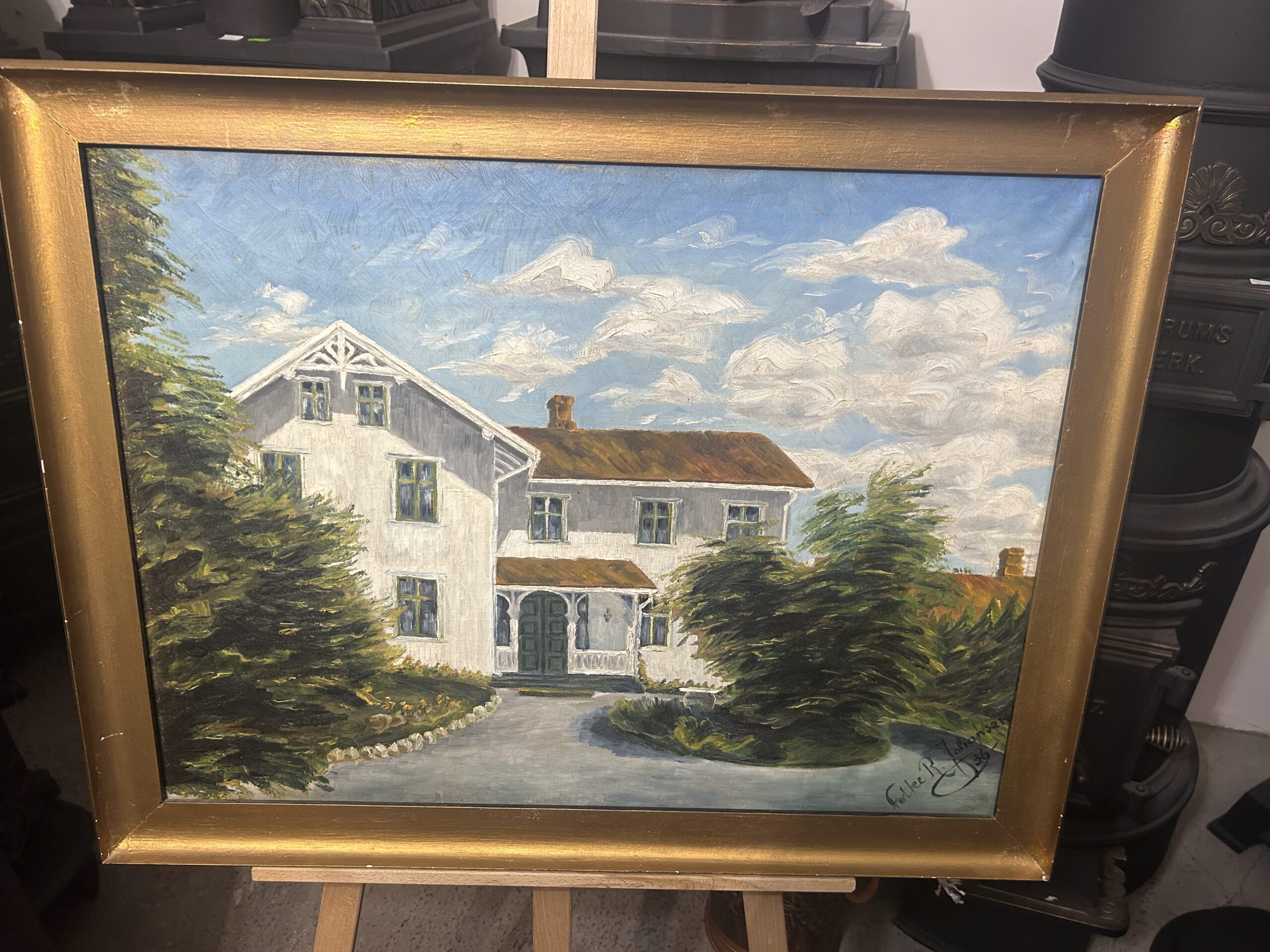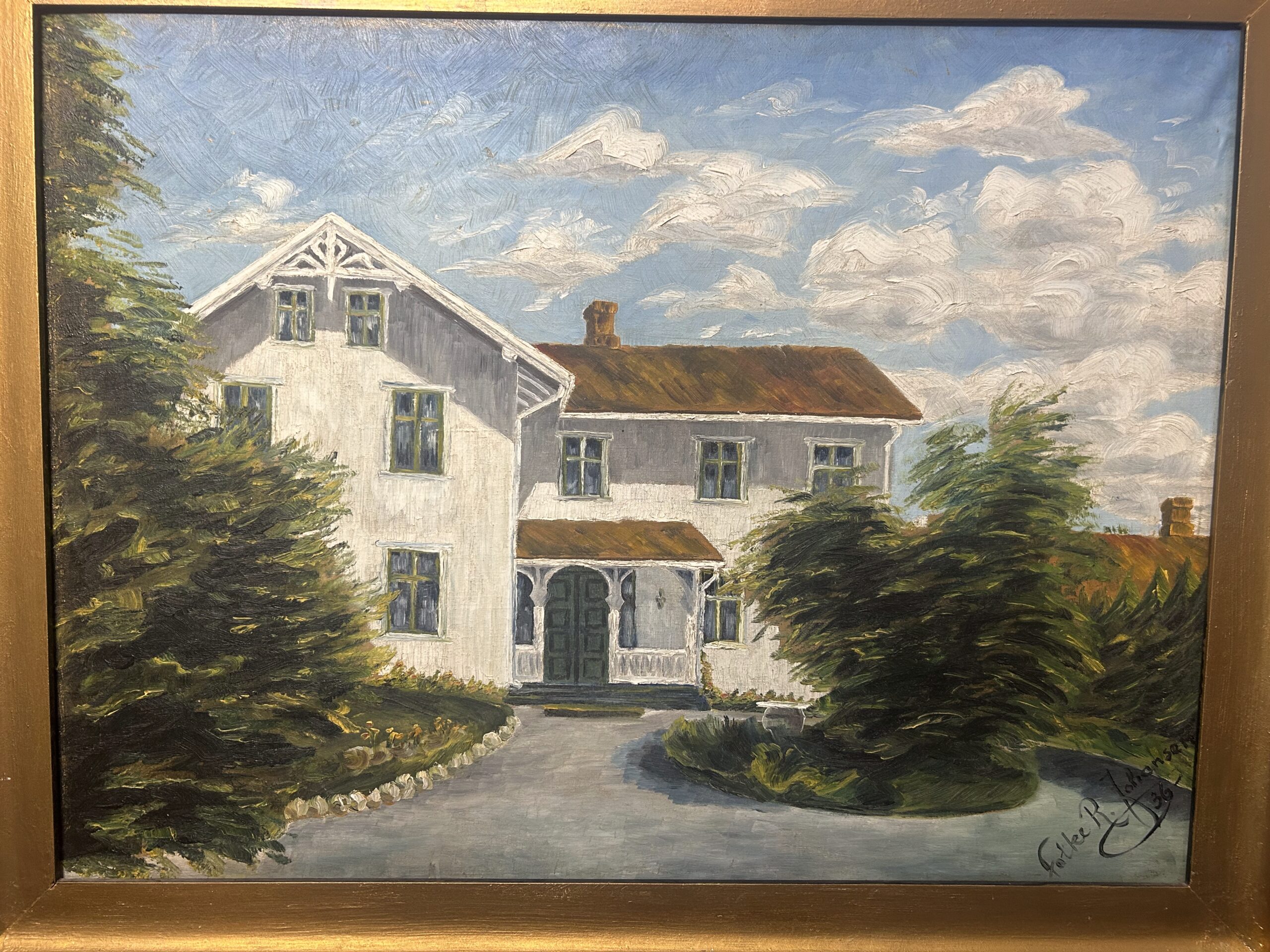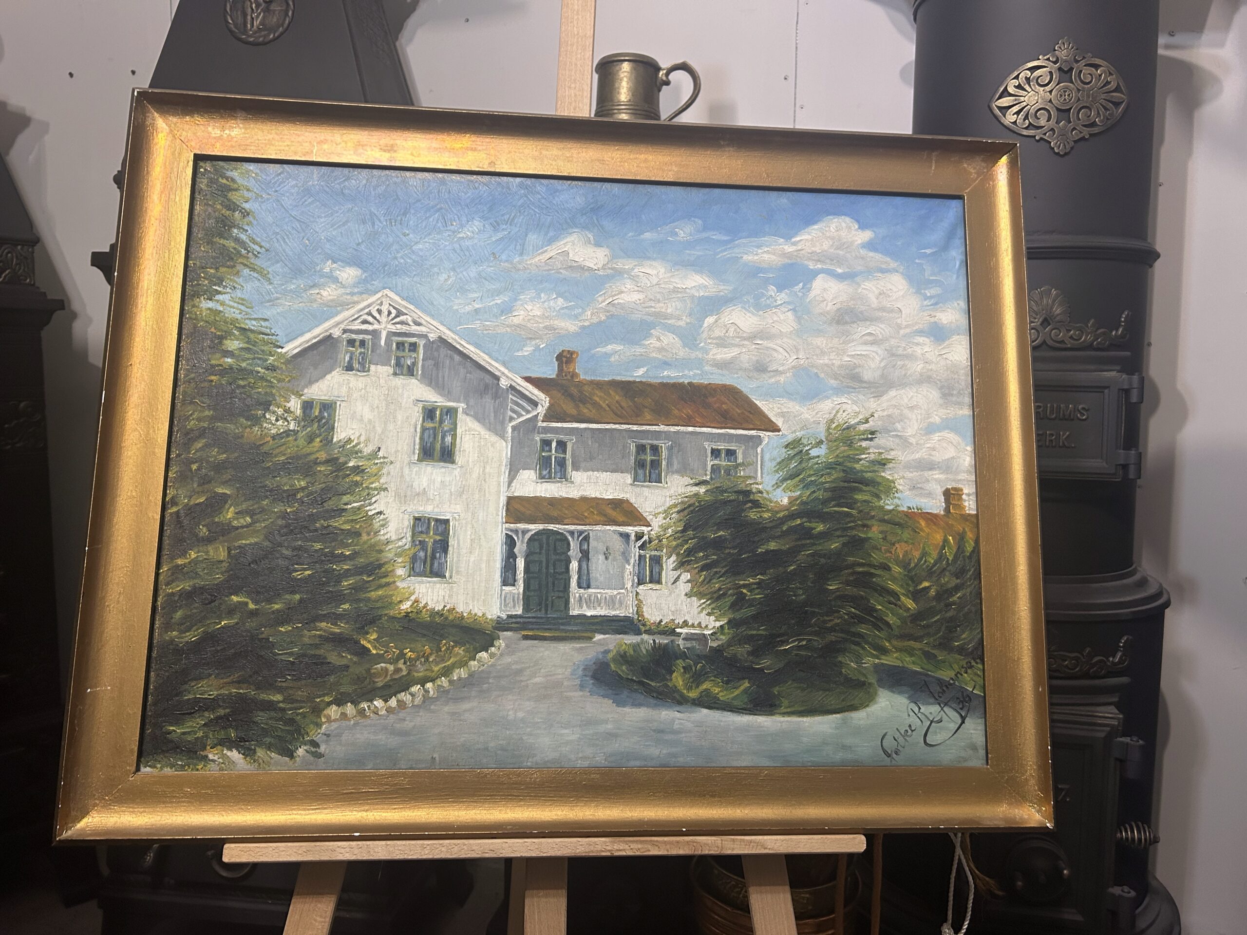 Piękny, stary obraz olejny na płótnie, przedstawiający urokliwy biały dworek otoczony malowniczym krajobrazem. Płótno zostało tradycyjnie przybite do ramy gwoździami, co świadczy o jego wiekowej autentyczności i historycznej wartości. Dzieło sygnowane podpisem autora Fotka R. Johansan, datowane na 1936 rok.